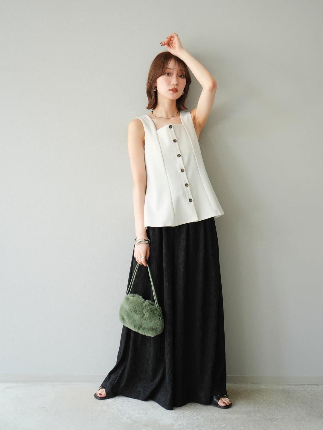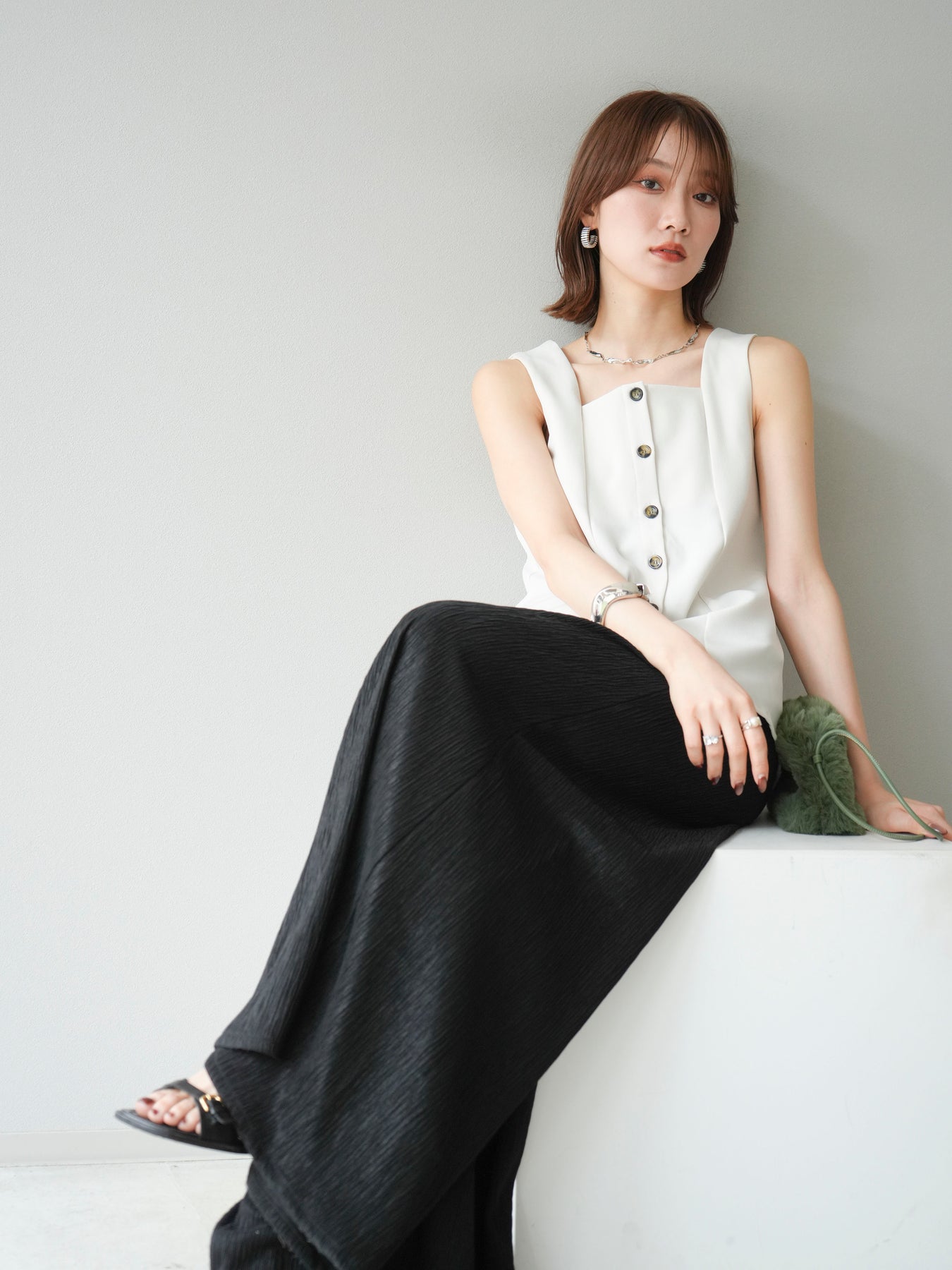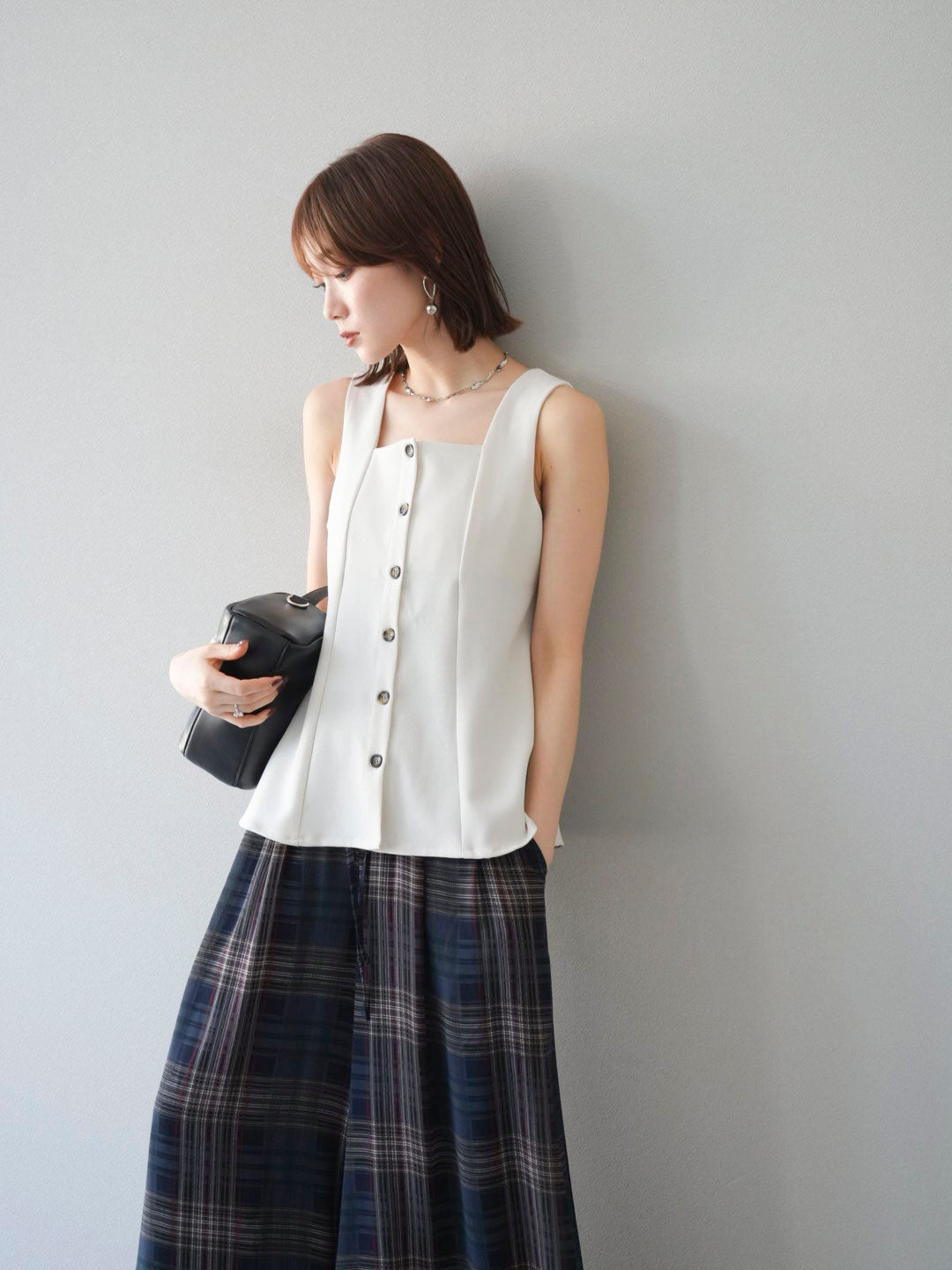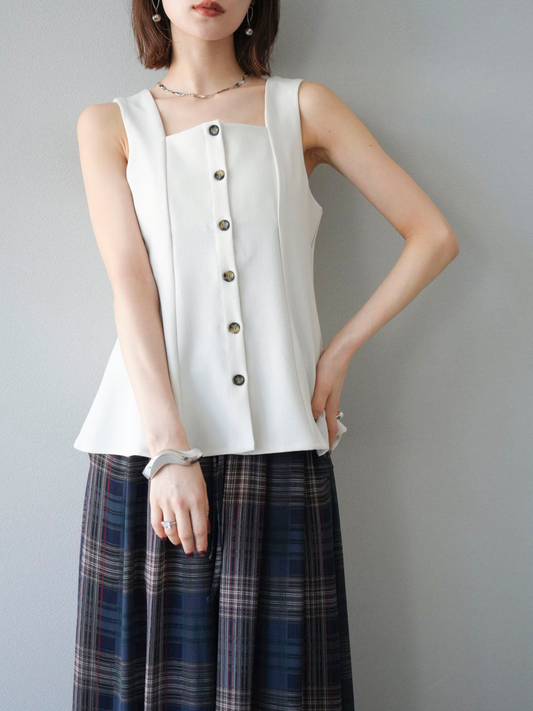 ウエストからふわりと広がるぺプラムシルエットが、スタイルアップを叶えながら上品な印象を与えてくれる一枚。スクエアネックとフロントボタンのデザインが、シンプルながらもこなれた雰囲気を演出します。Tシャツやシアートップスとのレイヤードはもちろん、同素材のボトムとセットアップ風に着るのもおすすめ。オンオフ問わず活躍する、着回し力抜群のアイテムです。 ※ボトムス、キャミソール(インナー)以外の商品は一律でインナーは付属していません。