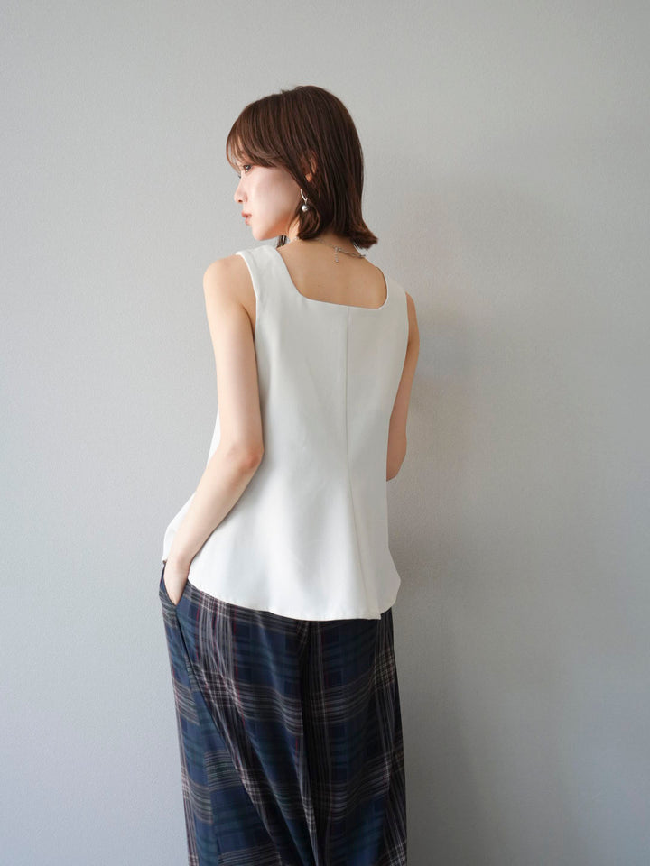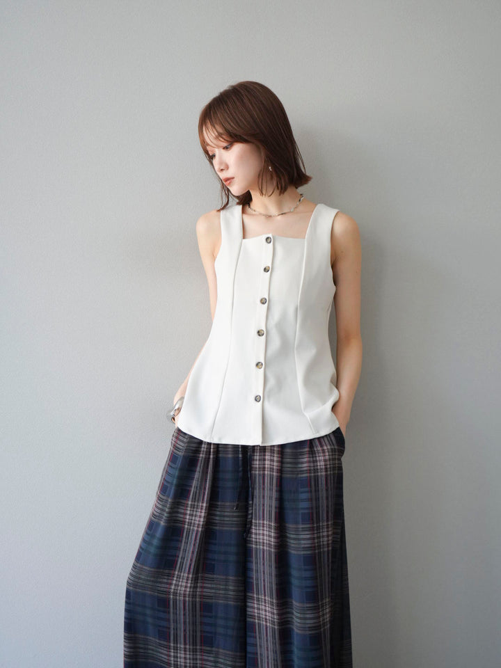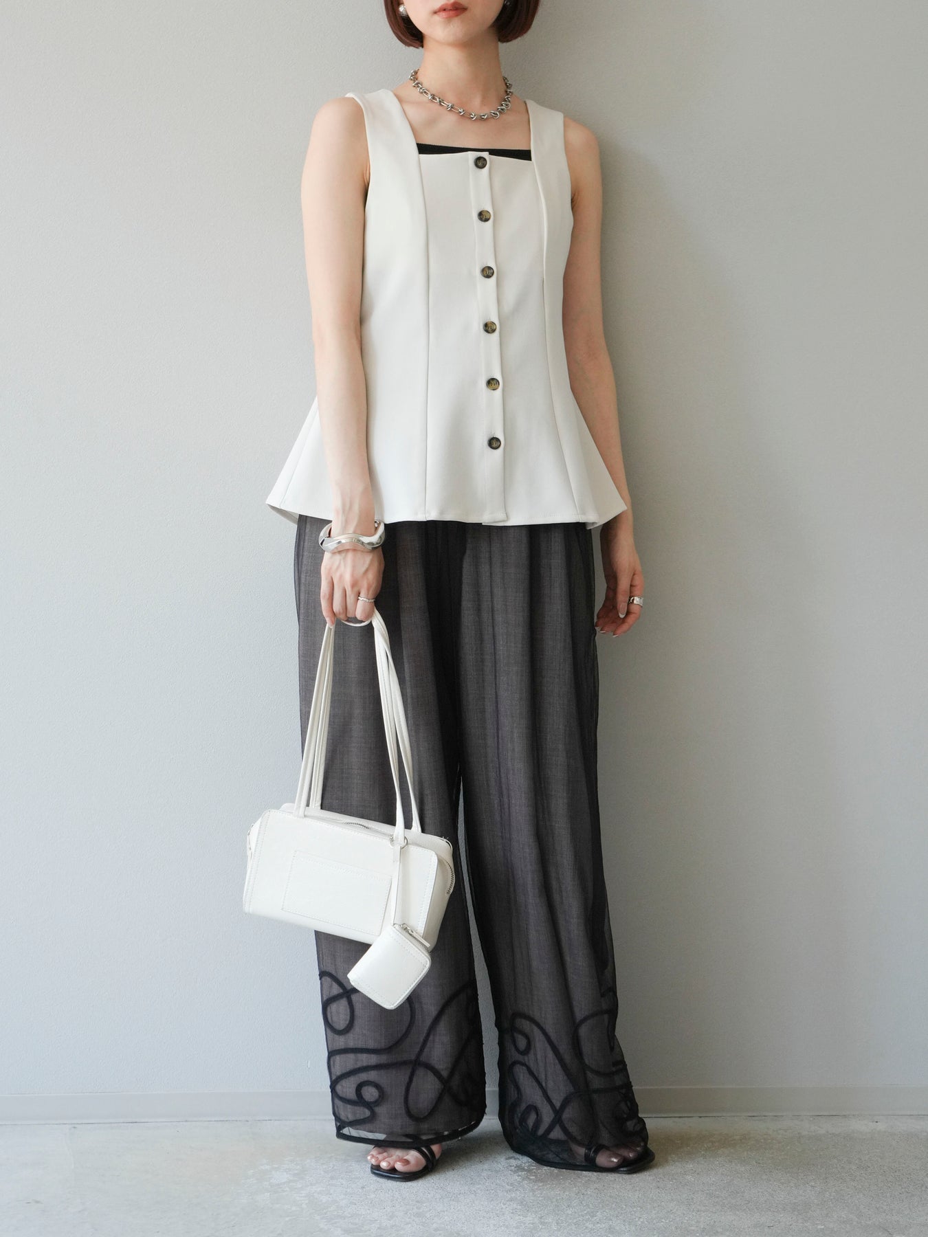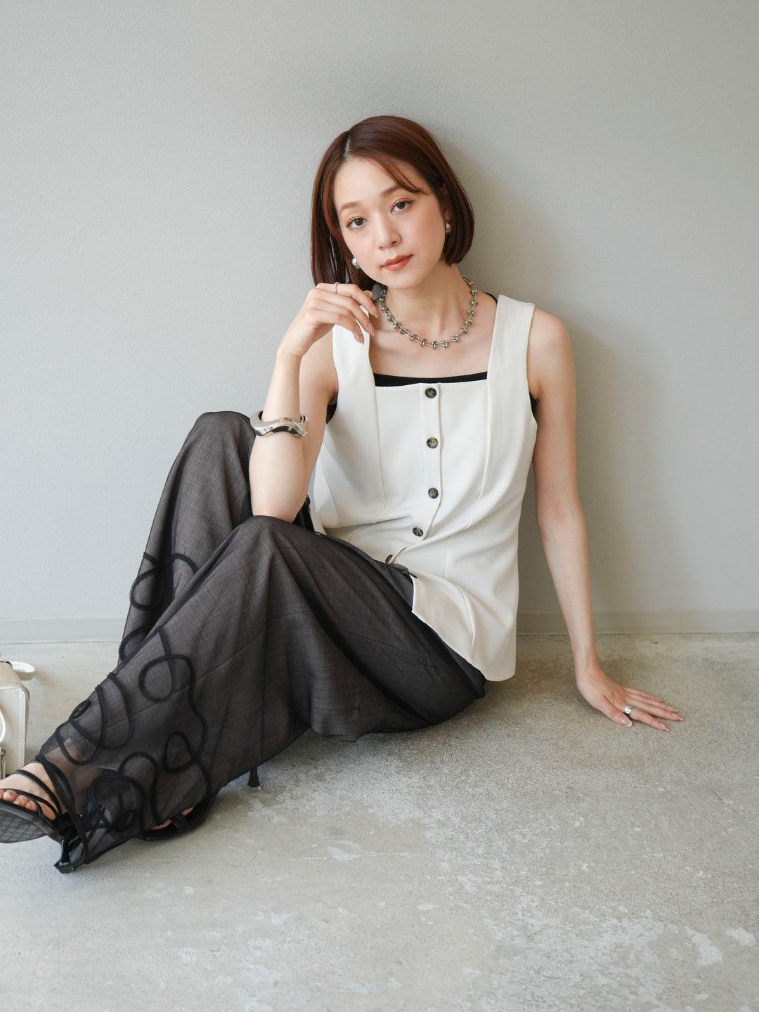 ウエストからふわりと広がるぺプラムシルエットが、スタイルアップを叶えながら上品な印象を与えてくれる一枚。スクエアネックとフロントボタンのデザインが、シンプルながらもこなれた雰囲気を演出します。Tシャツやシアートップスとのレイヤードはもちろん、同素材のボトムとセットアップ風に着るのもおすすめ。オンオフ問わず活躍する、着回し力抜群のアイテムです。 ※ボトムス、キャミソール(インナー)以外の商品は一律でインナーは付属していません。