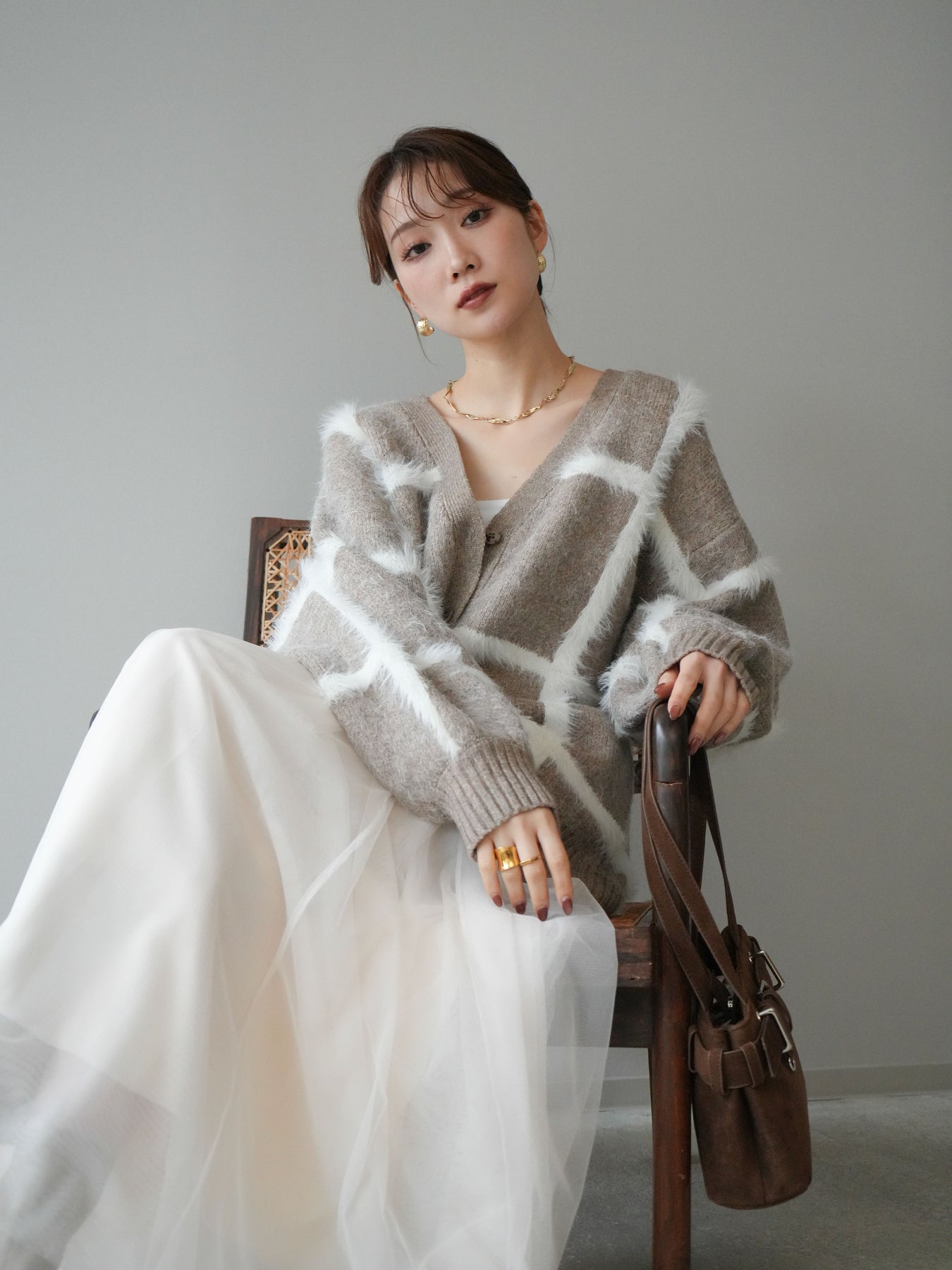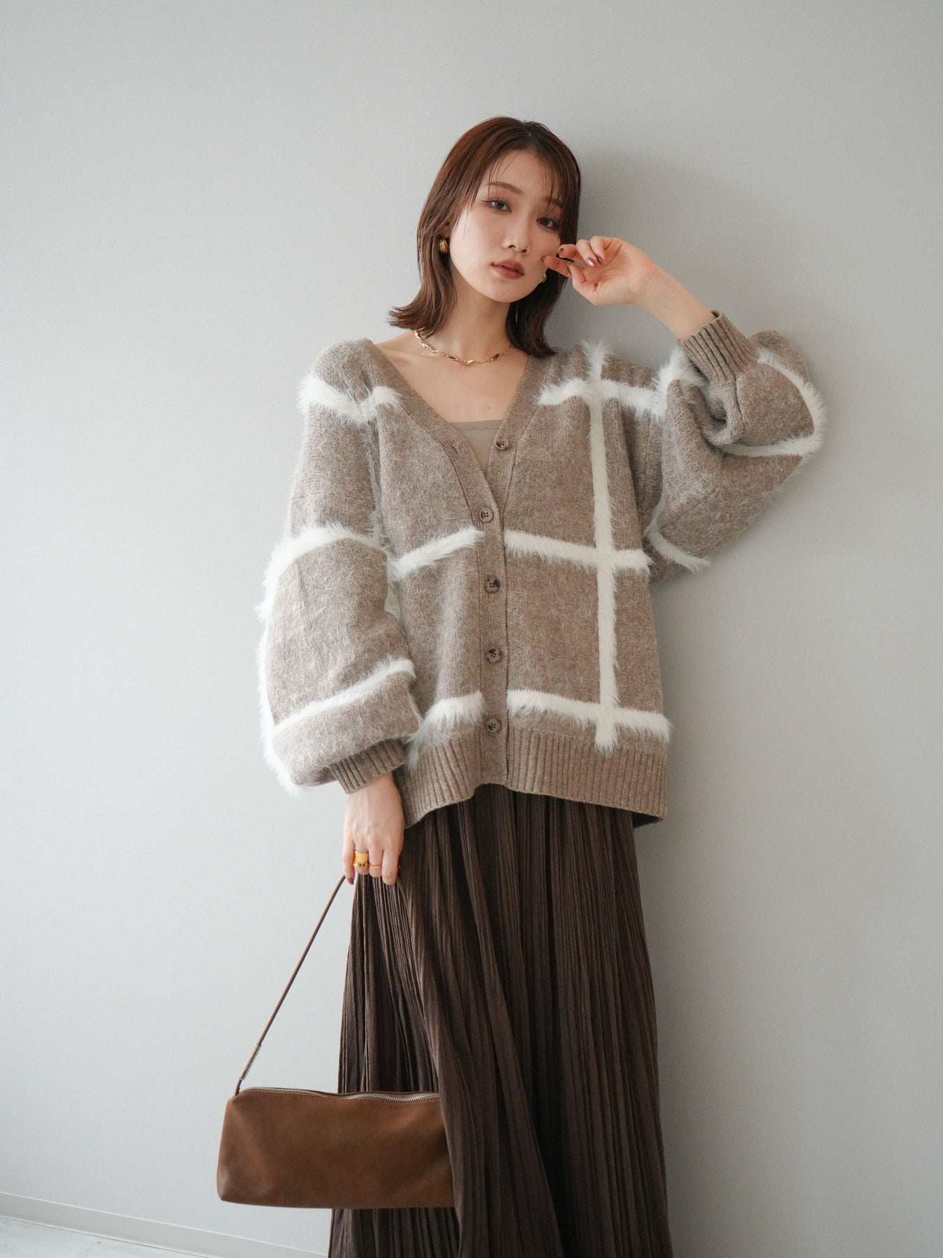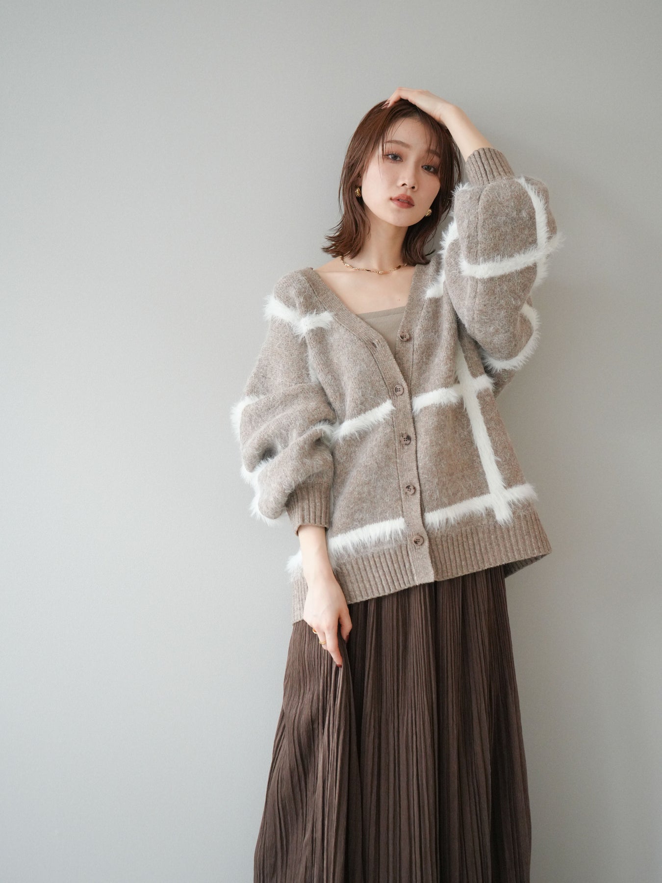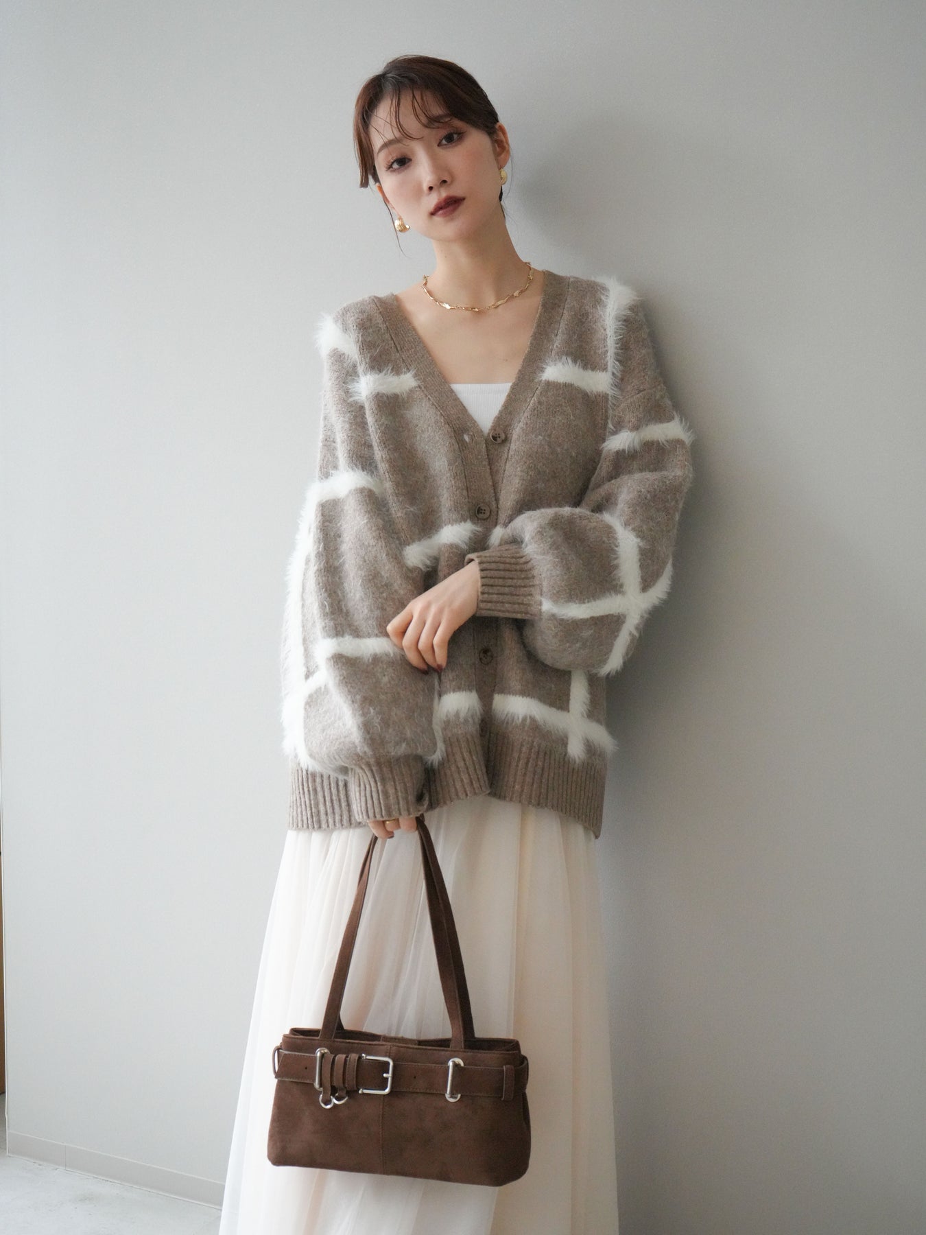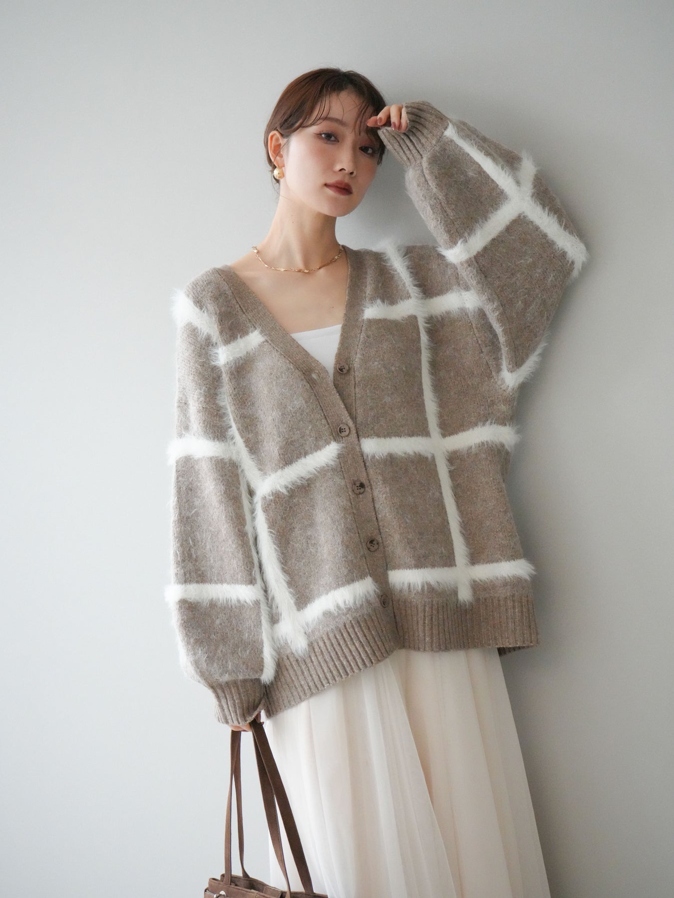 ふんわりとしたミックスシャギー素材で仕立てたチェック柄カーディガン。 異素材のような毛足の長い質感が表情豊かで、シーズンムードを高めてくれます。 大きめの格子デザインが目を惹き、羽織るだけでスタイリングの主役になる1枚。 ゆったりとしたシルエットが抜け感を演出し、リラックス感のある着心地です。 デニムやスカートなど、幅広いアイテムと好相性で、カジュアルにもフェミニンにも着回せる万能カーディガンです。 ※ボトムス、キャミソール(インナー)以外の商品は一律でインナーは付属していません。