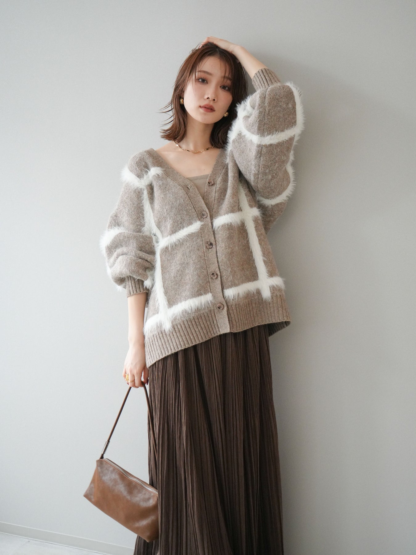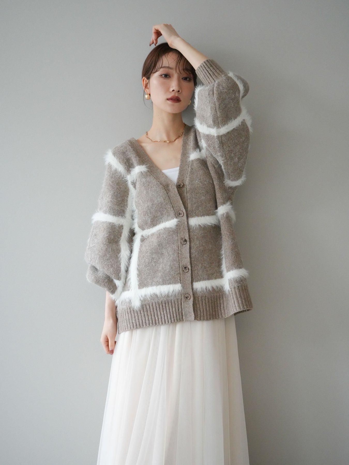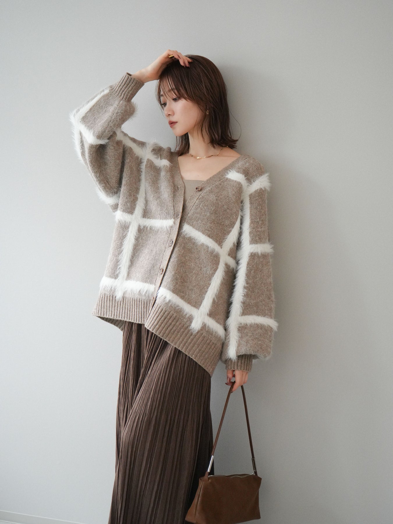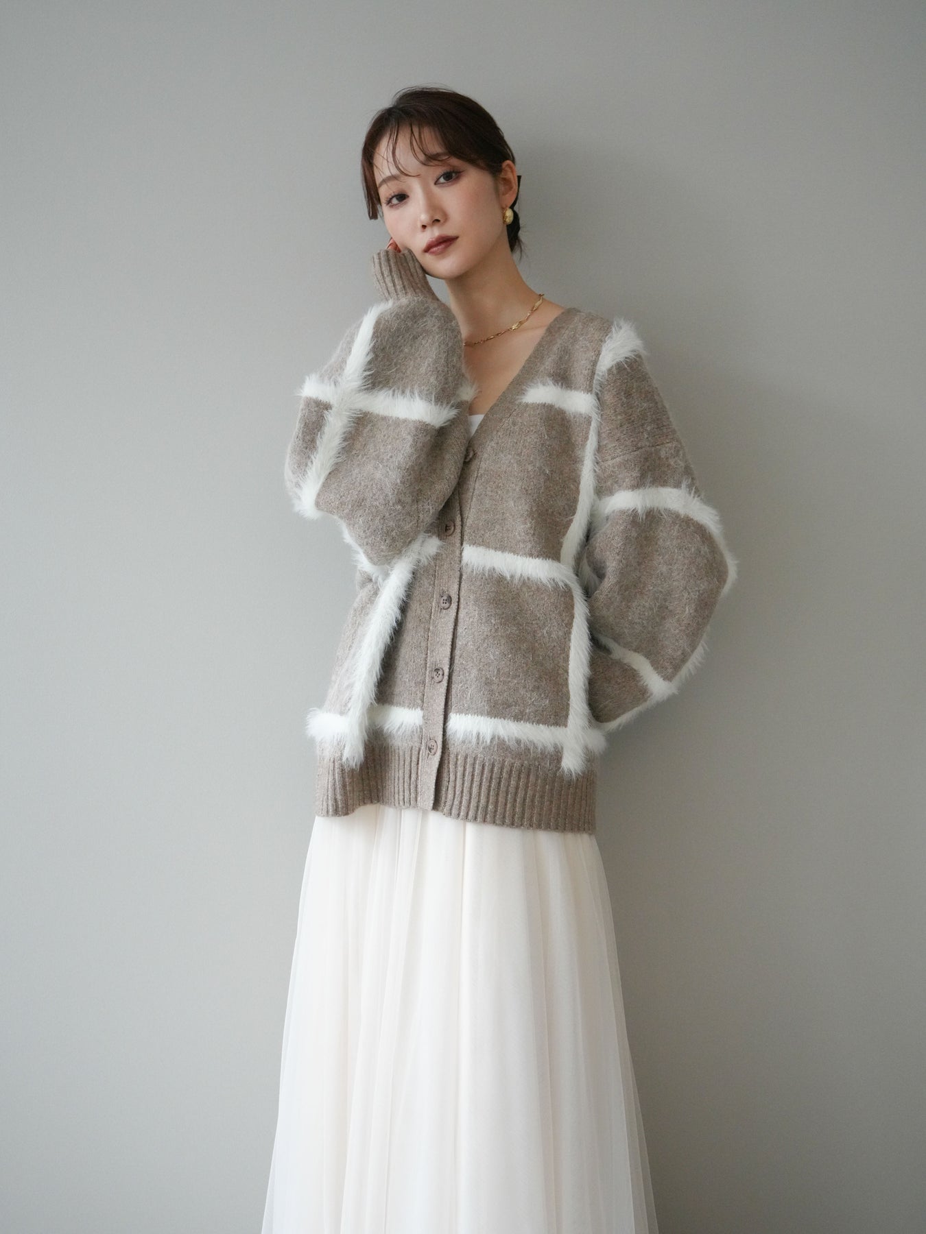 ふんわりとしたミックスシャギー素材で仕立てたチェック柄カーディガン。 異素材のような毛足の長い質感が表情豊かで、シーズンムードを高めてくれます。 大きめの格子デザインが目を惹き、羽織るだけでスタイリングの主役になる1枚。 ゆったりとしたシルエットが抜け感を演出し、リラックス感のある着心地です。 デニムやスカートなど、幅広いアイテムと好相性で、カジュアルにもフェミニンにも着回せる万能カーディガンです。 ※ボトムス、キャミソール(インナー)以外の商品は一律でインナーは付属していません。