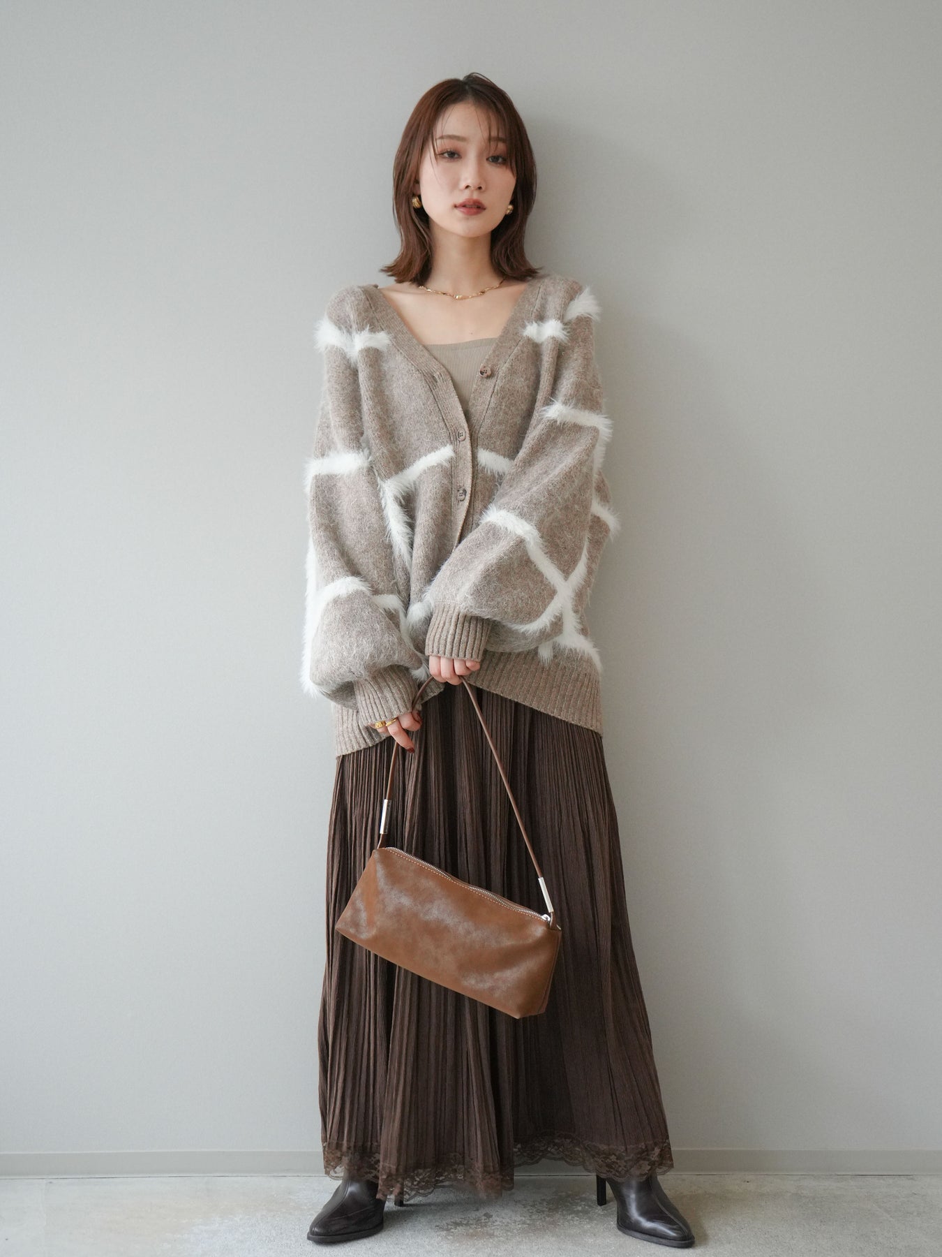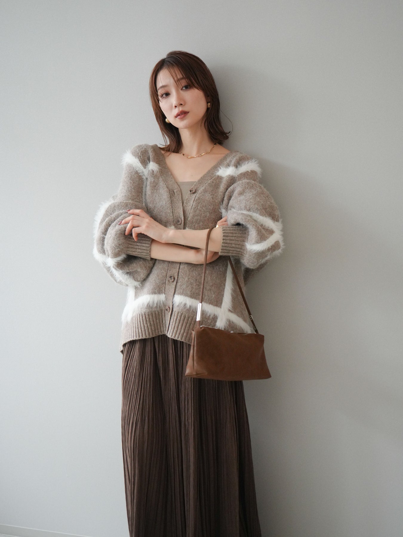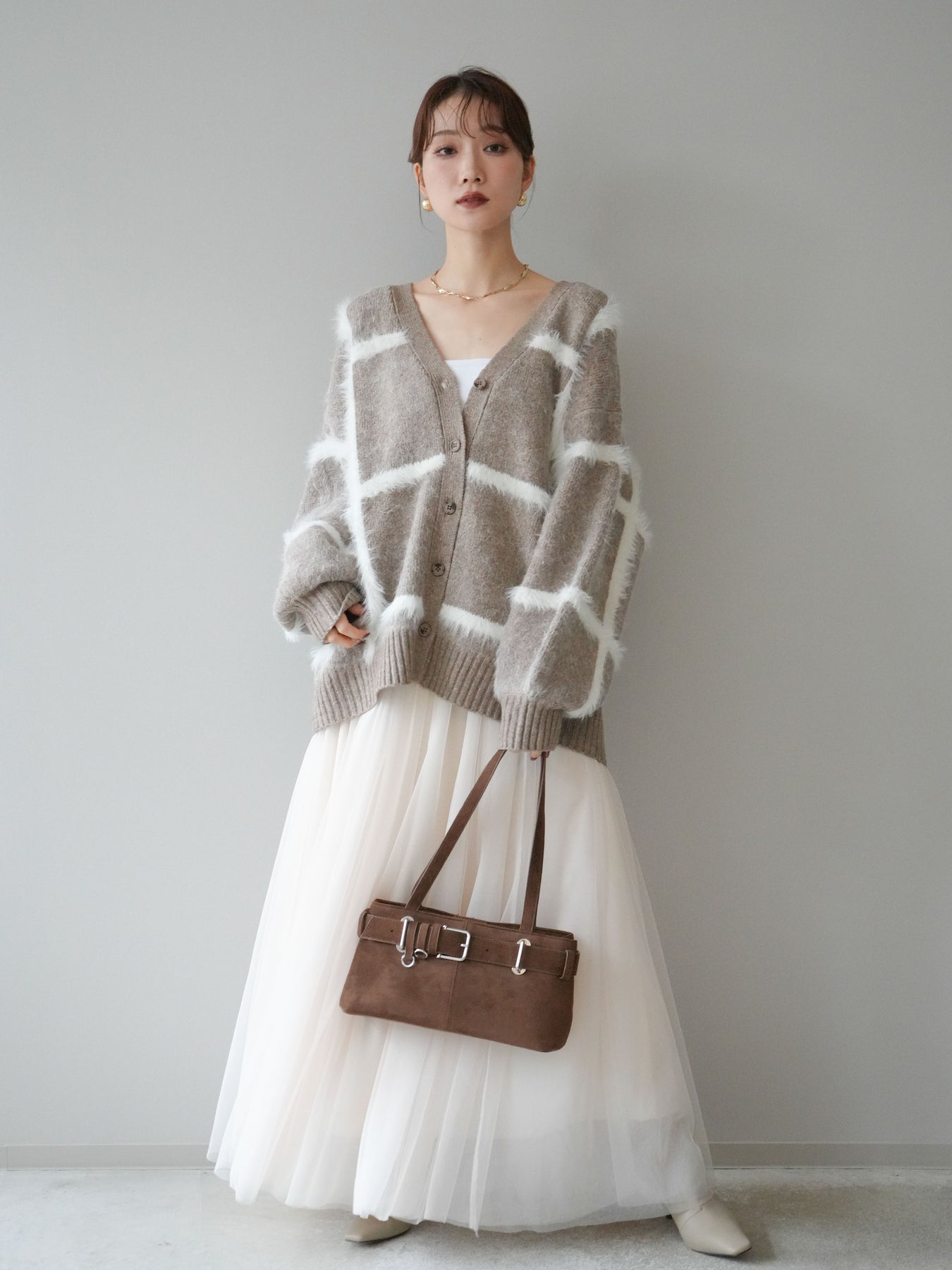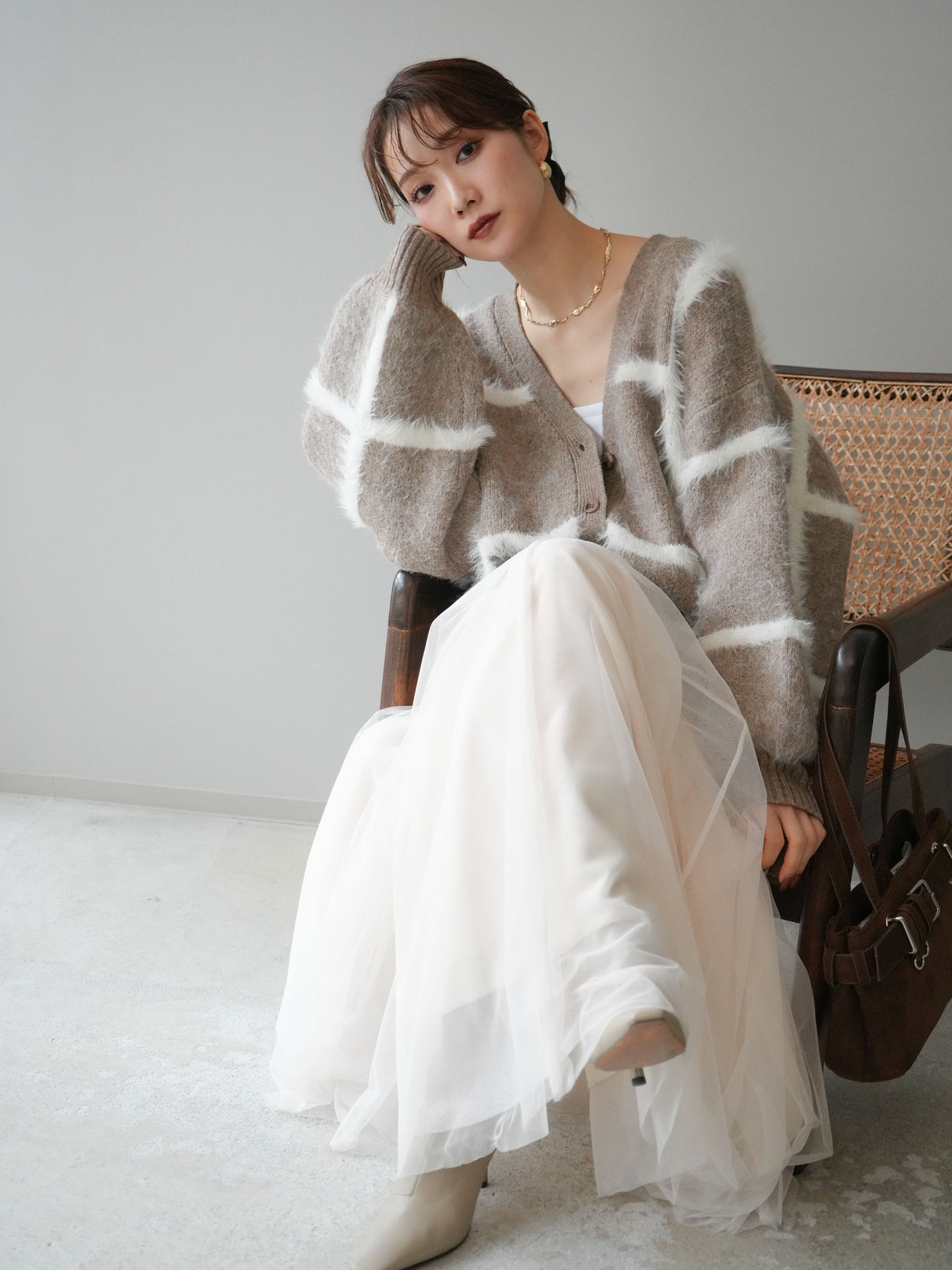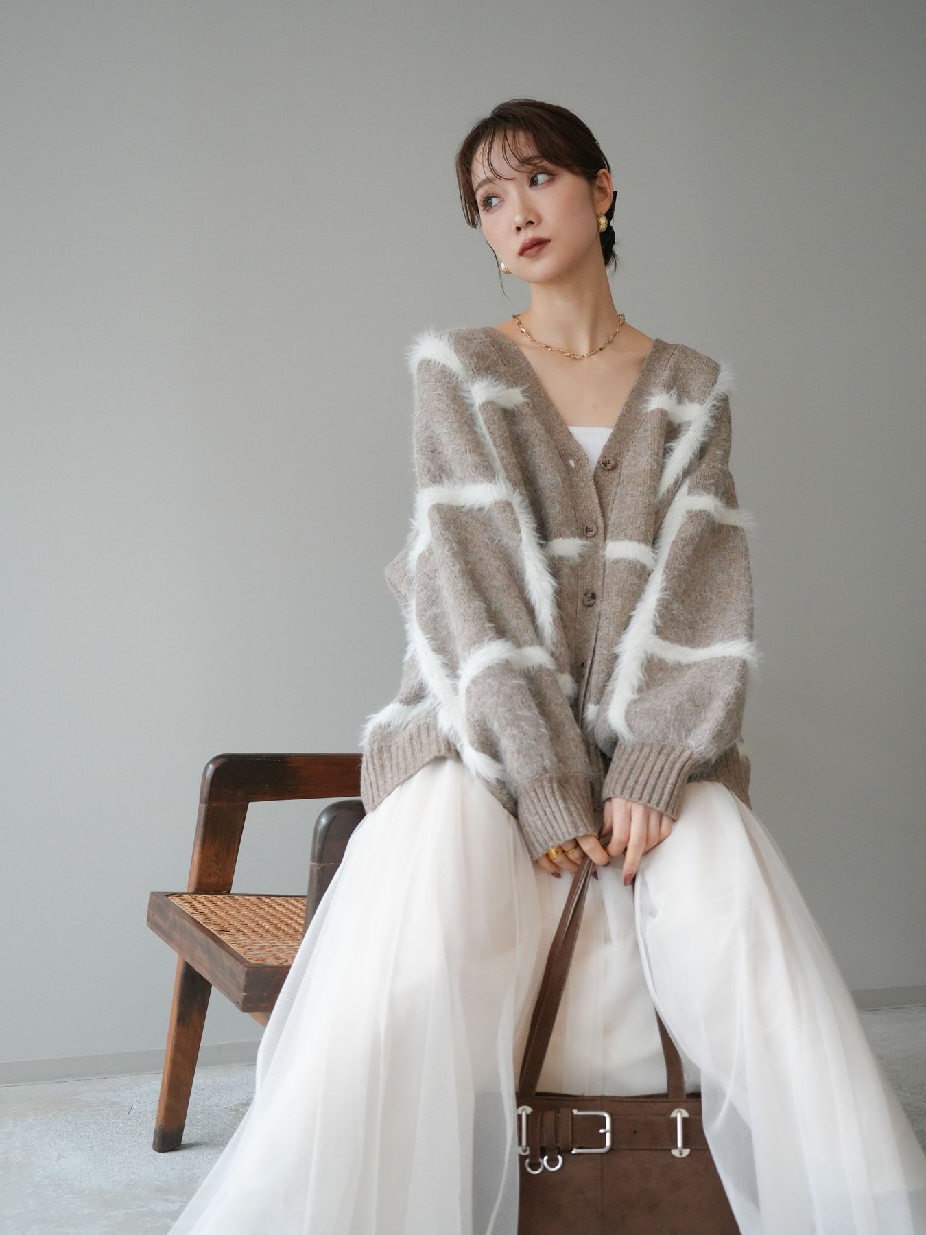 ふんわりとしたミックスシャギー素材で仕立てたチェック柄カーディガン。 異素材のような毛足の長い質感が表情豊かで、シーズンムードを高めてくれます。 大きめの格子デザインが目を惹き、羽織るだけでスタイリングの主役になる1枚。 ゆったりとしたシルエットが抜け感を演出し、リラックス感のある着心地です。 デニムやスカートなど、幅広いアイテムと好相性で、カジュアルにもフェミニンにも着回せる万能カーディガンです。 ※ボトムス、キャミソール(インナー)以外の商品は一律でインナーは付属していません。