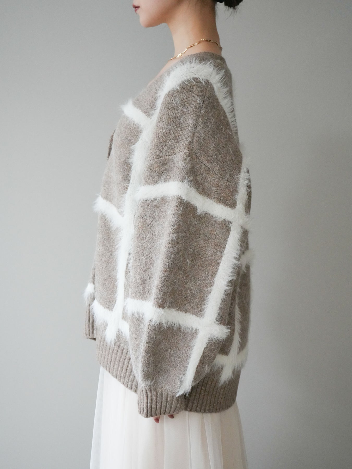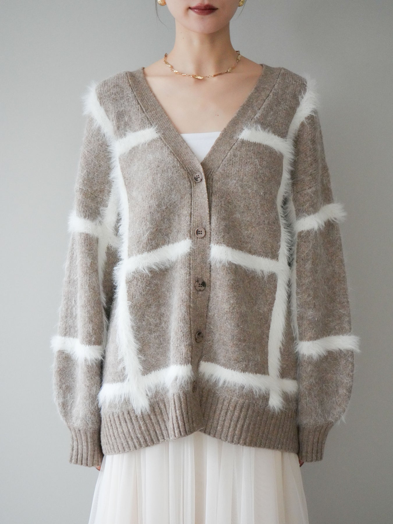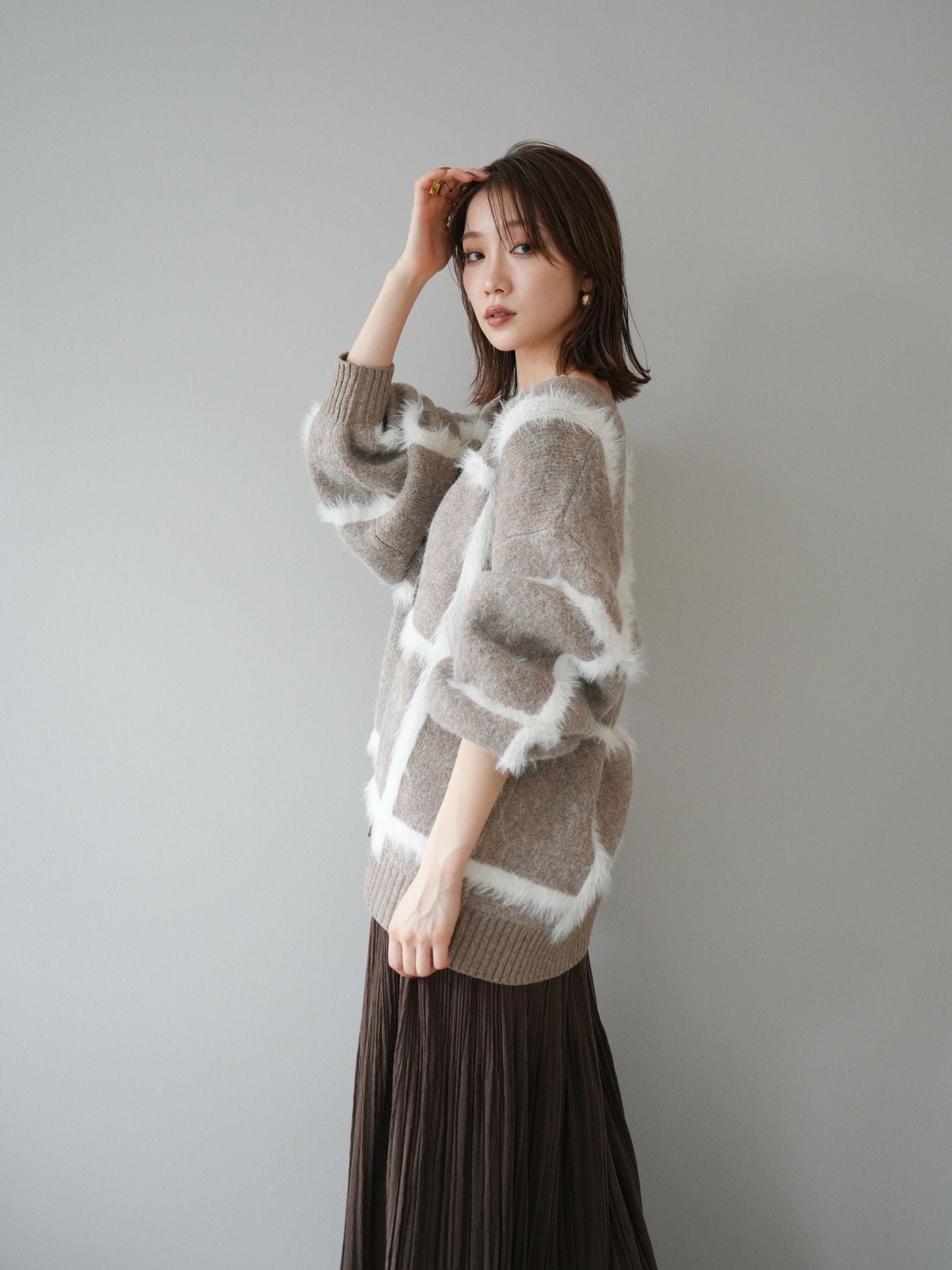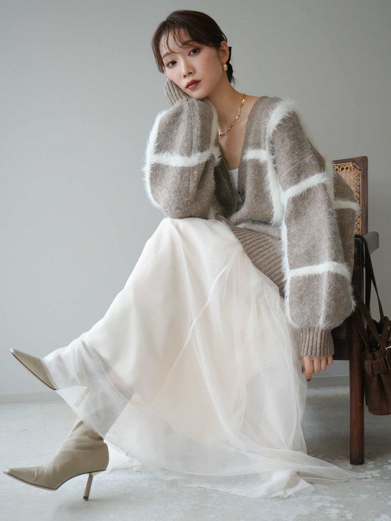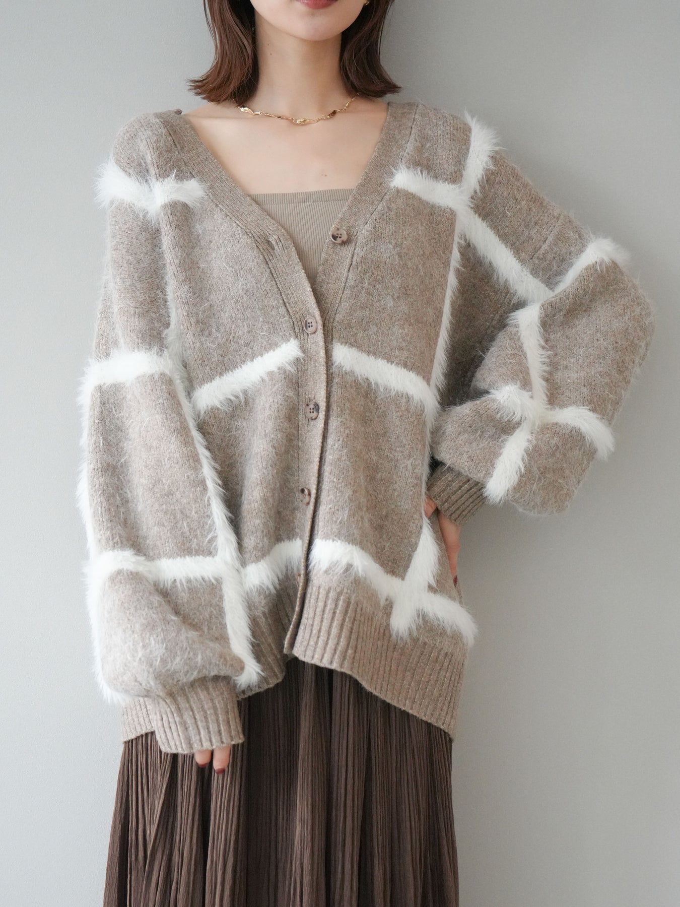 ふんわりとしたミックスシャギー素材で仕立てたチェック柄カーディガン。 異素材のような毛足の長い質感が表情豊かで、シーズンムードを高めてくれます。 大きめの格子デザインが目を惹き、羽織るだけでスタイリングの主役になる1枚。 ゆったりとしたシルエットが抜け感を演出し、リラックス感のある着心地です。 デニムやスカートなど、幅広いアイテムと好相性で、カジュアルにもフェミニンにも着回せる万能カーディガンです。 ※ボトムス、キャミソール(インナー)以外の商品は一律でインナーは付属していません。