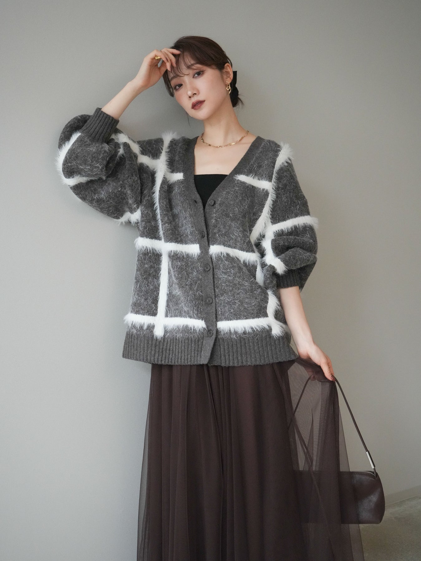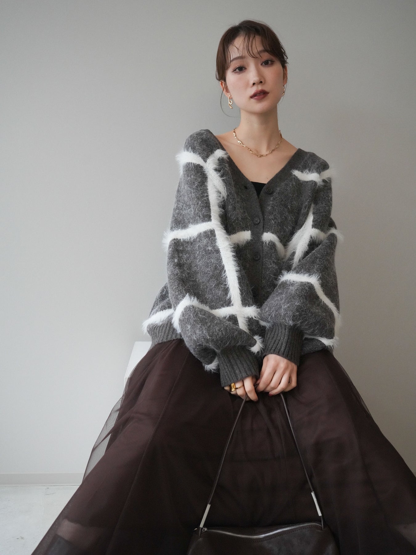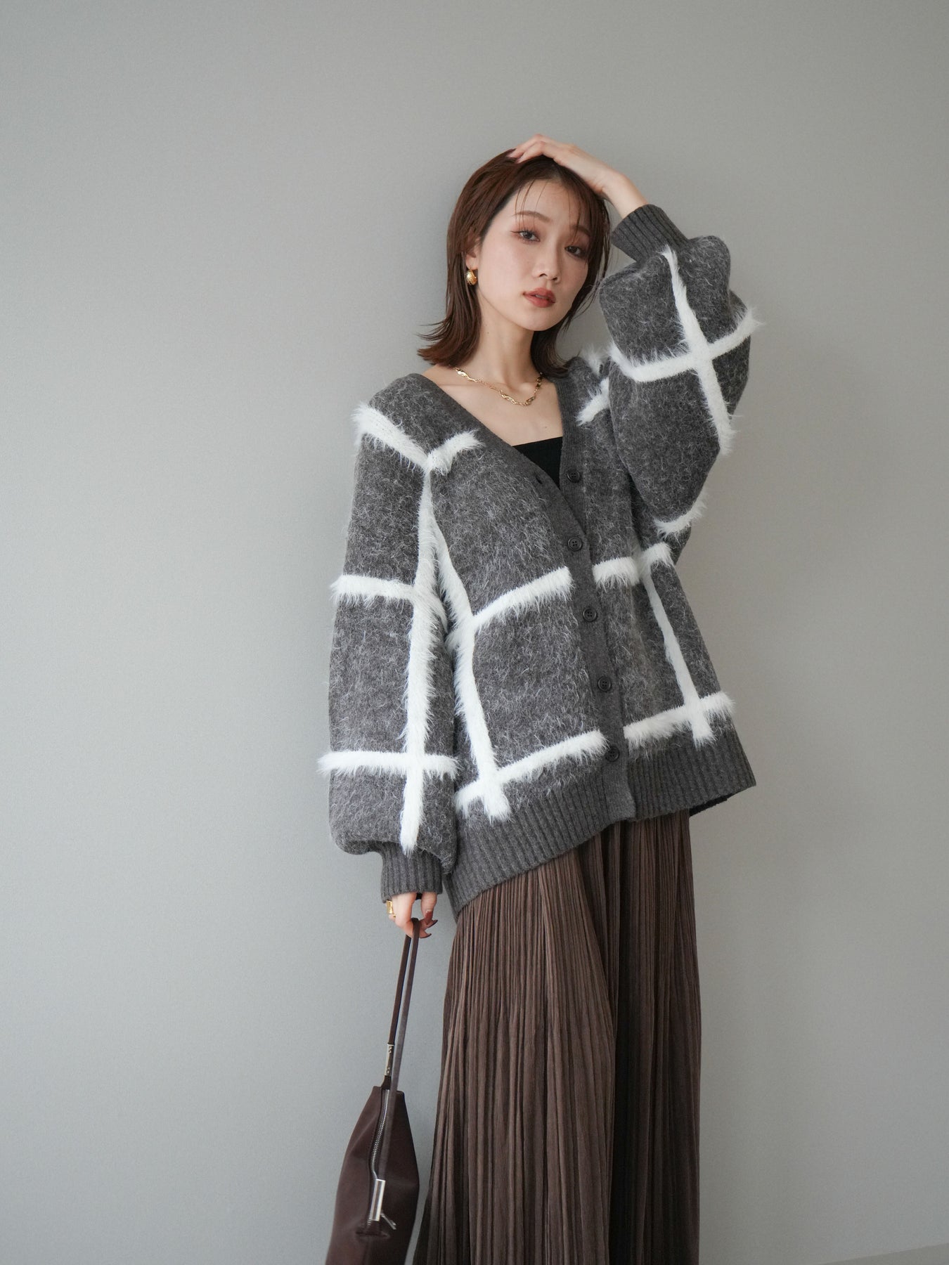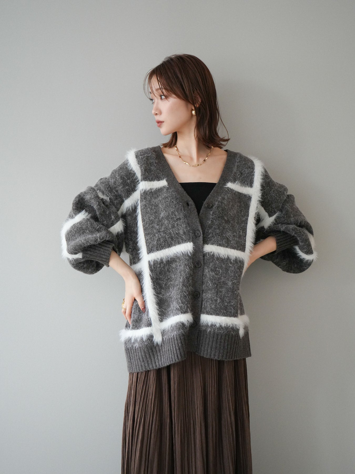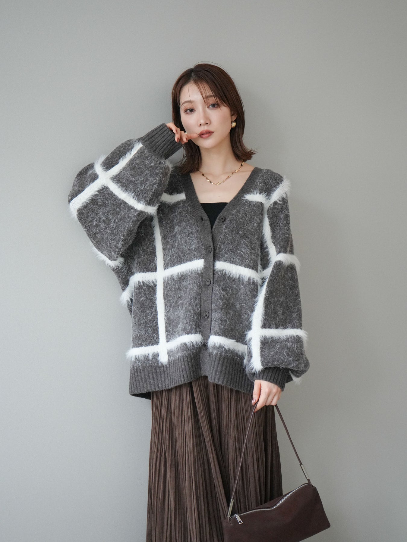 ふんわりとしたミックスシャギー素材で仕立てたチェック柄カーディガン。 異素材のような毛足の長い質感が表情豊かで、シーズンムードを高めてくれます。 大きめの格子デザインが目を惹き、羽織るだけでスタイリングの主役になる1枚。 ゆったりとしたシルエットが抜け感を演出し、リラックス感のある着心地です。 デニムやスカートなど、幅広いアイテムと好相性で、カジュアルにもフェミニンにも着回せる万能カーディガンです。 ※ボトムス、キャミソール(インナー)以外の商品は一律でインナーは付属していません。
