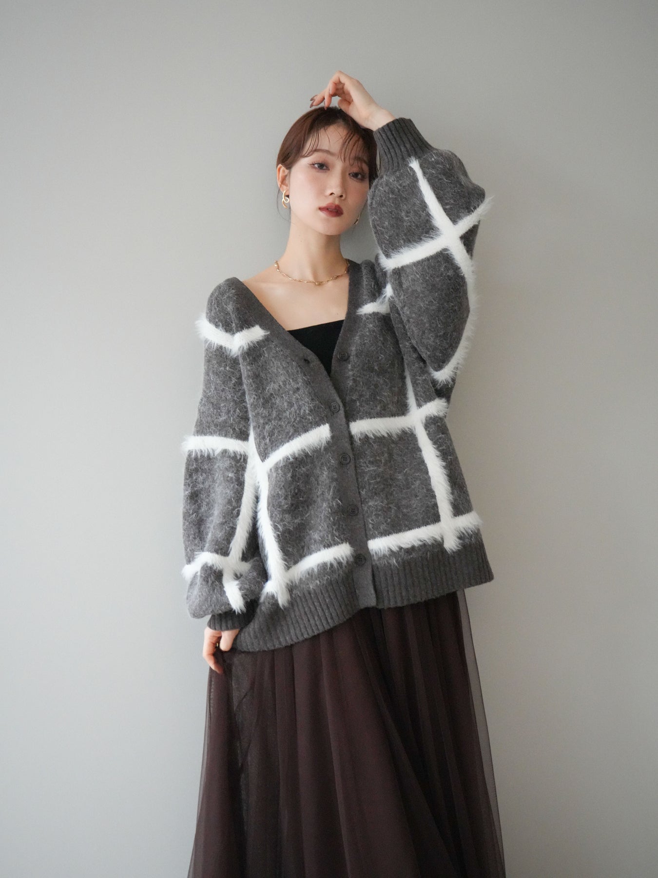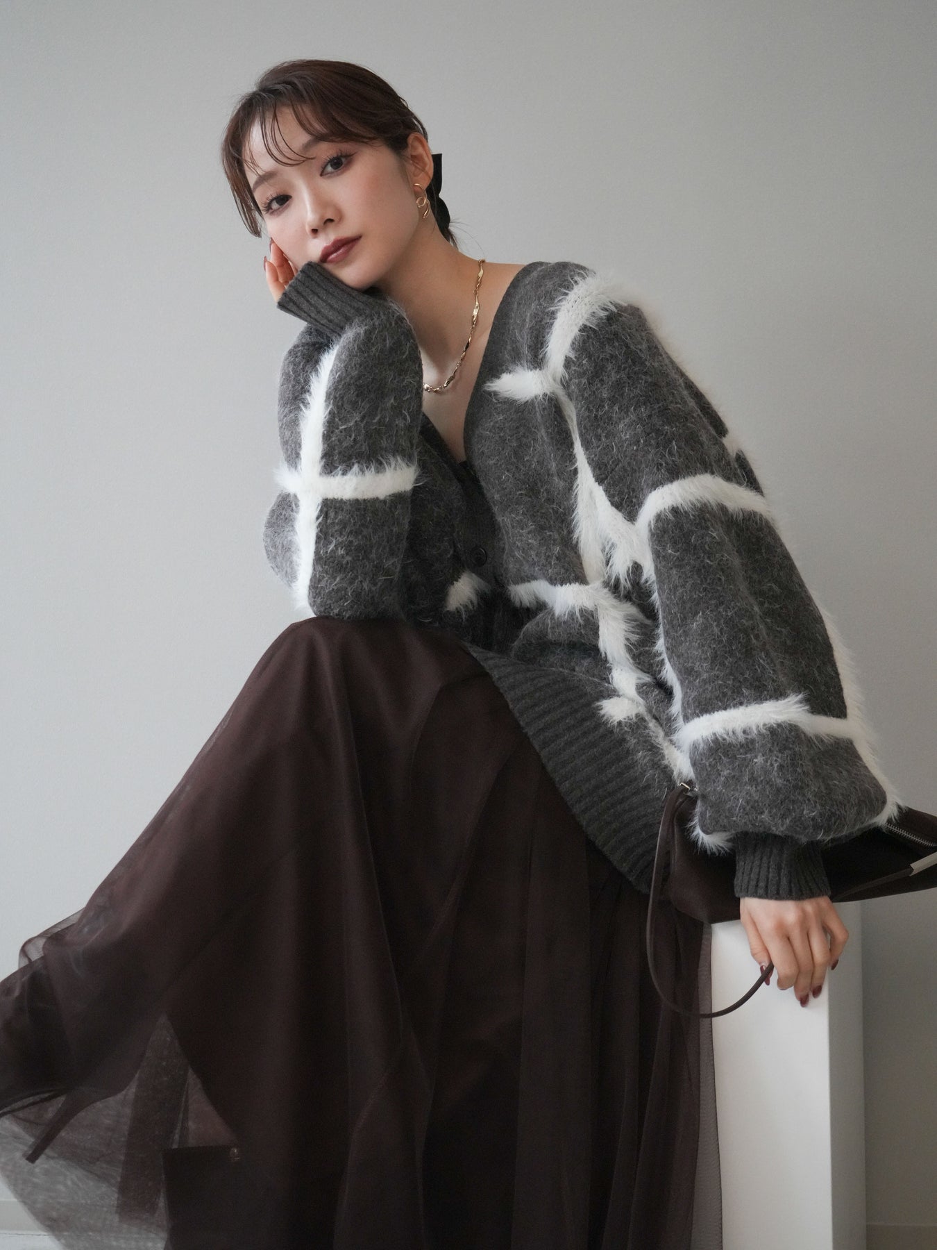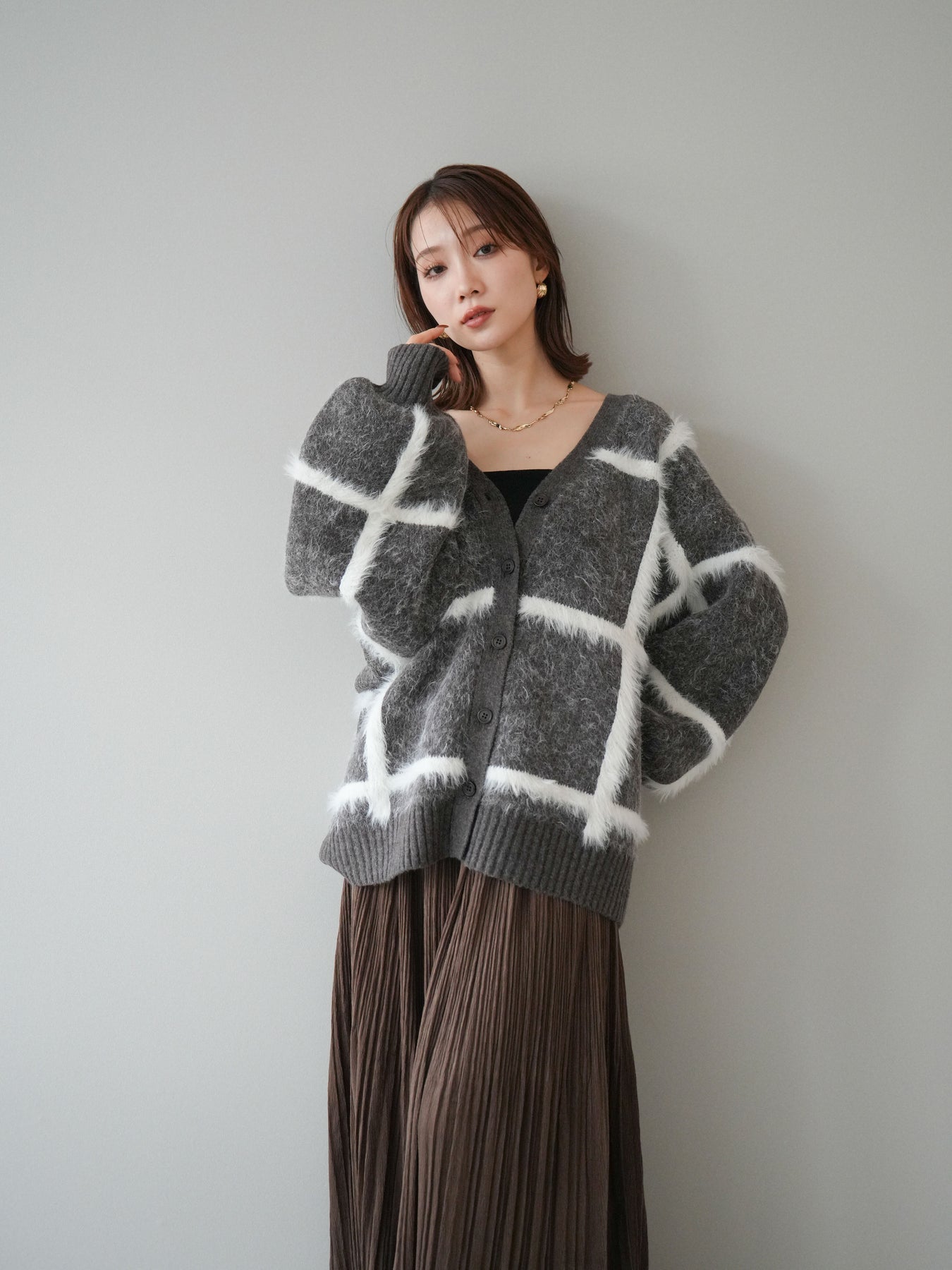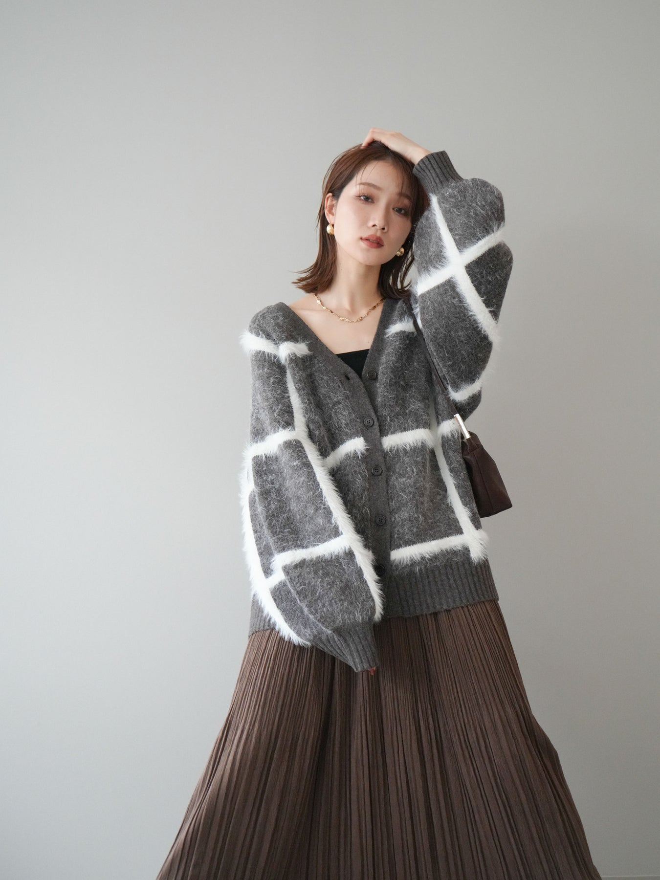 ふんわりとしたミックスシャギー素材で仕立てたチェック柄カーディガン。 異素材のような毛足の長い質感が表情豊かで、シーズンムードを高めてくれます。 大きめの格子デザインが目を惹き、羽織るだけでスタイリングの主役になる1枚。 ゆったりとしたシルエットが抜け感を演出し、リラックス感のある着心地です。 デニムやスカートなど、幅広いアイテムと好相性で、カジュアルにもフェミニンにも着回せる万能カーディガンです。 ※ボトムス、キャミソール(インナー)以外の商品は一律でインナーは付属していません。