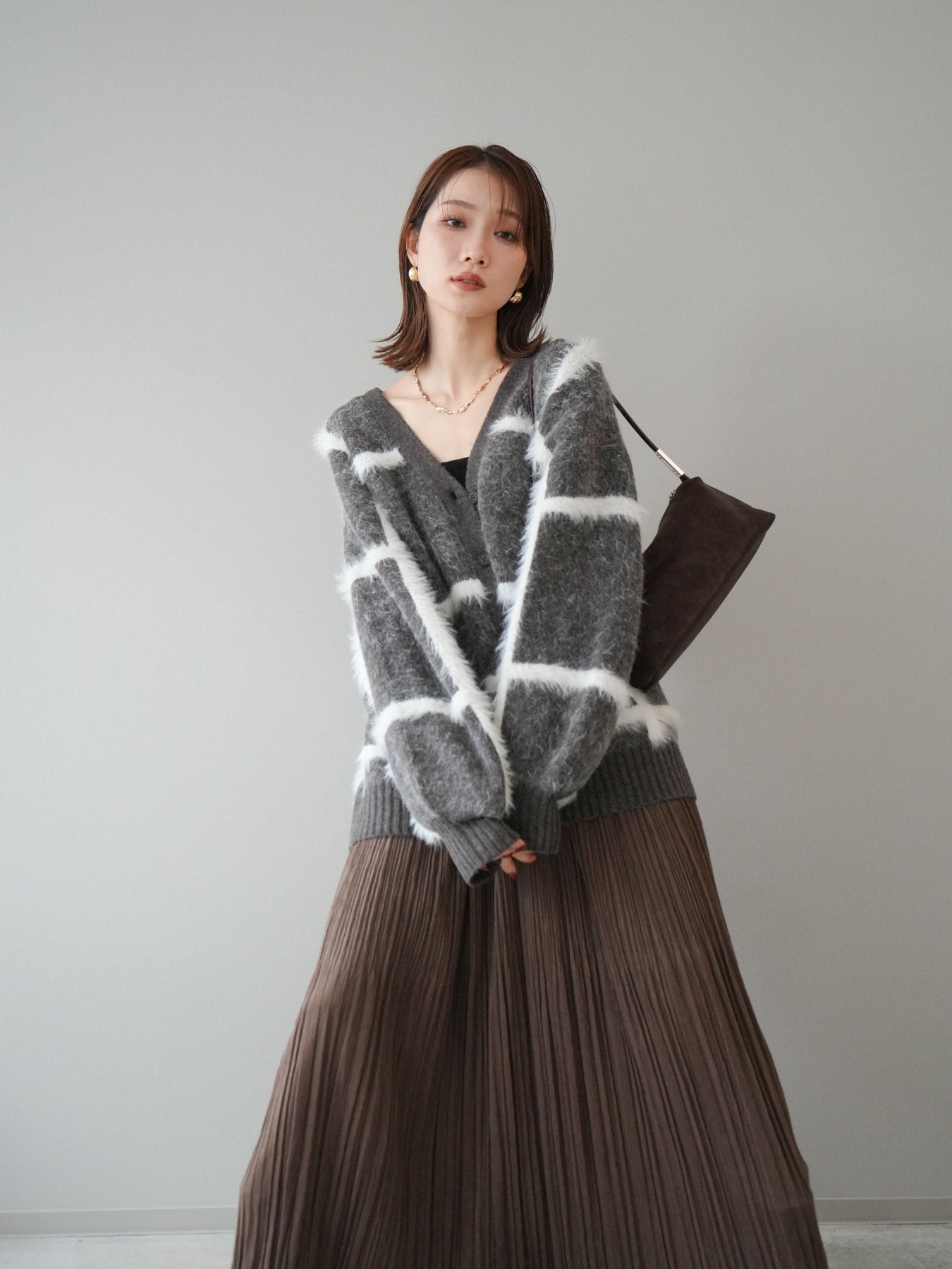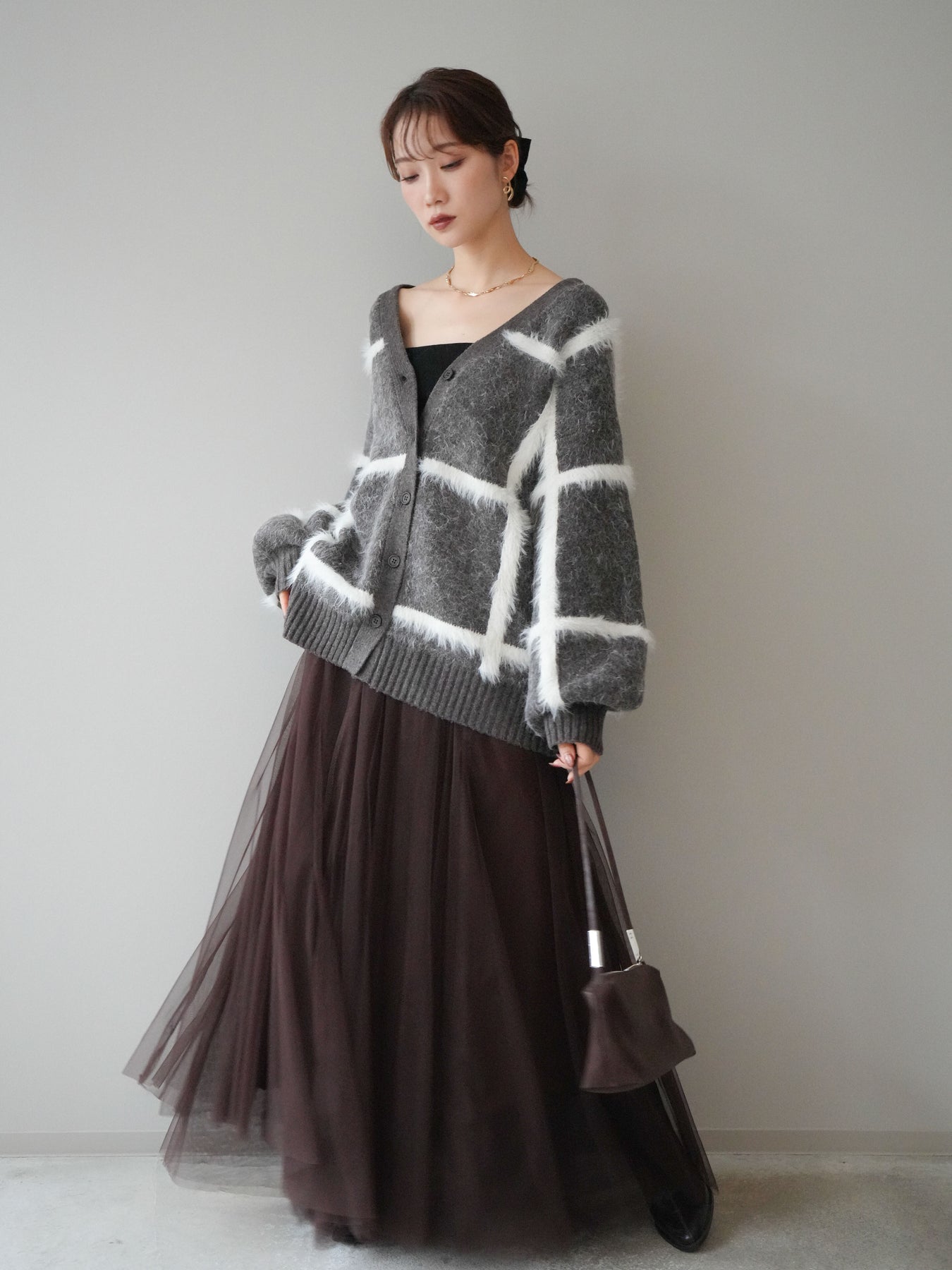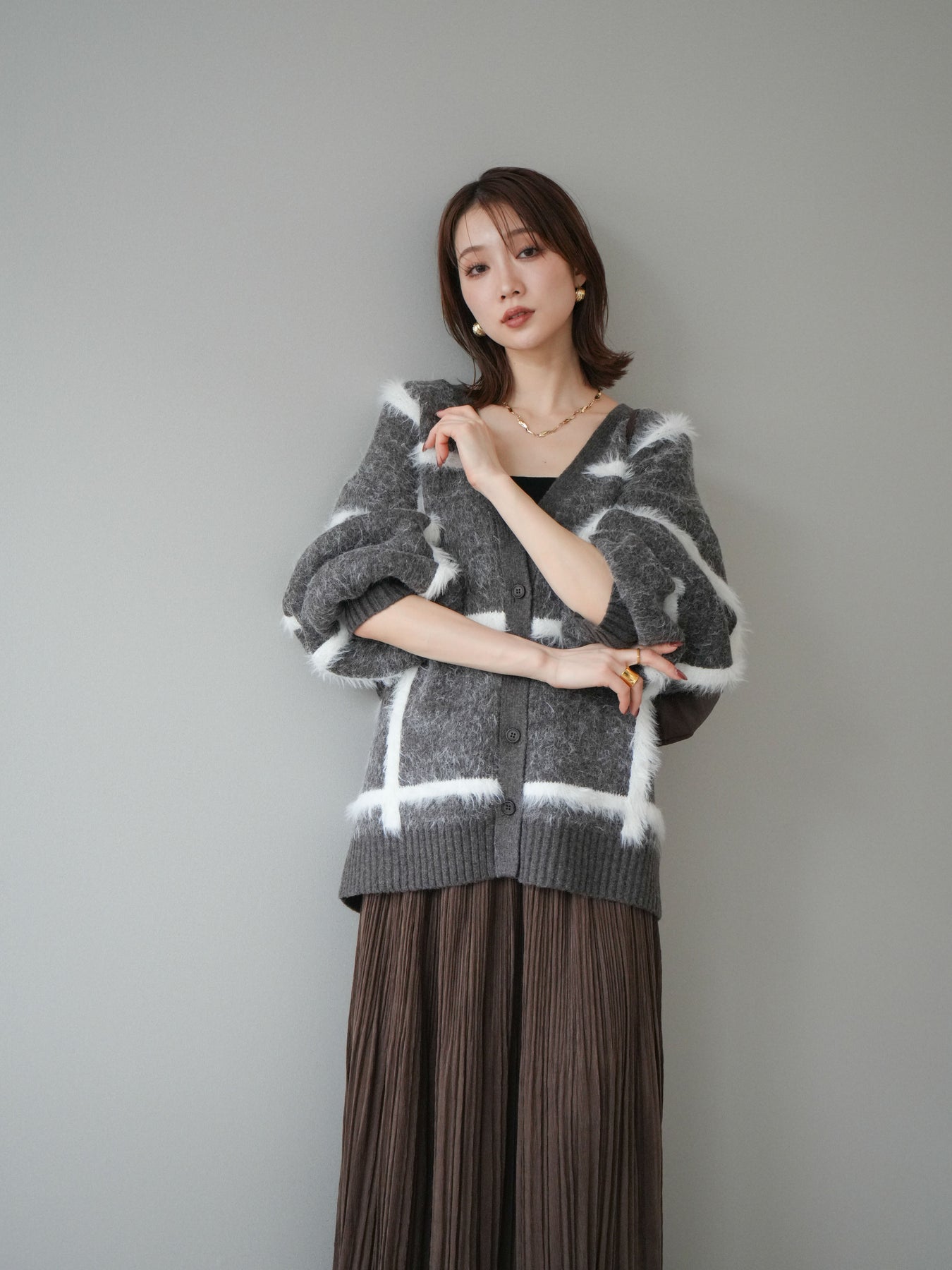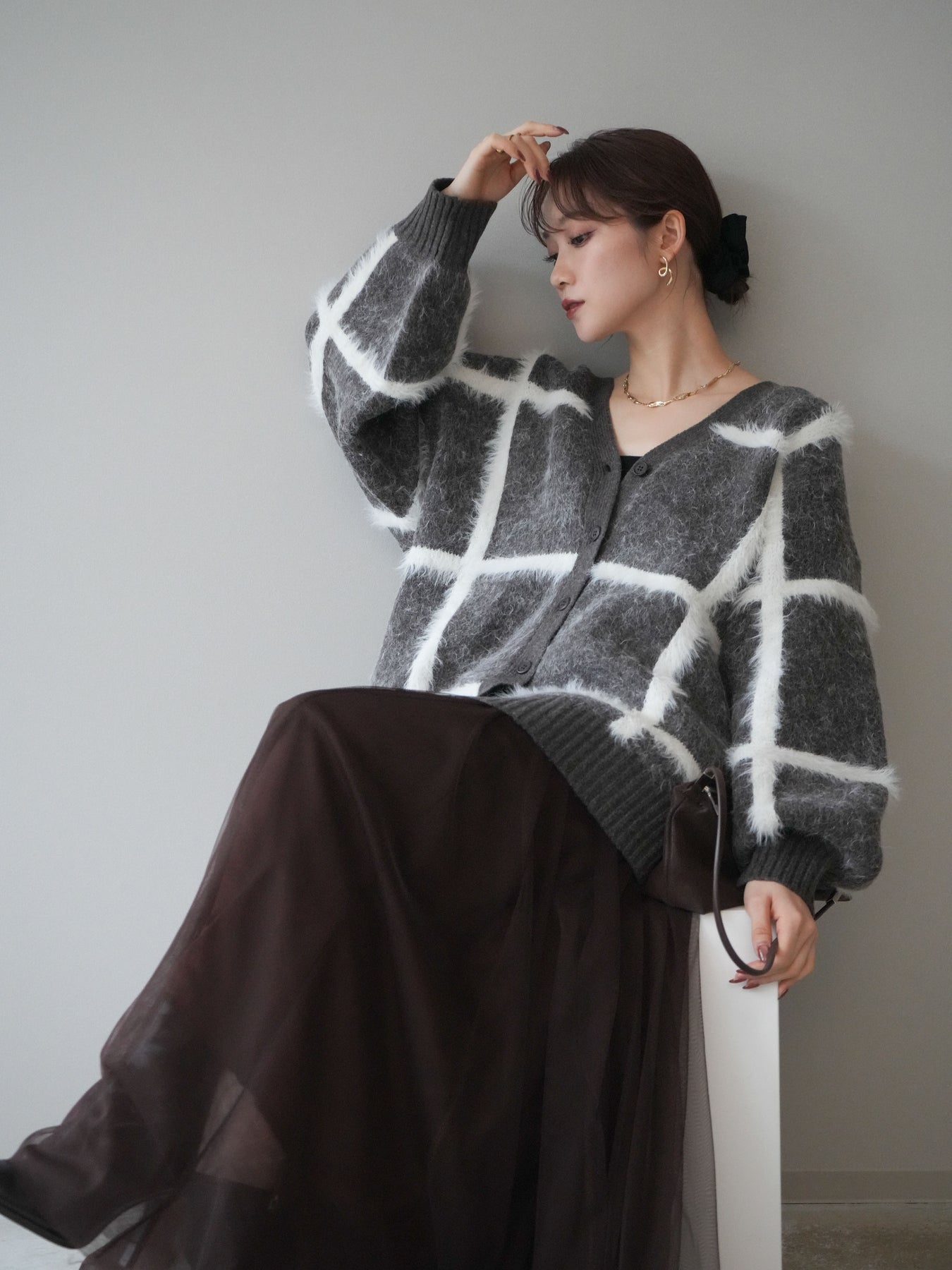 ふんわりとしたミックスシャギー素材で仕立てたチェック柄カーディガン。 異素材のような毛足の長い質感が表情豊かで、シーズンムードを高めてくれます。 大きめの格子デザインが目を惹き、羽織るだけでスタイリングの主役になる1枚。 ゆったりとしたシルエットが抜け感を演出し、リラックス感のある着心地です。 デニムやスカートなど、幅広いアイテムと好相性で、カジュアルにもフェミニンにも着回せる万能カーディガンです。 ※ボトムス、キャミソール(インナー)以外の商品は一律でインナーは付属していません。