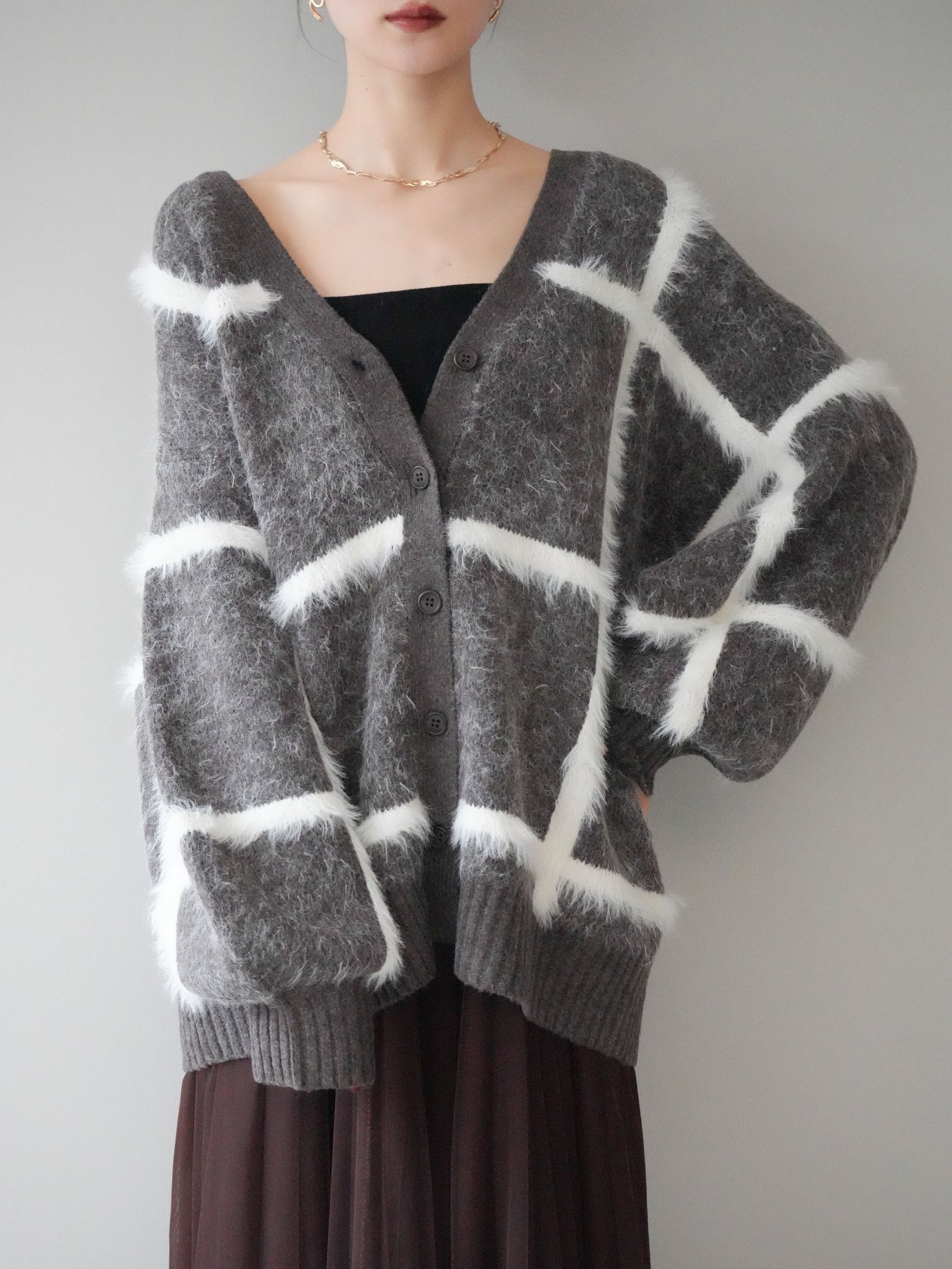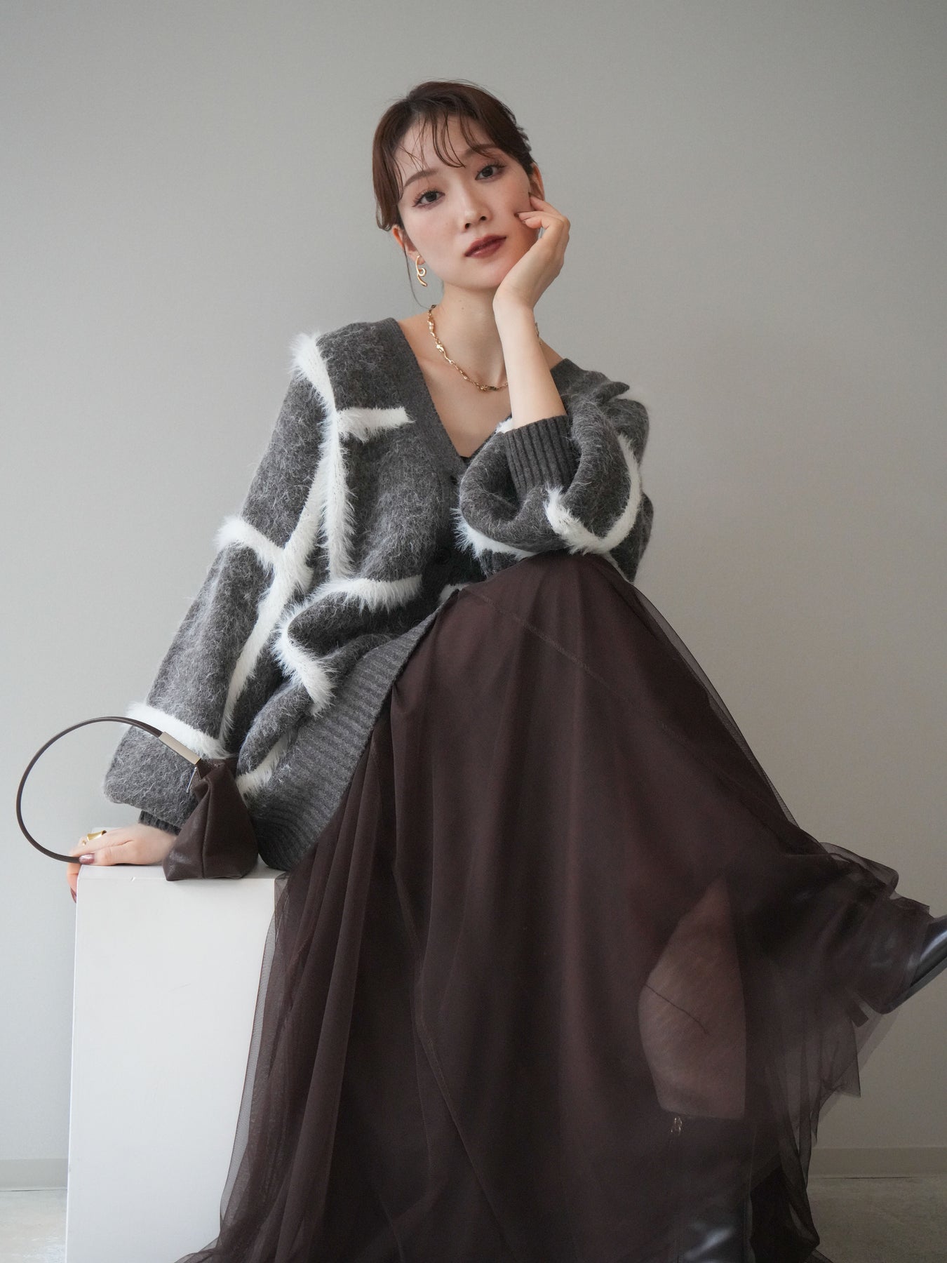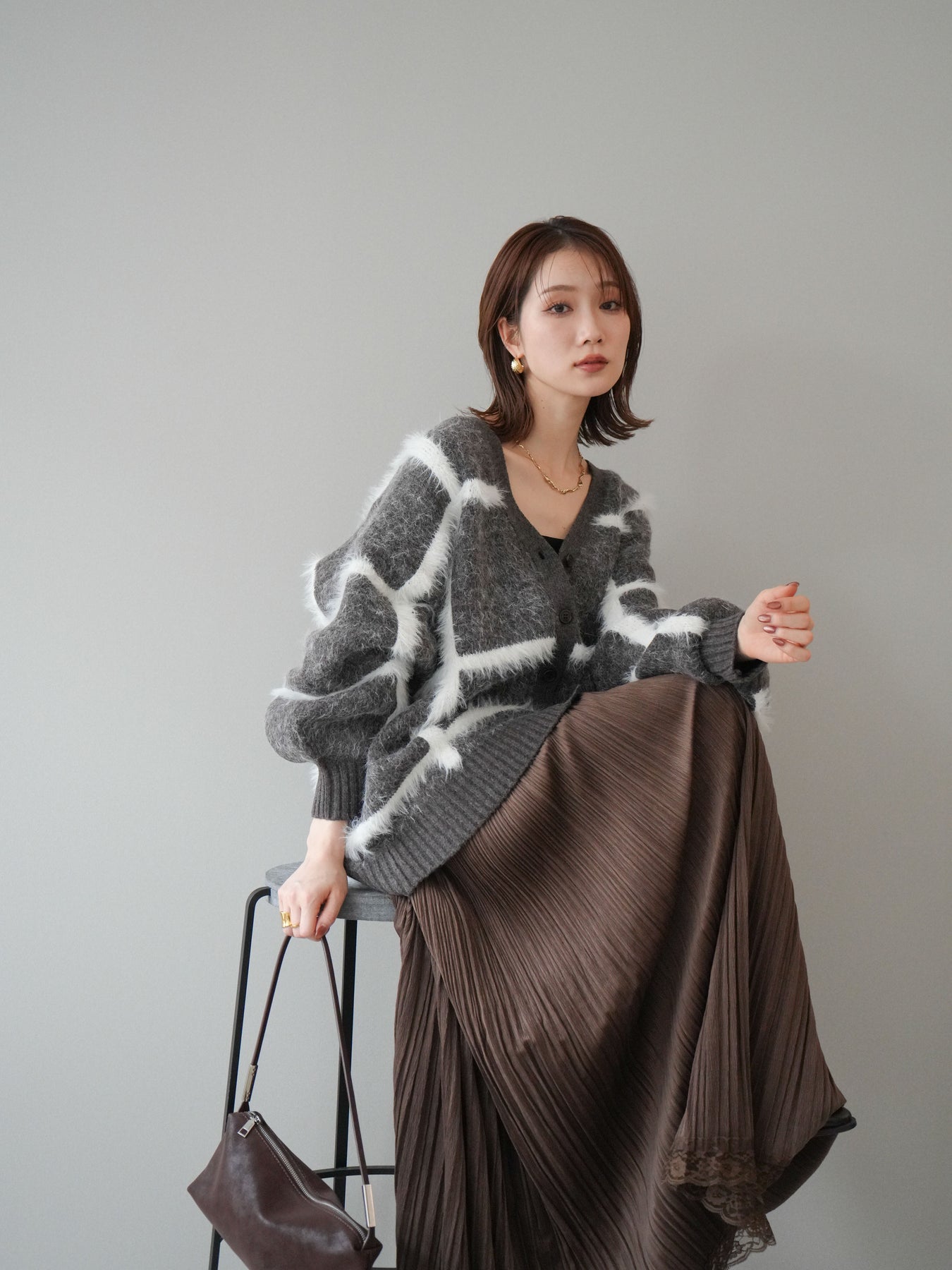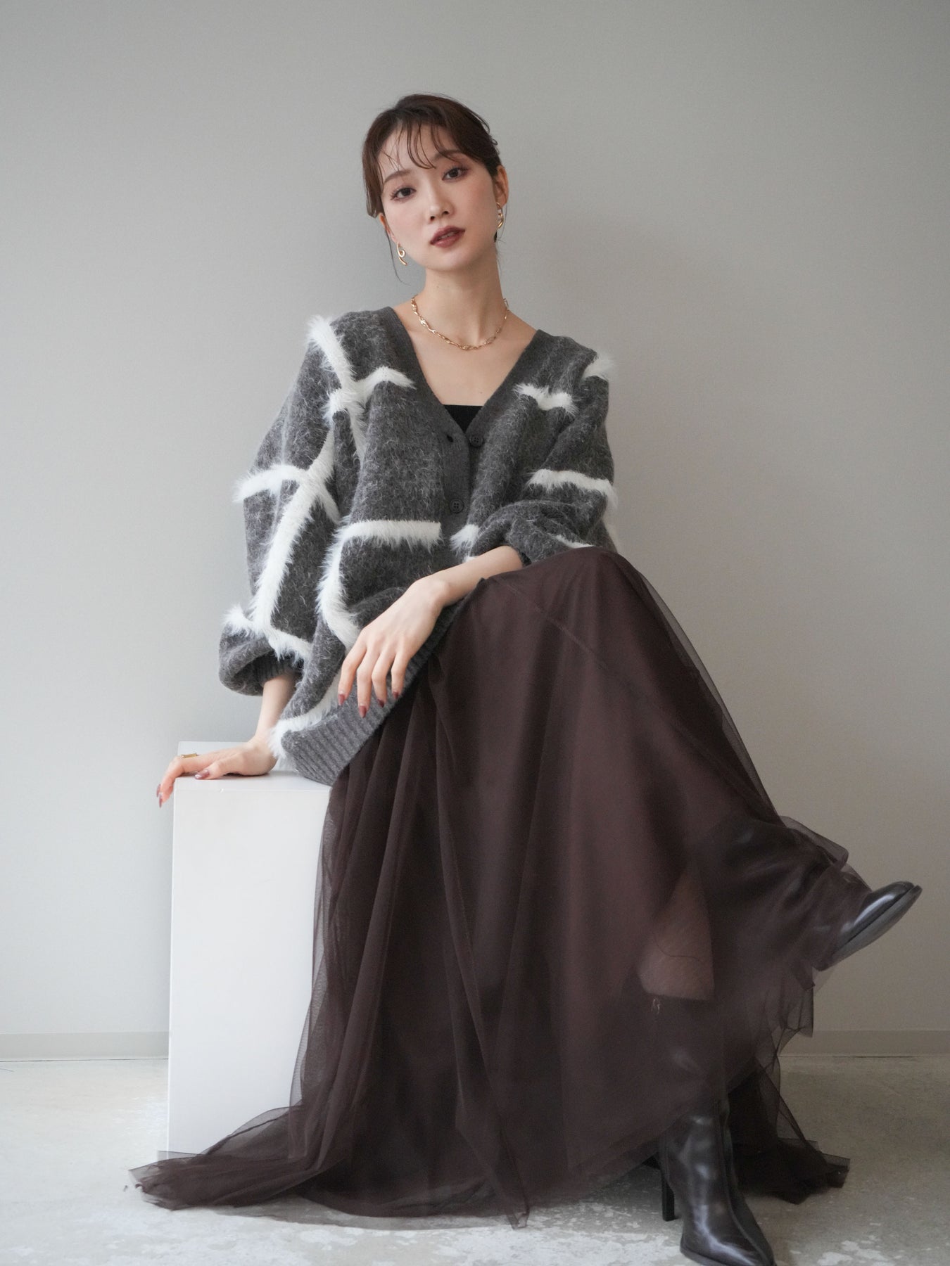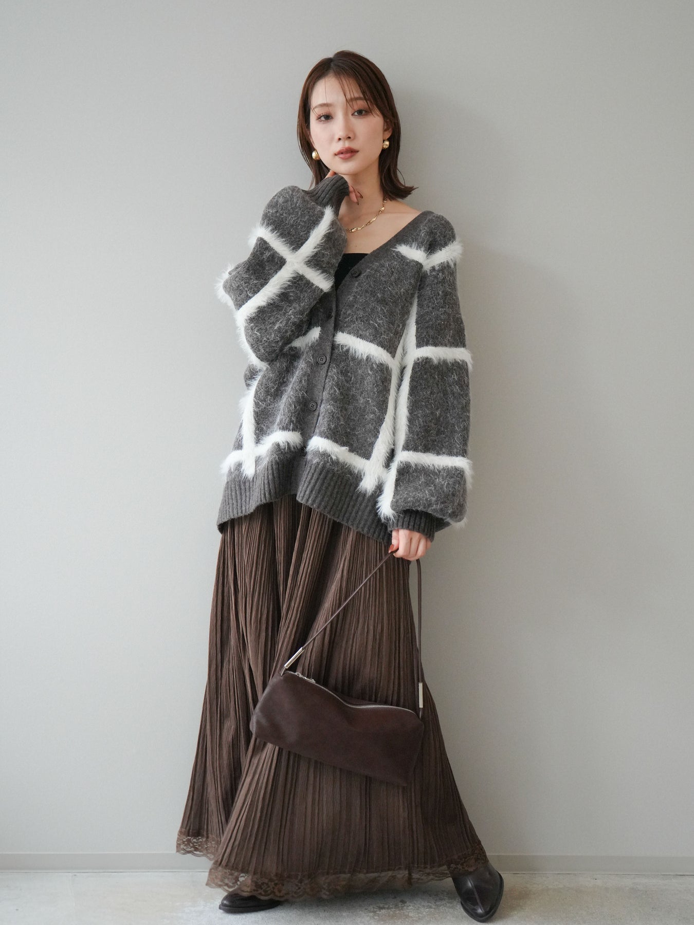 ふんわりとしたミックスシャギー素材で仕立てたチェック柄カーディガン。 異素材のような毛足の長い質感が表情豊かで、シーズンムードを高めてくれます。 大きめの格子デザインが目を惹き、羽織るだけでスタイリングの主役になる1枚。 ゆったりとしたシルエットが抜け感を演出し、リラックス感のある着心地です。 デニムやスカートなど、幅広いアイテムと好相性で、カジュアルにもフェミニンにも着回せる万能カーディガンです。 ※ボトムス、キャミソール(インナー)以外の商品は一律でインナーは付属していません。