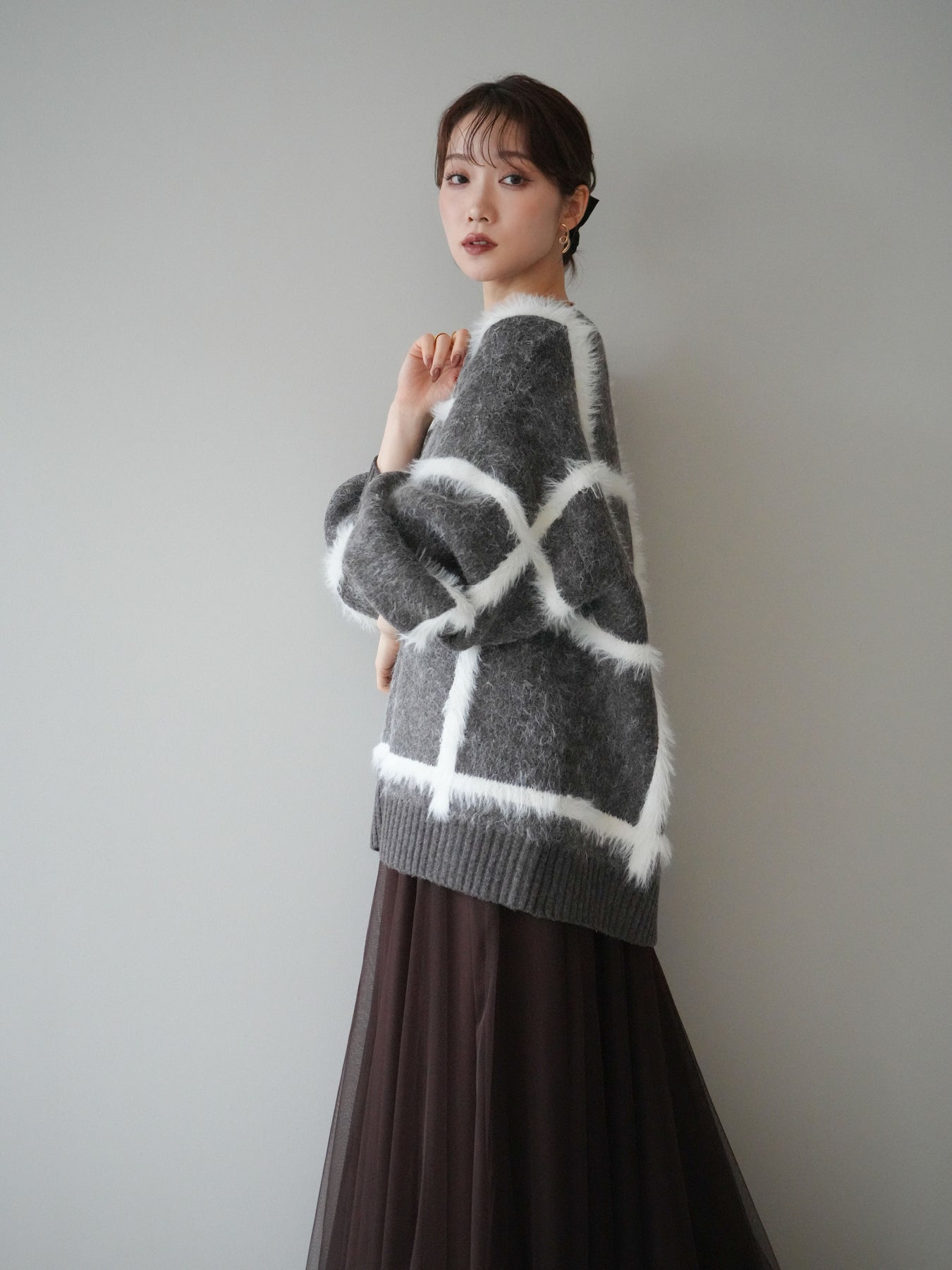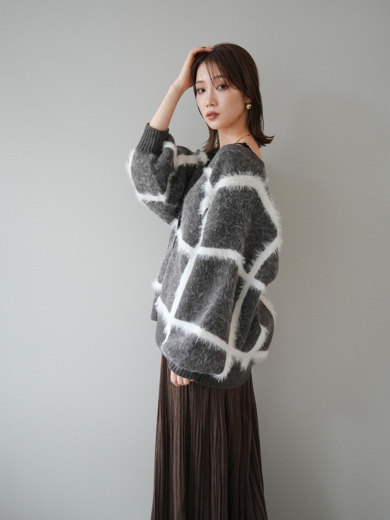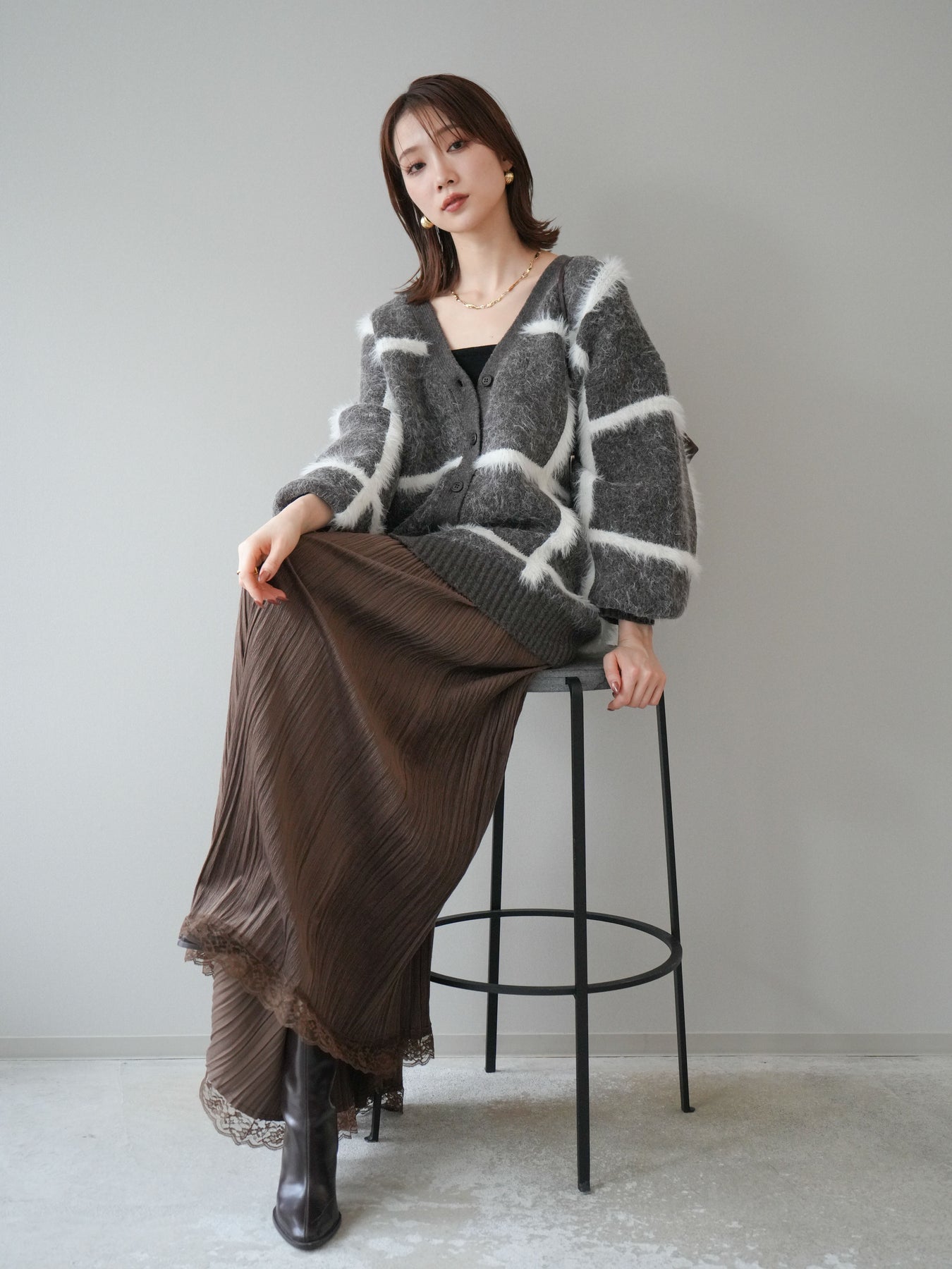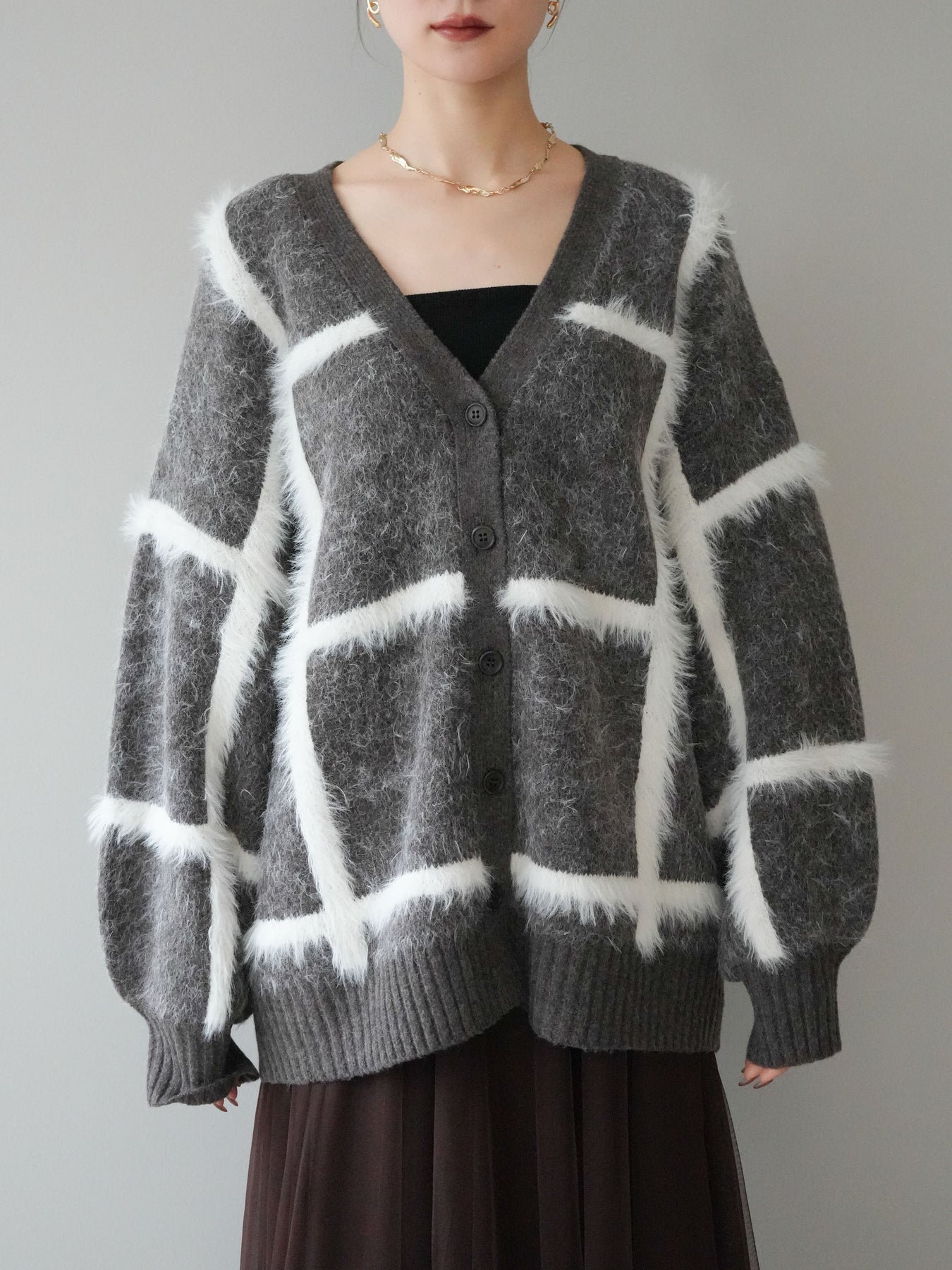ふんわりとしたミックスシャギー素材で仕立てたチェック柄カーディガン。 異素材のような毛足の長い質感が表情豊かで、シーズンムードを高めてくれます。 大きめの格子デザインが目を惹き、羽織るだけでスタイリングの主役になる1枚。 ゆったりとしたシルエットが抜け感を演出し、リラックス感のある着心地です。 デニムやスカートなど、幅広いアイテムと好相性で、カジュアルにもフェミニンにも着回せる万能カーディガンです。 ※ボトムス、キャミソール(インナー)以外の商品は一律でインナーは付属していません。
