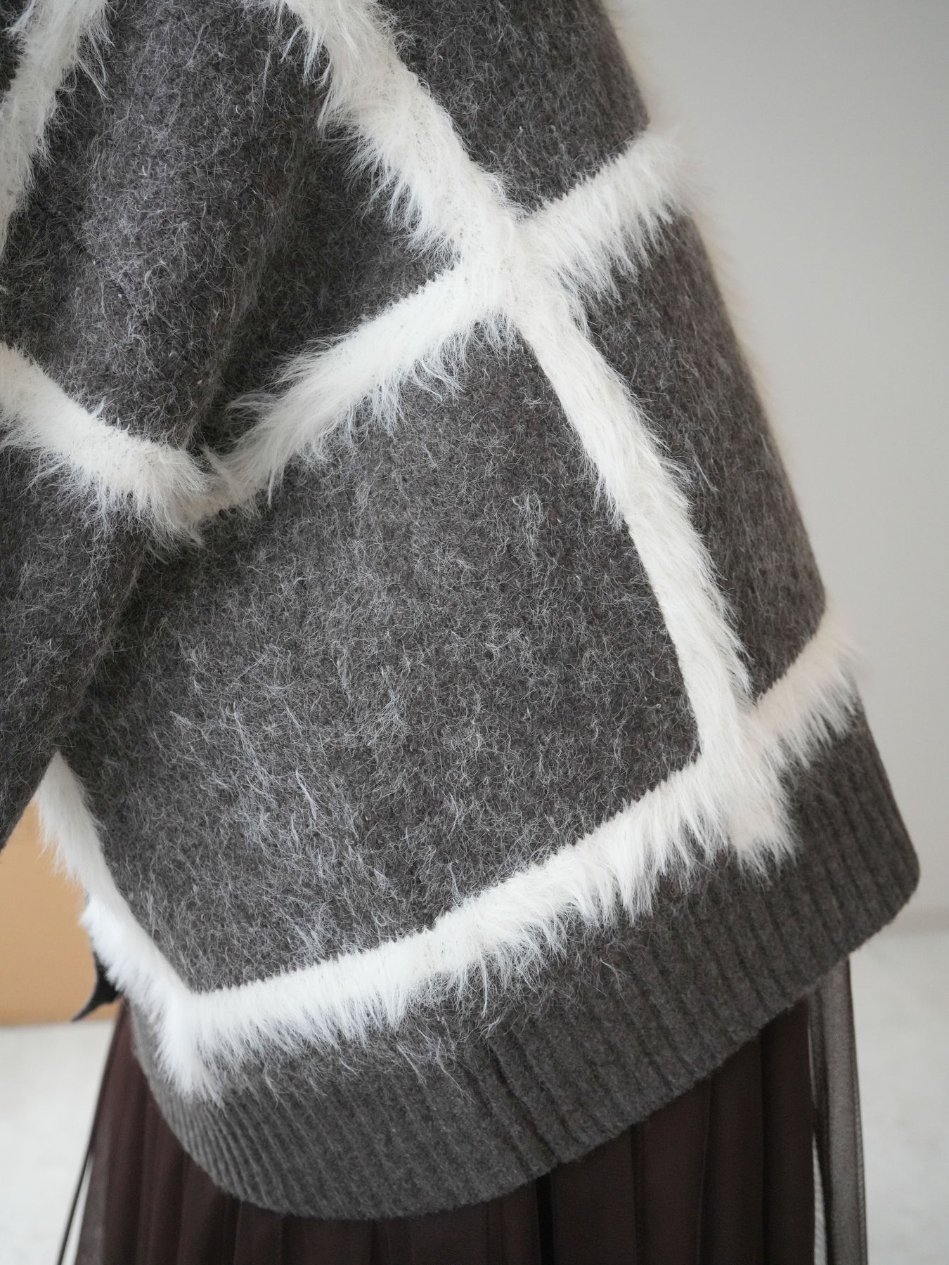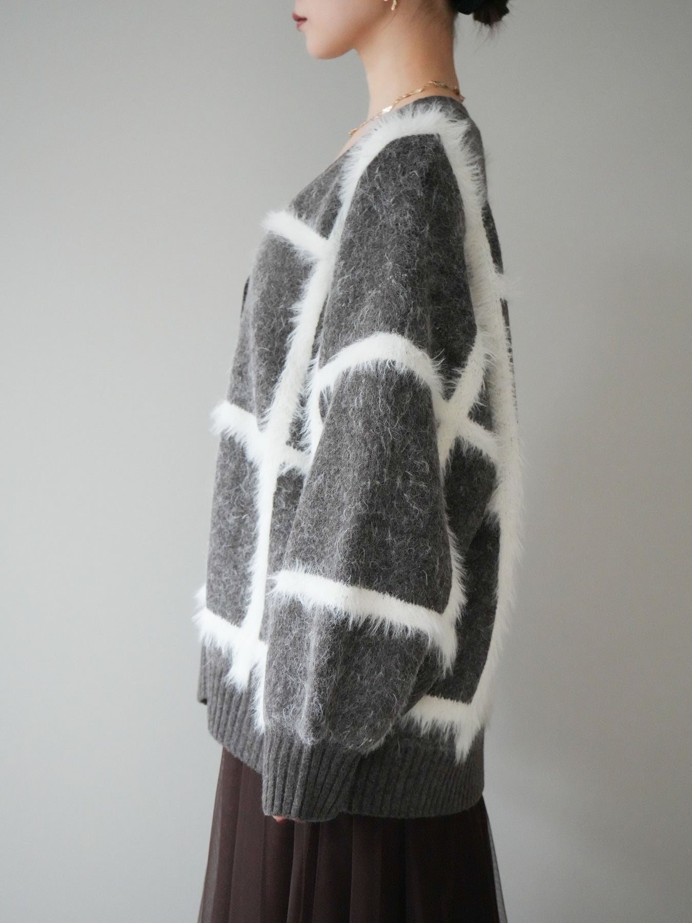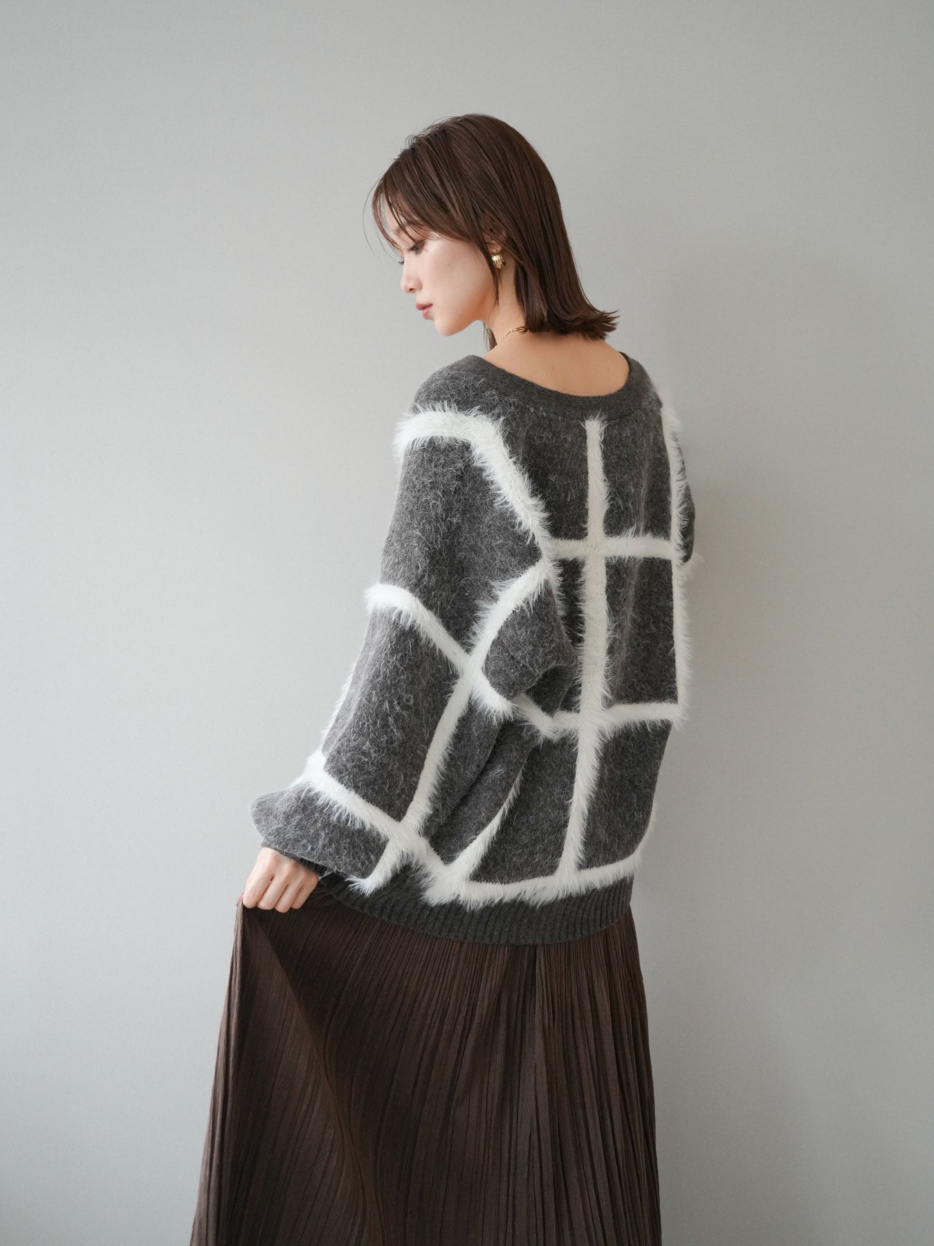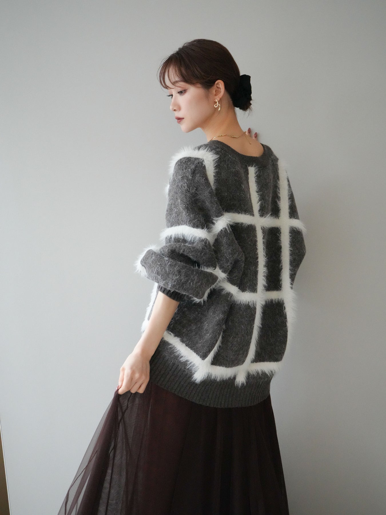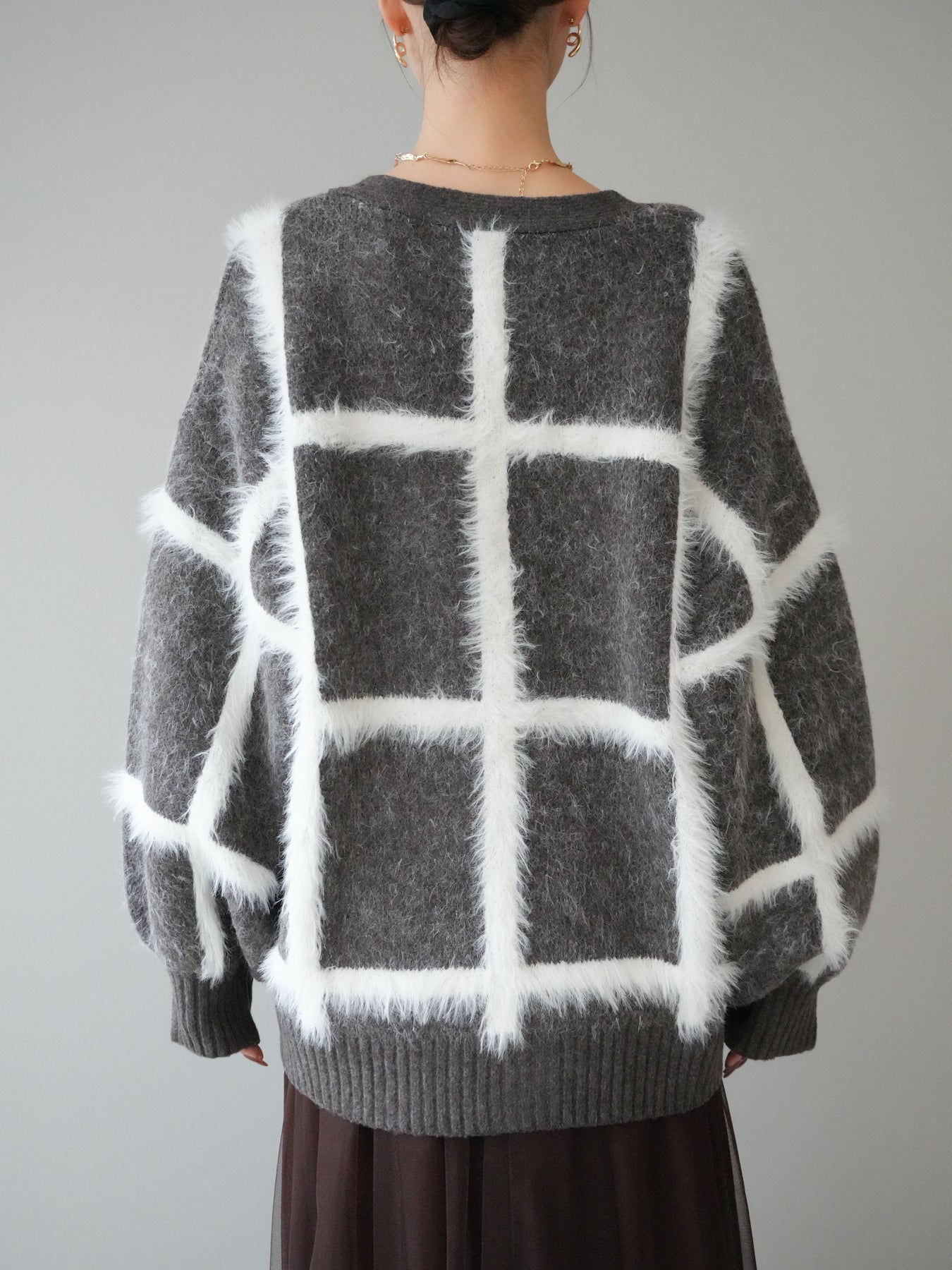 ふんわりとしたミックスシャギー素材で仕立てたチェック柄カーディガン。 異素材のような毛足の長い質感が表情豊かで、シーズンムードを高めてくれます。 大きめの格子デザインが目を惹き、羽織るだけでスタイリングの主役になる1枚。 ゆったりとしたシルエットが抜け感を演出し、リラックス感のある着心地です。 デニムやスカートなど、幅広いアイテムと好相性で、カジュアルにもフェミニンにも着回せる万能カーディガンです。 ※ボトムス、キャミソール(インナー)以外の商品は一律でインナーは付属していません。