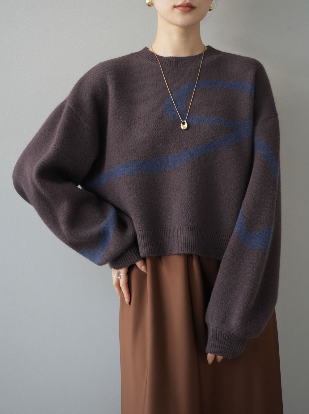 [予約]ジャガードリボンボリュームスリーブショートニット/ブラウン