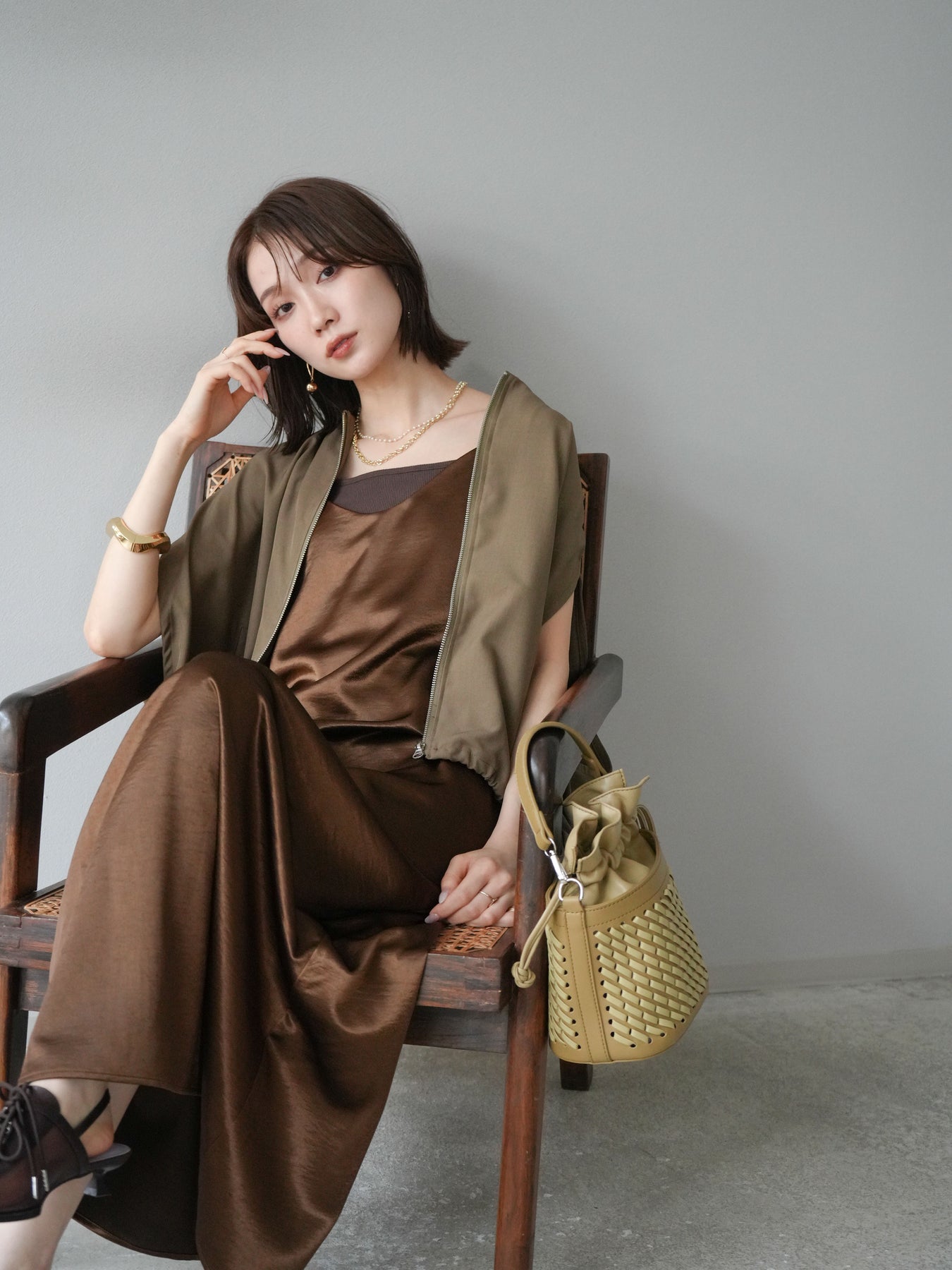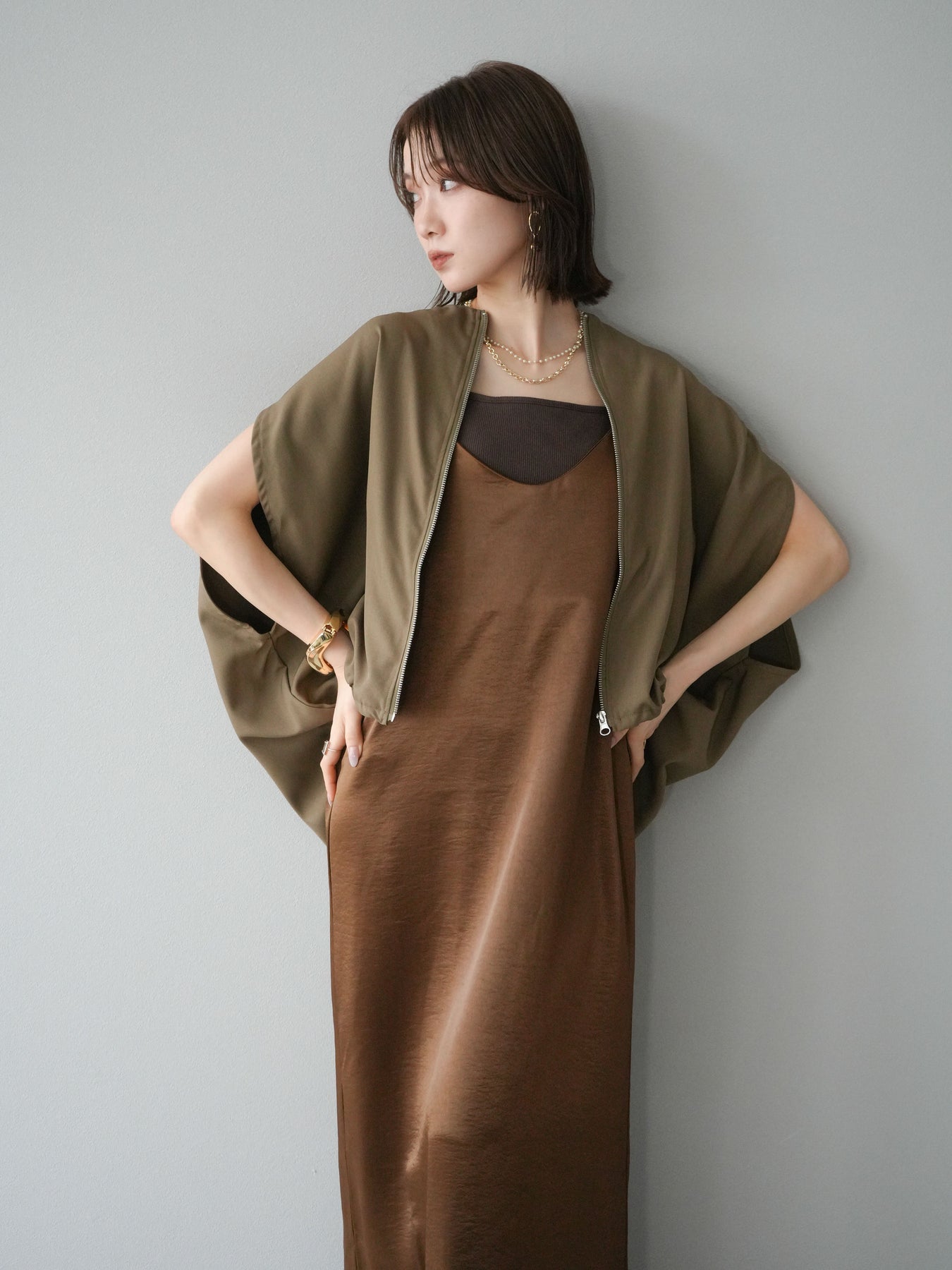 上品な光沢感が魅力のサテン素材を使用したキャミワンピース。滑らかな落ち感が美しい縦ラインを強調し、シンプルながらも女性らしい雰囲気を演出します。華奢なストラップと程よく開いたネックラインが抜け感を生み、インナーや羽織りとのレイヤードスタイルにも好相性。シーズンレスで活躍し、カジュアルからドレッシーまで幅広いシーンに対応できる万能アイテムです。