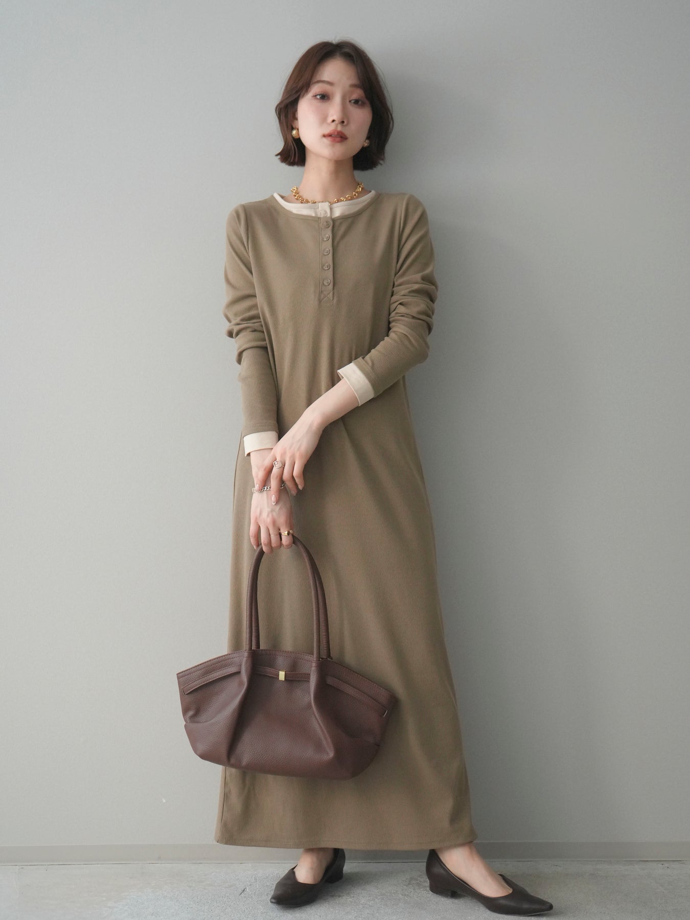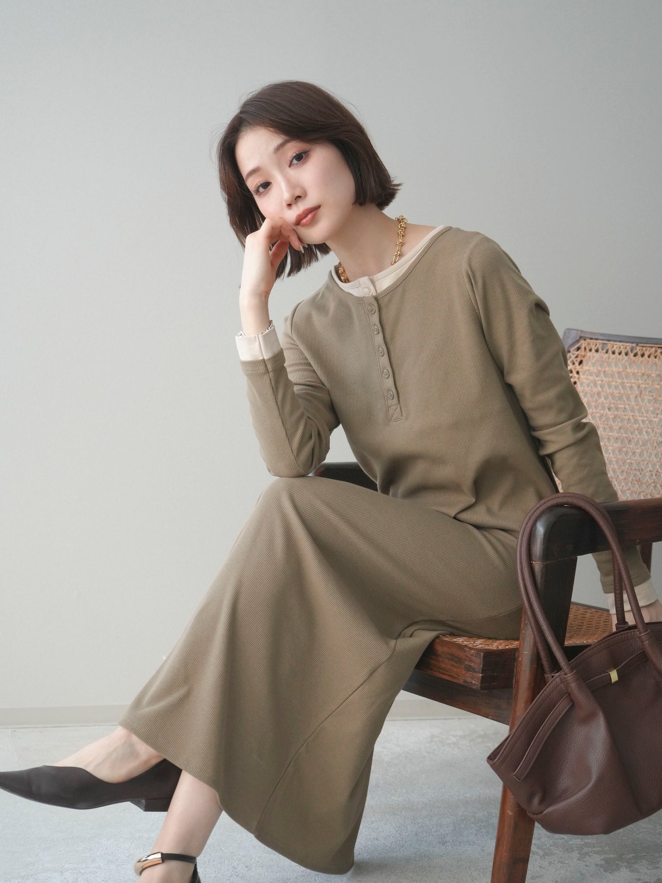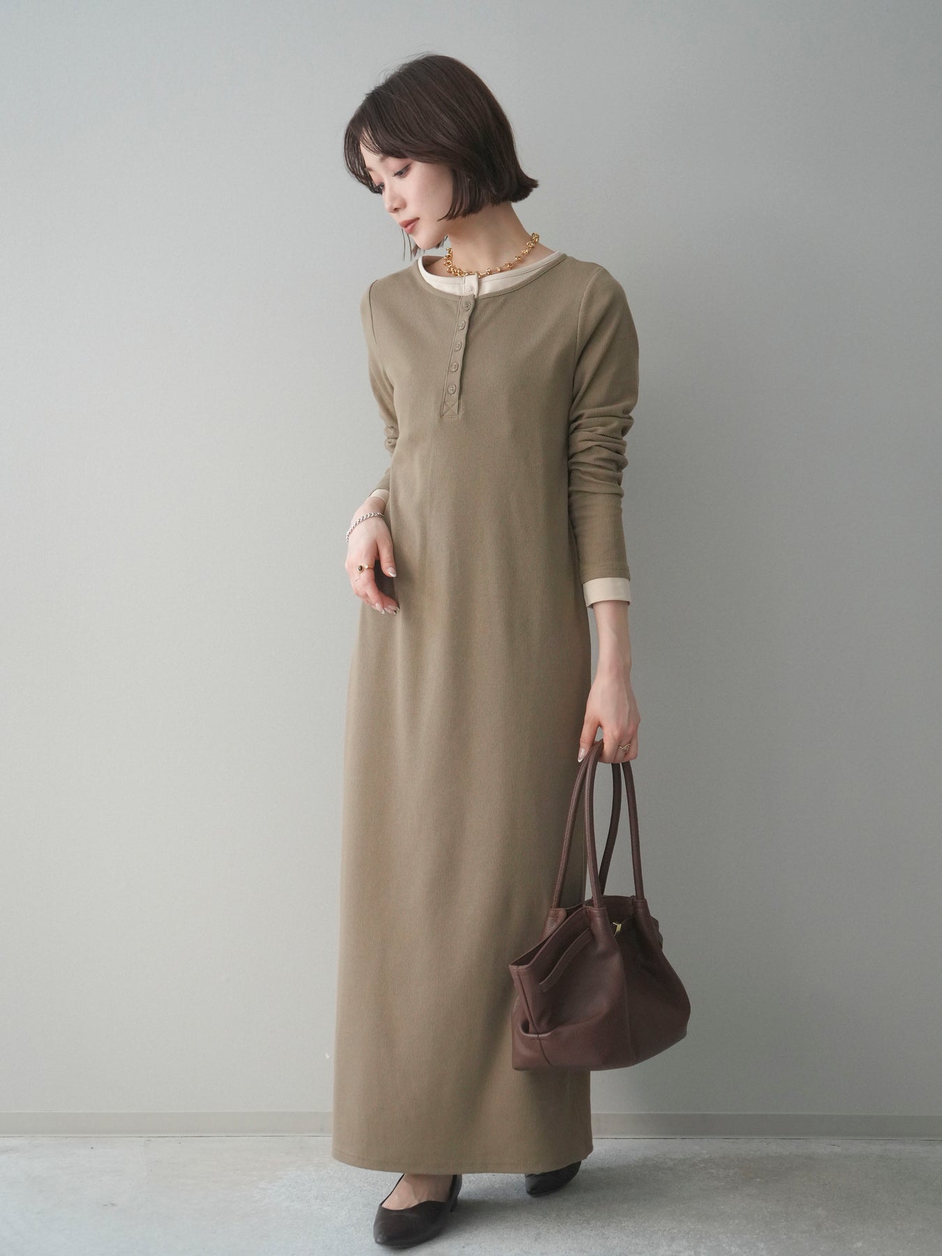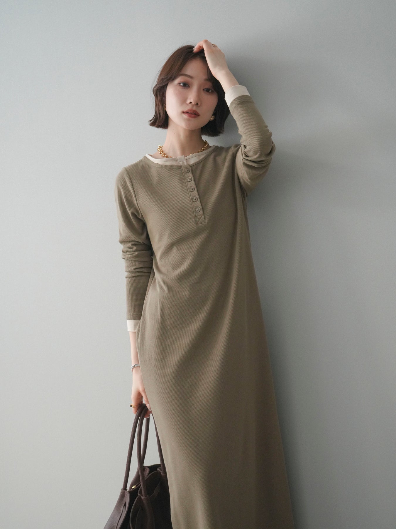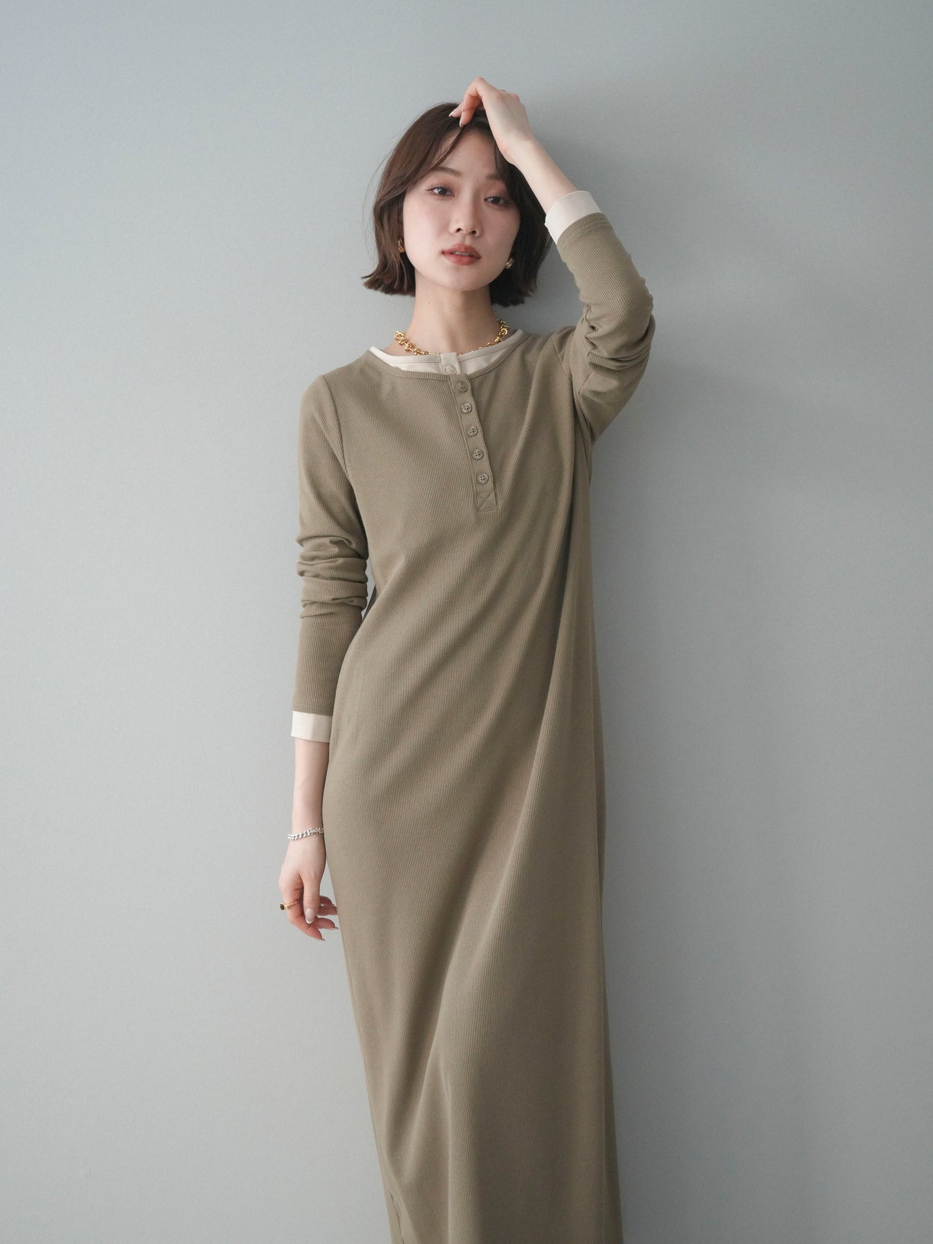 配色デザインを効かせたレイヤード風のヘンリーネックカットリブワンピース。 首元と袖口に覗くコントラストが、シンプルな中にさりげないアクセントを添えています。 程よく身体に沿うリブ素材は、縦ラインを強調し、すっきりとした印象に。 フロントのヘンリーネックデザインが抜け感を生み、ボタンの開け閉めで表情の変化も楽しめます。 一枚でスタイルが完成し、シューズや小物次第で雰囲気を切り替えられる、着回し力の高い一着です。 ※ボトムス、キャミソール(インナー)以外の商品は一律でインナーは付属していません。
