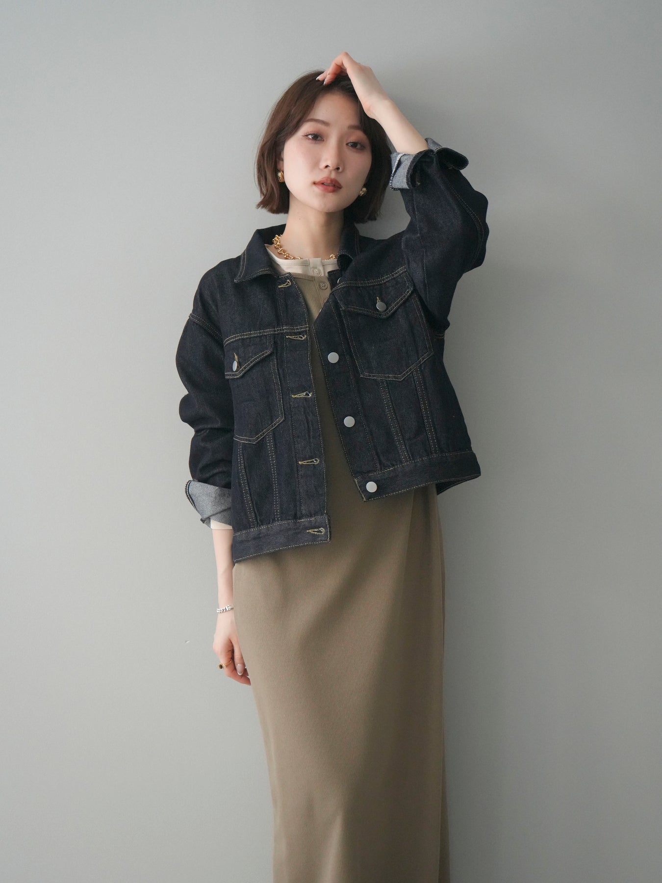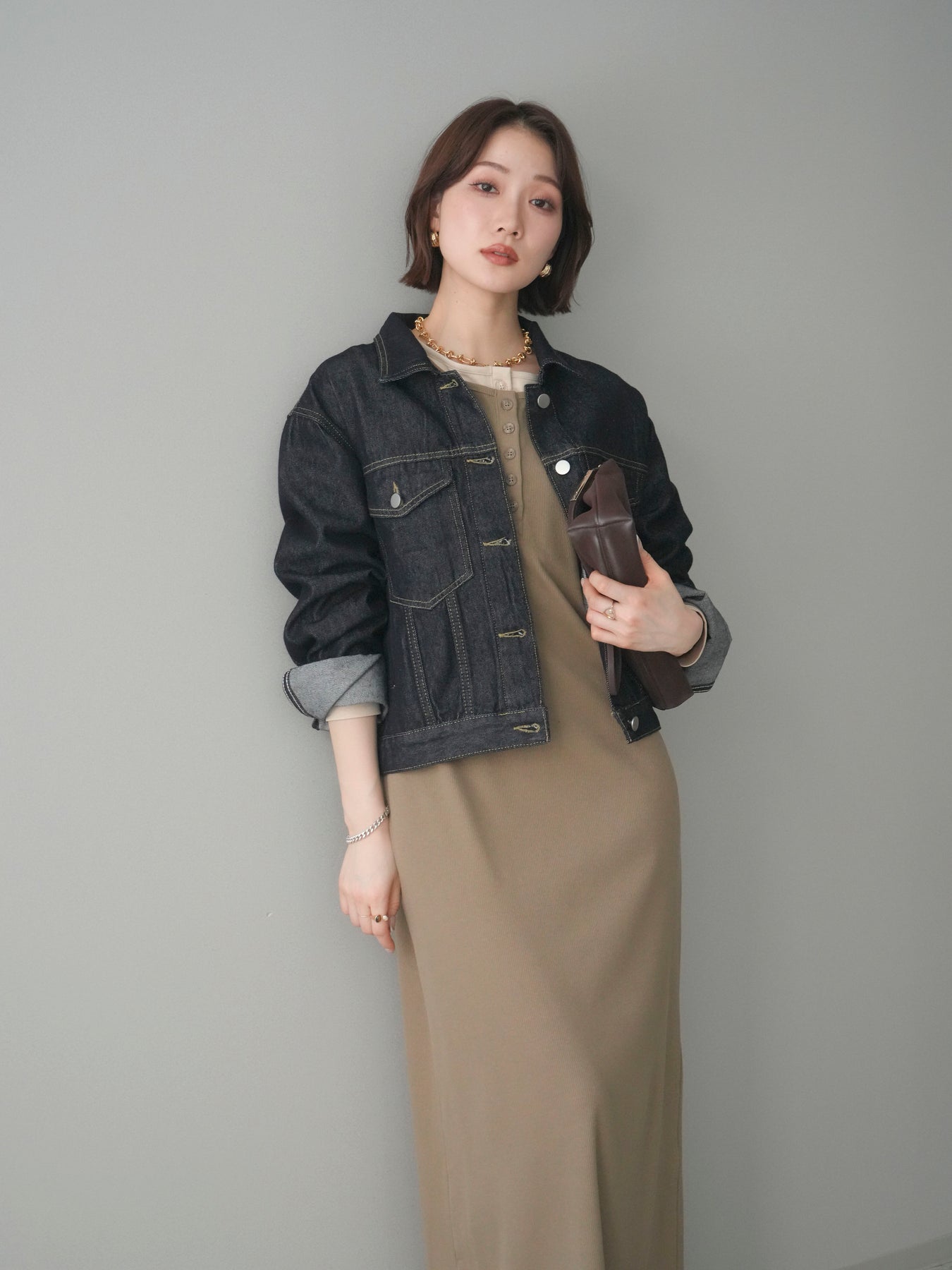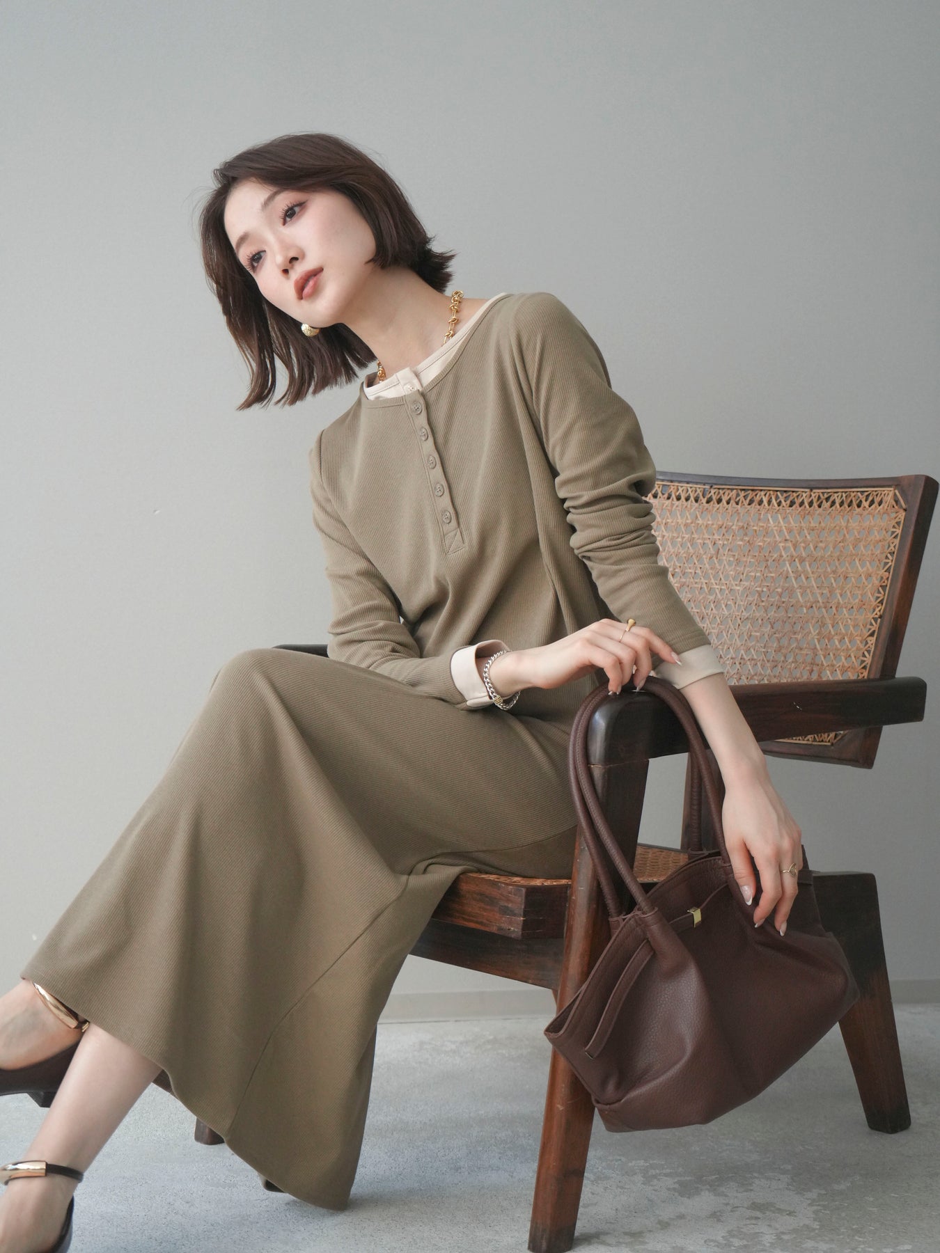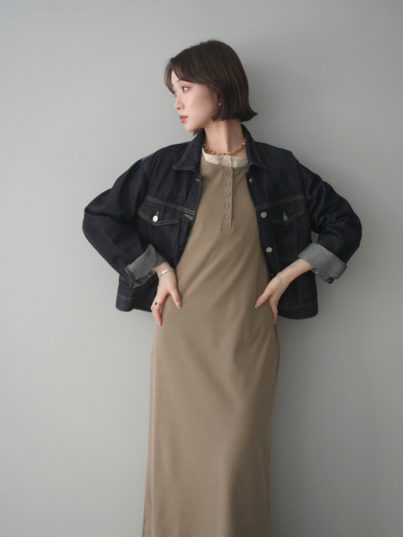 配色デザインを効かせたレイヤード風のヘンリーネックカットリブワンピース。 首元と袖口に覗くコントラストが、シンプルな中にさりげないアクセントを添えています。 程よく身体に沿うリブ素材は、縦ラインを強調し、すっきりとした印象に。 フロントのヘンリーネックデザインが抜け感を生み、ボタンの開け閉めで表情の変化も楽しめます。 一枚でスタイルが完成し、シューズや小物次第で雰囲気を切り替えられる、着回し力の高い一着です。 ※ボトムス、キャミソール(インナー)以外の商品は一律でインナーは付属していません。
