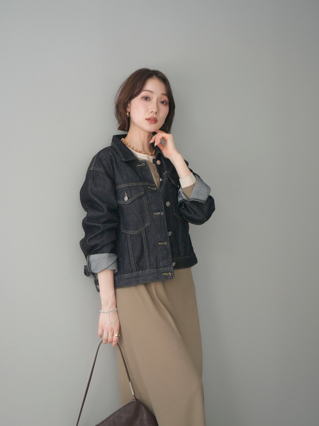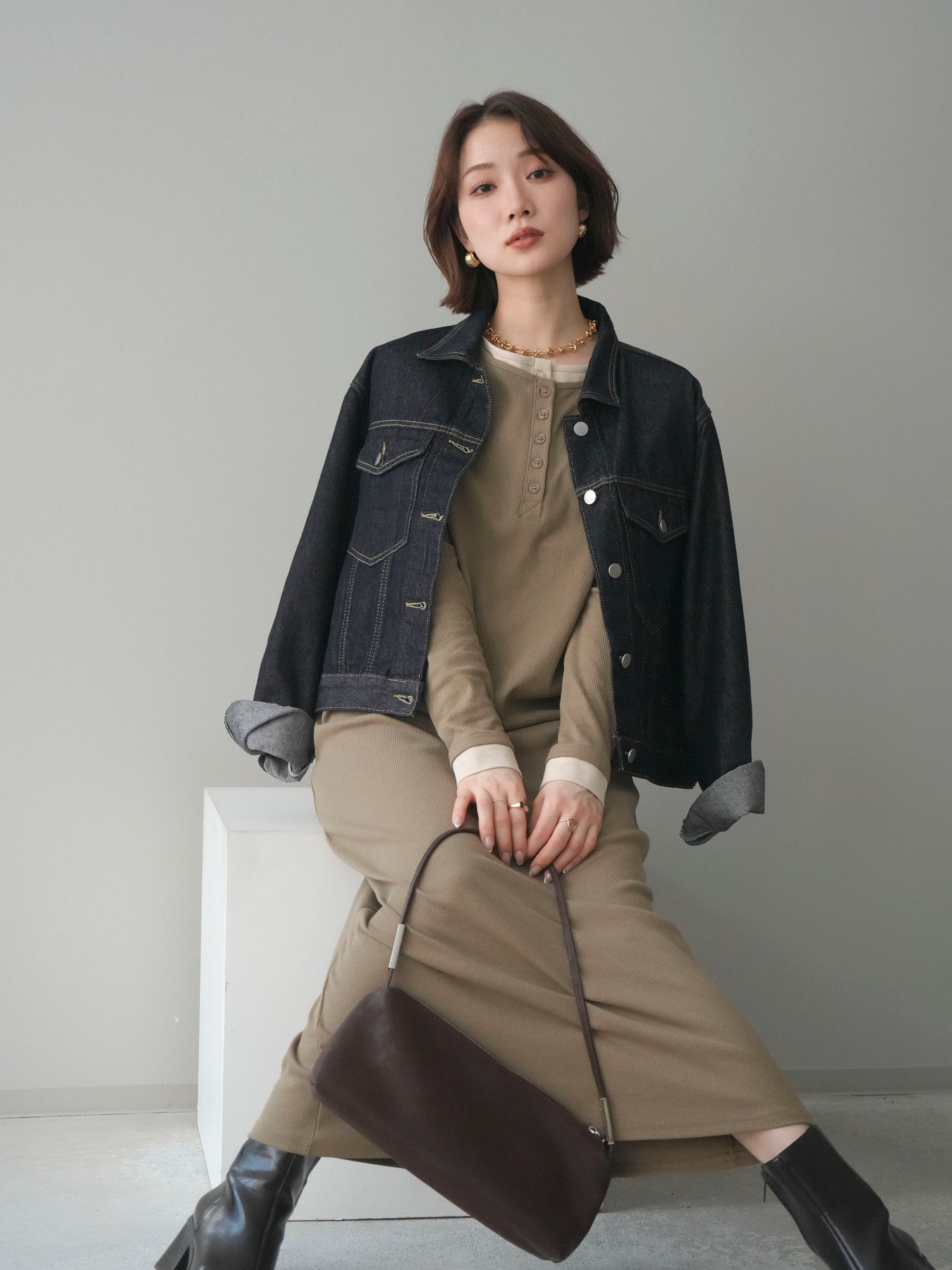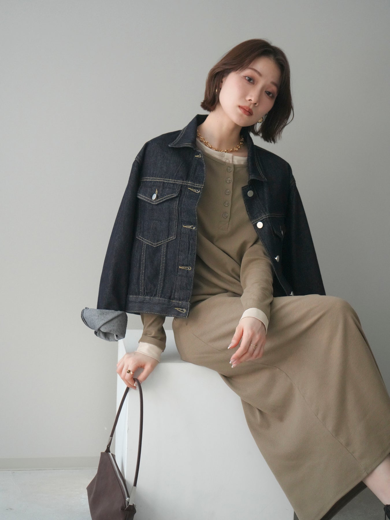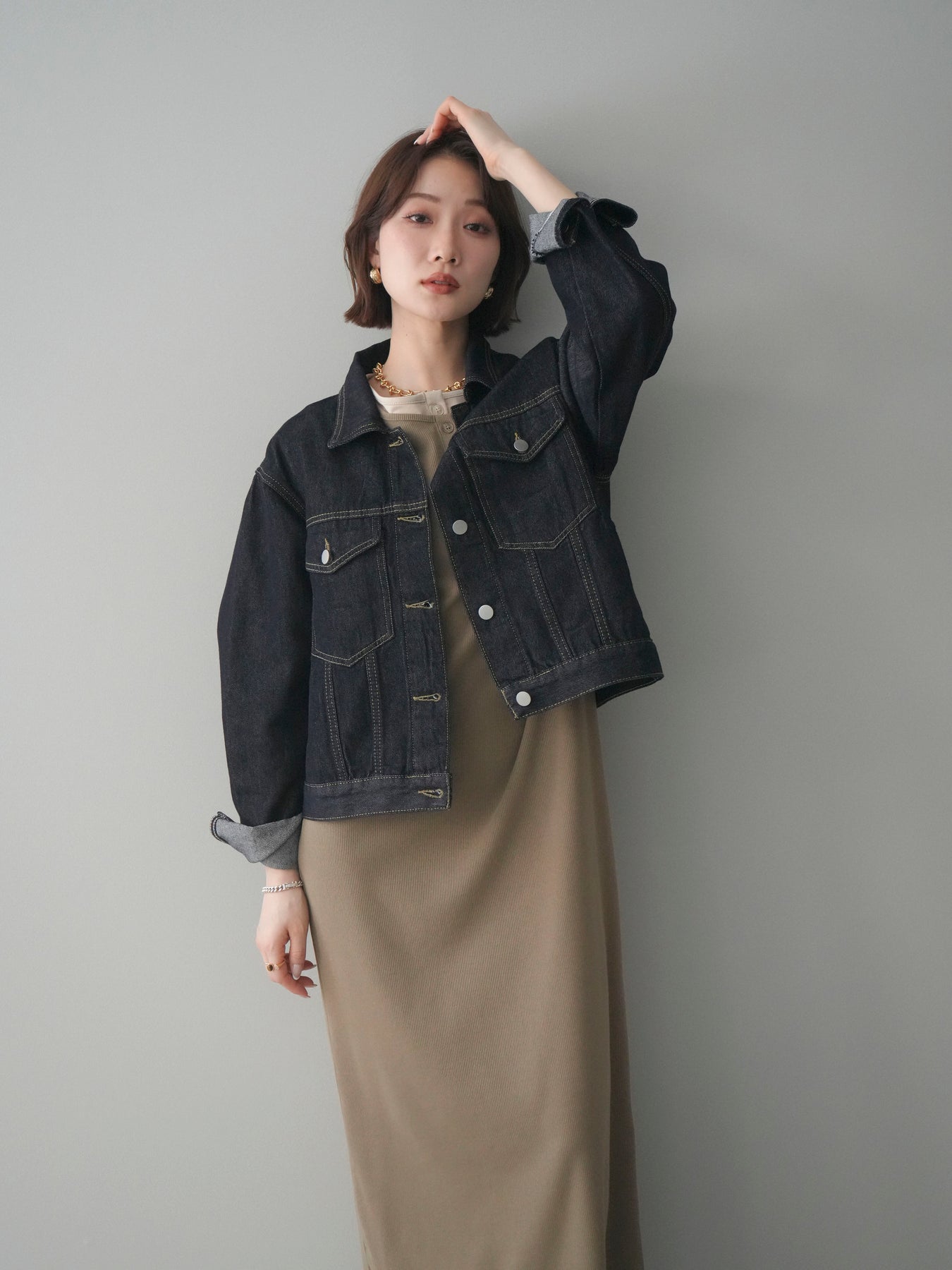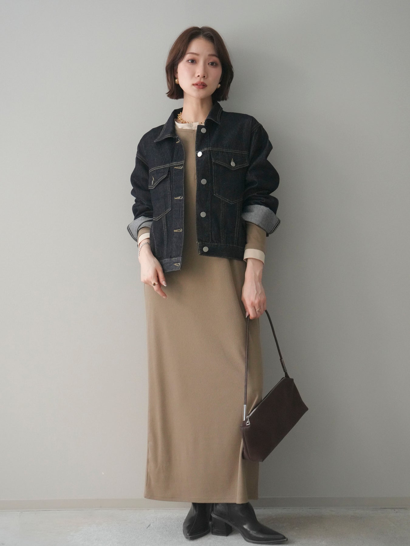 配色デザインを効かせたレイヤード風のヘンリーネックカットリブワンピース。 首元と袖口に覗くコントラストが、シンプルな中にさりげないアクセントを添えています。 程よく身体に沿うリブ素材は、縦ラインを強調し、すっきりとした印象に。 フロントのヘンリーネックデザインが抜け感を生み、ボタンの開け閉めで表情の変化も楽しめます。 一枚でスタイルが完成し、シューズや小物次第で雰囲気を切り替えられる、着回し力の高い一着です。 ※ボトムス、キャミソール(インナー)以外の商品は一律でインナーは付属していません。