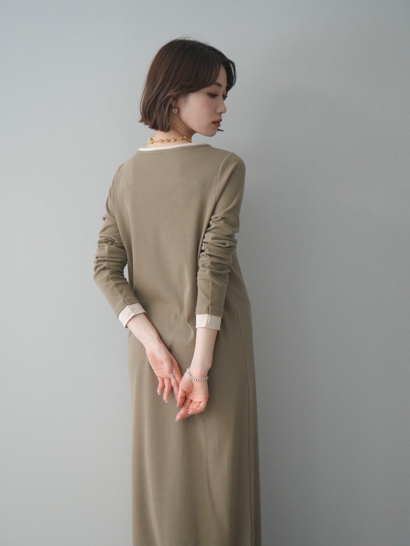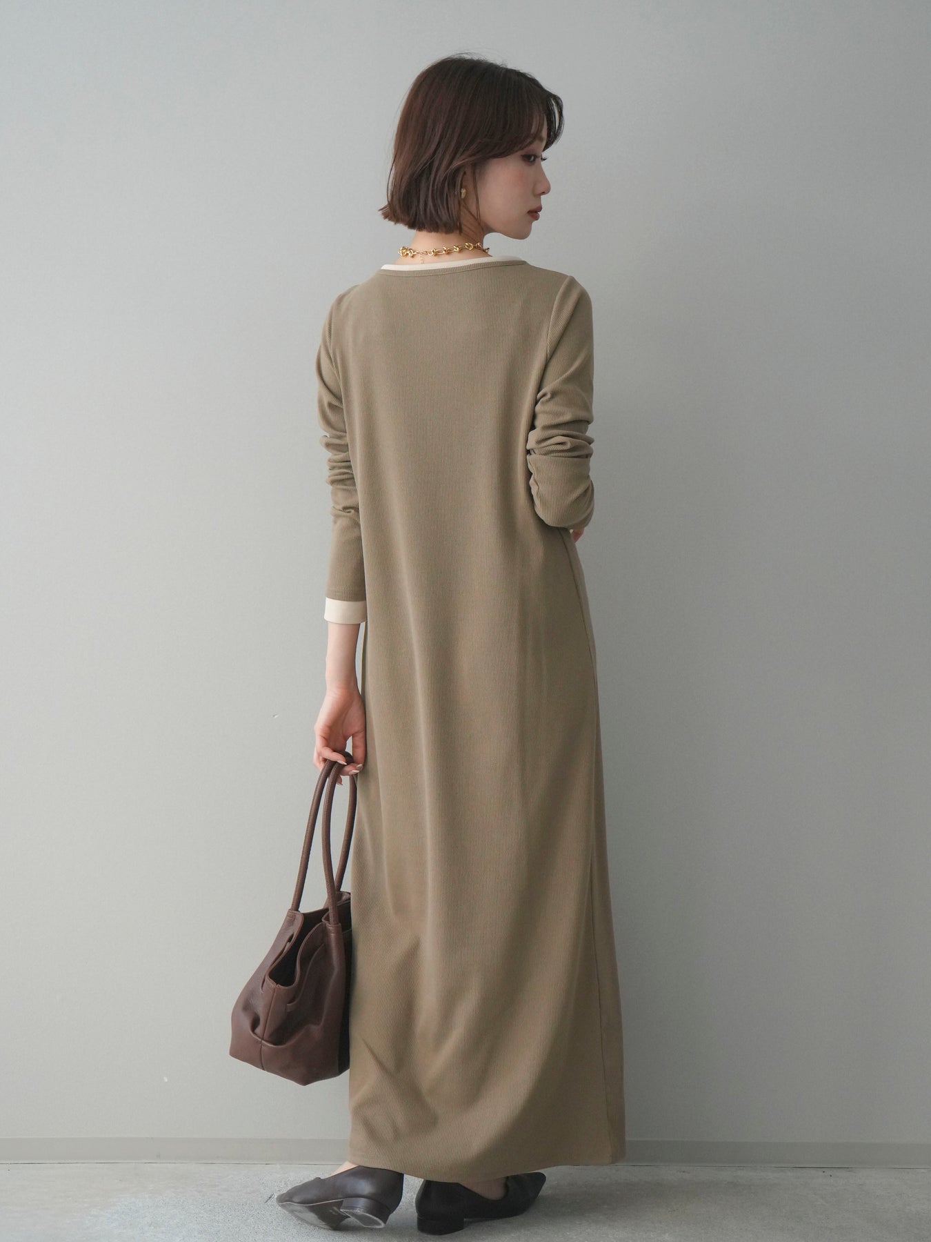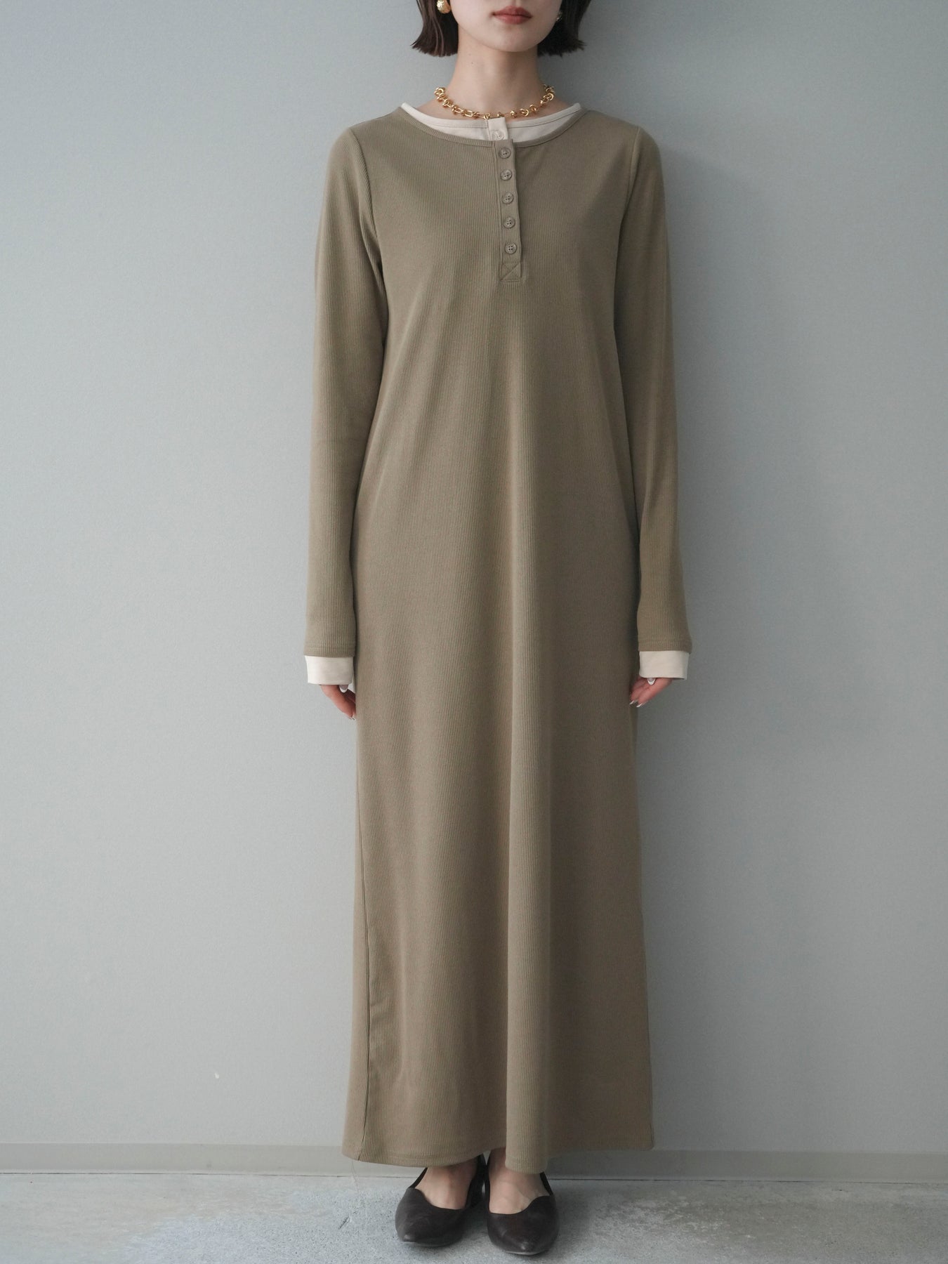 [予約]配色レイヤードヘンリーネックカットリブワンピース/mocha