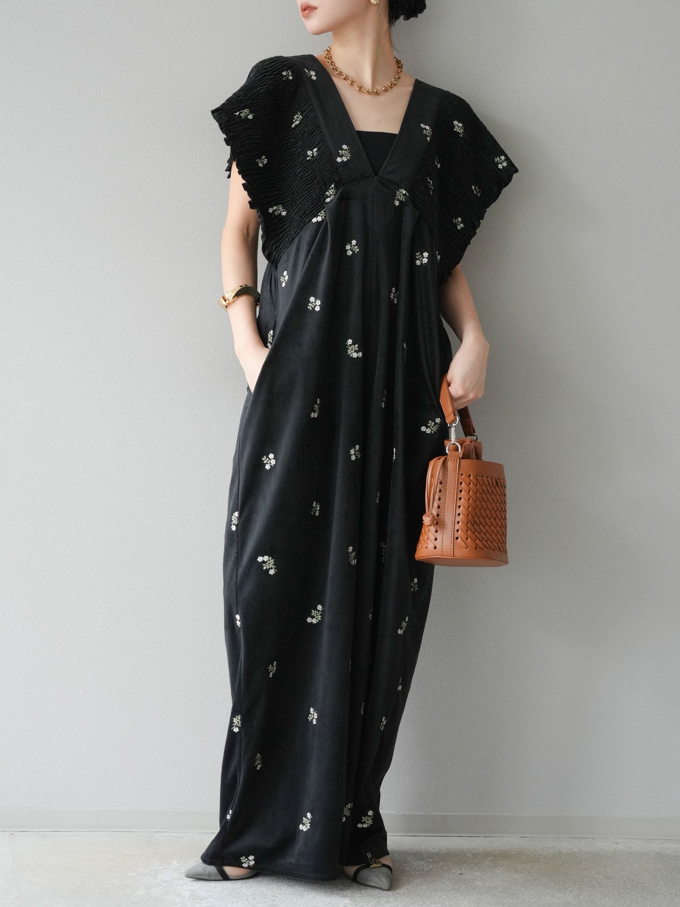 [予約]ベロアフラワー刺繍シャーリングサロペット/ブラック