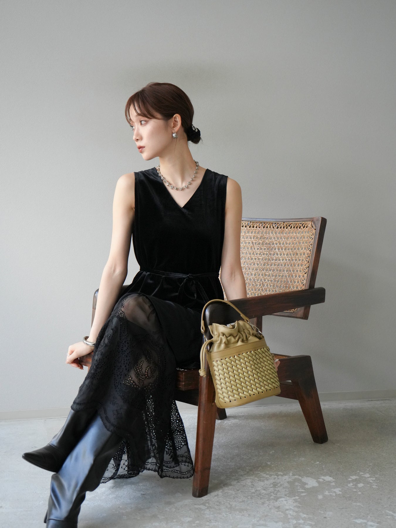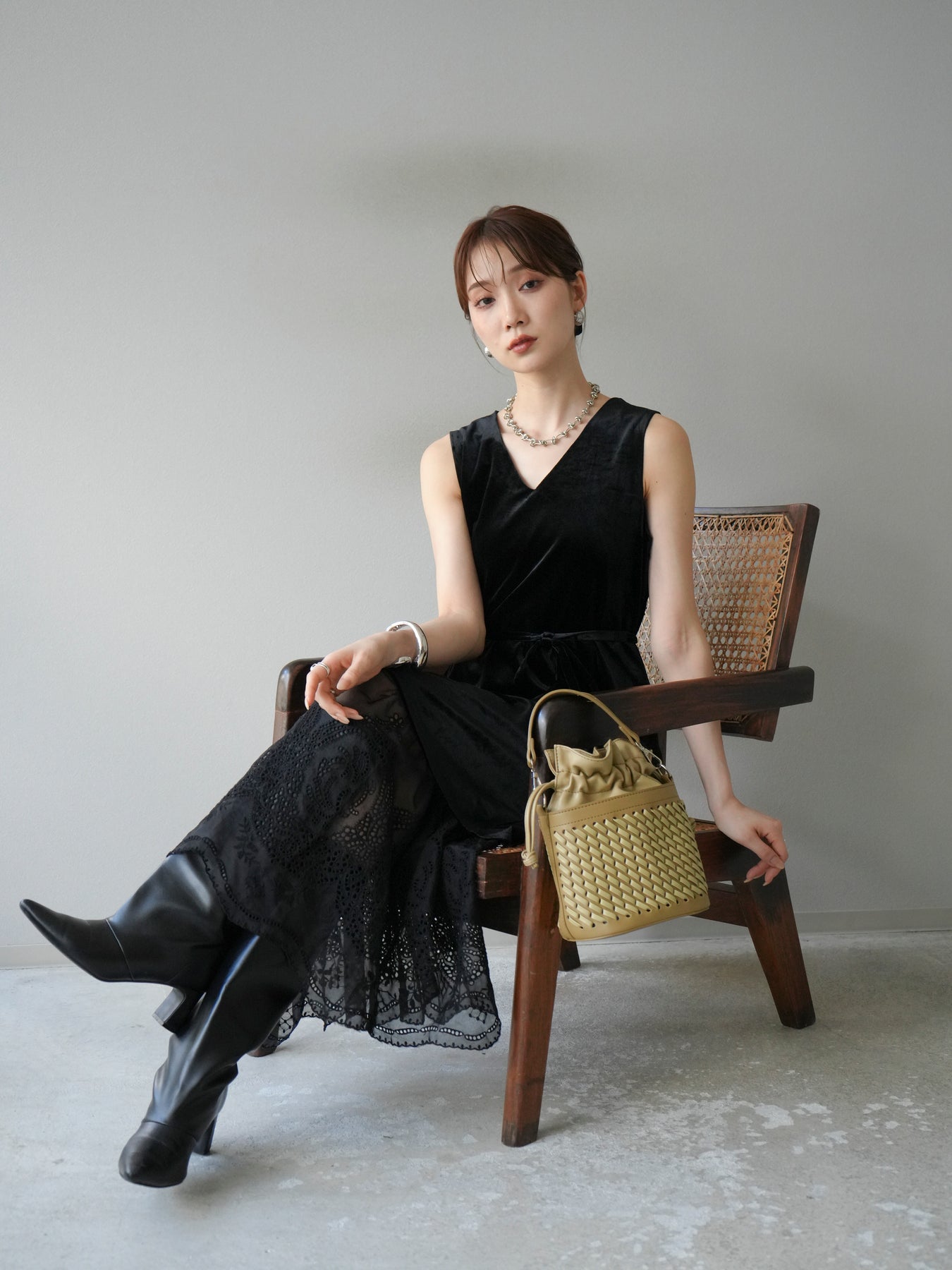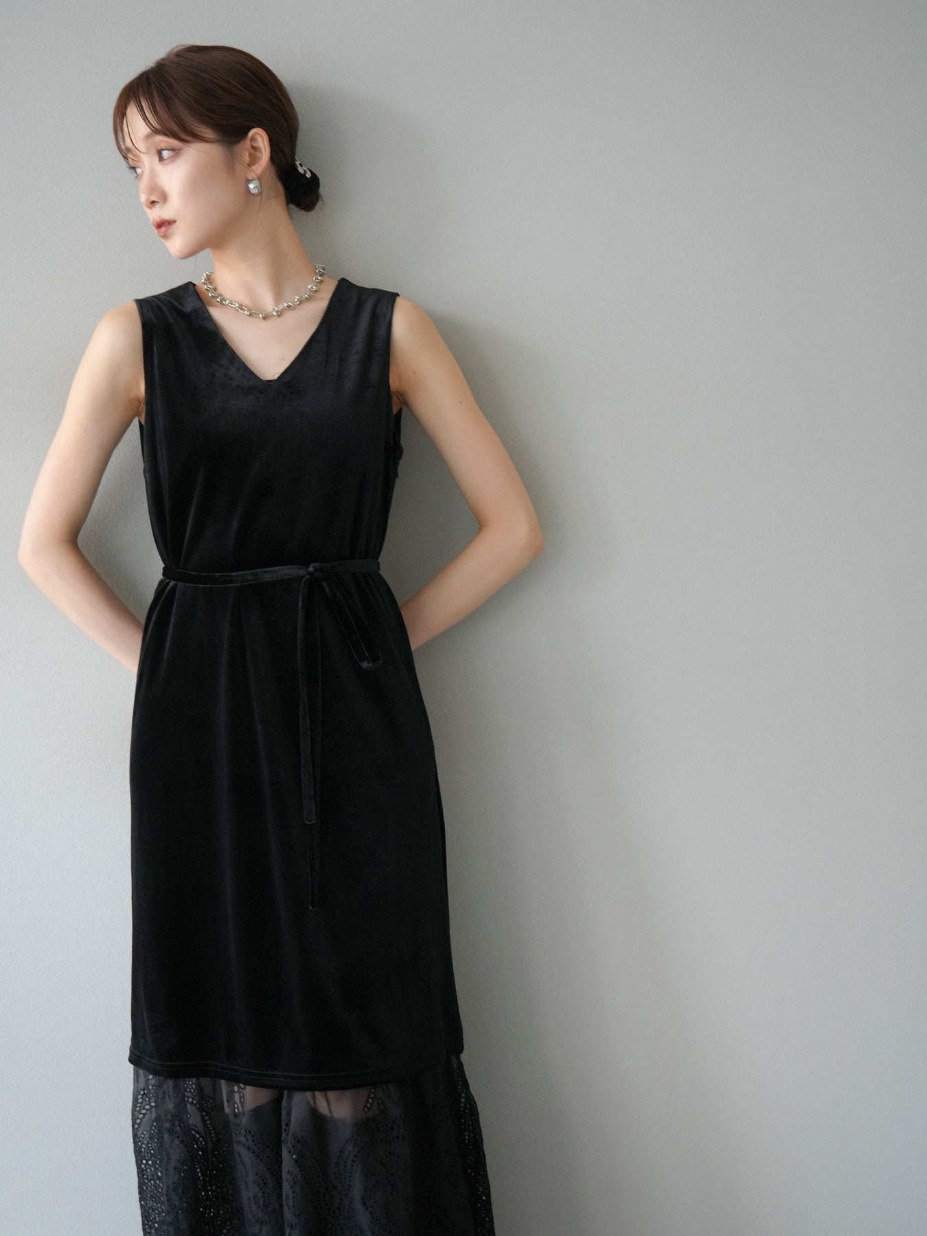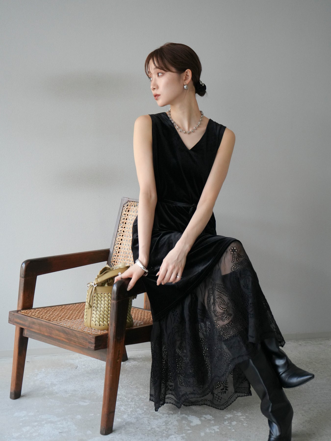 上品なベロア素材にコットンレースをドッキングしたワンピース。異素材の組み合わせがスタイリングに奥行きを与え、女性らしい華やかさを演出します。Vネックデザインとウエストリボンがシルエットを美しく引き立て、1枚で存在感のある着こなしが完成。特別なシーンからデイリーのおしゃれまで幅広く活躍する、大人のためのアイテムです。 ※ボトムス、キャミソール(インナー)以外の商品は一律でインナーは付属していません。
