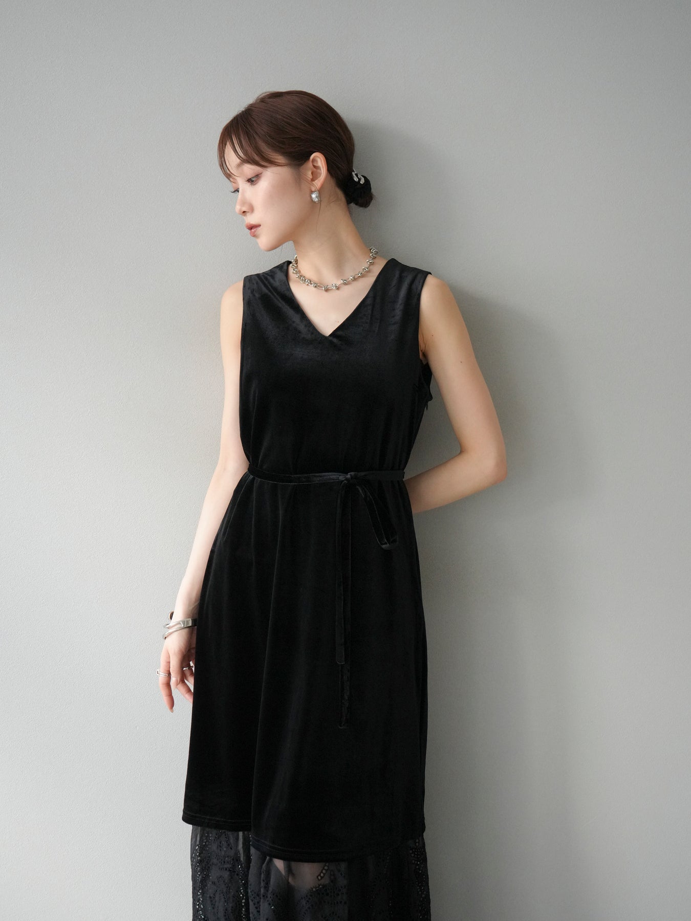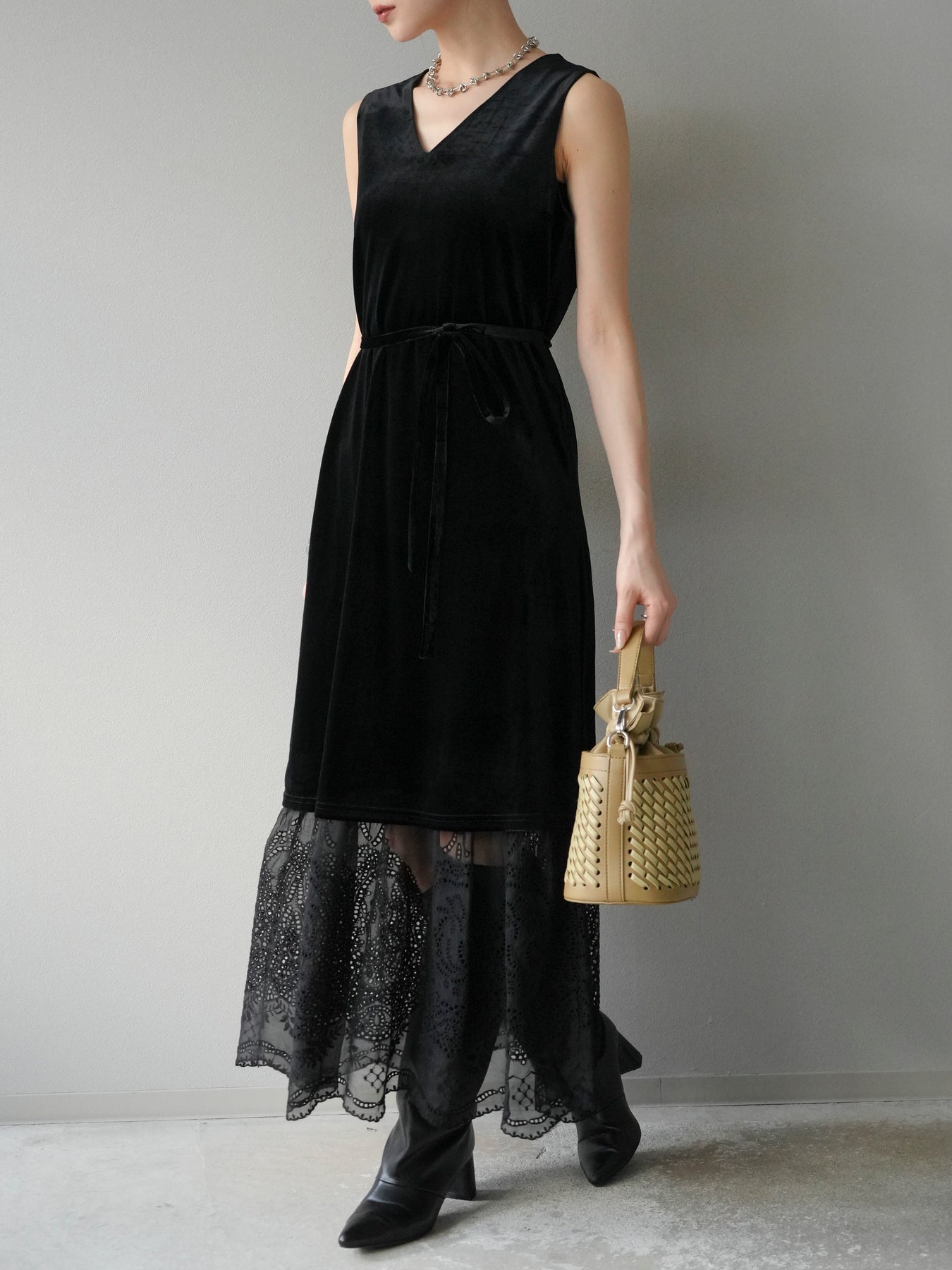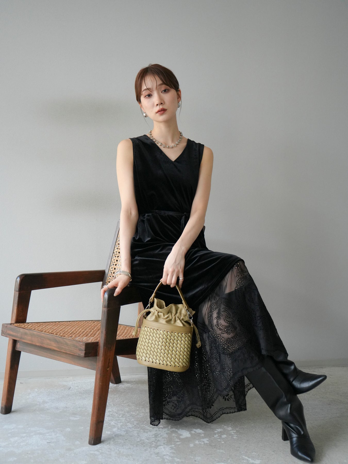 上品なベロア素材にコットンレースをドッキングしたワンピース。異素材の組み合わせがスタイリングに奥行きを与え、女性らしい華やかさを演出します。Vネックデザインとウエストリボンがシルエットを美しく引き立て、1枚で存在感のある着こなしが完成。特別なシーンからデイリーのおしゃれまで幅広く活躍する、大人のためのアイテムです。 ※ボトムス、キャミソール(インナー)以外の商品は一律でインナーは付属していません。