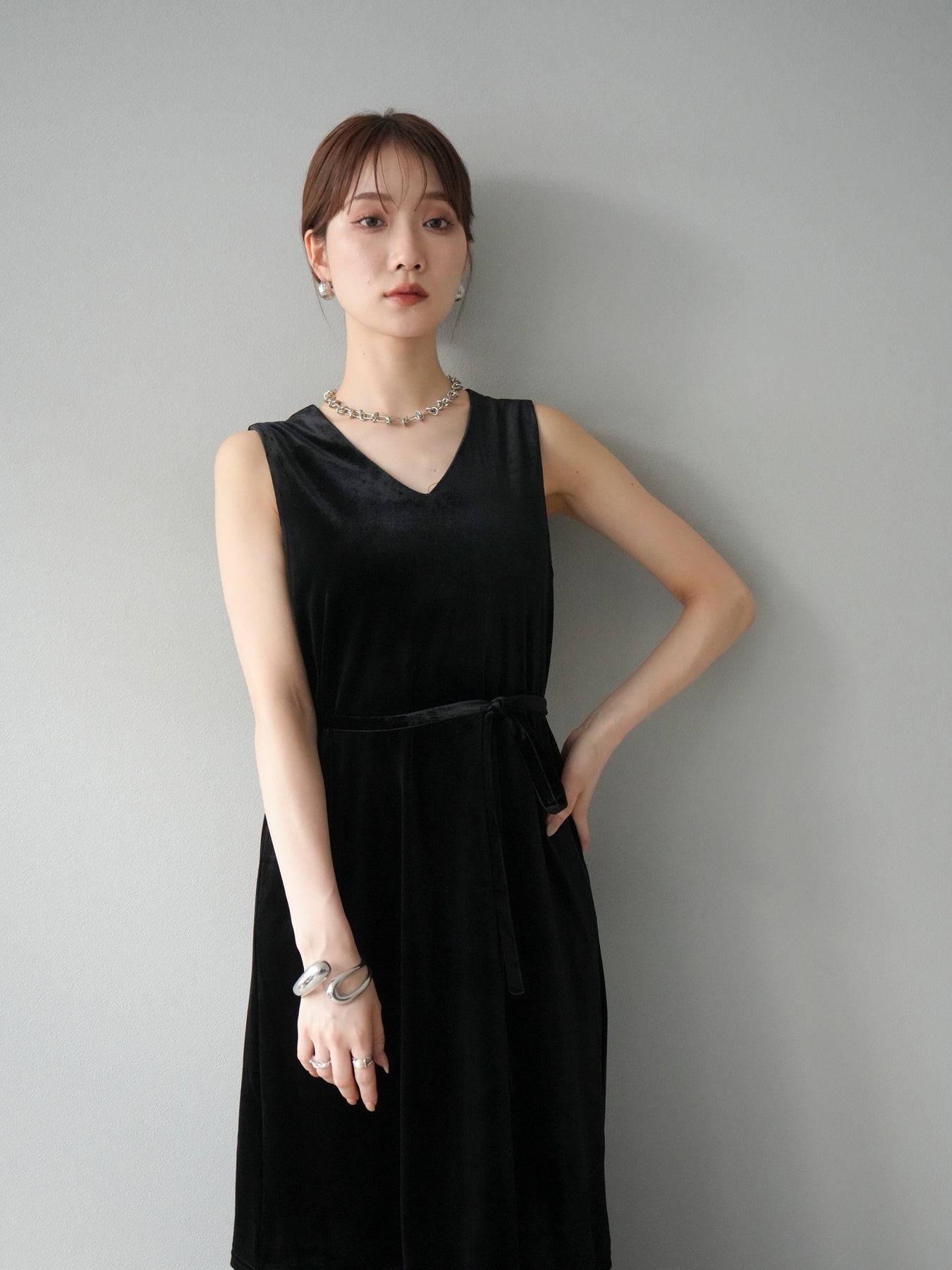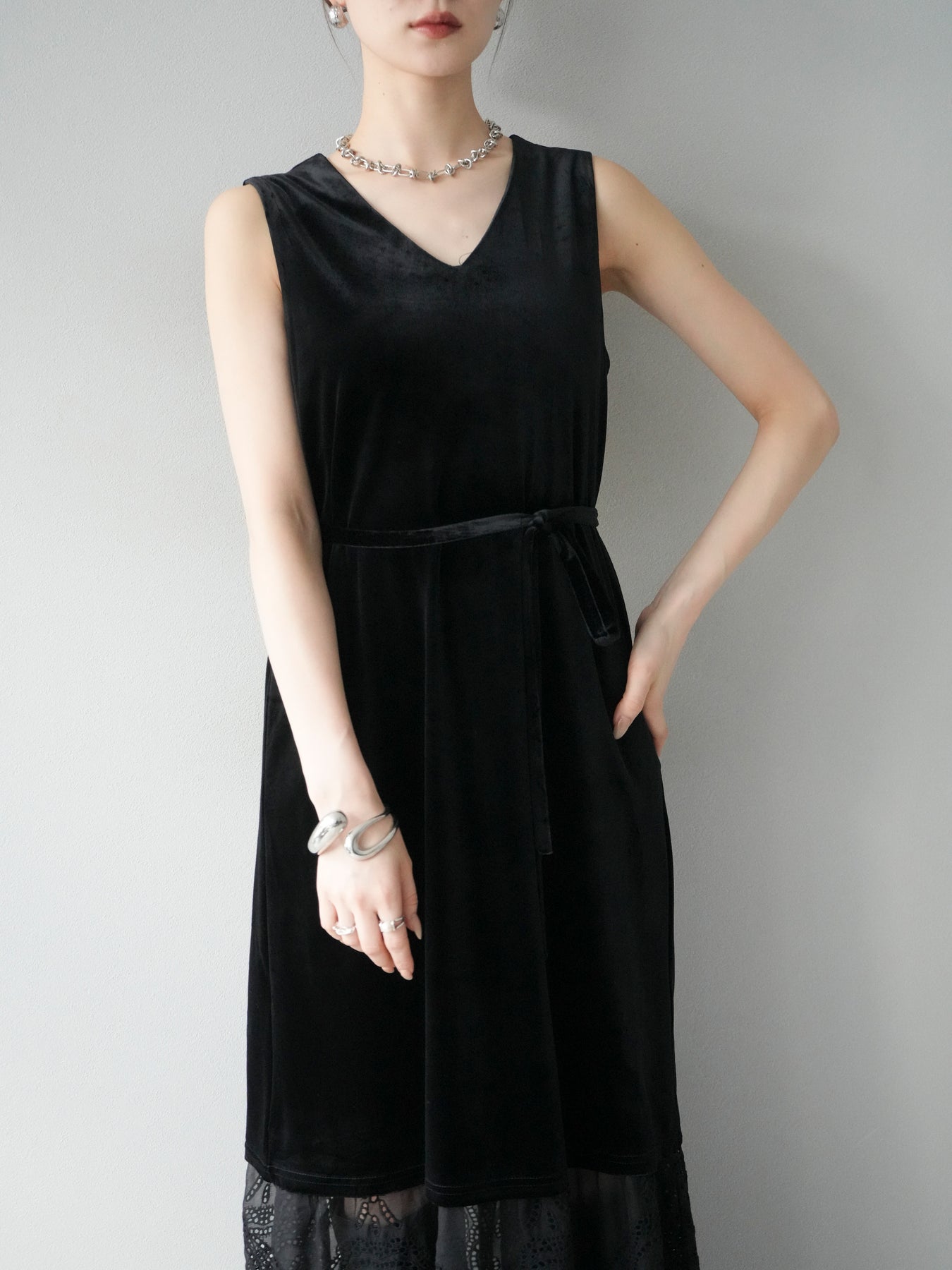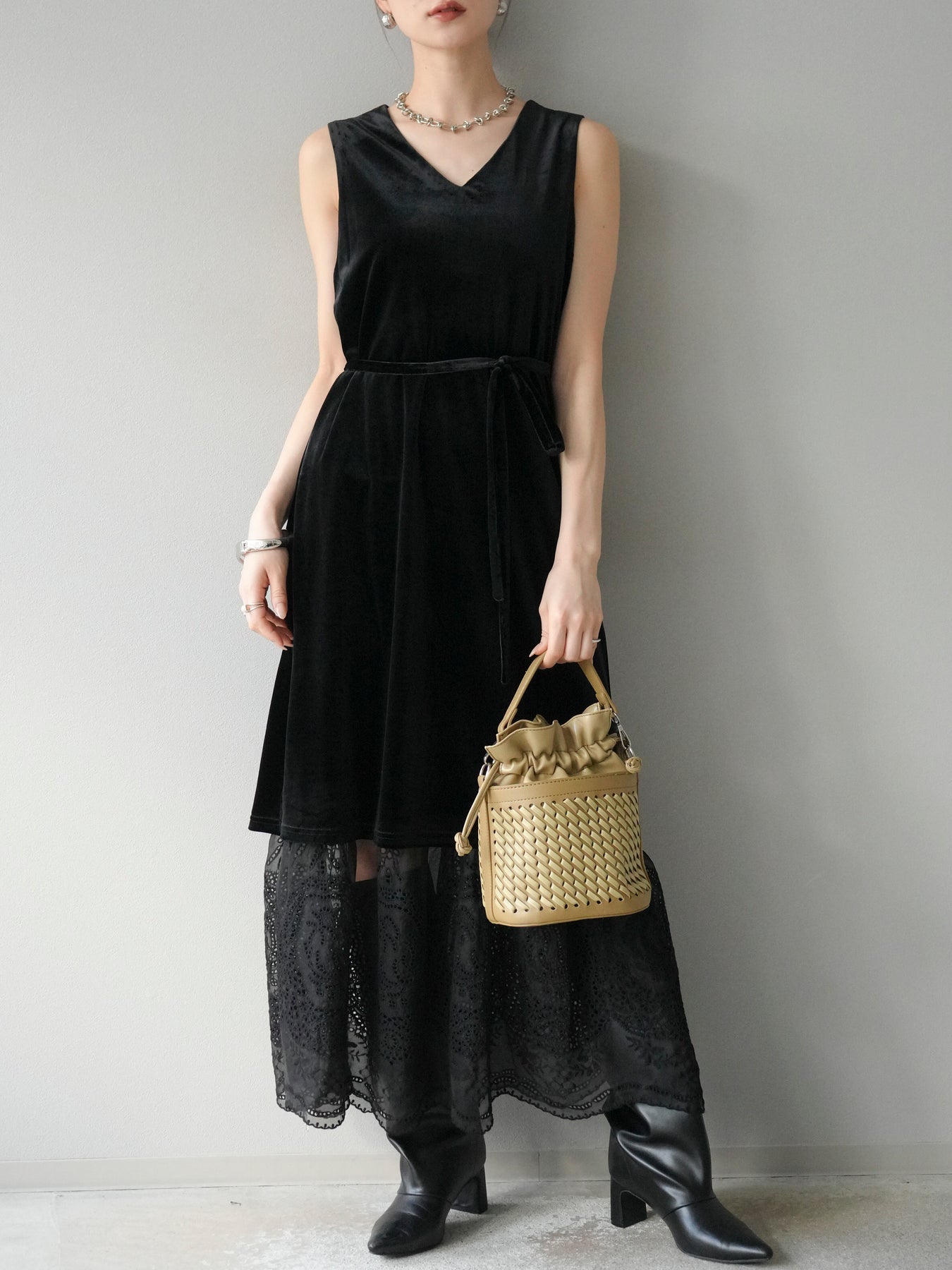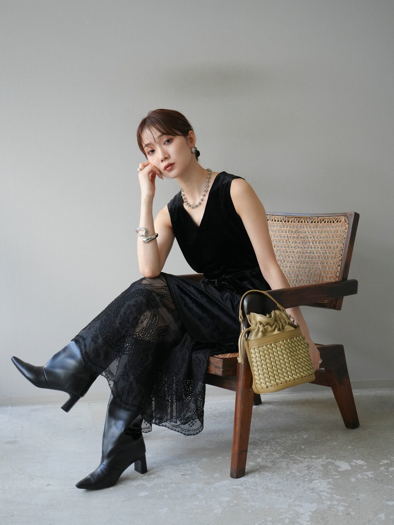上品なベロア素材にコットンレースをドッキングしたワンピース。異素材の組み合わせがスタイリングに奥行きを与え、女性らしい華やかさを演出します。Vネックデザインとウエストリボンがシルエットを美しく引き立て、1枚で存在感のある着こなしが完成。特別なシーンからデイリーのおしゃれまで幅広く活躍する、大人のためのアイテムです。 ※ボトムス、キャミソール(インナー)以外の商品は一律でインナーは付属していません。