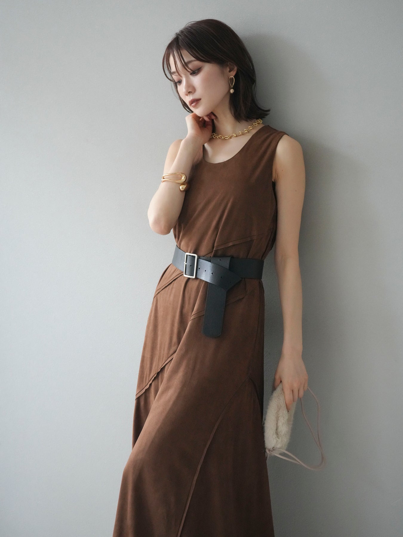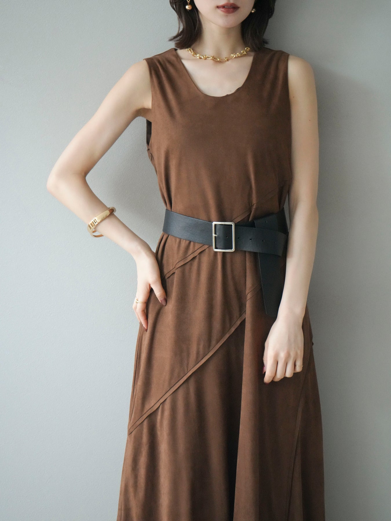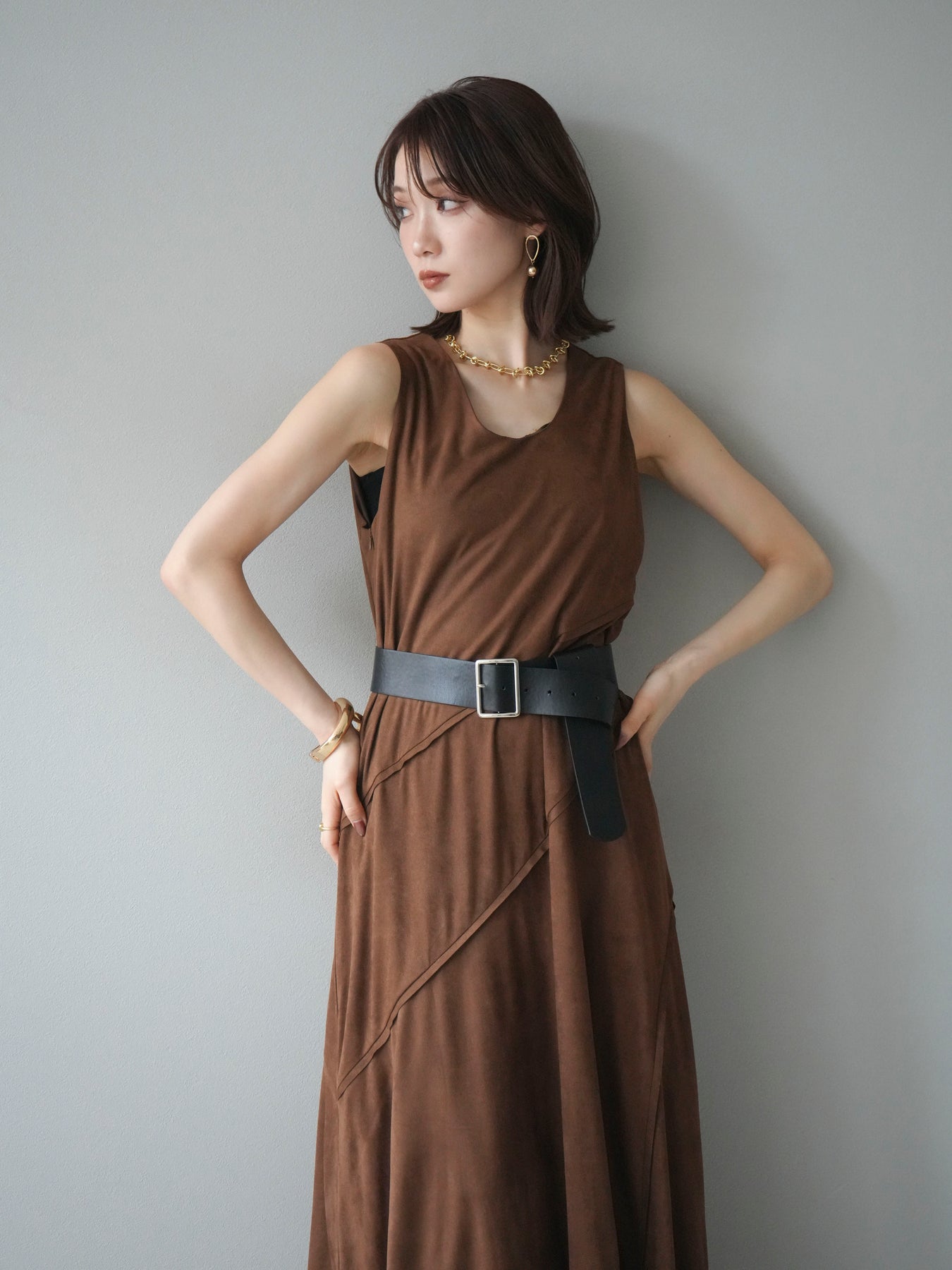 [予約]スエードアウトシームデザインベルト付ワンピース/camel