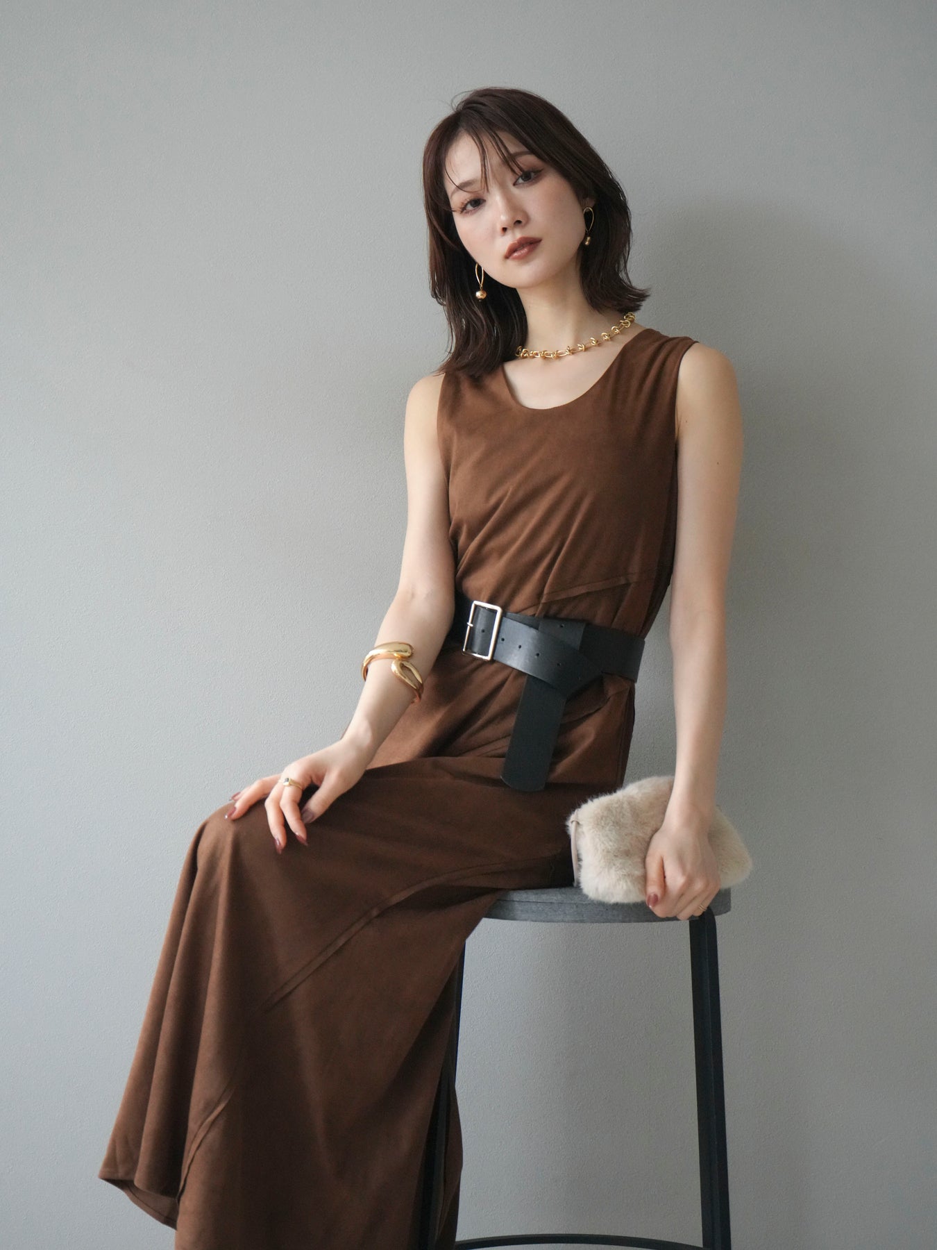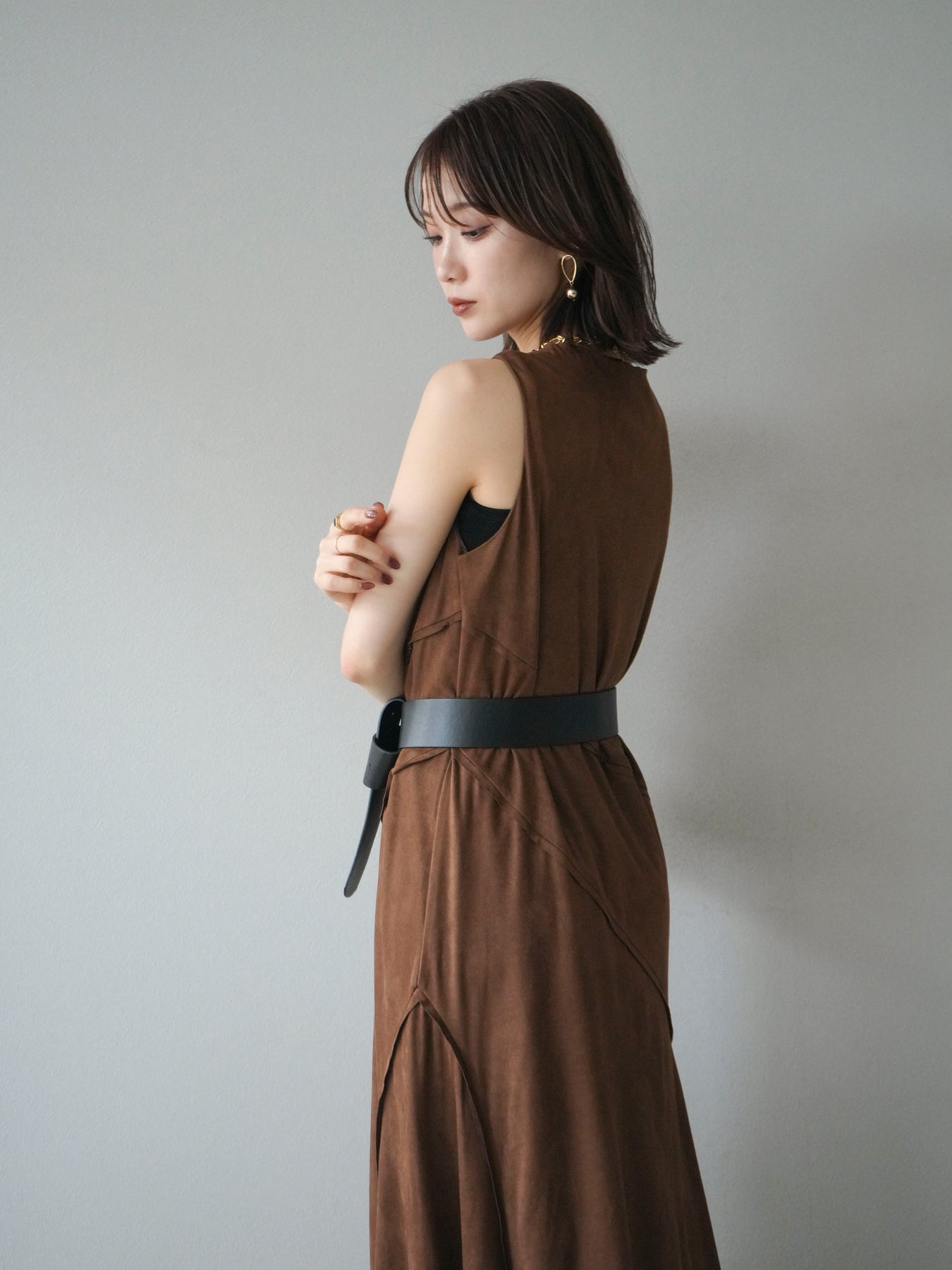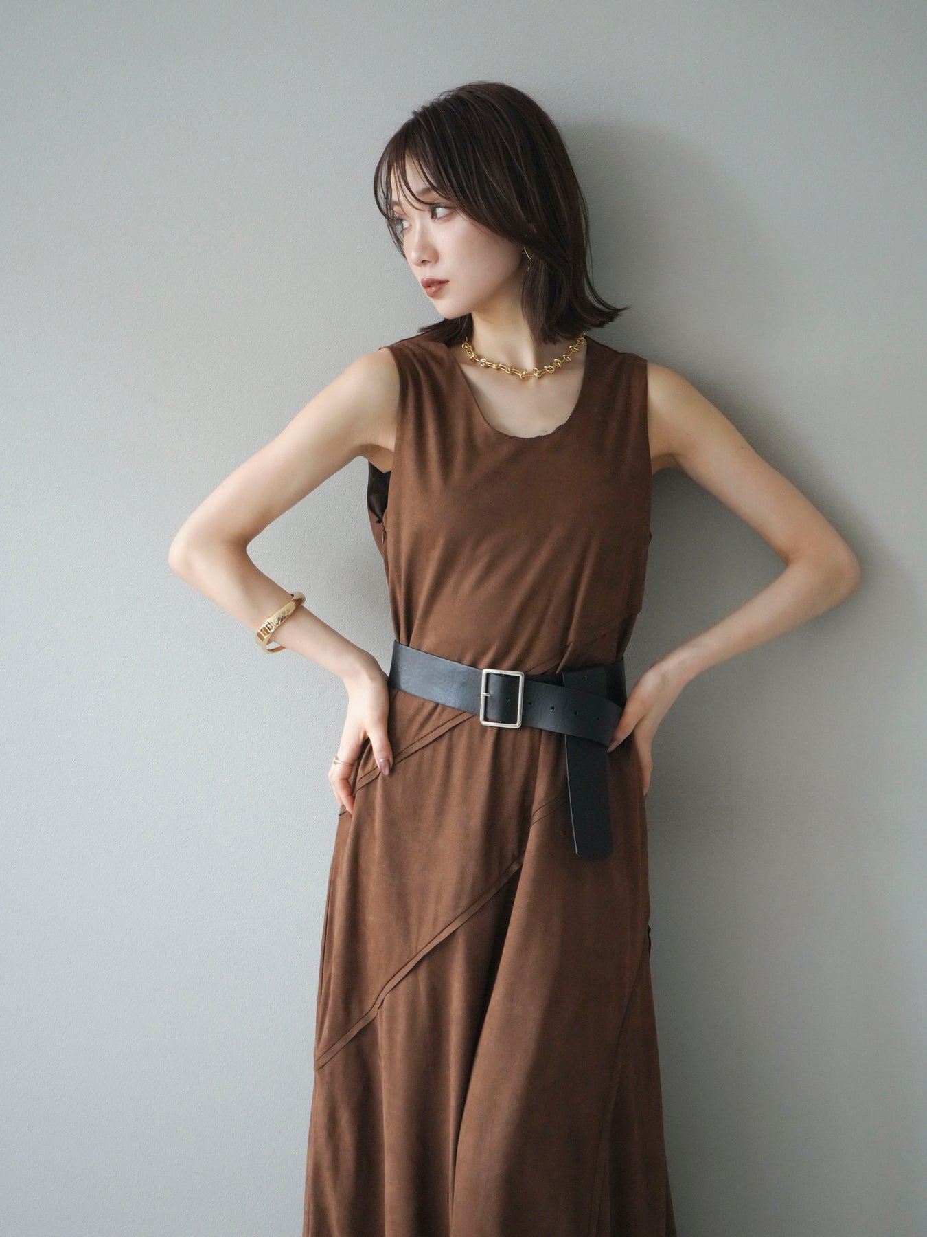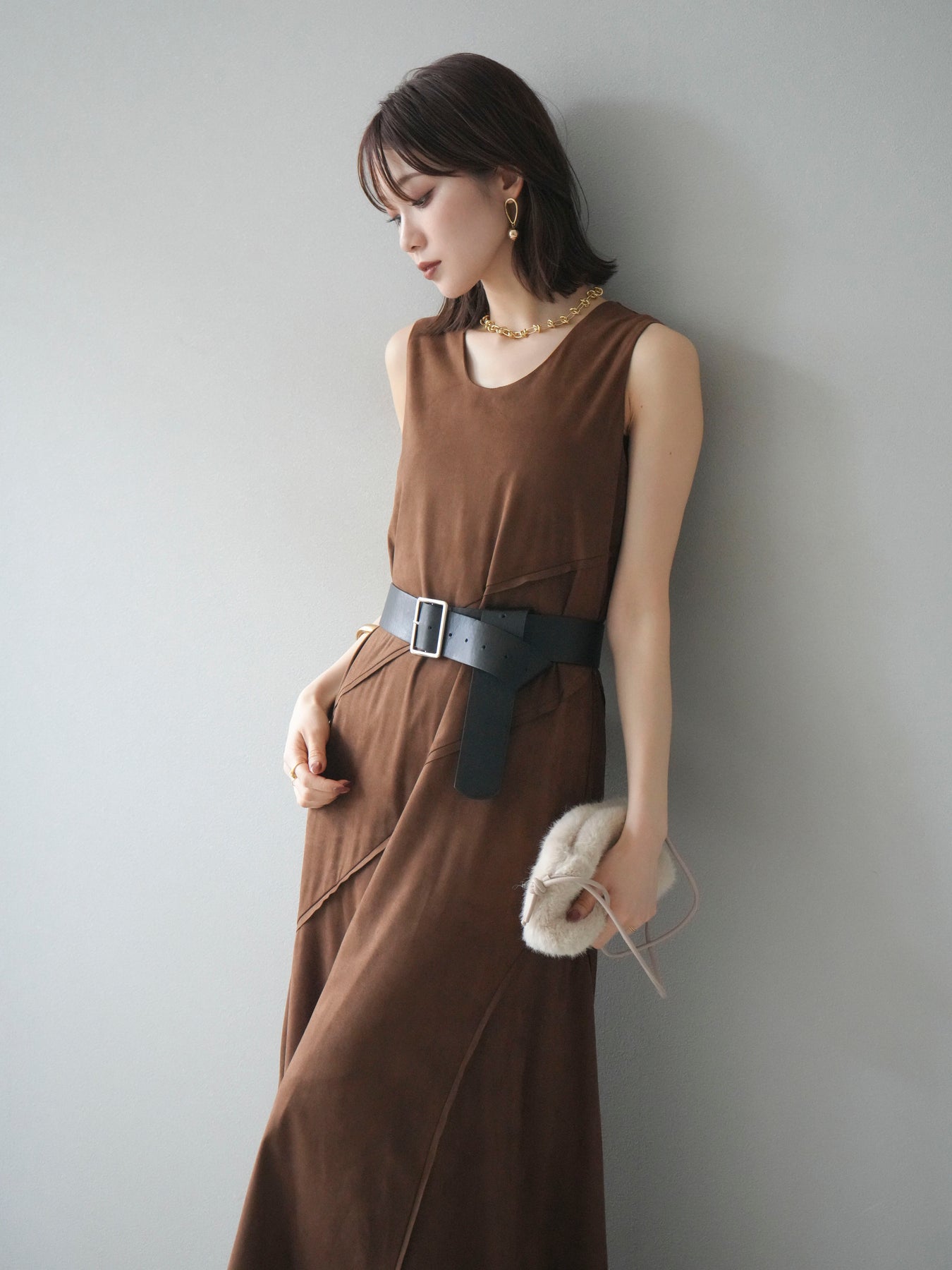 [予約]スエードアウトシームデザインベルト付ワンピース/camel