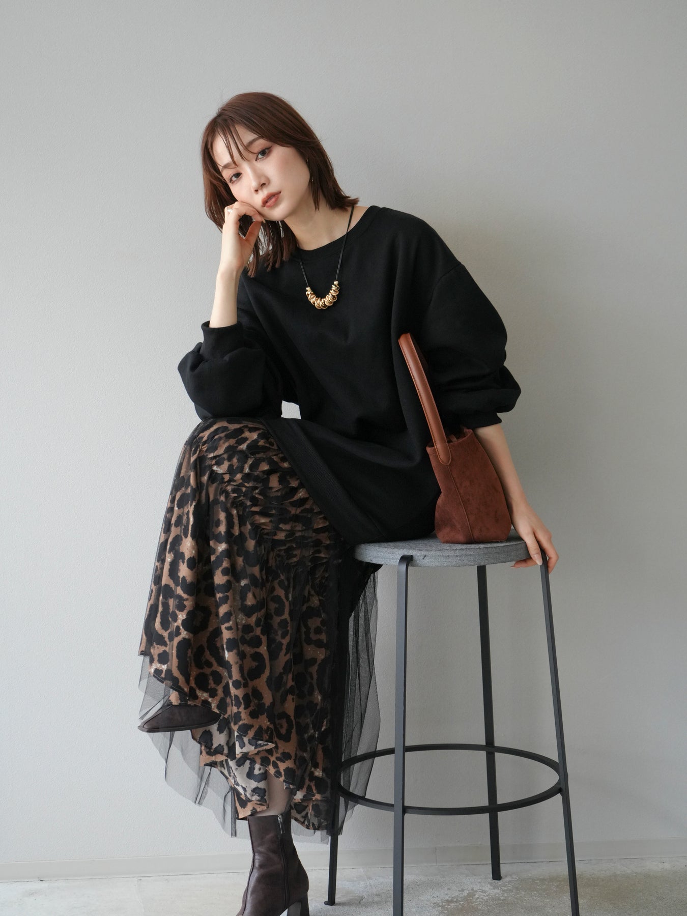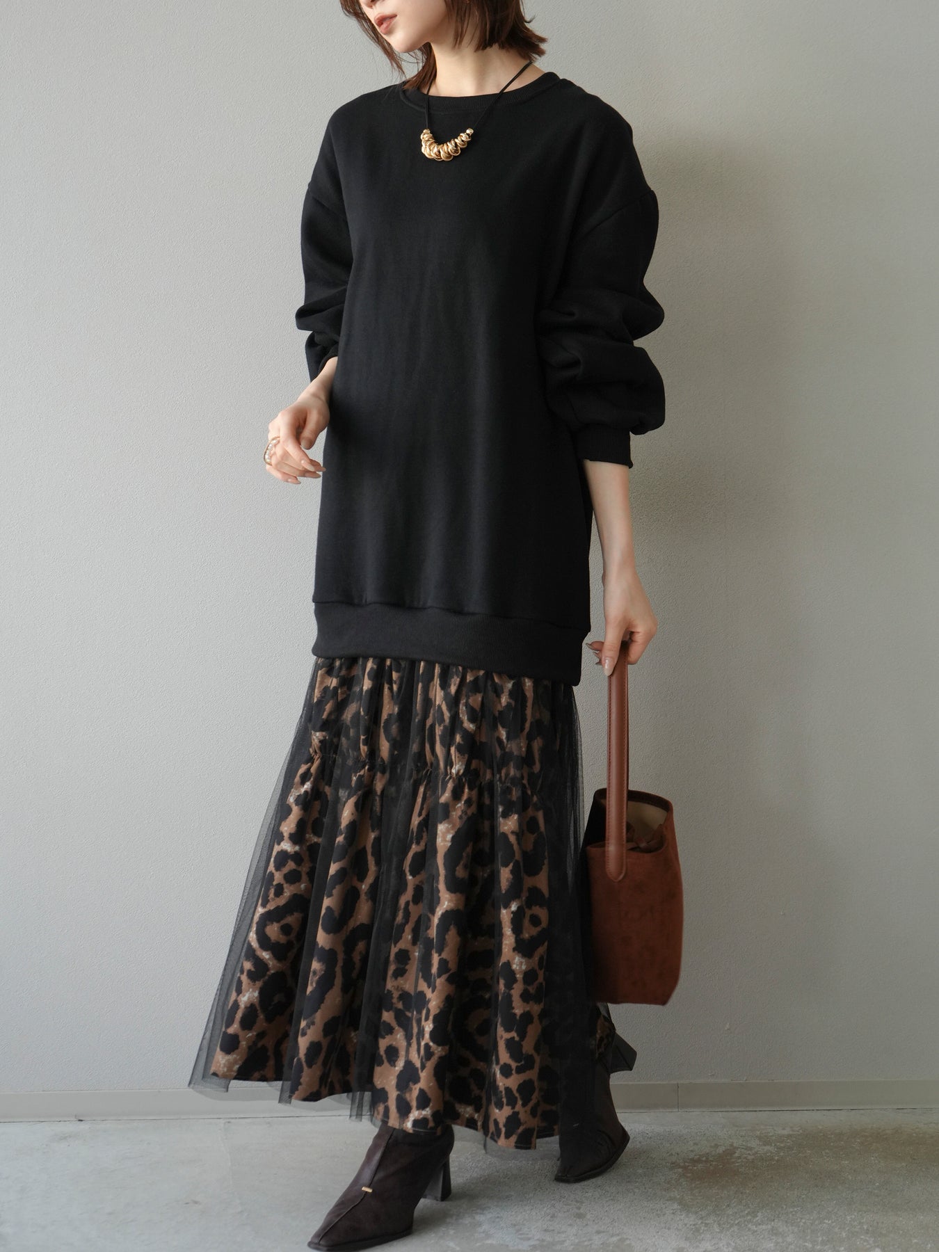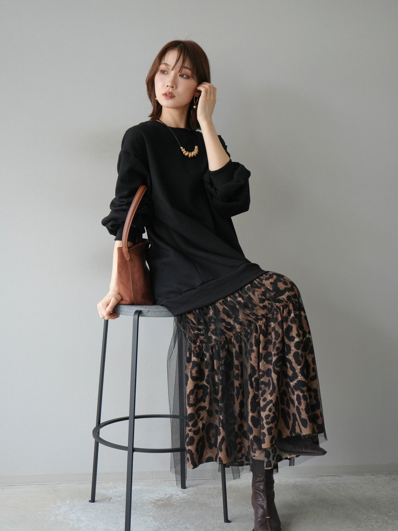 カジュアルなスウェットと華やかなアニマル柄スカートを組み合わせた、ドッキングデザインのレイヤードワンピース。一枚でコーディネートが完成する存在感のあるアイテムです。トップ部分はリラックス感のあるスウェット素材で着心地も抜群、スカート部分は軽やかに広がるチュールと柄生地を重ね、動くたびに表情を変える華やかさをプラス。デイリー使いからお出かけシーンまで、幅広く活躍できる一着です。 ※ボトムス、キャミソール(インナー)以外の商品は一律でインナーは付属していません。