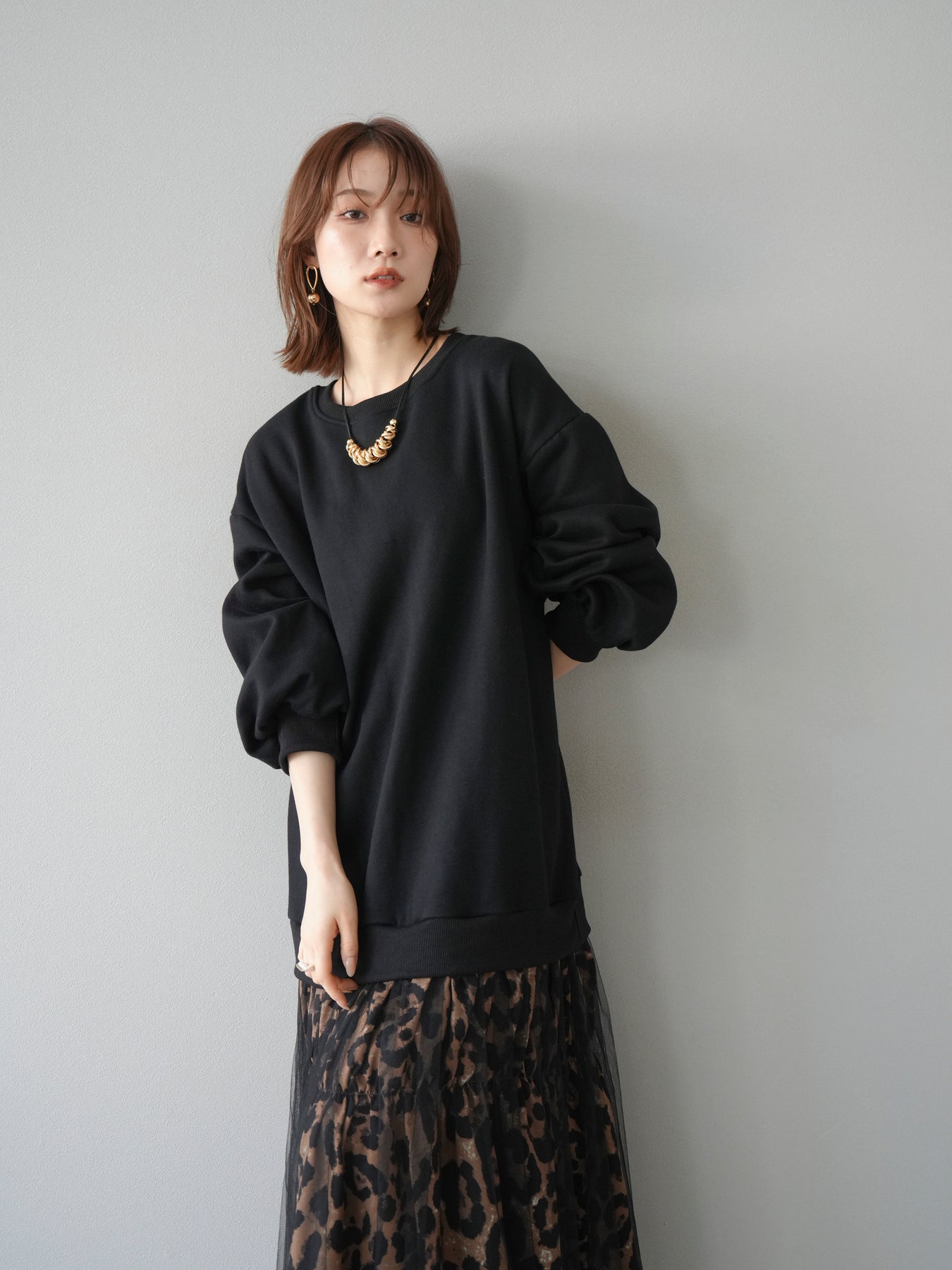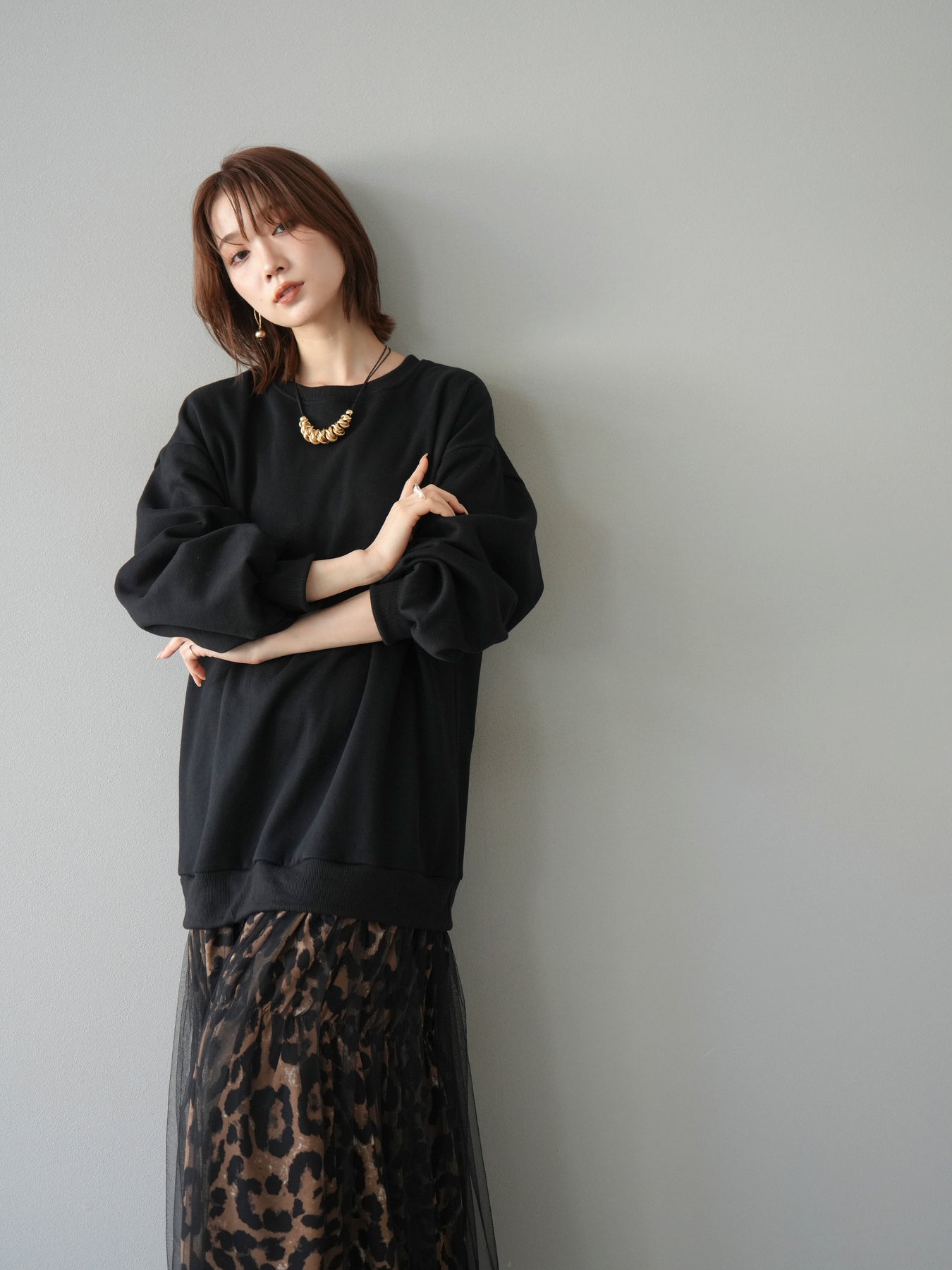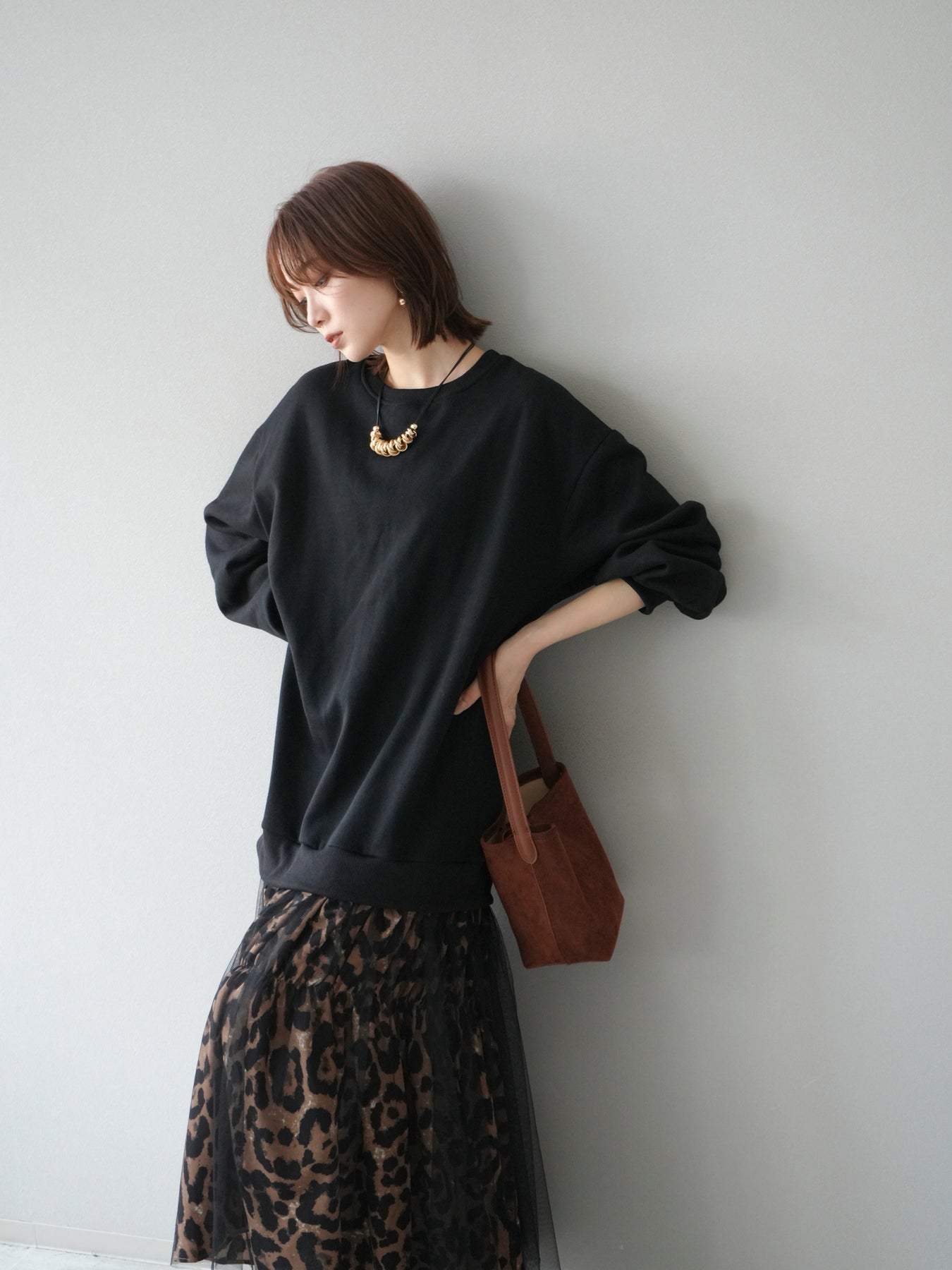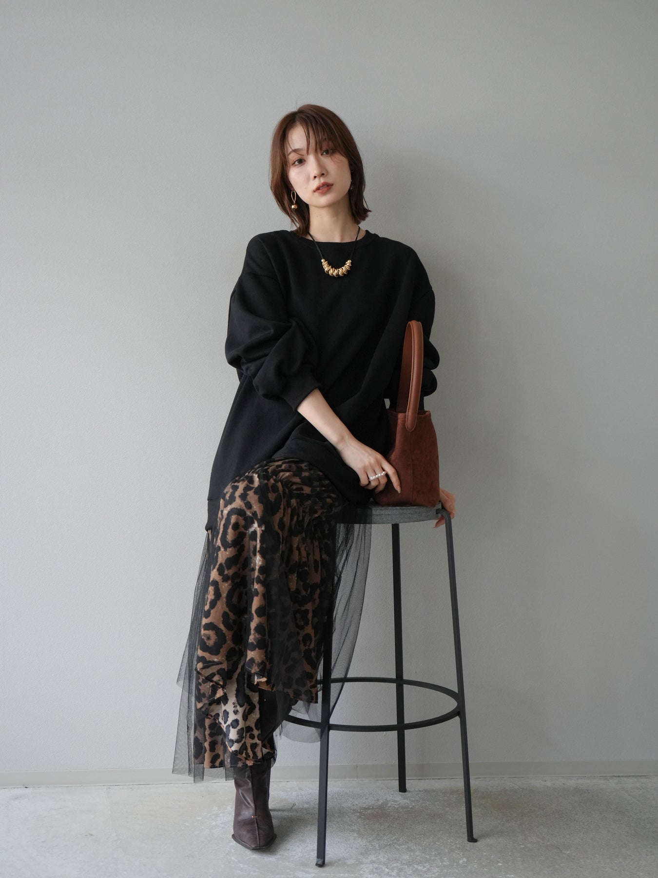カジュアルなスウェットと華やかなアニマル柄スカートを組み合わせた、ドッキングデザインのレイヤードワンピース。一枚でコーディネートが完成する存在感のあるアイテムです。トップ部分はリラックス感のあるスウェット素材で着心地も抜群、スカート部分は軽やかに広がるチュールと柄生地を重ね、動くたびに表情を変える華やかさをプラス。デイリー使いからお出かけシーンまで、幅広く活躍できる一着です。 ※ボトムス、キャミソール(インナー)以外の商品は一律でインナーは付属していません。