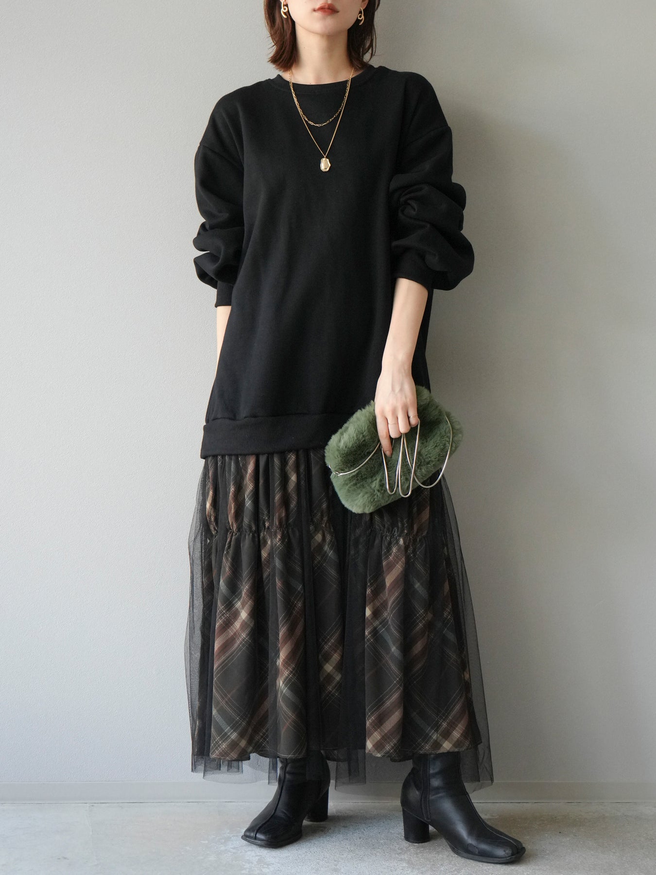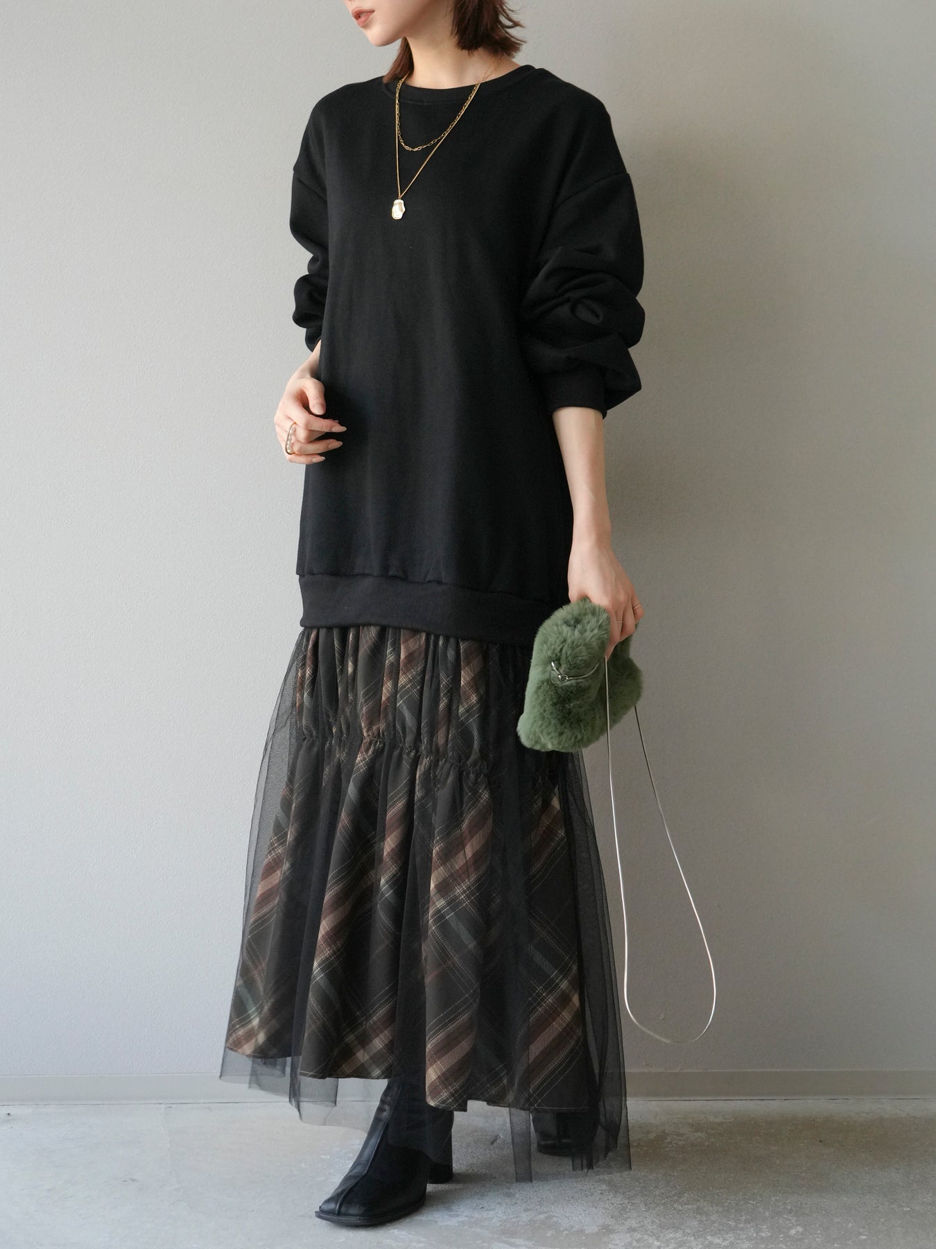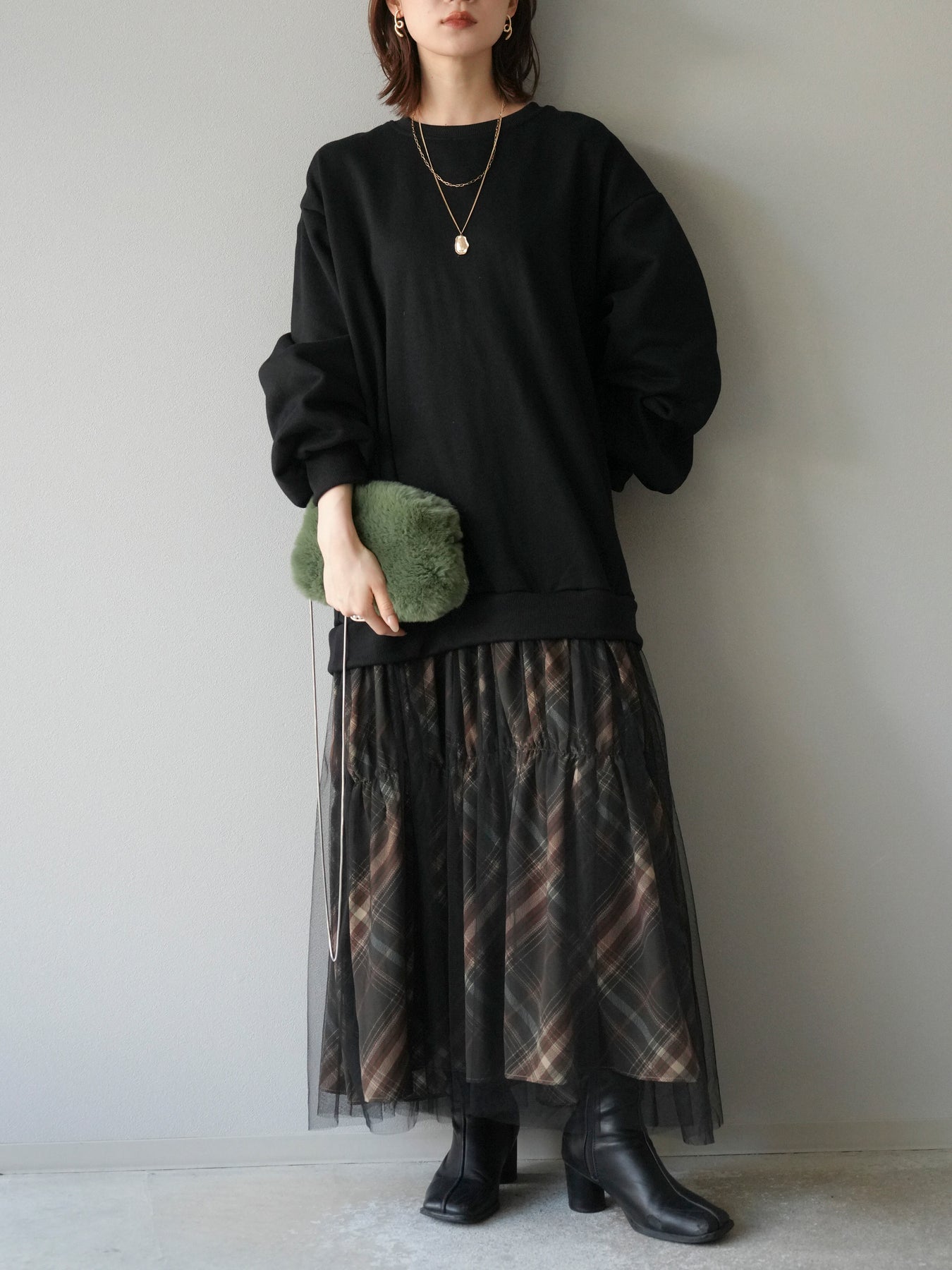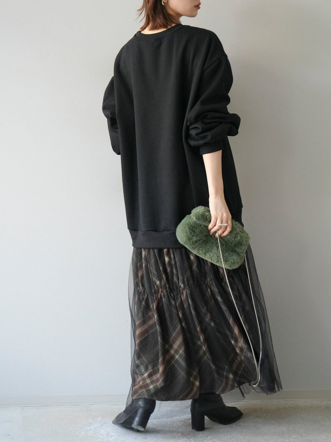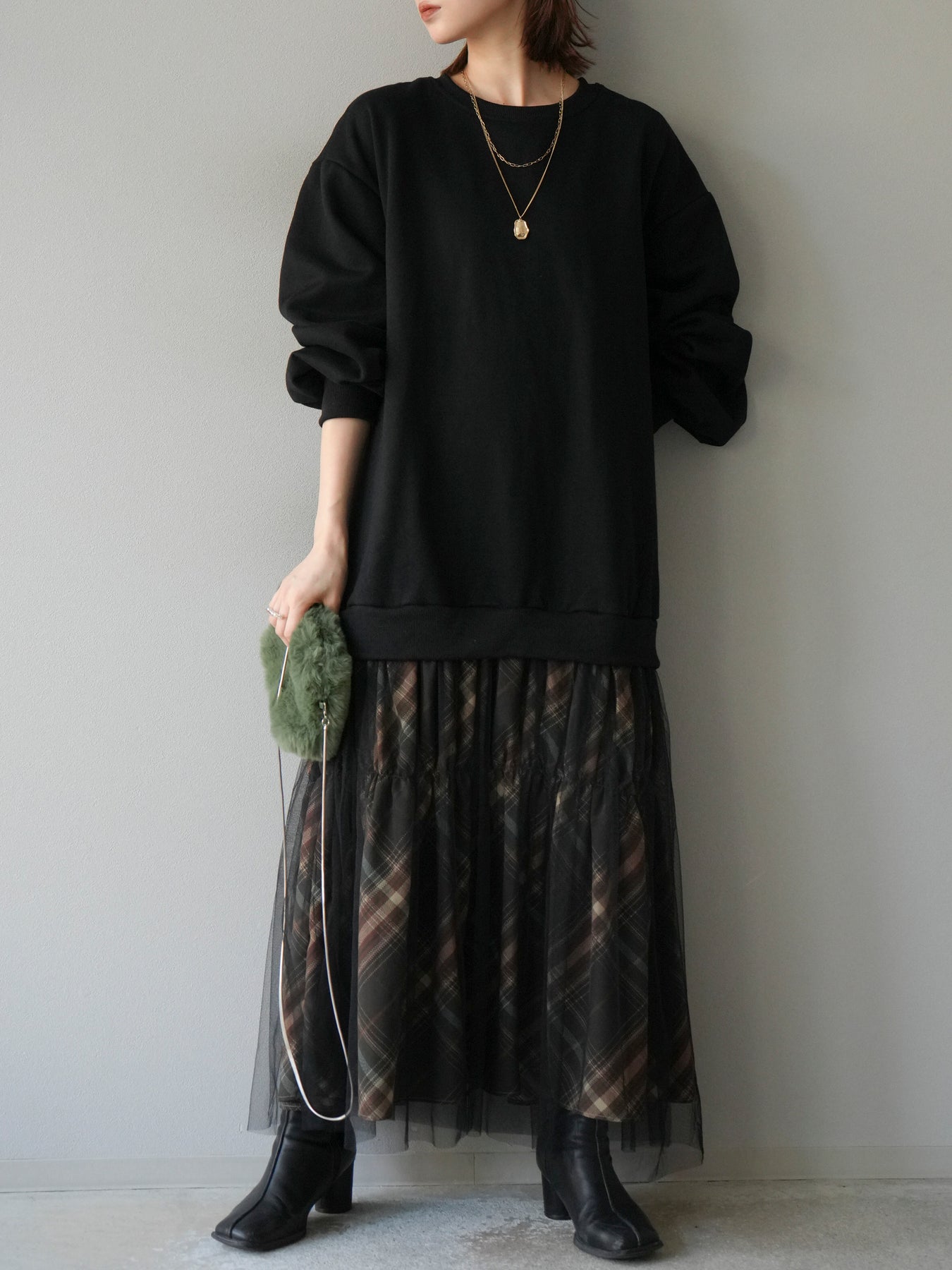 [予約]スウェットドッキングチェック柄レイヤードワンピース/ブラック