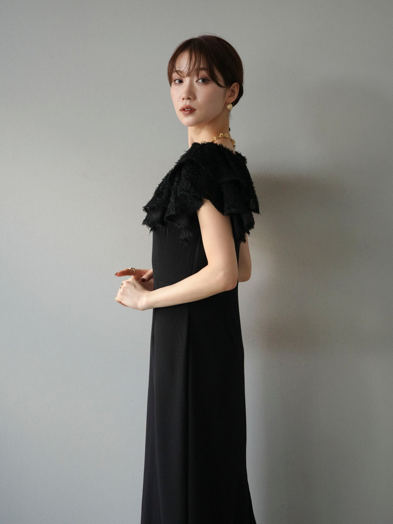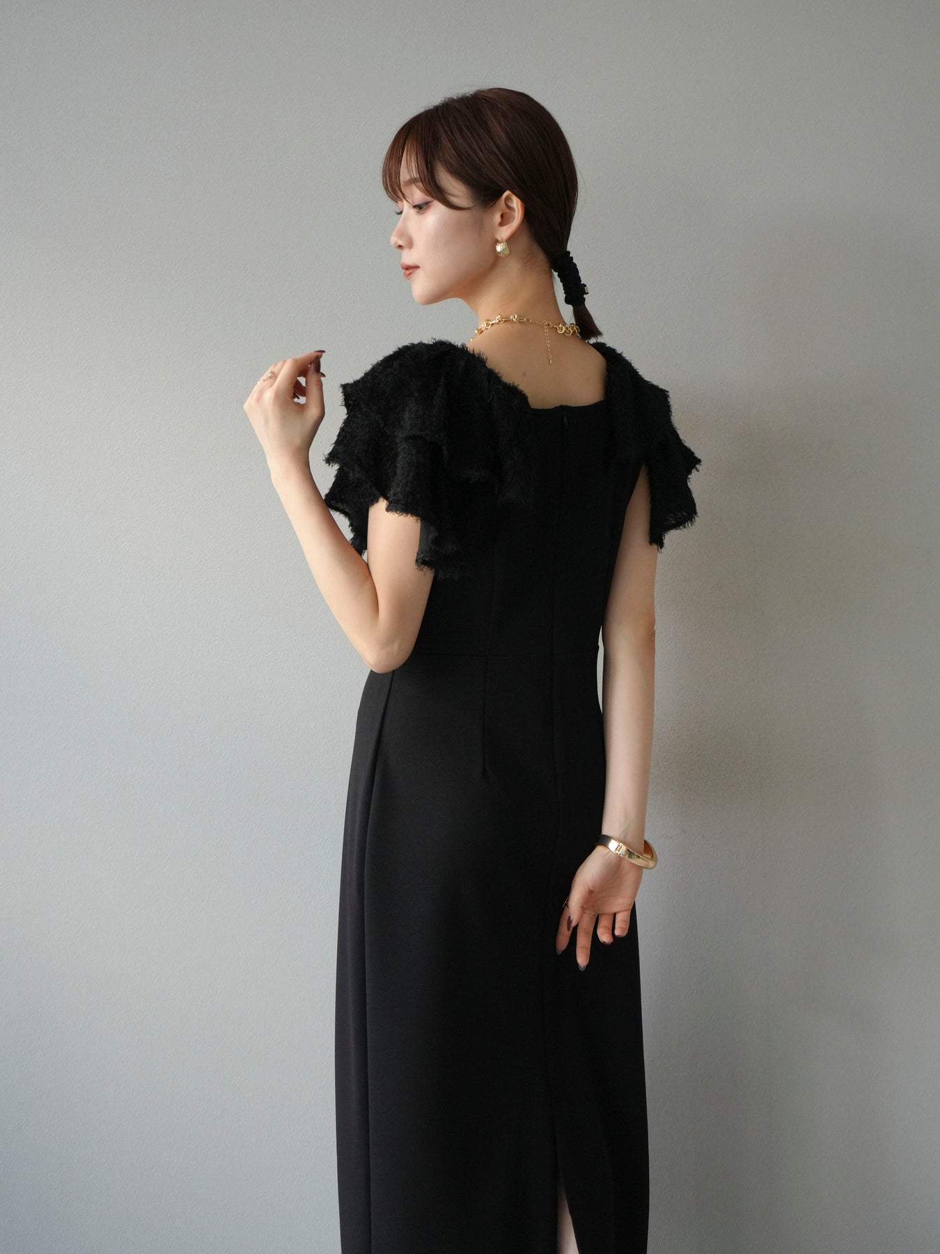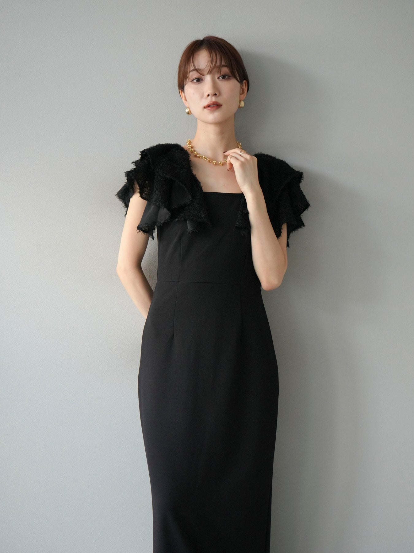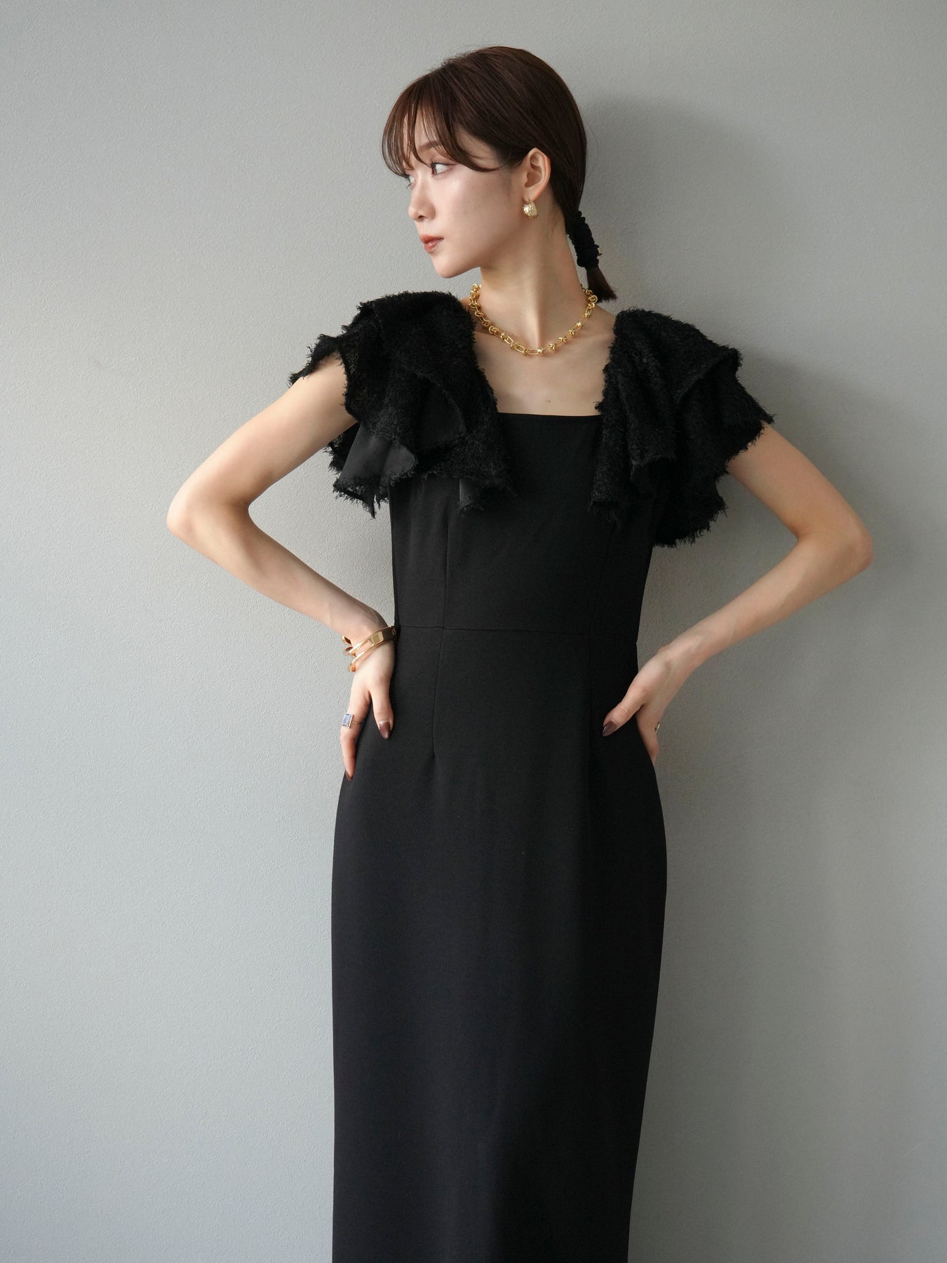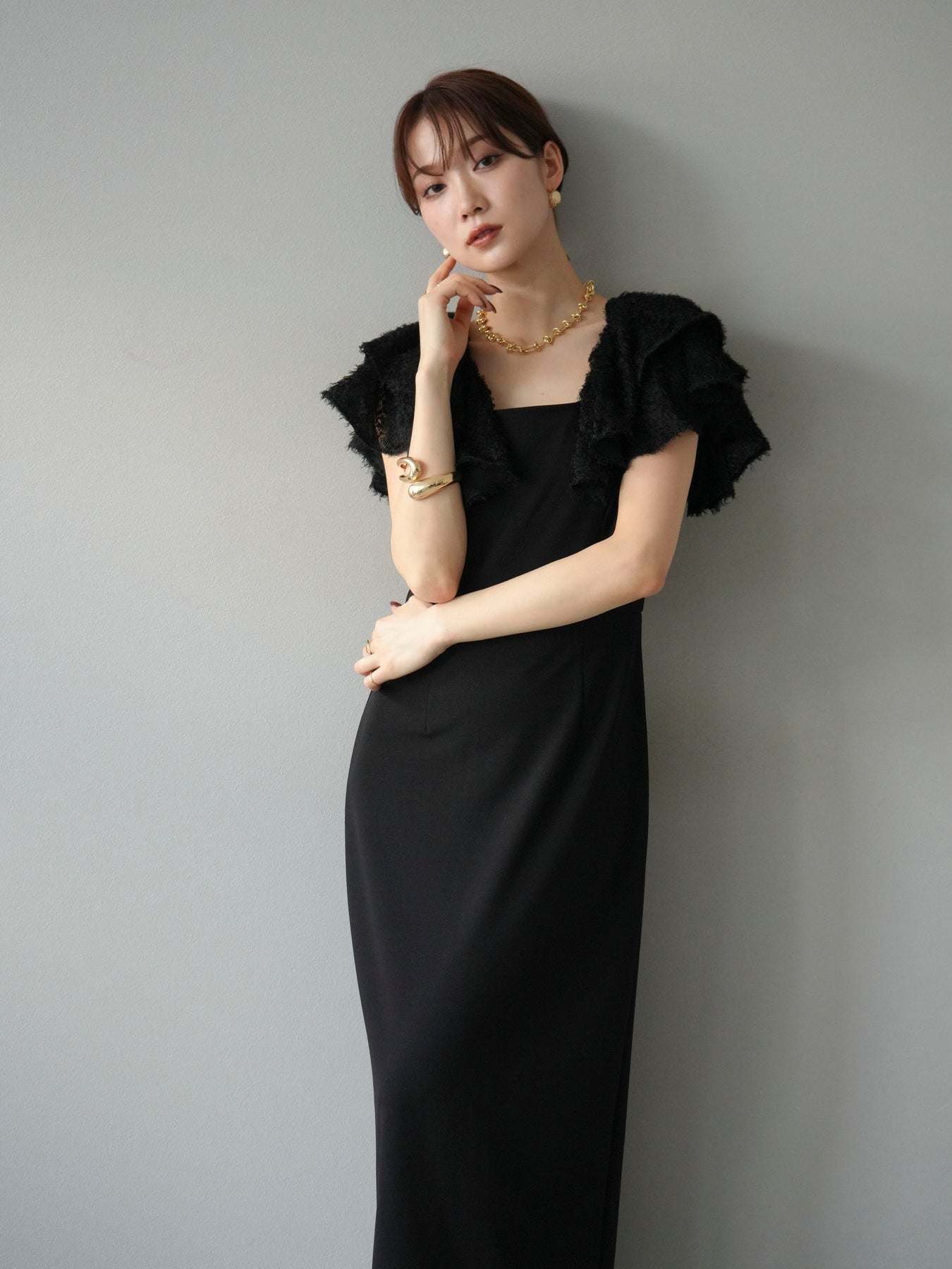 [予約]ジャガードフレアスリーブドレス/ブラック