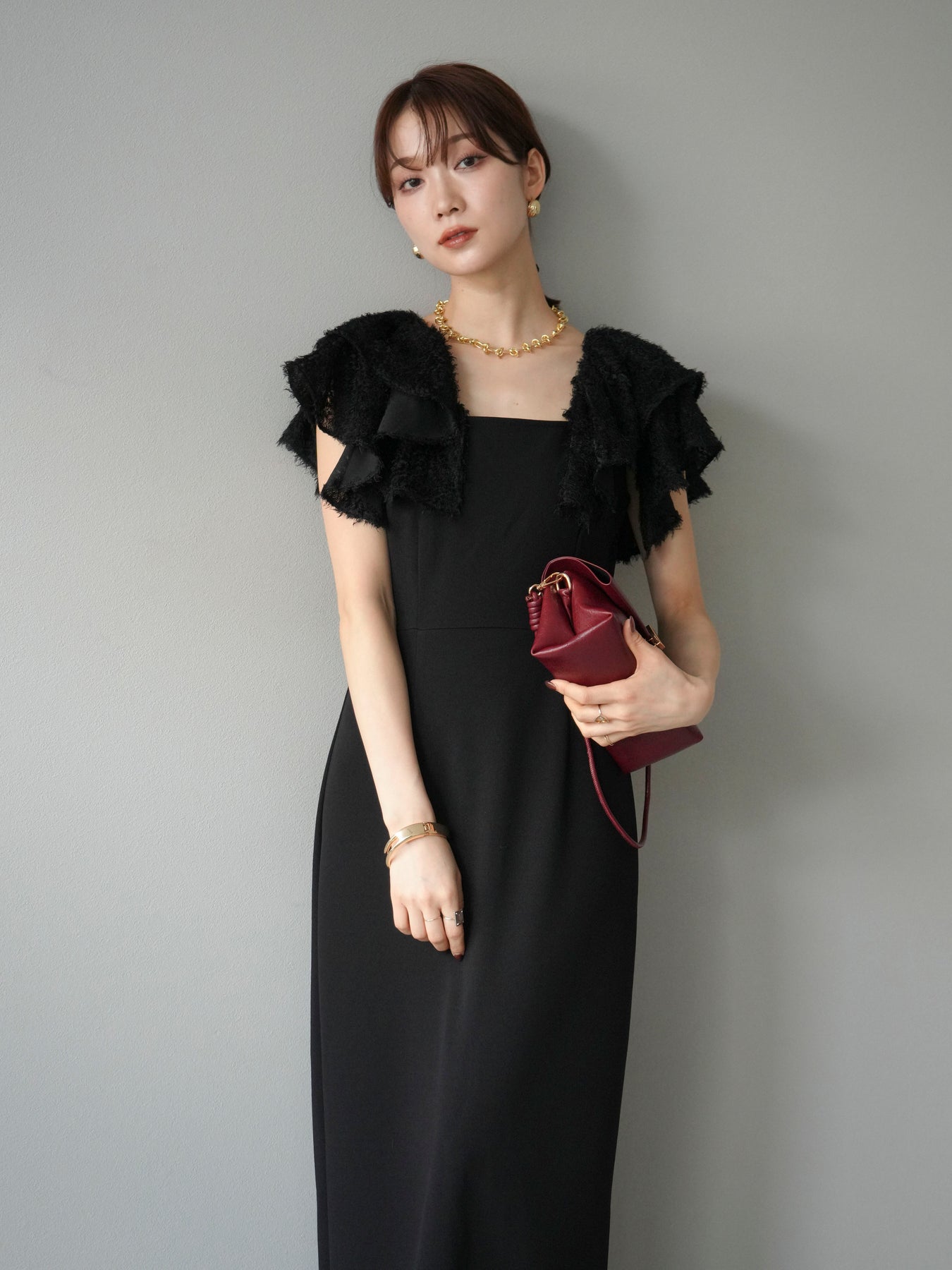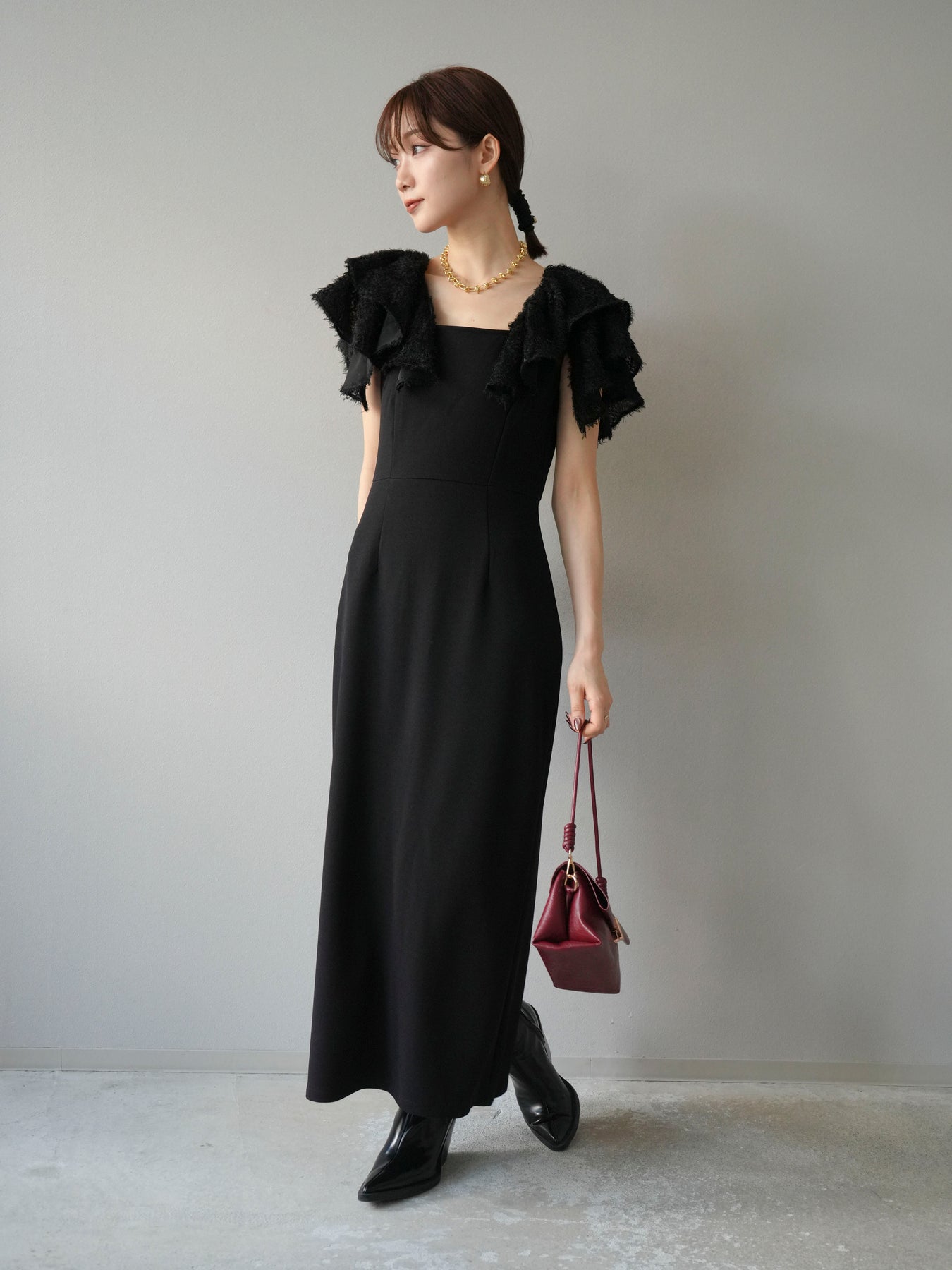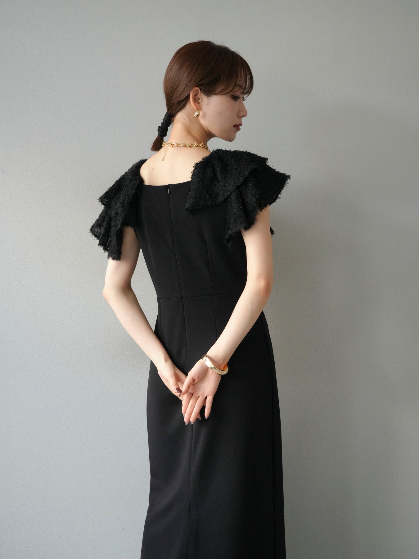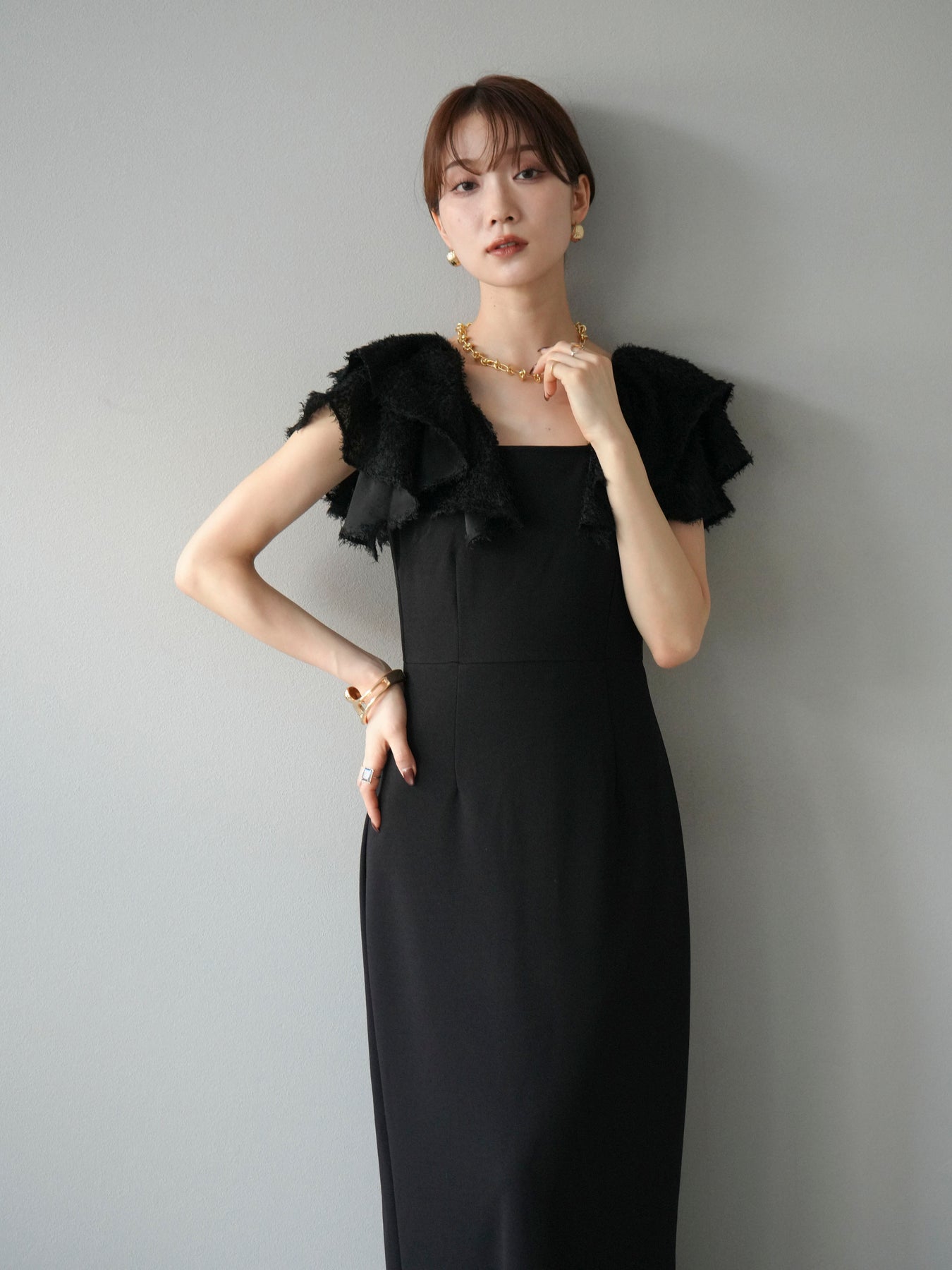 [予約]ジャガードフレアスリーブドレス/ブラック