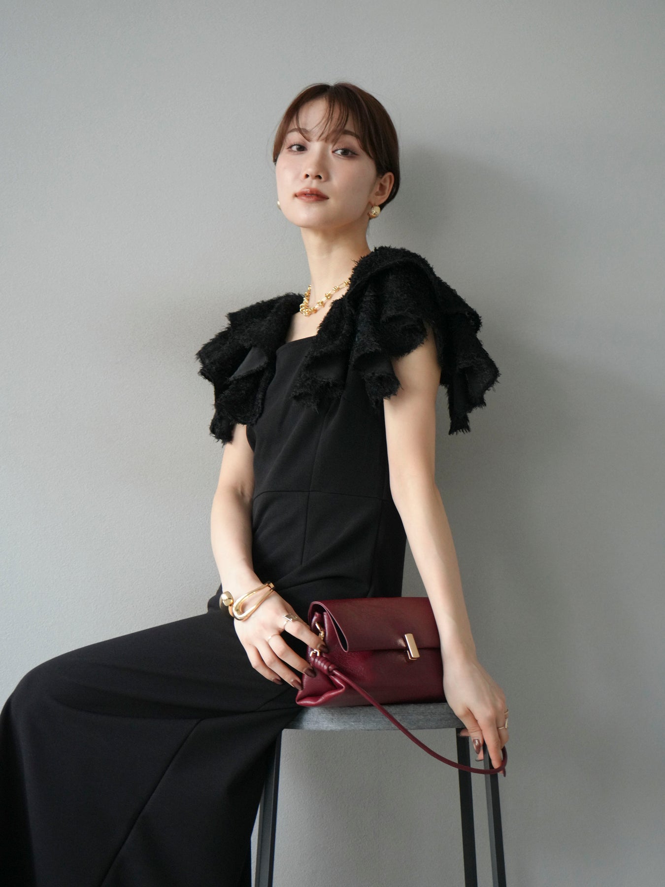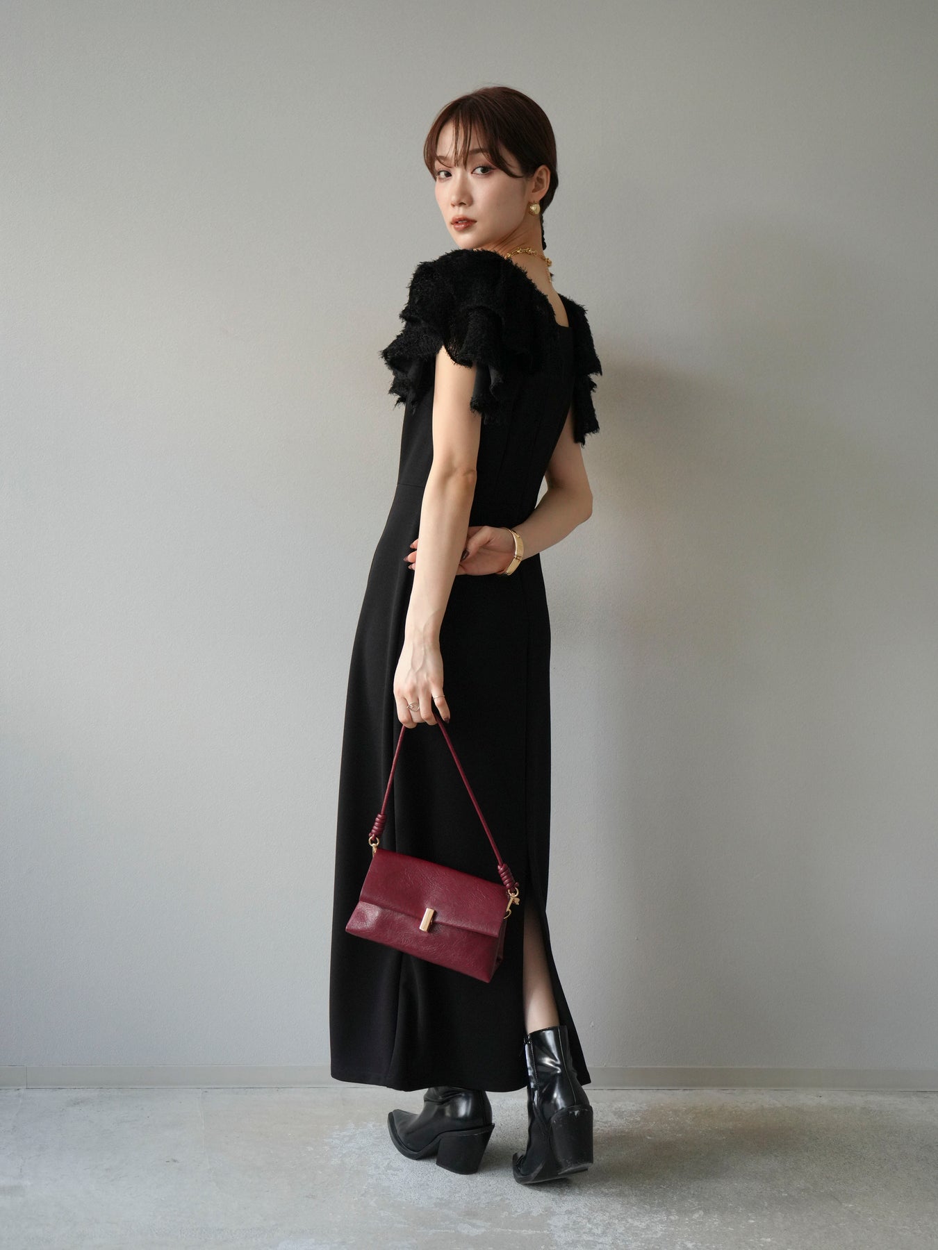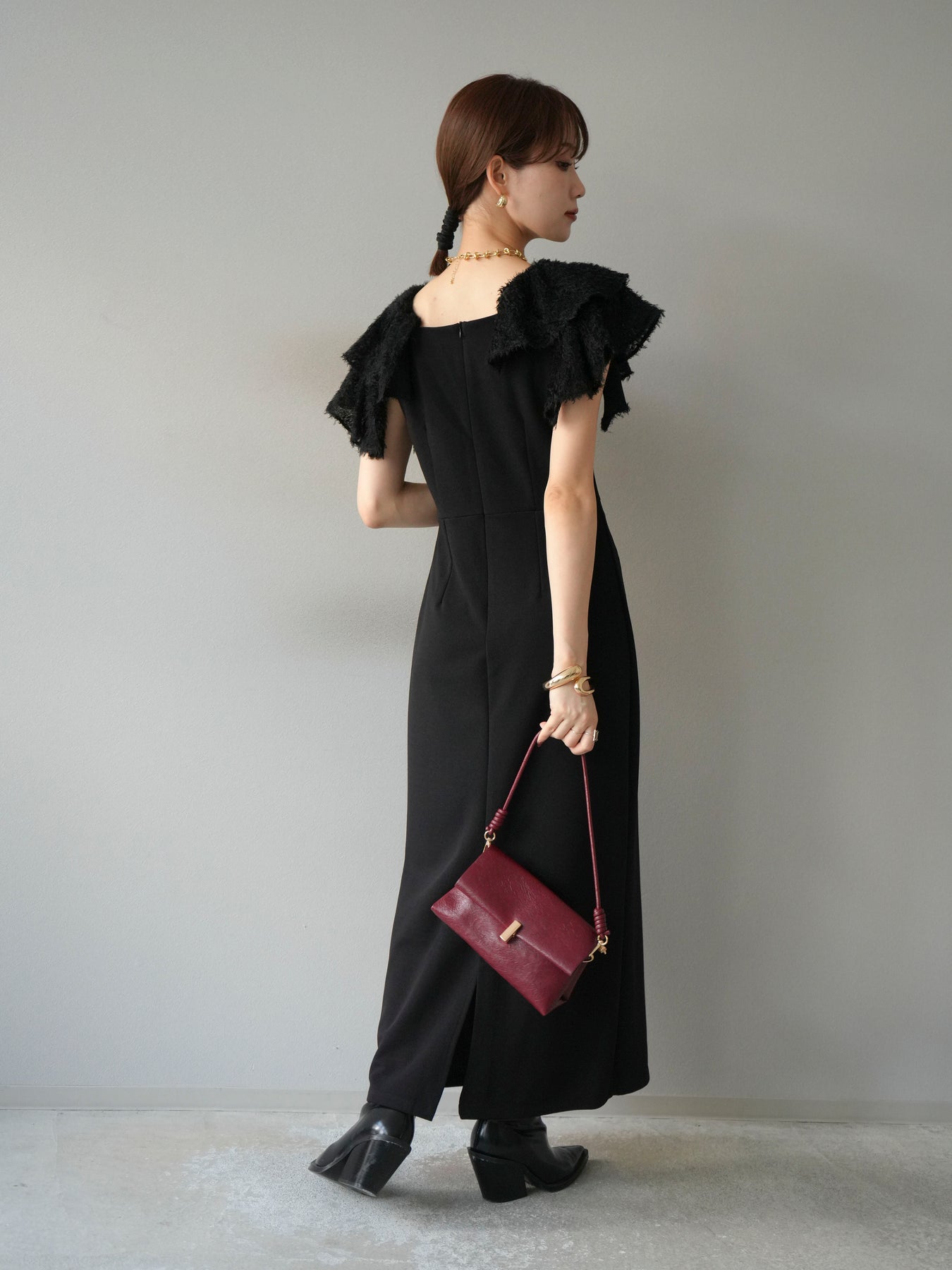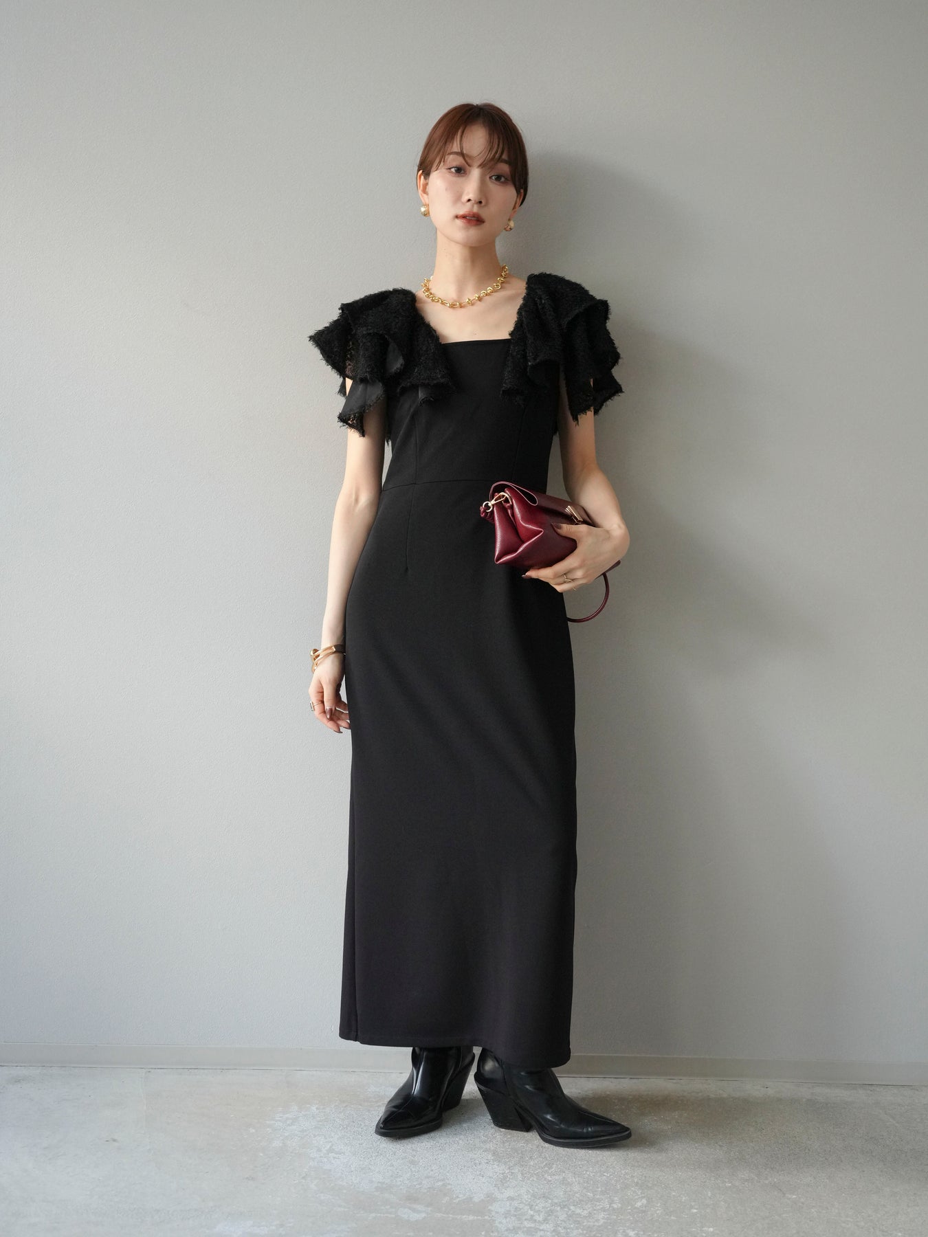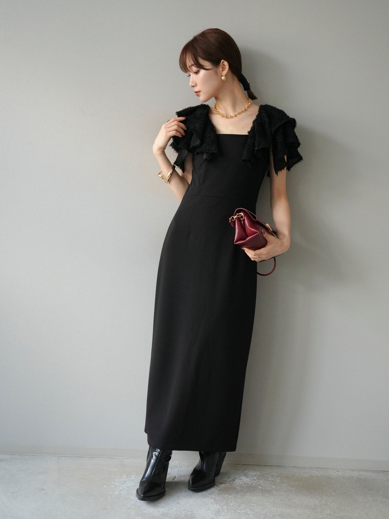 [予約]ジャガードフレアスリーブドレス/ブラック