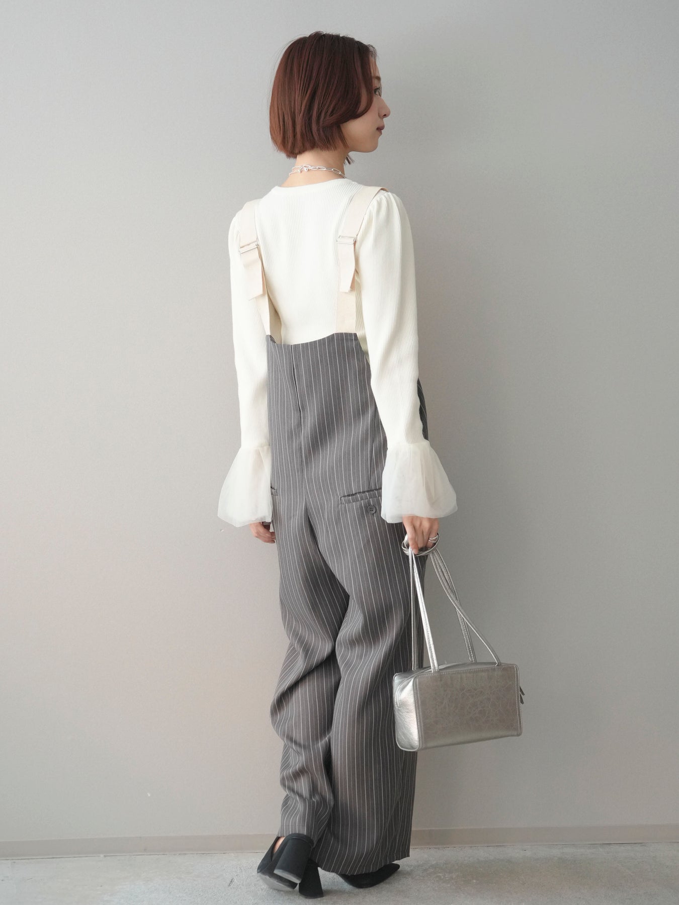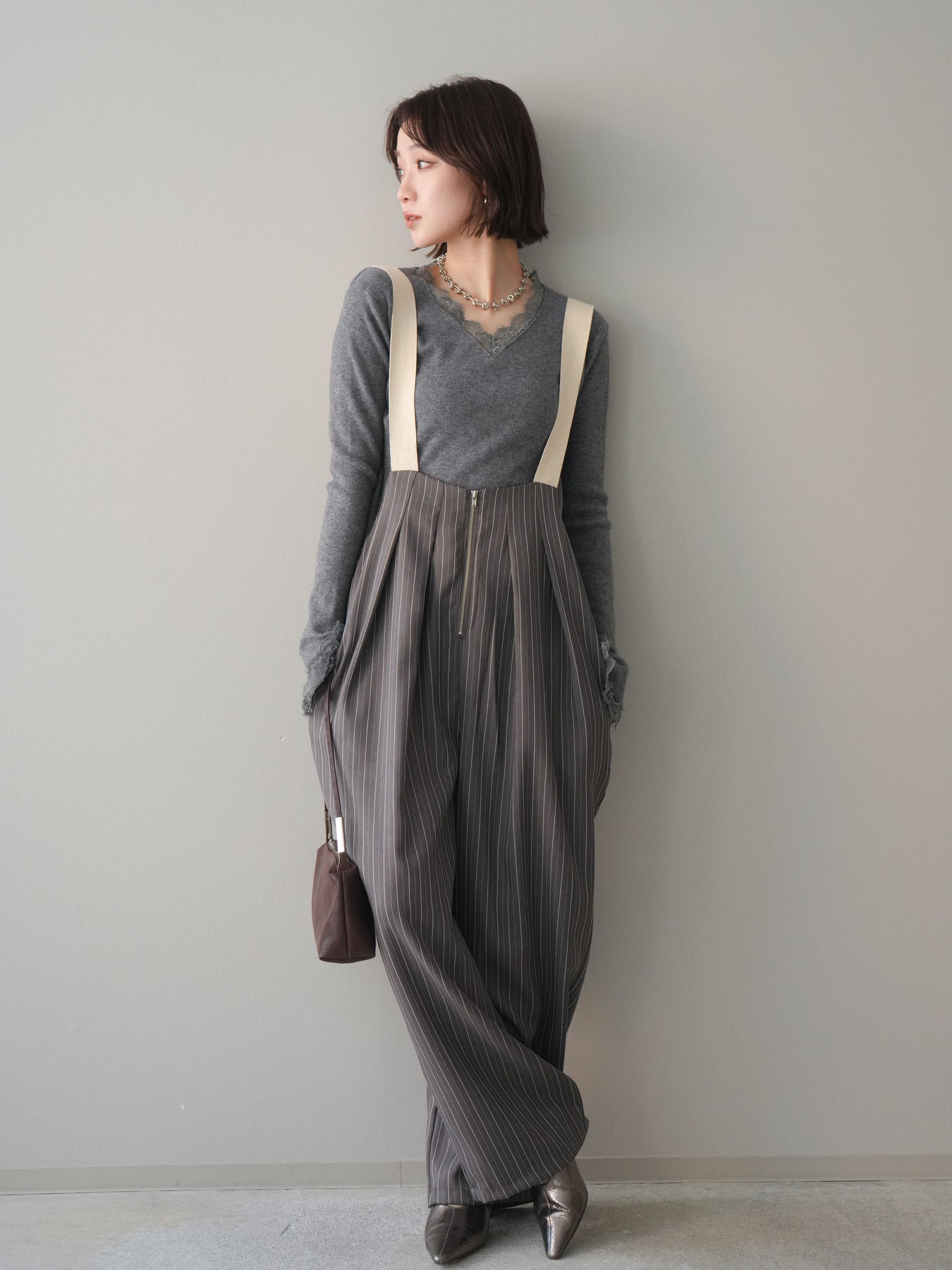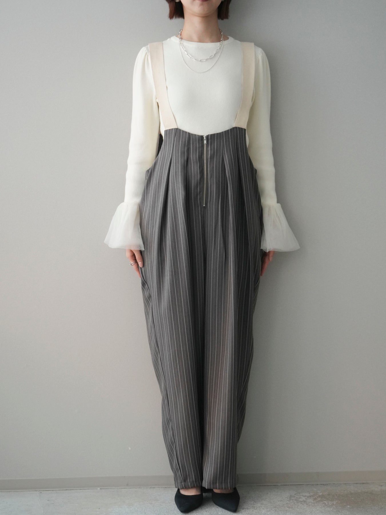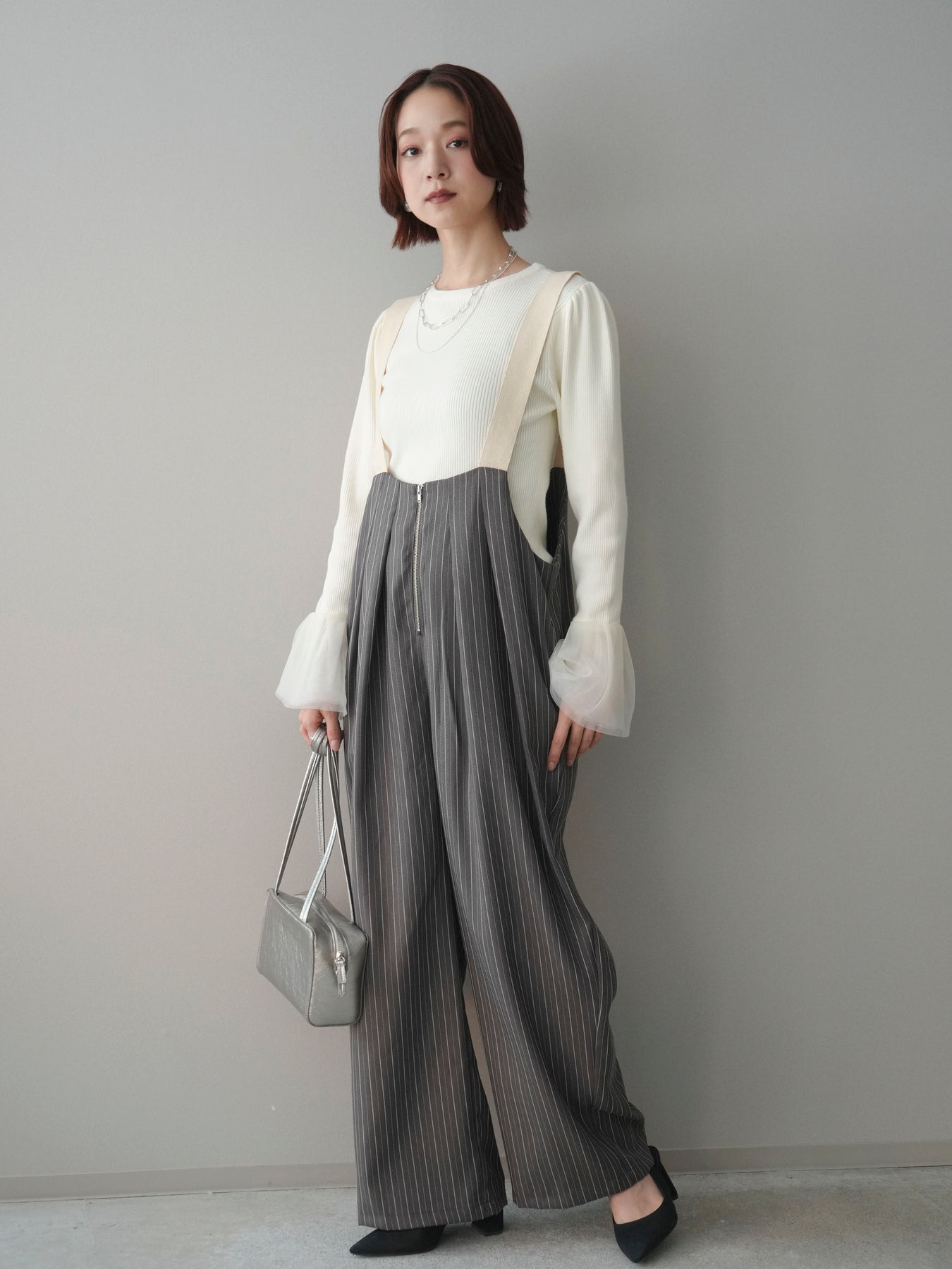 ストライプの縦ラインがすっきりとした印象をつくるサロペット。 胸元は程よくフィット感を持たせつつ、ウエスト下からはゆとりを出したシルエットで、動きやすさとバランスの良さを両立。 フロントジップのデザインが程よいアクセントになり、インナー次第で表情の変化も楽しめます。 トップスをコンパクトに合わせても、ボリュームのある袖デザインを重ねてもまとまりやすく、スタイリングの幅が広がる一着です。 ※ボトムス、キャミソール(インナー)以外の商品は一律でインナーは付属していません。