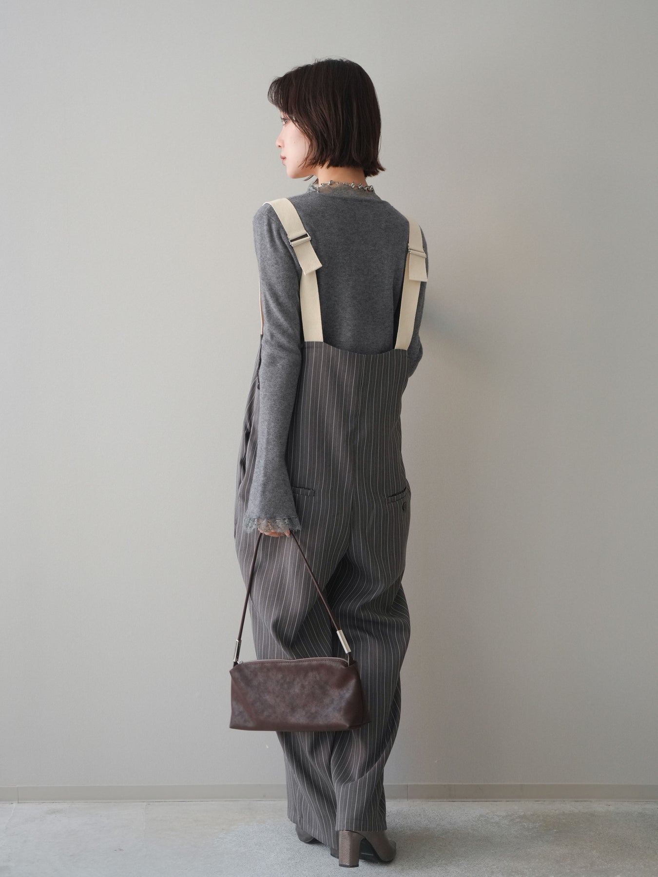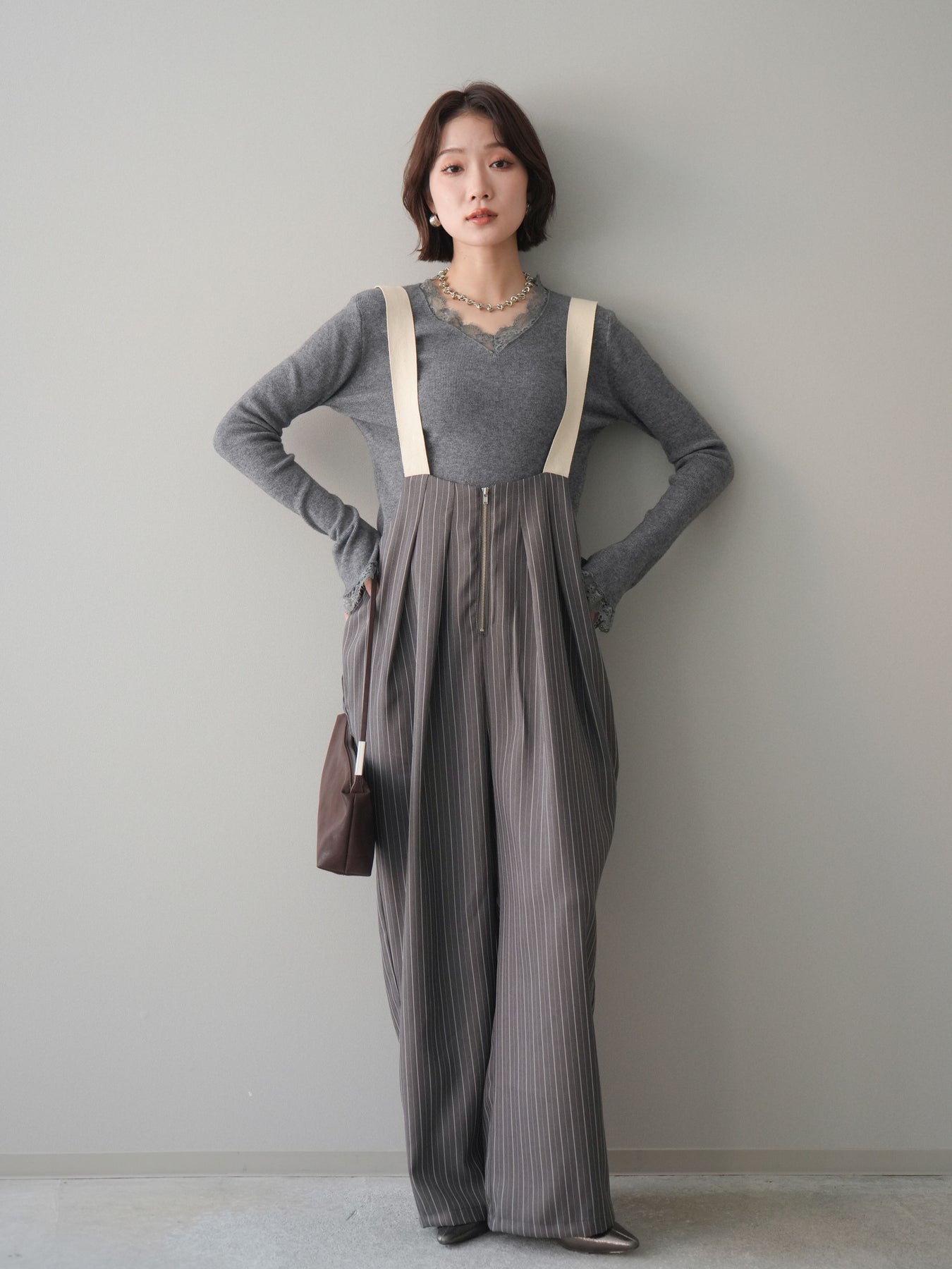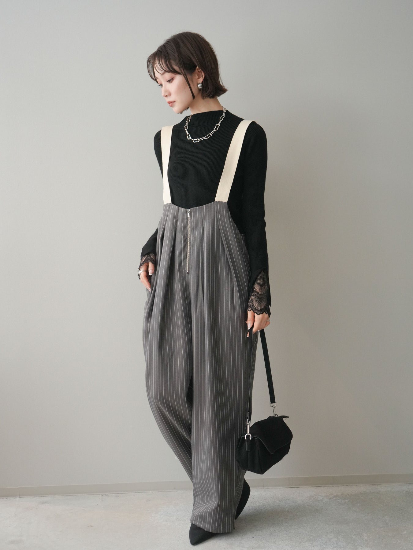 ストライプの縦ラインがすっきりとした印象をつくるサロペット。 胸元は程よくフィット感を持たせつつ、ウエスト下からはゆとりを出したシルエットで、動きやすさとバランスの良さを両立。 フロントジップのデザインが程よいアクセントになり、インナー次第で表情の変化も楽しめます。 トップスをコンパクトに合わせても、ボリュームのある袖デザインを重ねてもまとまりやすく、スタイリングの幅が広がる一着です。 ※ボトムス、キャミソール(インナー)以外の商品は一律でインナーは付属していません。