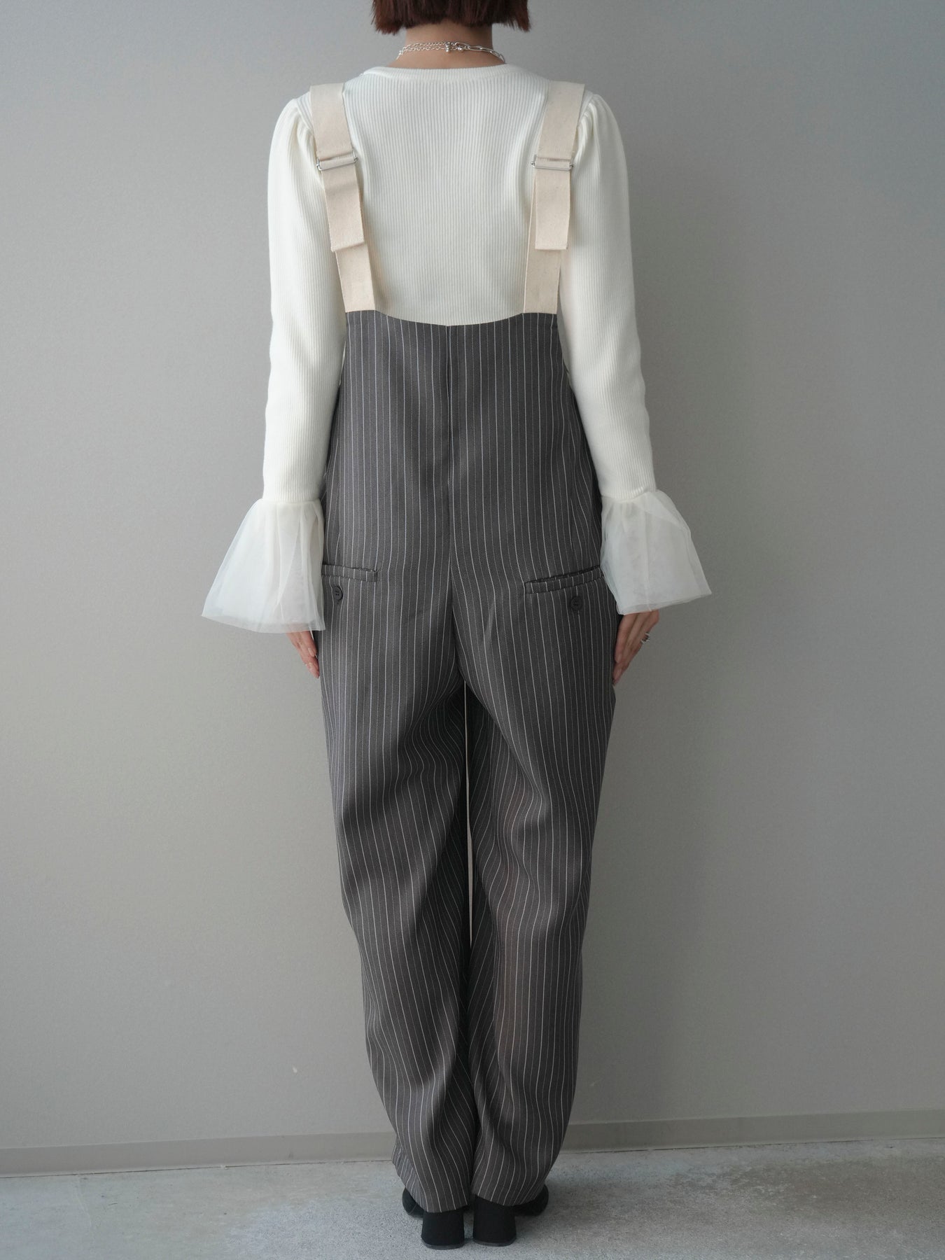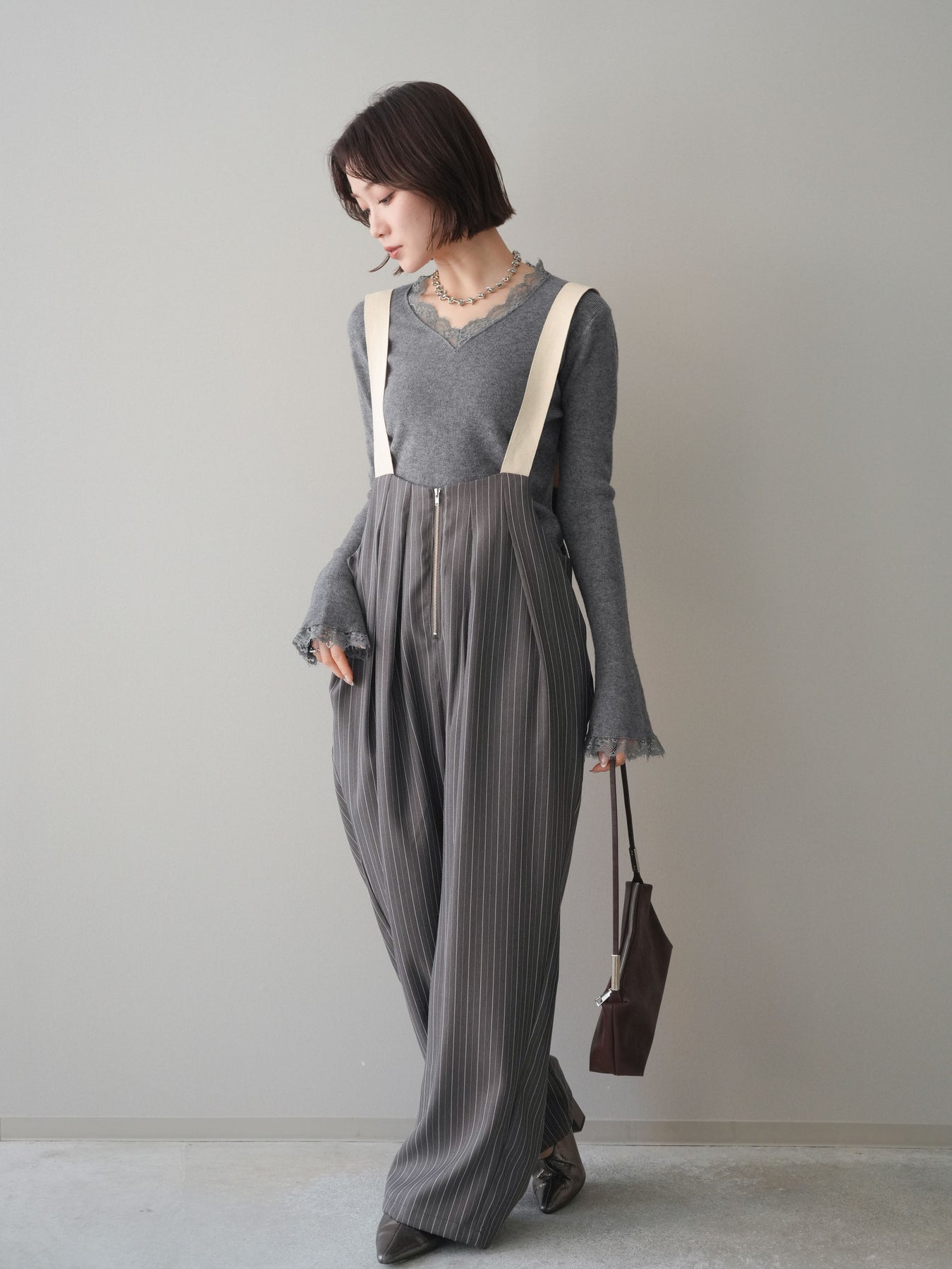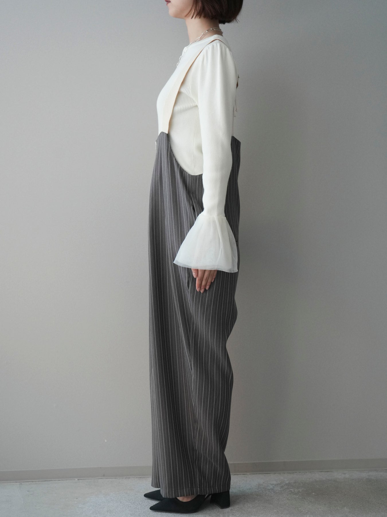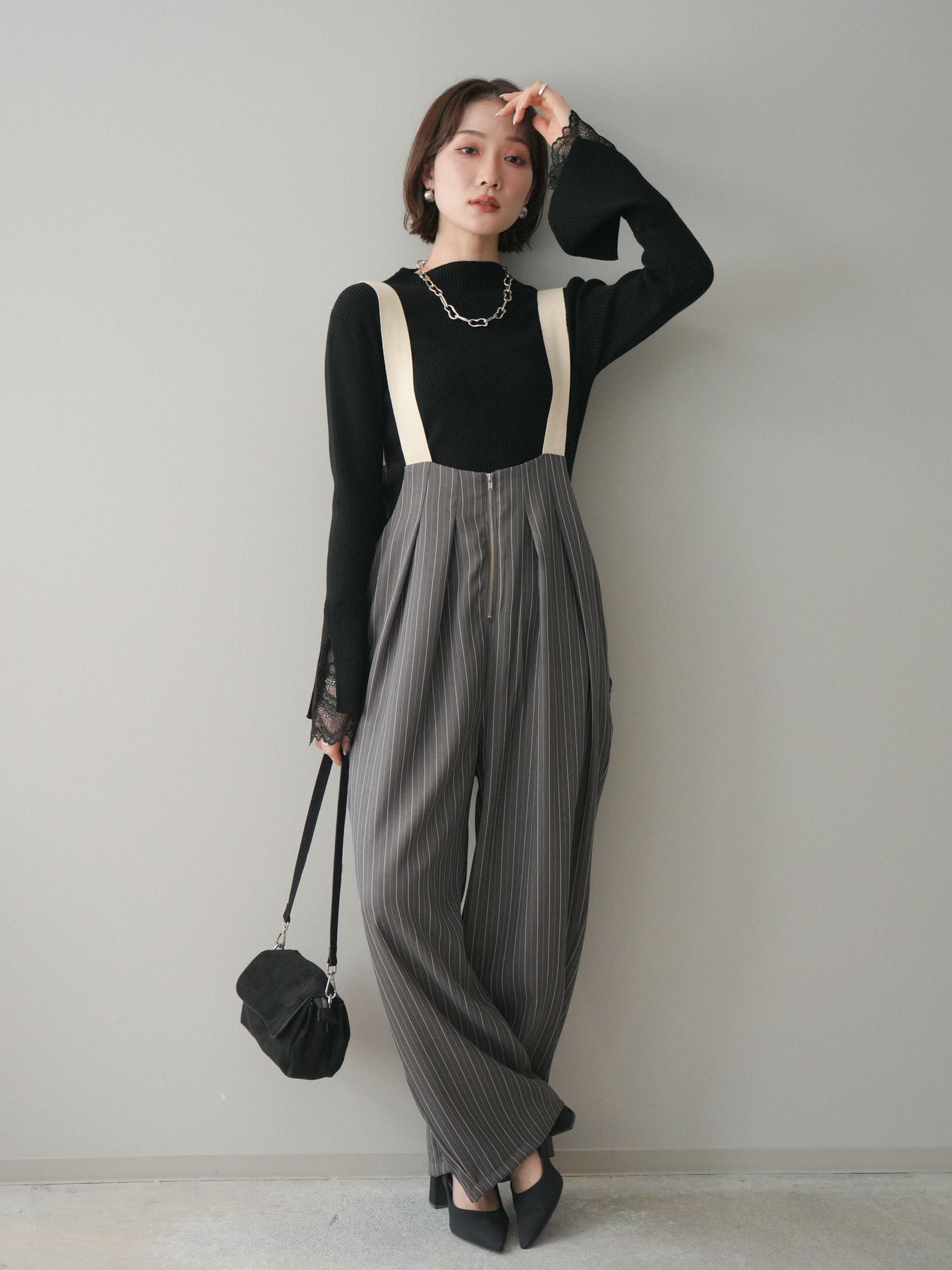 ストライプの縦ラインがすっきりとした印象をつくるサロペット。 胸元は程よくフィット感を持たせつつ、ウエスト下からはゆとりを出したシルエットで、動きやすさとバランスの良さを両立。 フロントジップのデザインが程よいアクセントになり、インナー次第で表情の変化も楽しめます。 トップスをコンパクトに合わせても、ボリュームのある袖デザインを重ねてもまとまりやすく、スタイリングの幅が広がる一着です。 ※ボトムス、キャミソール(インナー)以外の商品は一律でインナーは付属していません。