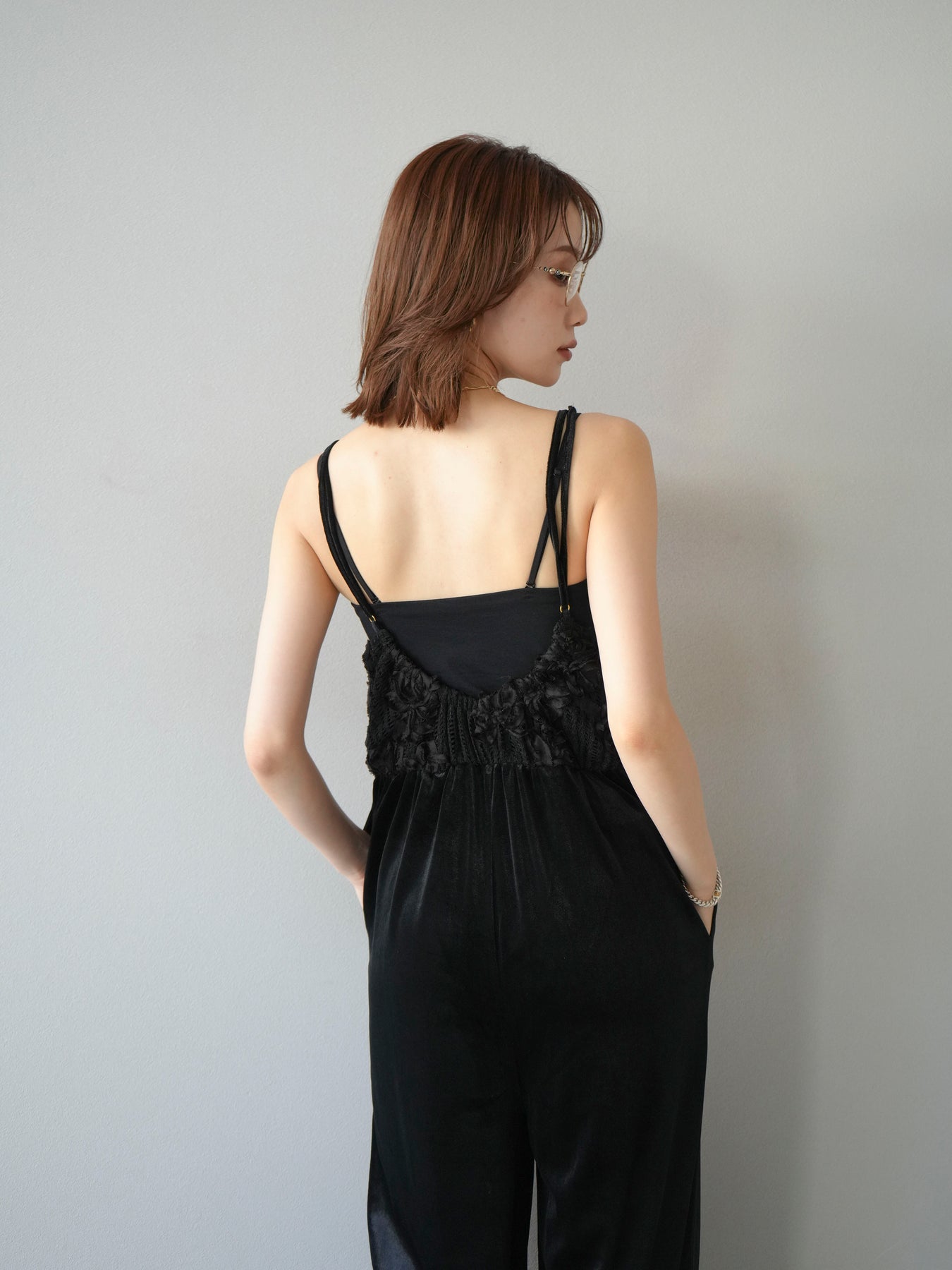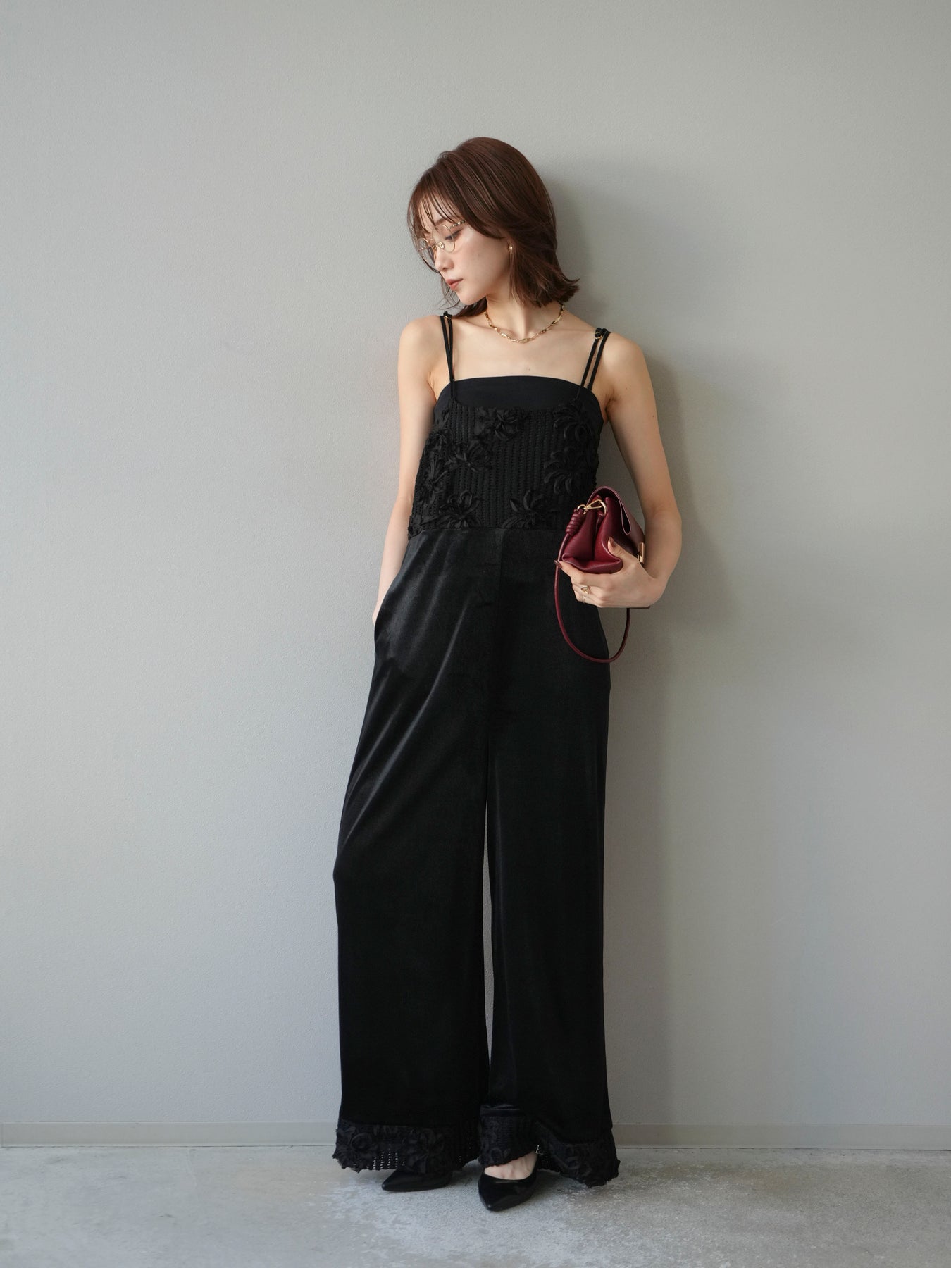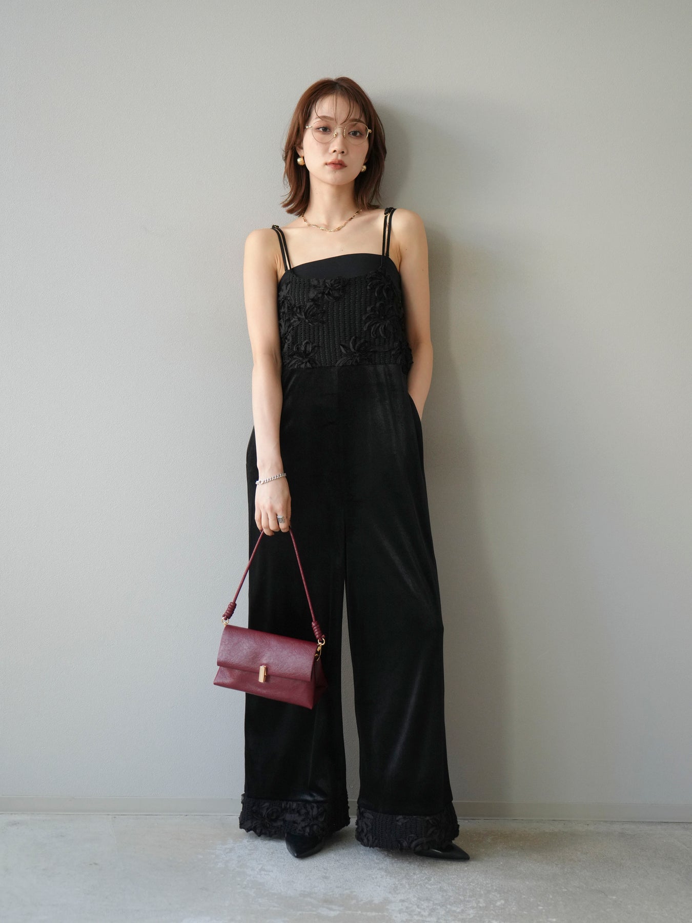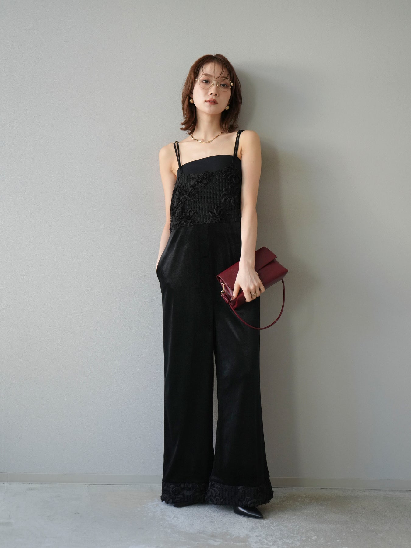 [予約]ジャガード切替ベロアサロペット/ブラック