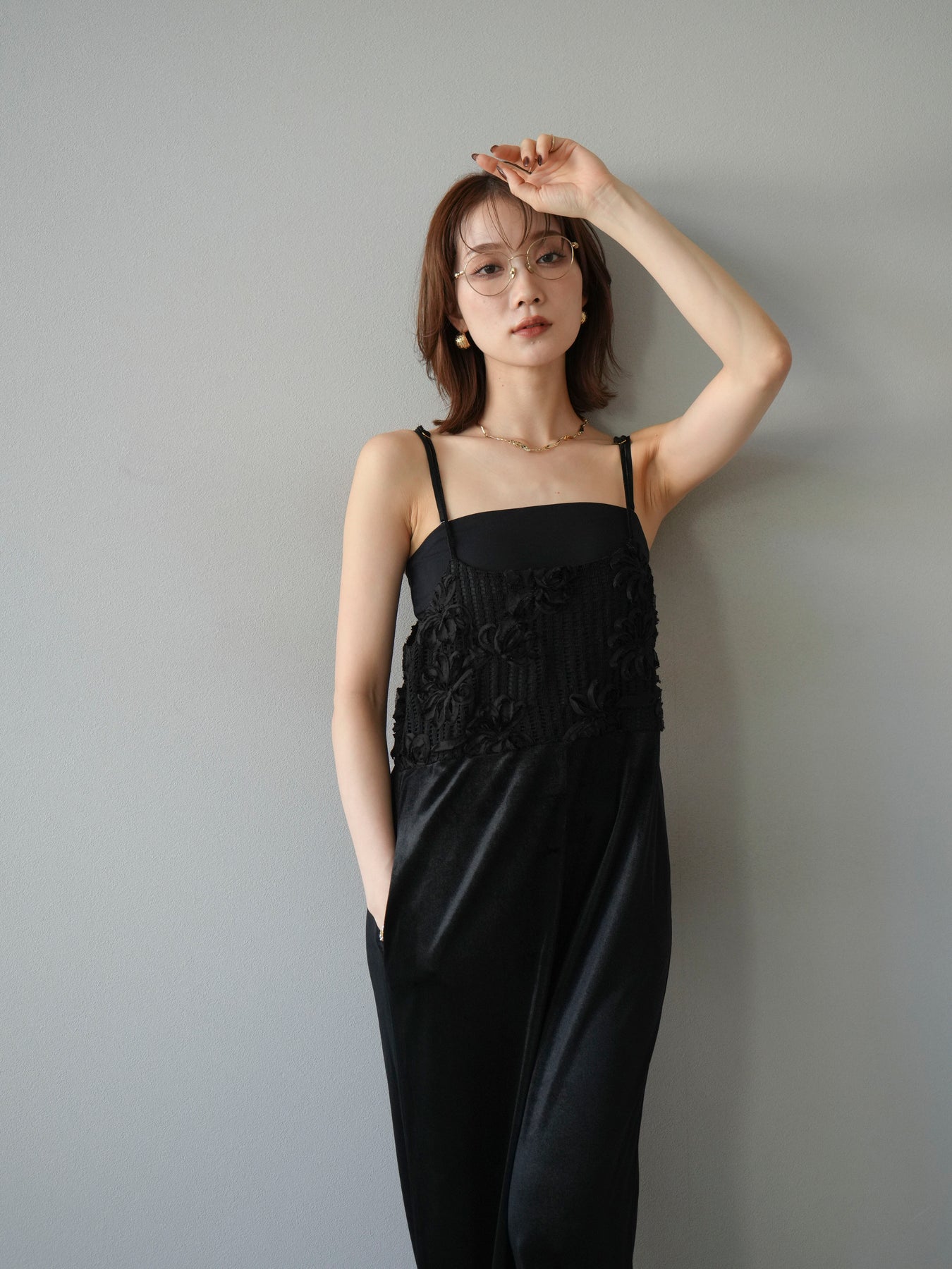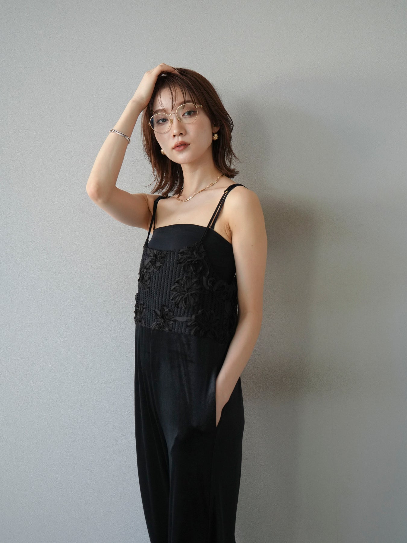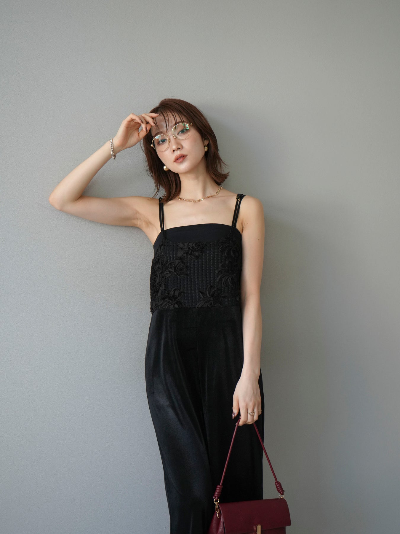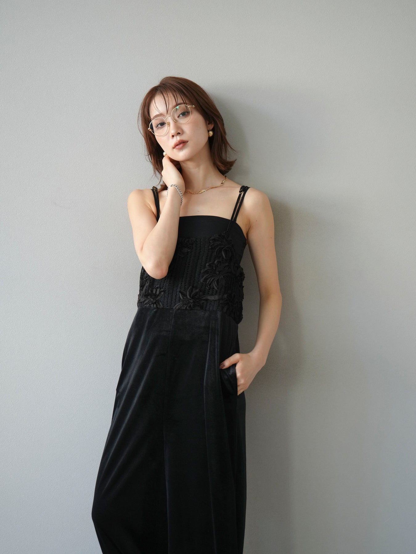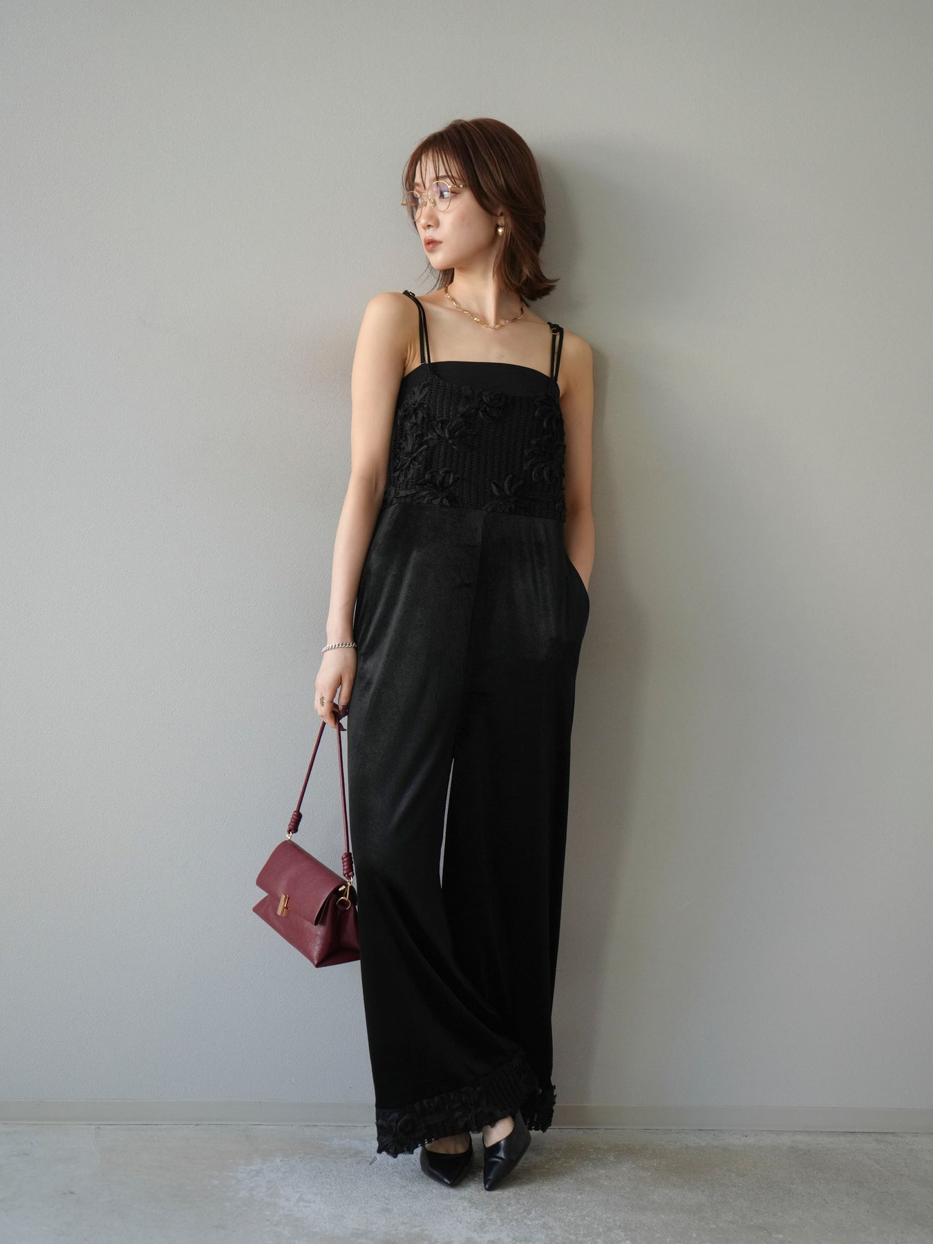 [予約]ジャガード切替ベロアサロペット/ブラック