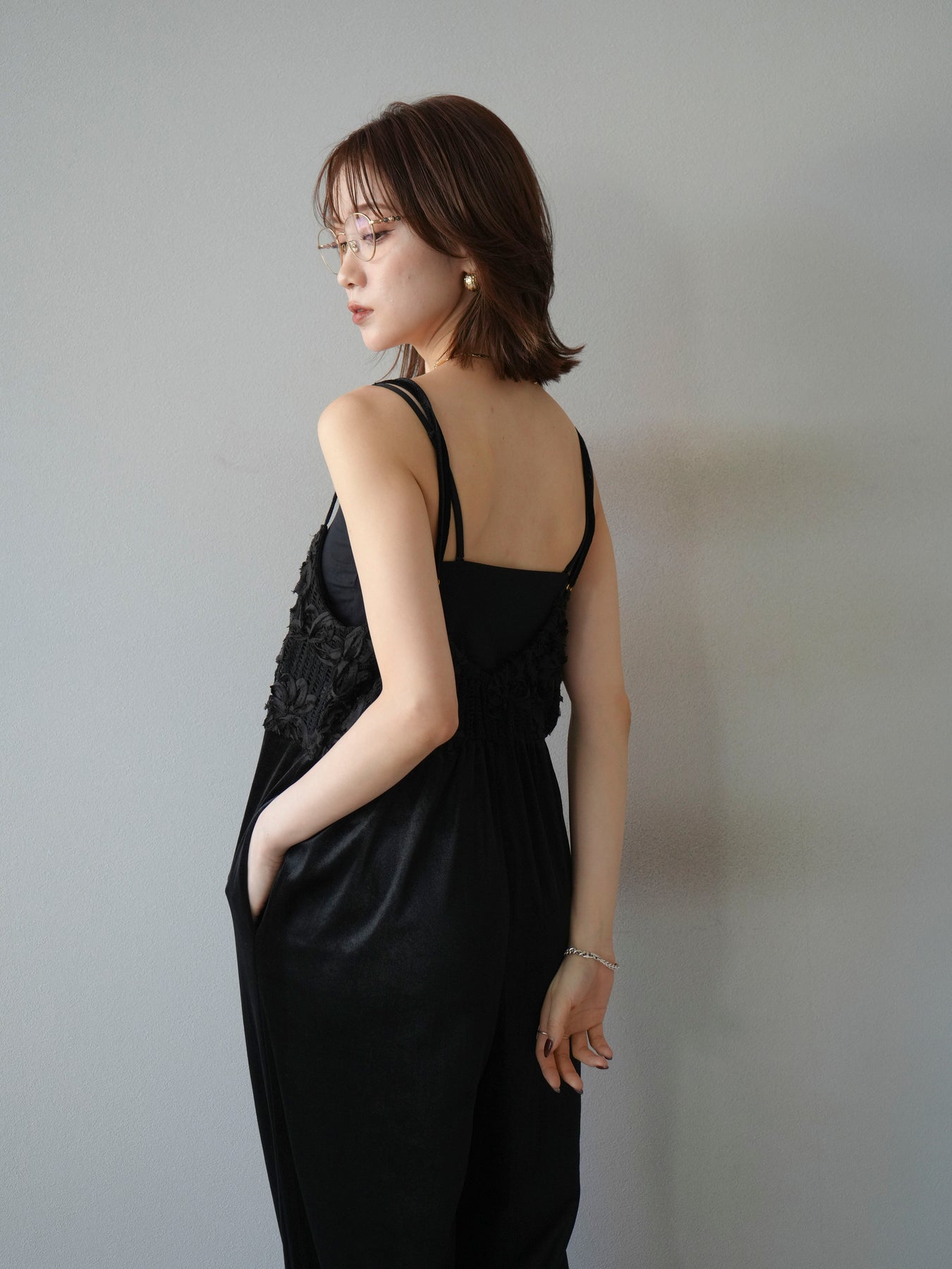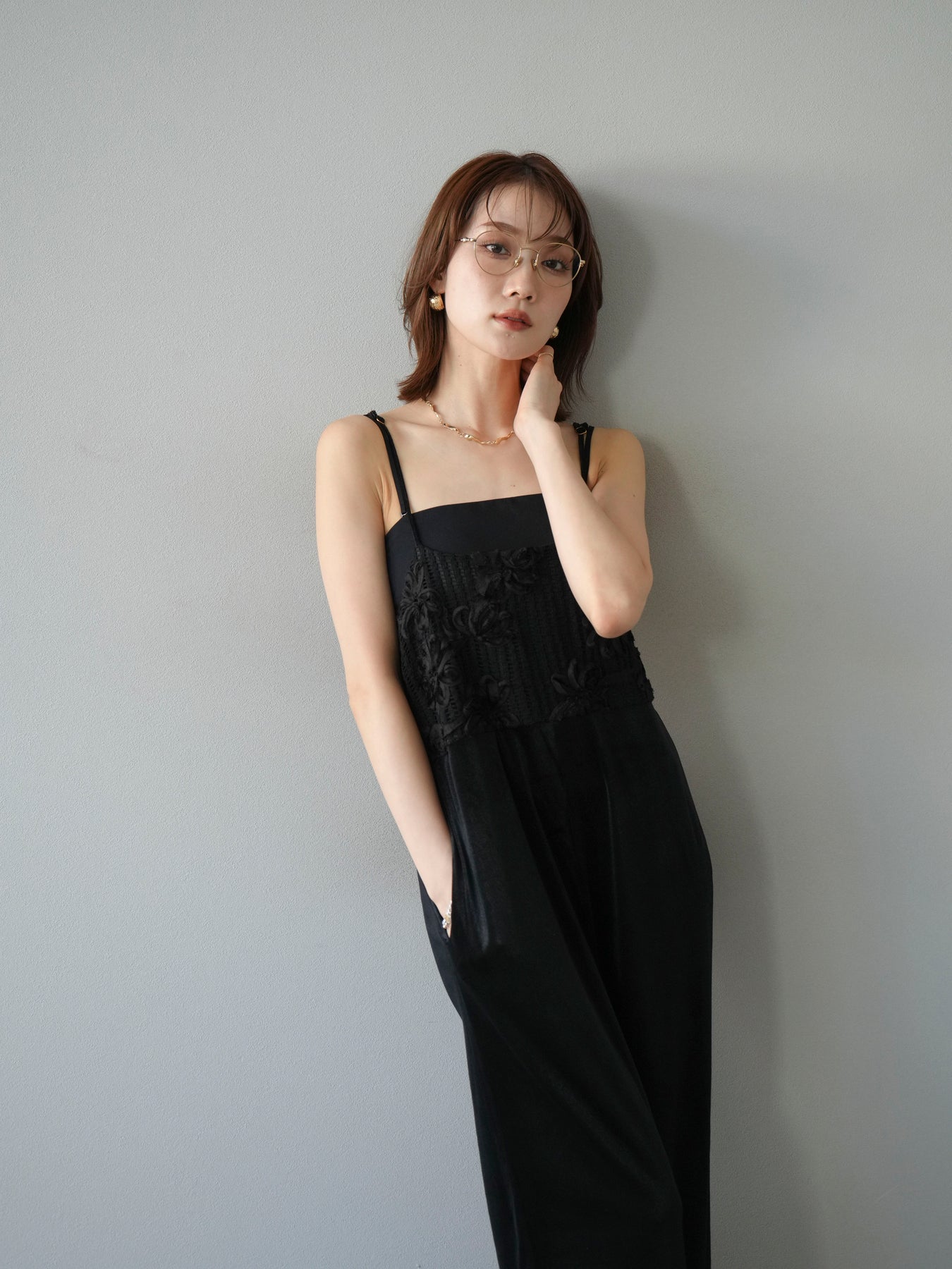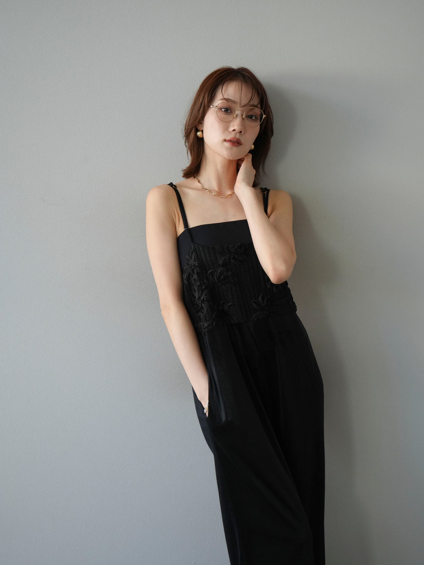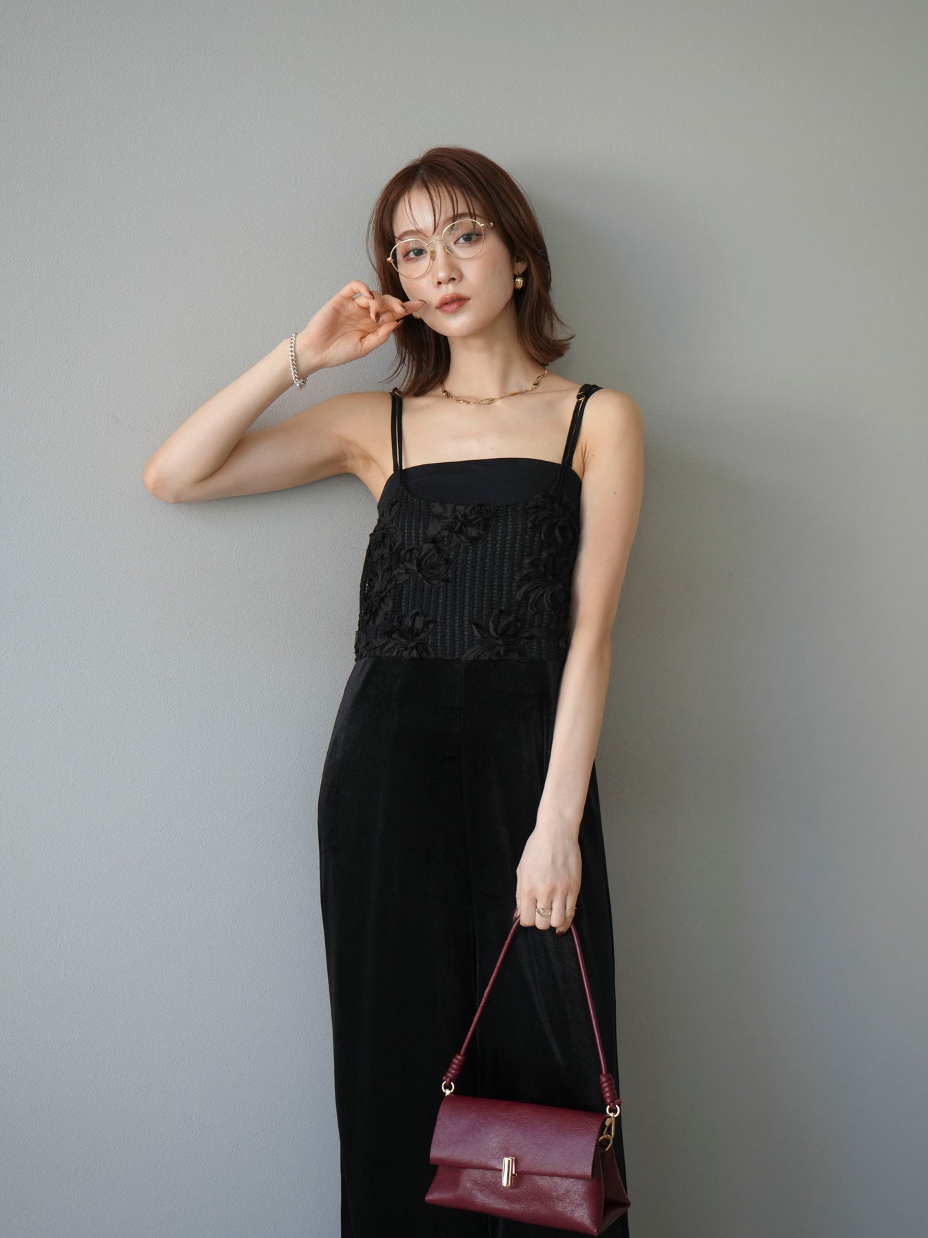 ジャガード生地とベロア素材を組み合わせた上品なサロペット。異素材の切り替えが立体感を生み出し、1枚で華やかな印象に仕上げます。華奢なストラップが抜け感をプラスし、程よくゆとりのあるシルエットでリラクシーな着心地を実現。裾にもジャガードの装飾を施し、ディテールまでこだわりを感じるデザインです。インナー次第で季節を問わず着回せる、大人のモードスタイルにぴったりの一着。 ※ボトムス、キャミソール(インナー)以外の商品は一律でインナーは付属していません。