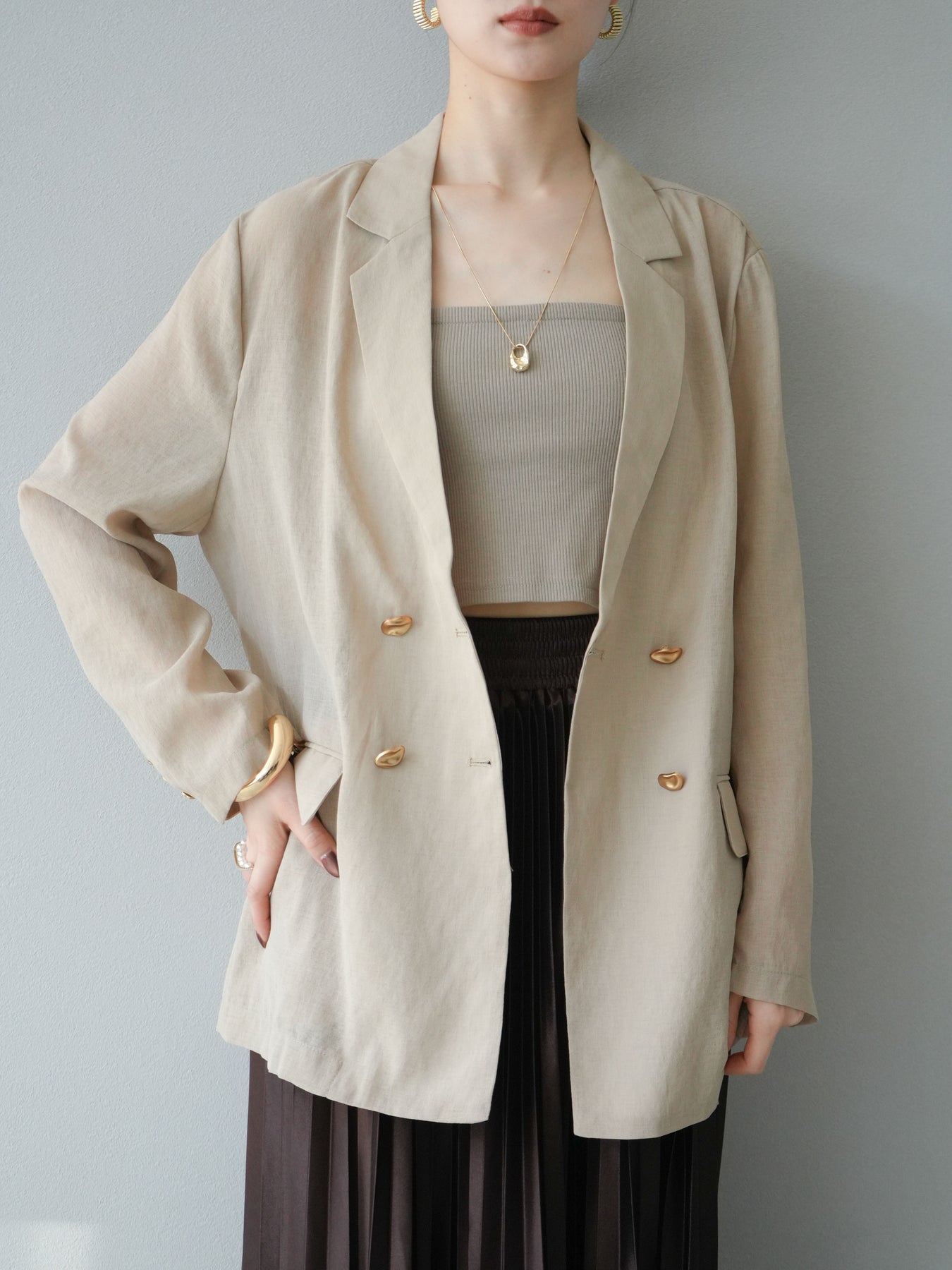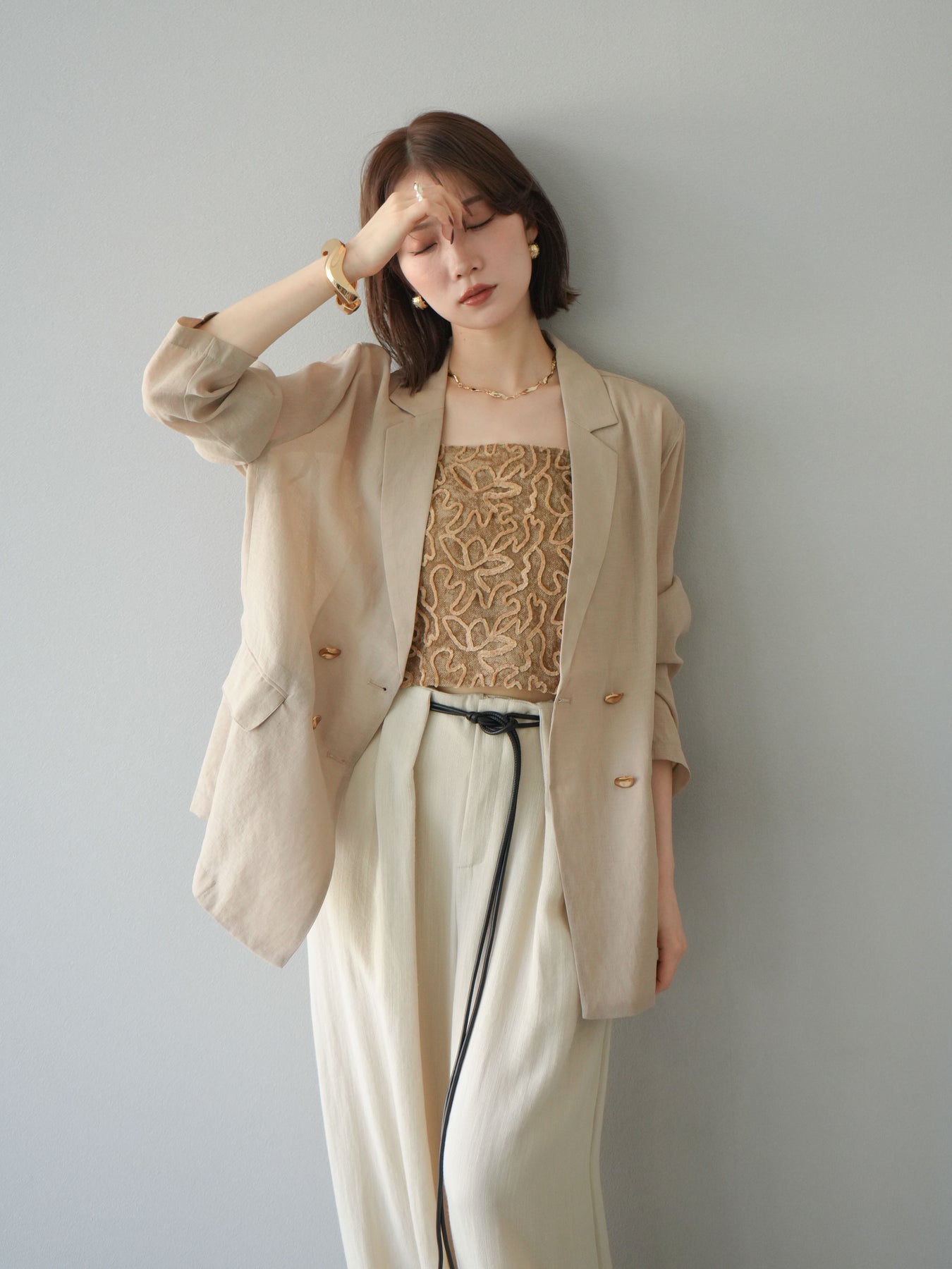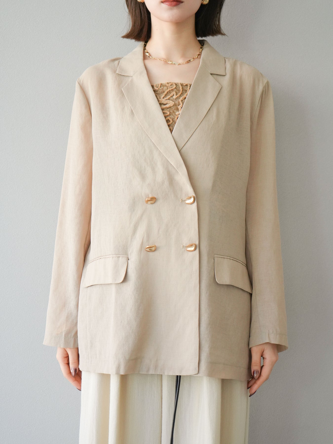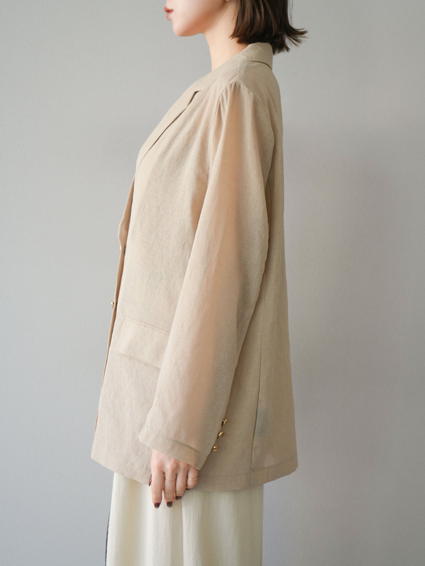 クラシカルなムード漂う、軽やかなシアージャケット。ほどよい透け感が季節感を演出し、羽織るだけで抜け感のあるスタイリングが完成。ゴールドのメタル調ボタンがアクセントとなり、上品で洗練された印象に仕上げてくれます。ヒップにかかる程よい丈感と、ゆとりのあるシルエットが体型をさりげなくカバーしつつ、リネンライクなナチュラル素材でさらっとした着心地も魅力。ワンピースやスカートにはもちろん、デニムやワイドパンツとも好相性。オンオフ問わず活躍する一枚です。 ※ボトムス、キャミソール(インナー)以外の商品は一律でインナーは付属していません