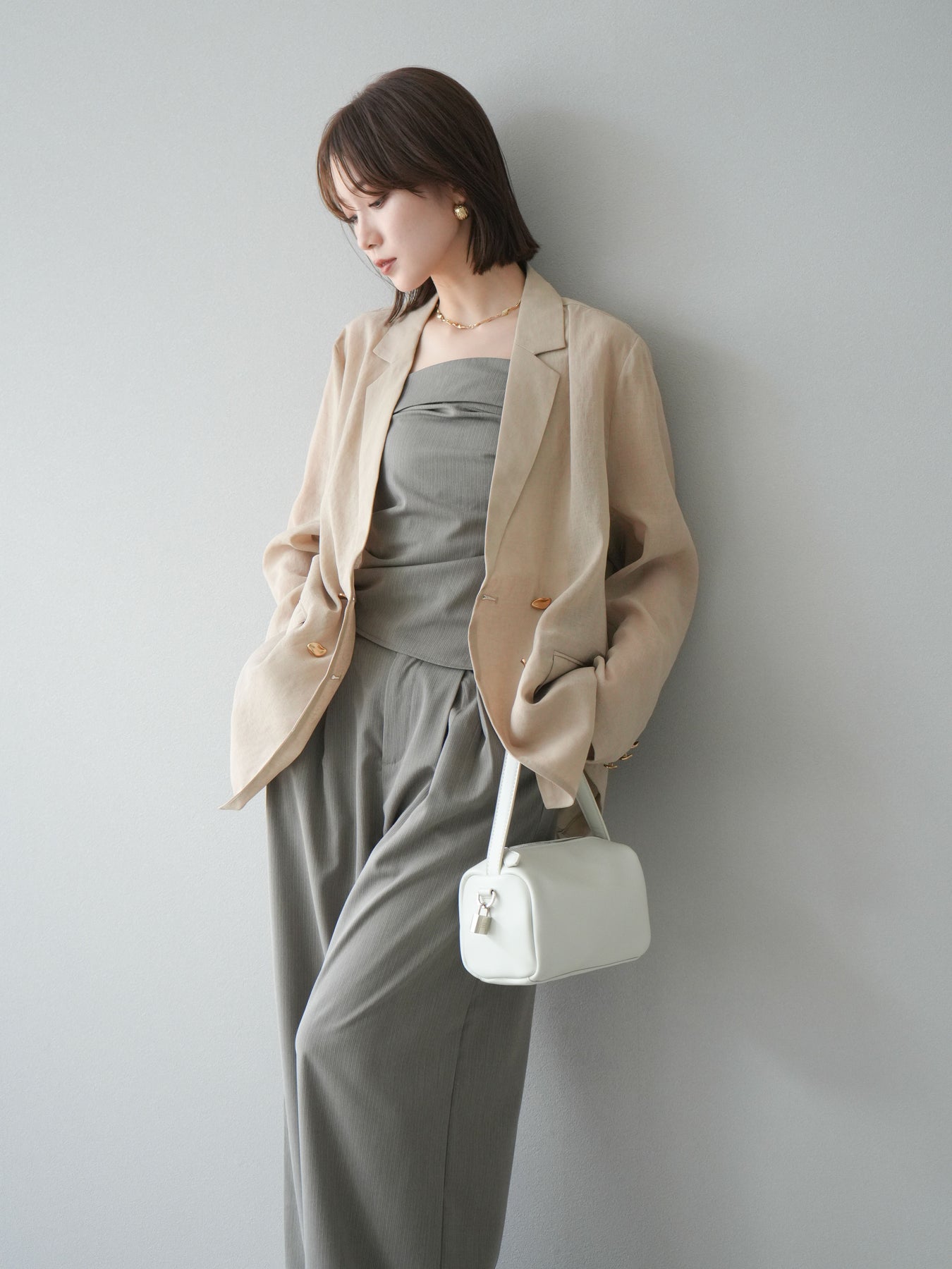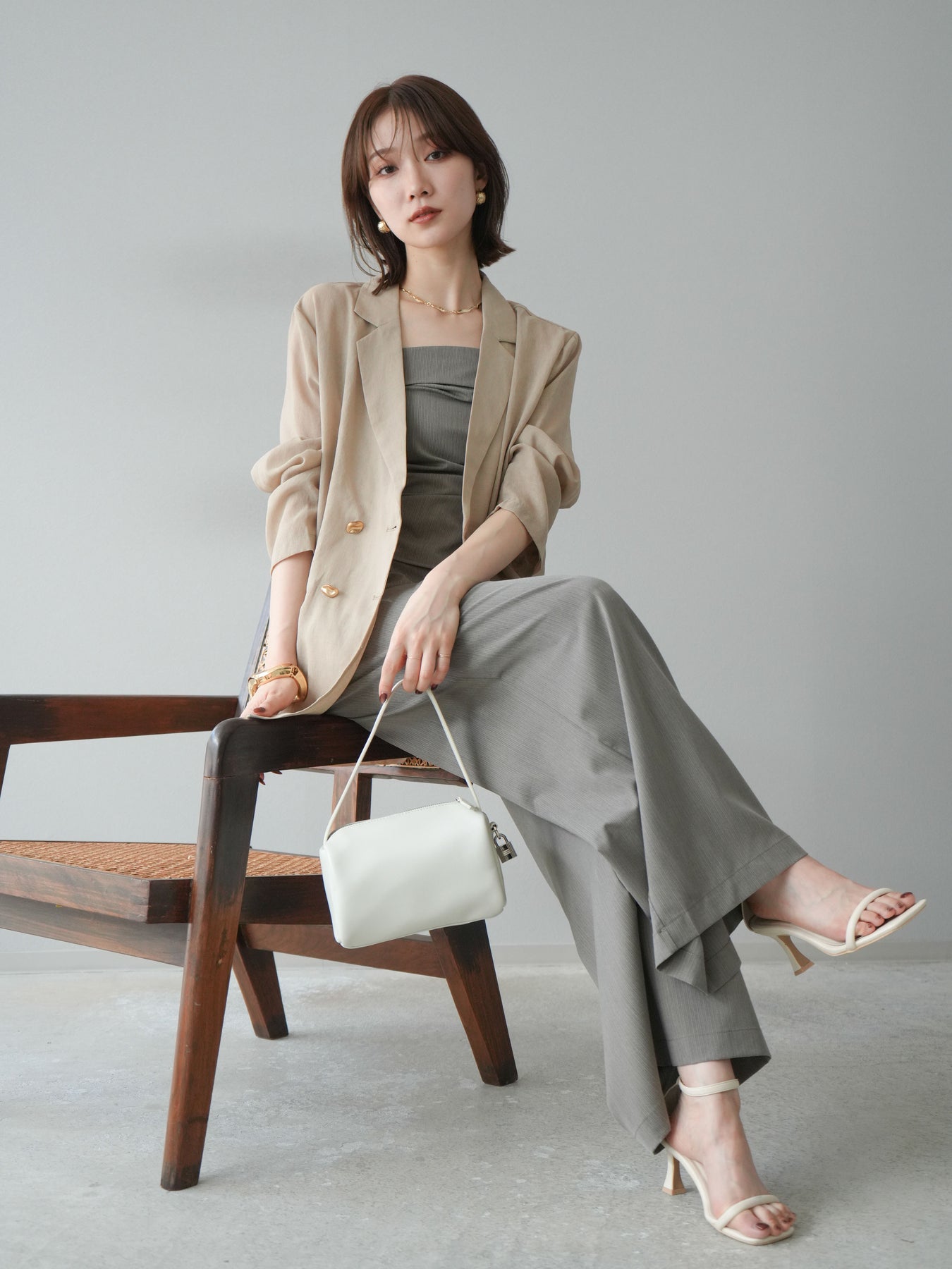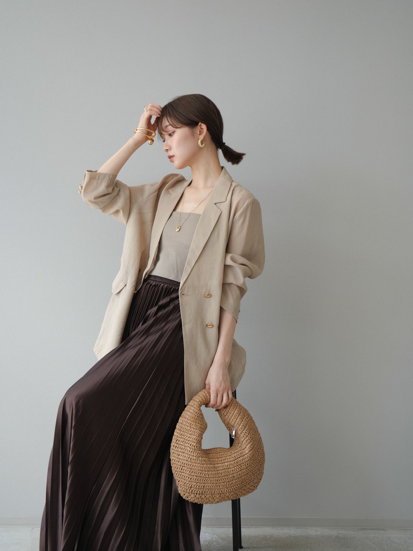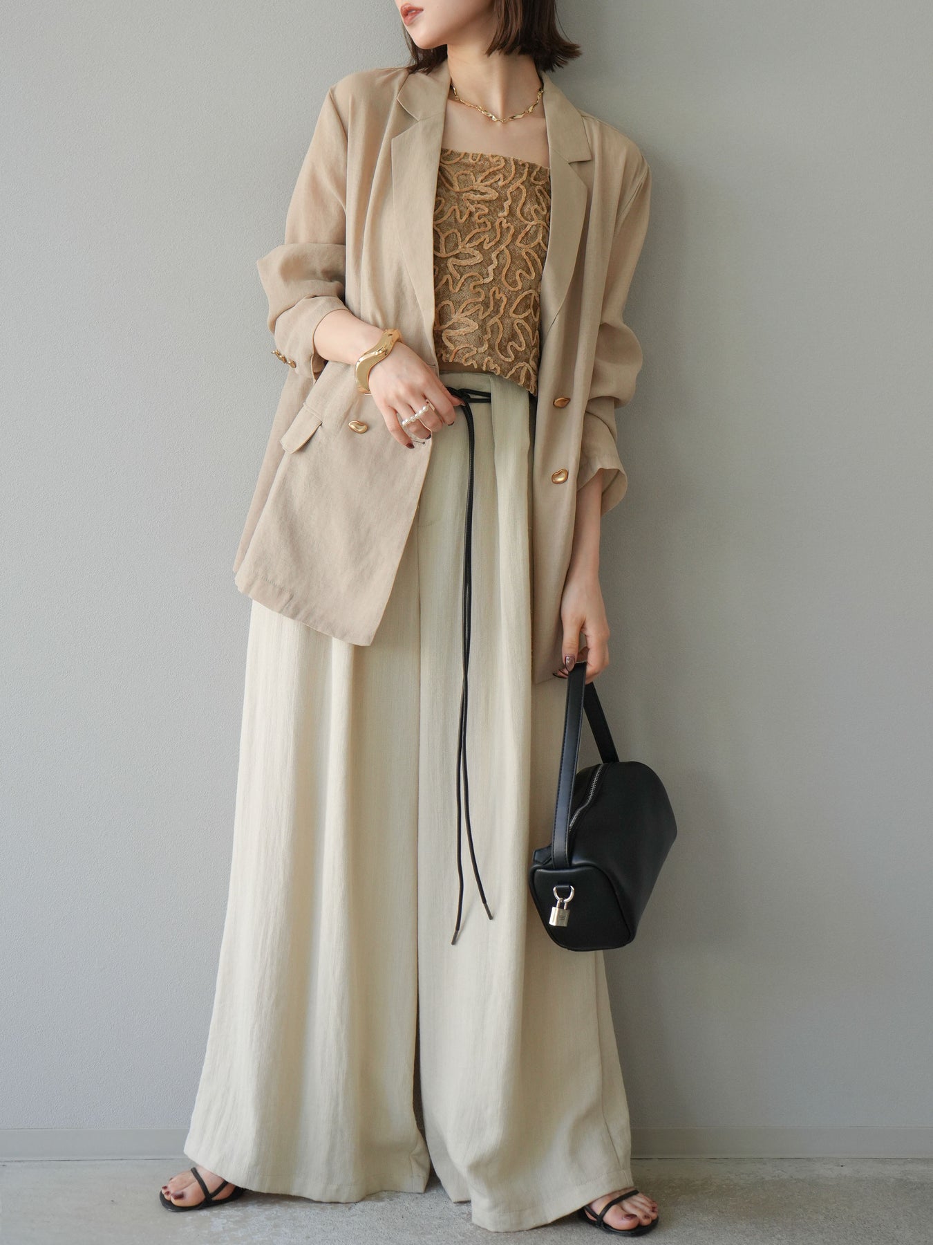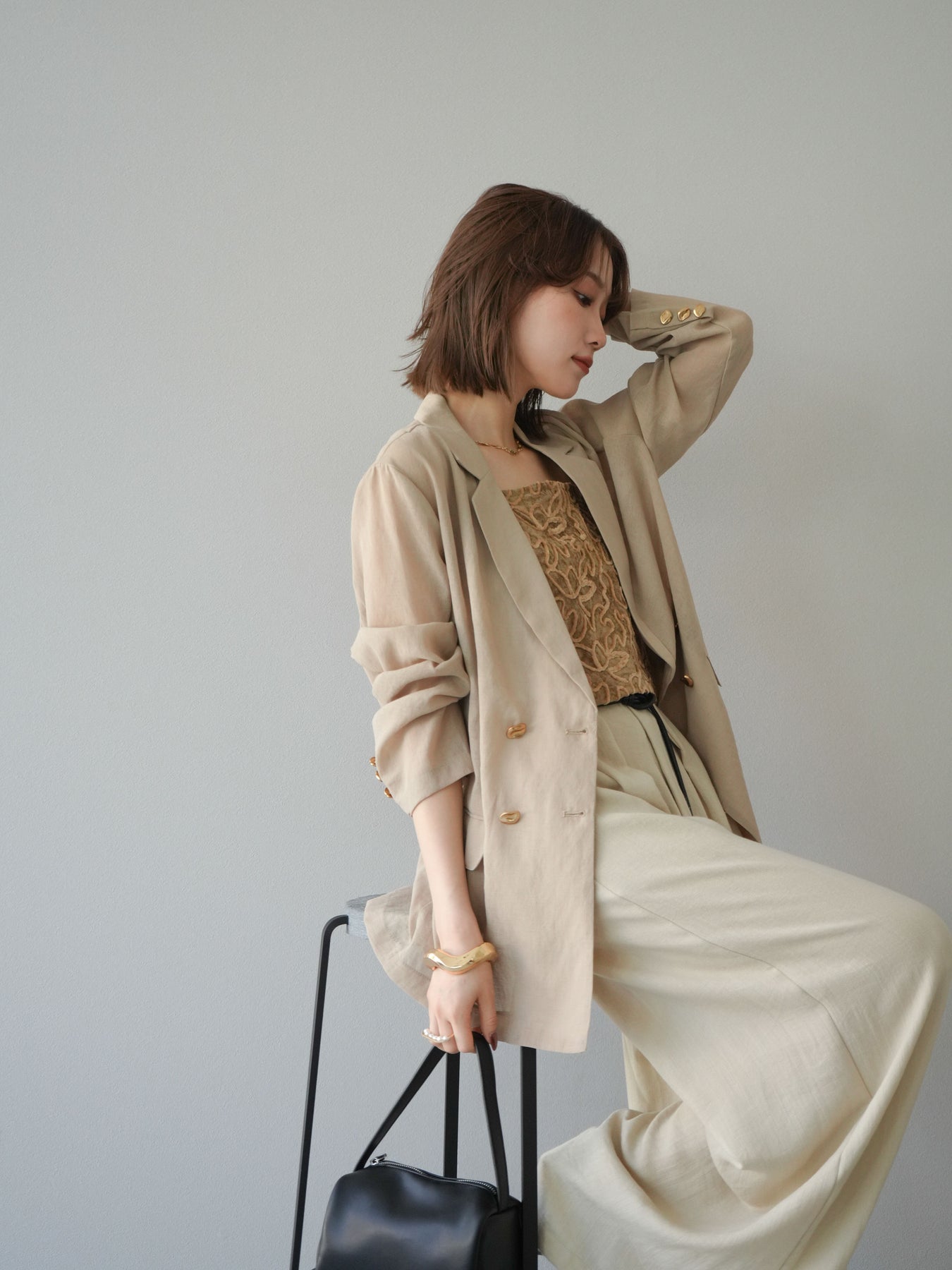 クラシカルなムード漂う、軽やかなシアージャケット。ほどよい透け感が季節感を演出し、羽織るだけで抜け感のあるスタイリングが完成。ゴールドのメタル調ボタンがアクセントとなり、上品で洗練された印象に仕上げてくれます。ヒップにかかる程よい丈感と、ゆとりのあるシルエットが体型をさりげなくカバーしつつ、リネンライクなナチュラル素材でさらっとした着心地も魅力。ワンピースやスカートにはもちろん、デニムやワイドパンツとも好相性。オンオフ問わず活躍する一枚です。 ※ボトムス、キャミソール(インナー)以外の商品は一律でインナーは付属していません