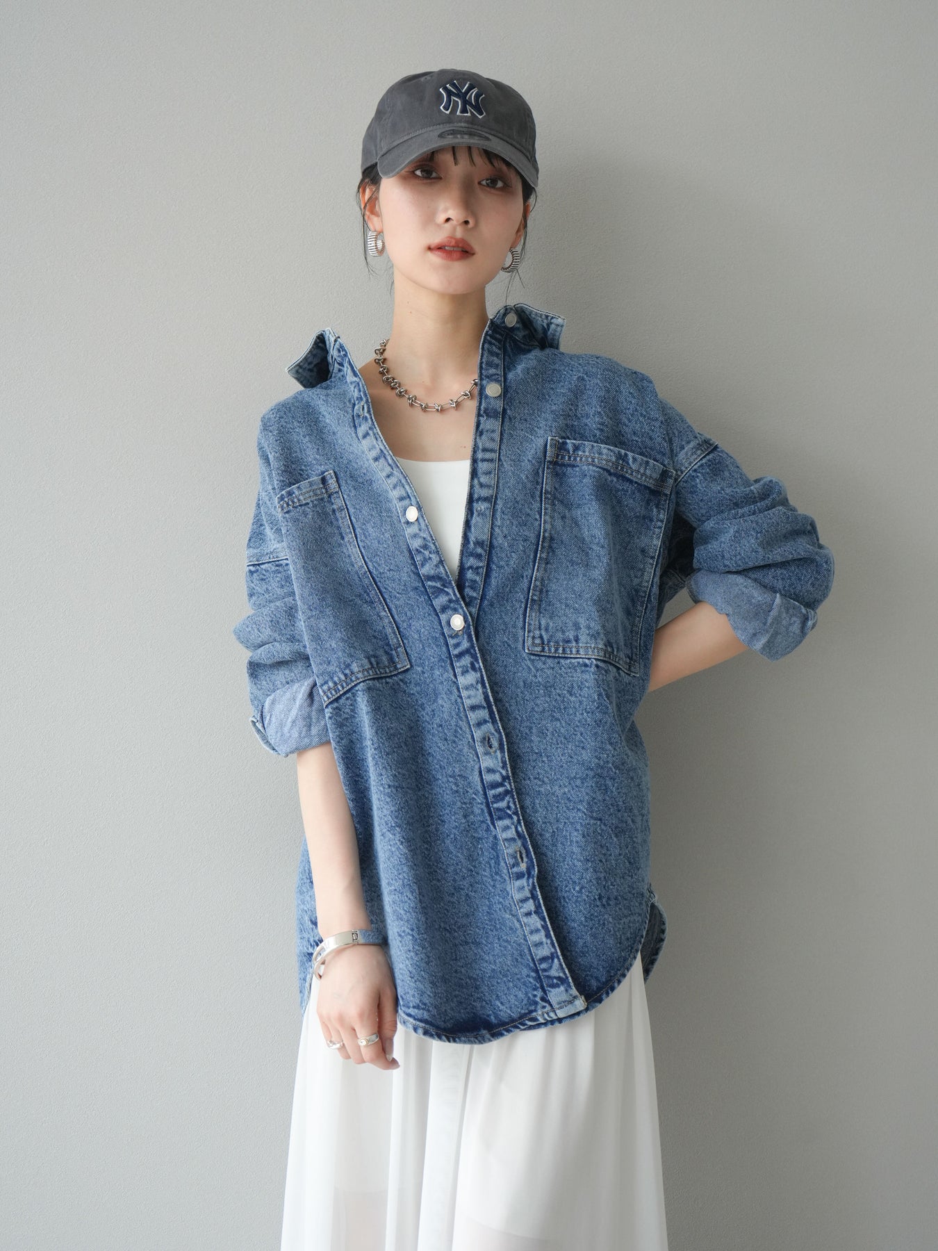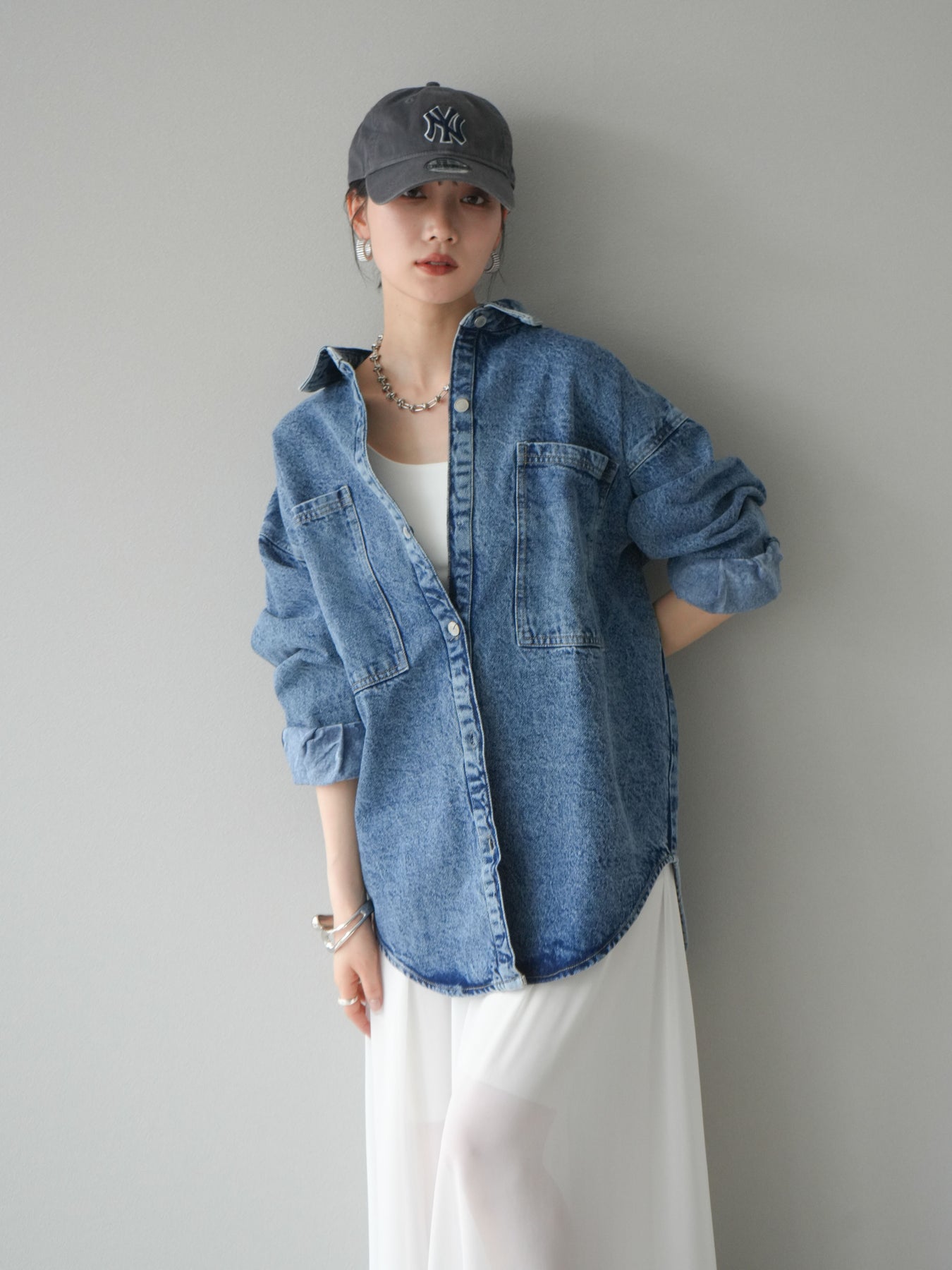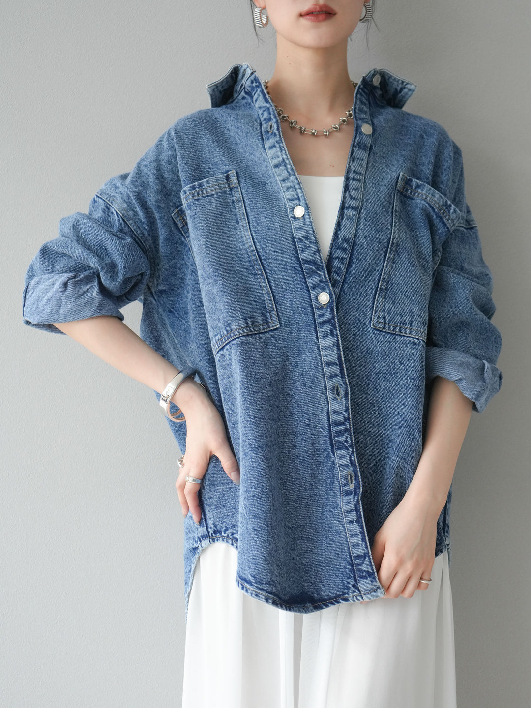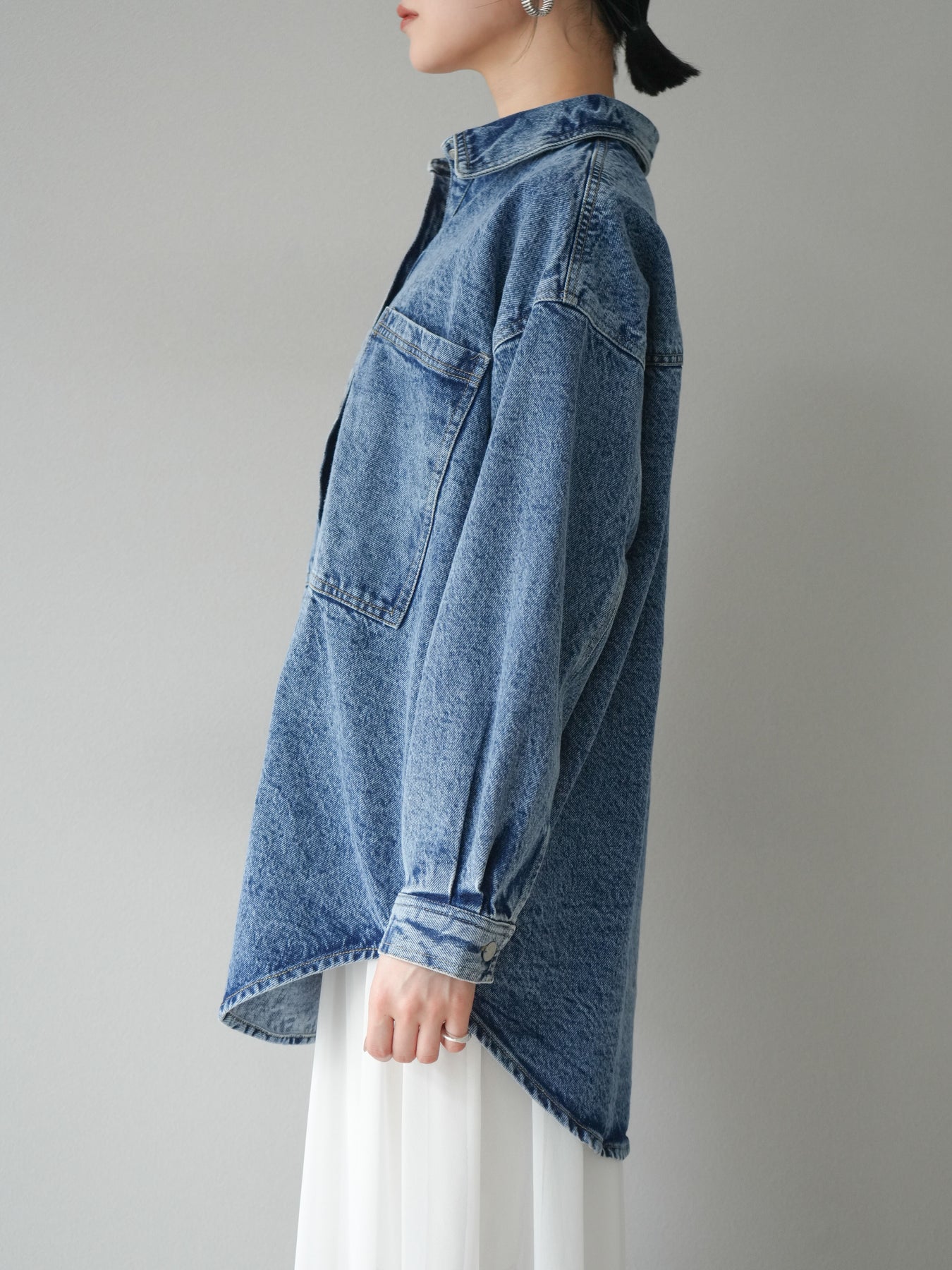 トレンドライクなゆったりシルエットが魅力のデニムシャツジャケット。程よい厚みで、シャツとしてもライトアウターとしても着回せる万能アイテムです。カジュアルな中にも洗練された雰囲気を演出できる一枚で、季節の変わり目に大活躍。大きめポケットがアクセントになり、羽織るだけでこなれたスタイルが完成します。 ※ボトムス、キャミソール(インナー)以外の商品は一律でインナーは付属していません