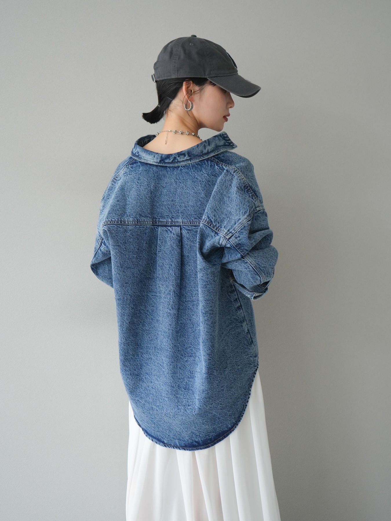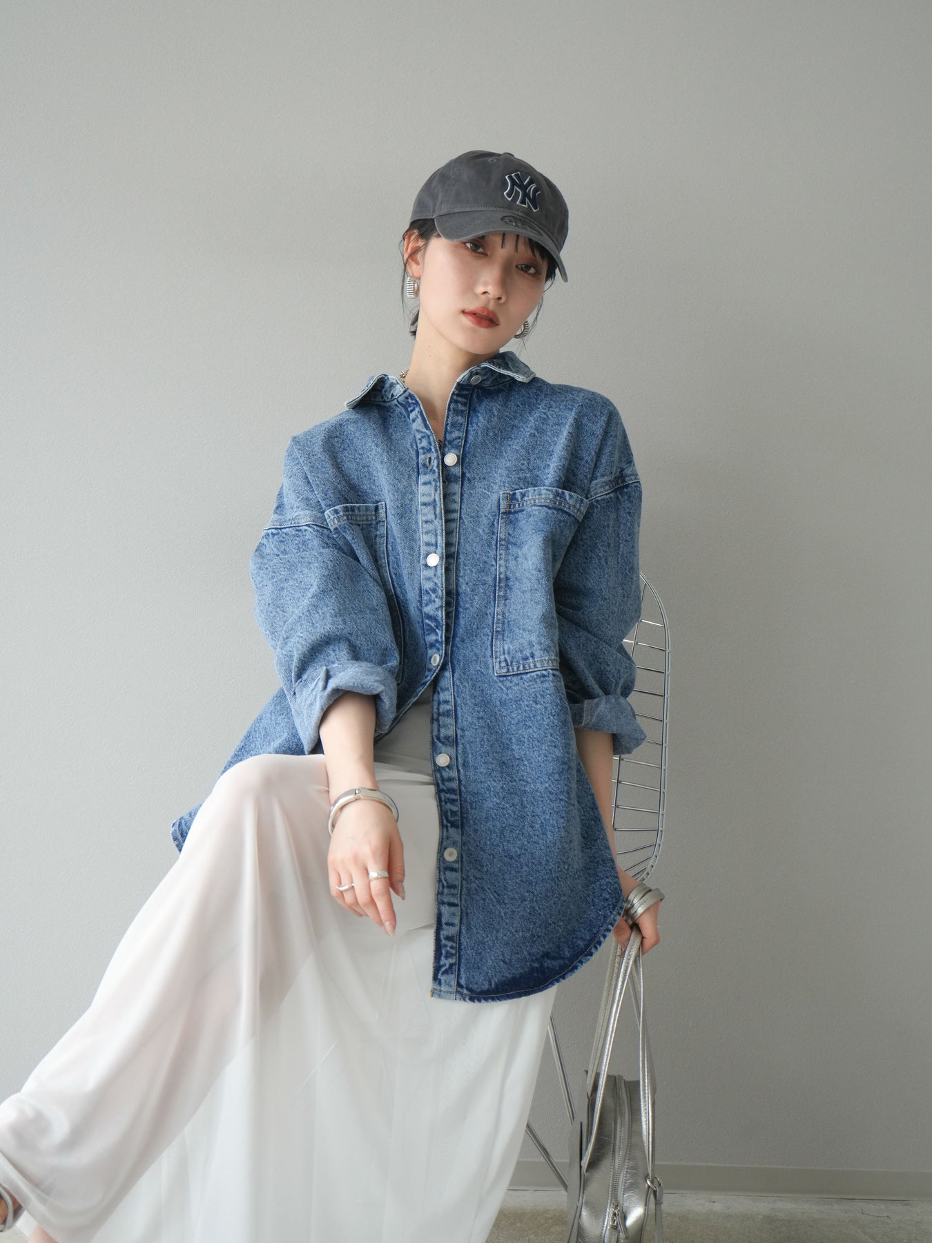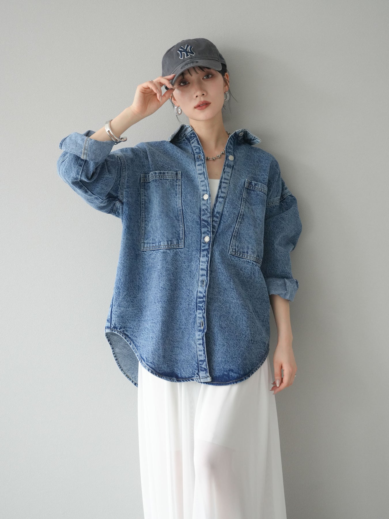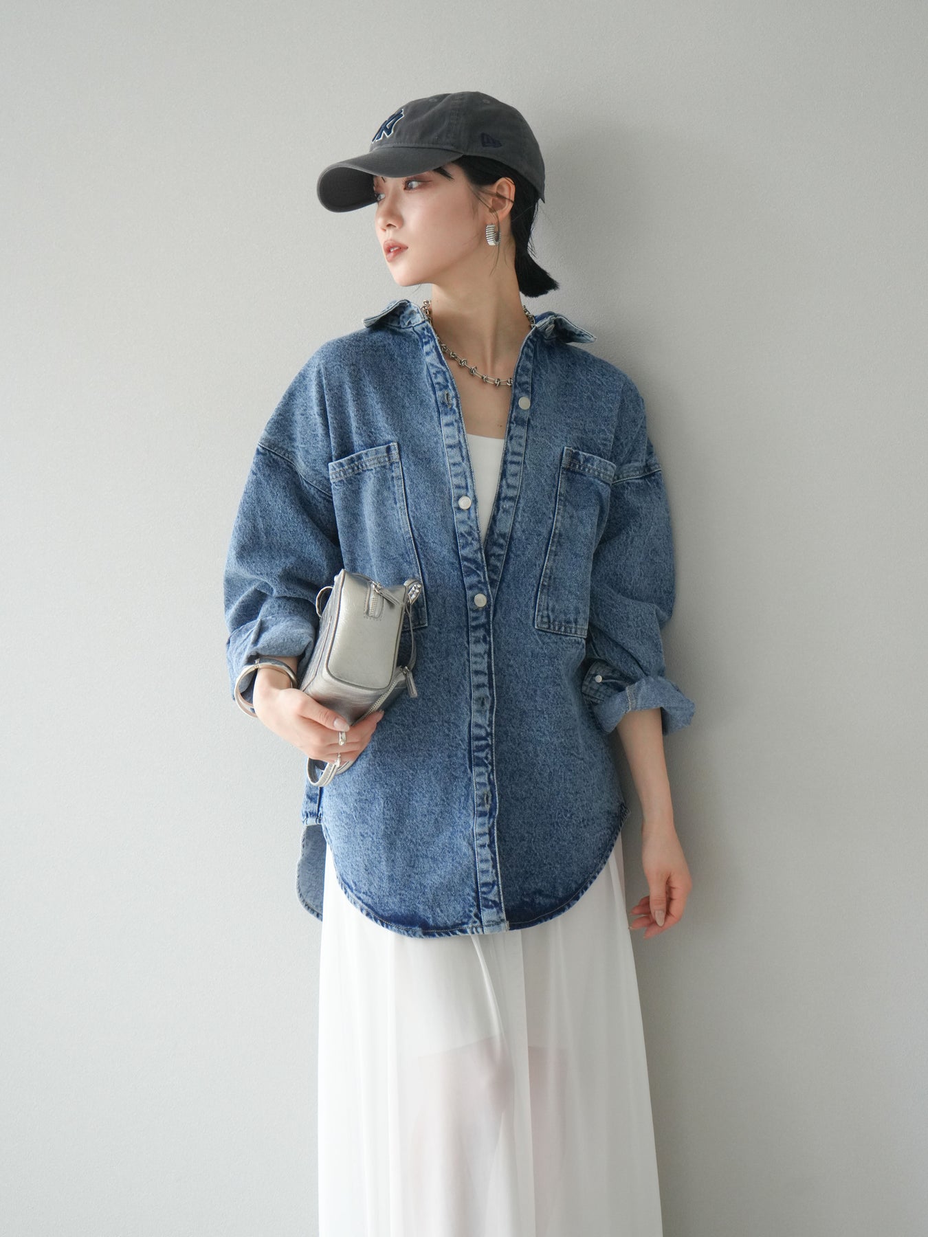 トレンドライクなゆったりシルエットが魅力のデニムシャツジャケット。程よい厚みで、シャツとしてもライトアウターとしても着回せる万能アイテムです。カジュアルな中にも洗練された雰囲気を演出できる一枚で、季節の変わり目に大活躍。大きめポケットがアクセントになり、羽織るだけでこなれたスタイルが完成します。 ※ボトムス、キャミソール(インナー)以外の商品は一律でインナーは付属していません