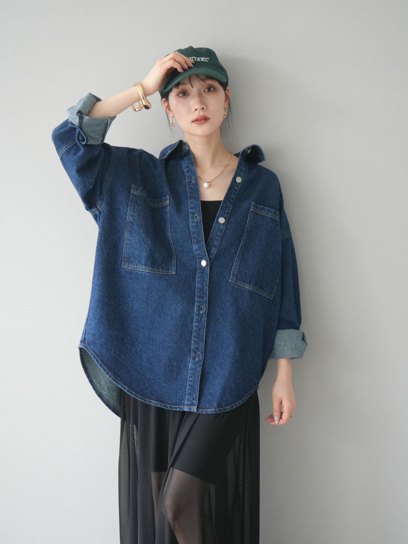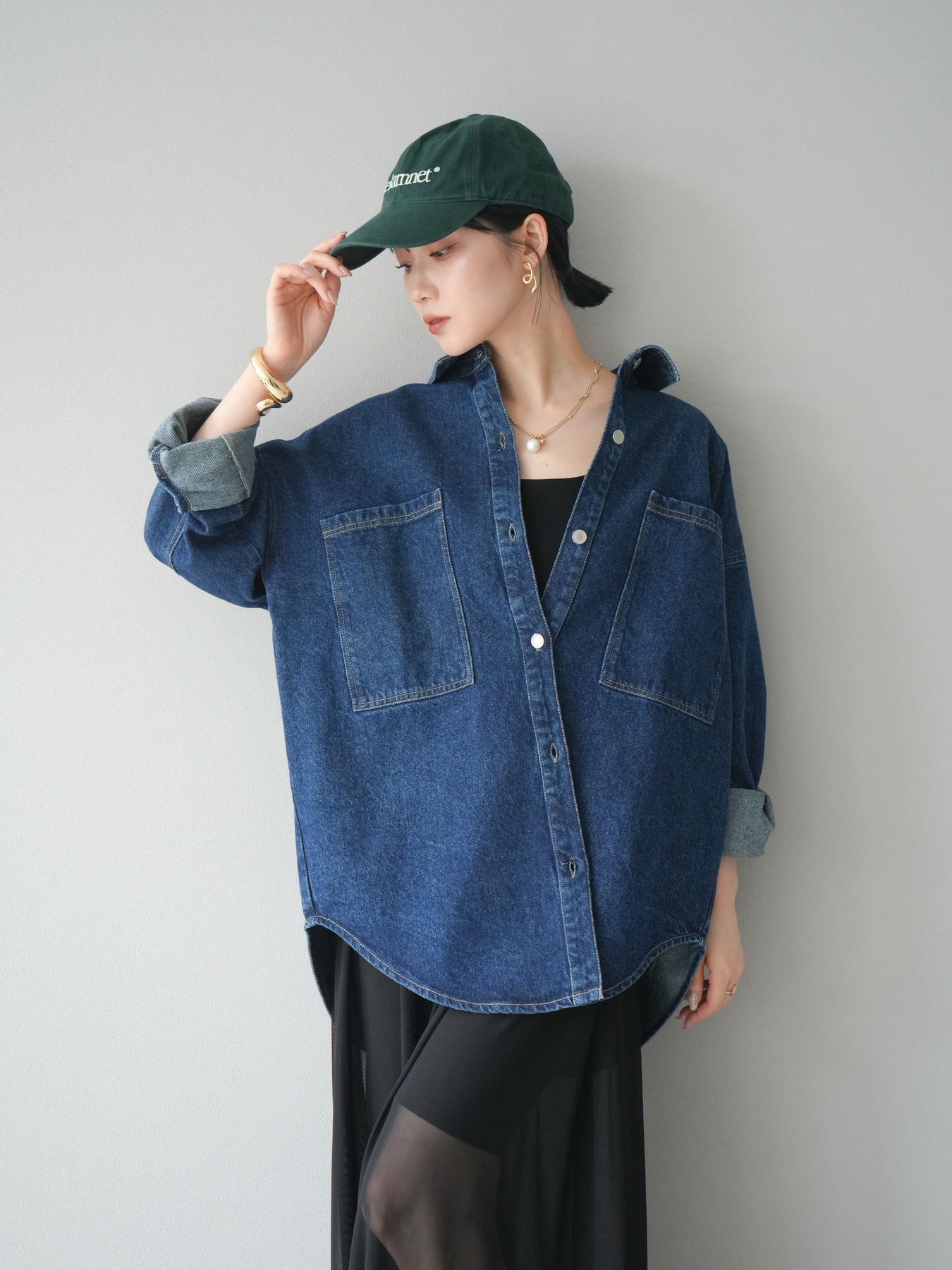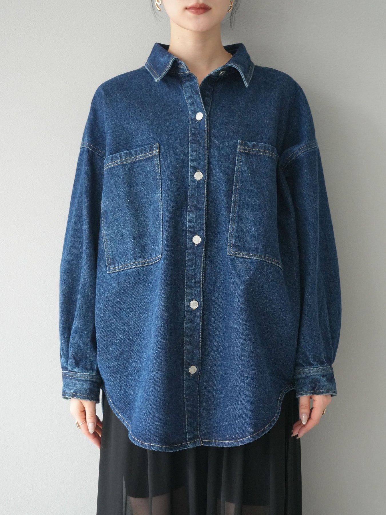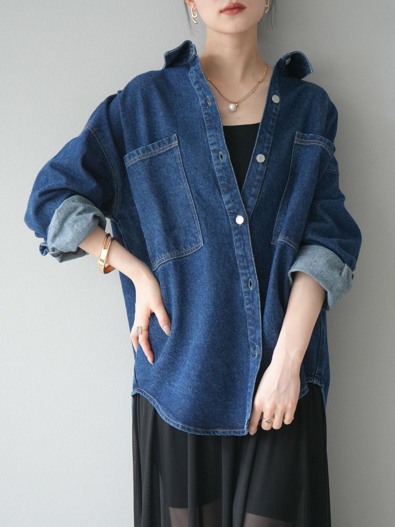 トレンドライクなゆったりシルエットが魅力のデニムシャツジャケット。程よい厚みで、シャツとしてもライトアウターとしても着回せる万能アイテムです。カジュアルな中にも洗練された雰囲気を演出できる一枚で、季節の変わり目に大活躍。大きめポケットがアクセントになり、羽織るだけでこなれたスタイルが完成します。 ※ボトムス、キャミソール(インナー)以外の商品は一律でインナーは付属していません