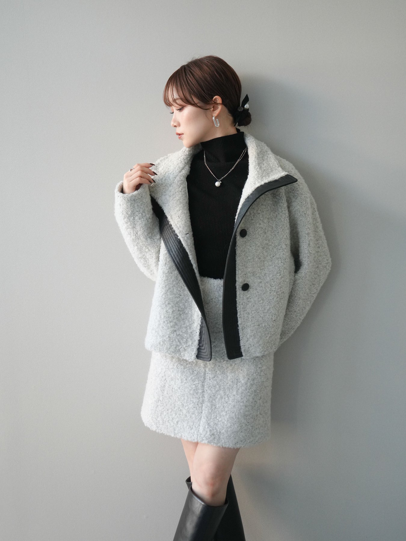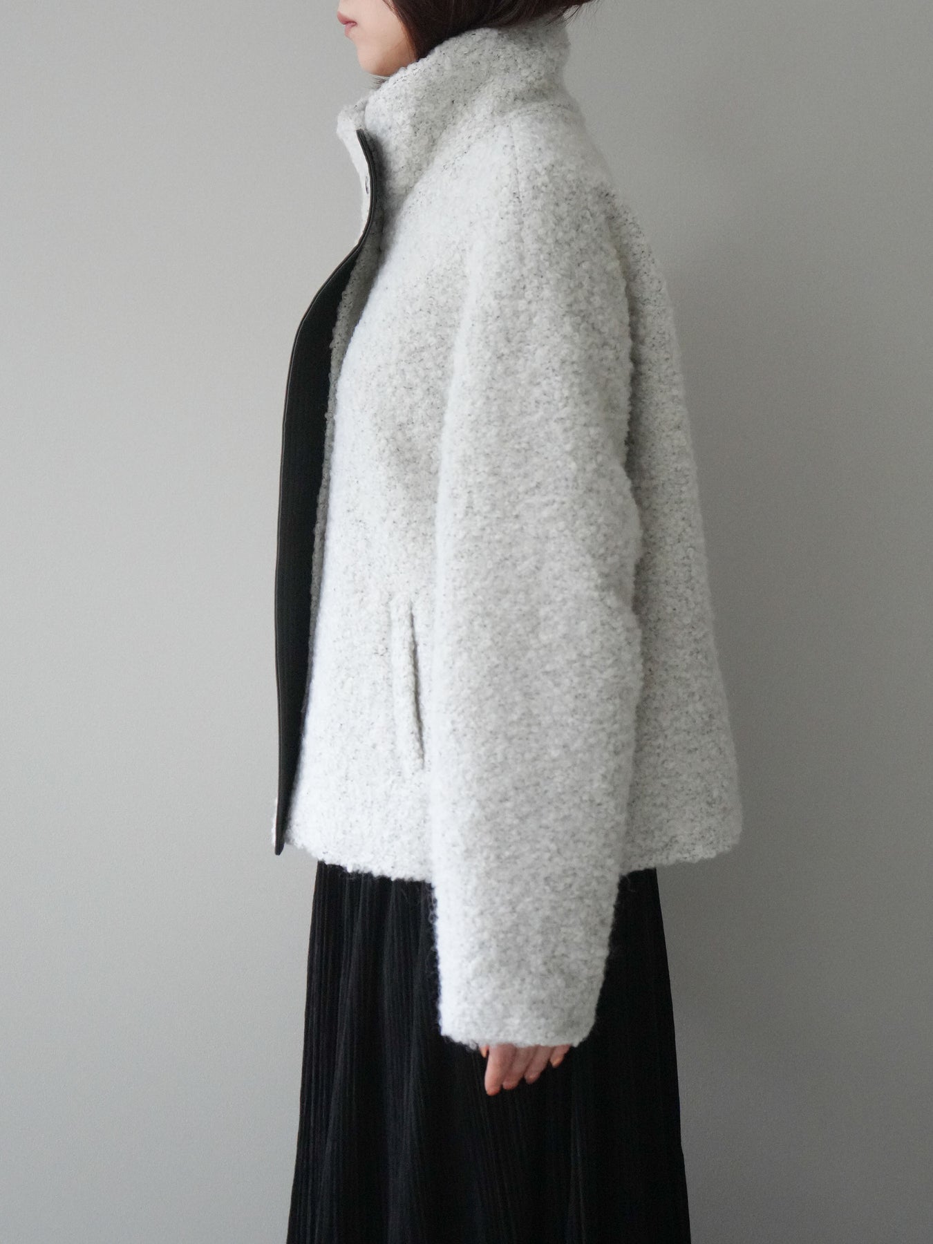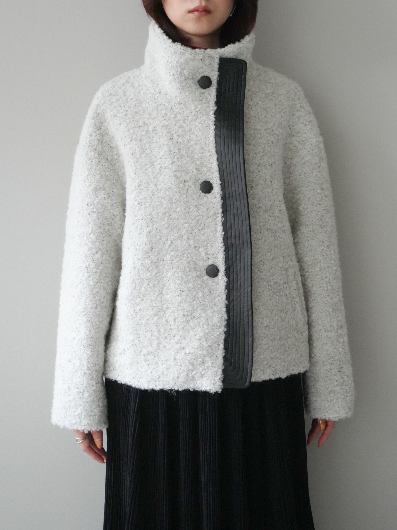 ブークレ素材の柔らかな表情にレザー調パーツを組み合わせた、存在感抜群のブルゾン。ふんわりとした起毛感が季節らしさを引き立てつつ、レザー切替が全体を引き締め、モードなアクセントをプラスします。スタンドカラーは防寒性とデザイン性を兼ね備え、ボタンの開閉によって表情の変化を楽しめる仕様に。ゆとりのあるシルエットでニットの上からも羽織りやすく、デイリーコーデを一枚で格上げしてくれる優秀アウターです。 ※ボトムス、キャミソール(インナー)以外の商品は一律でインナーは付属していません。