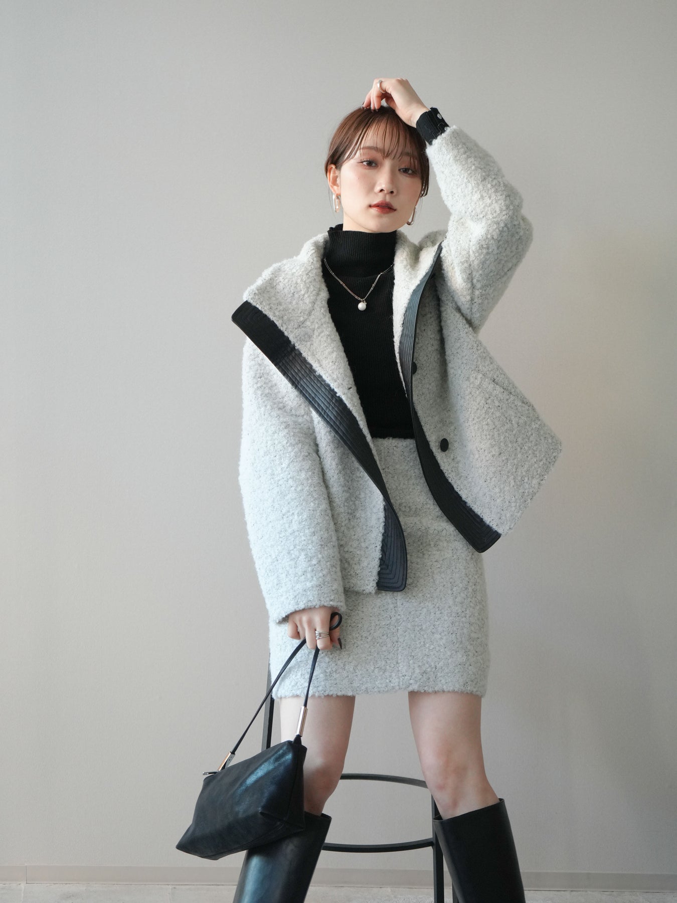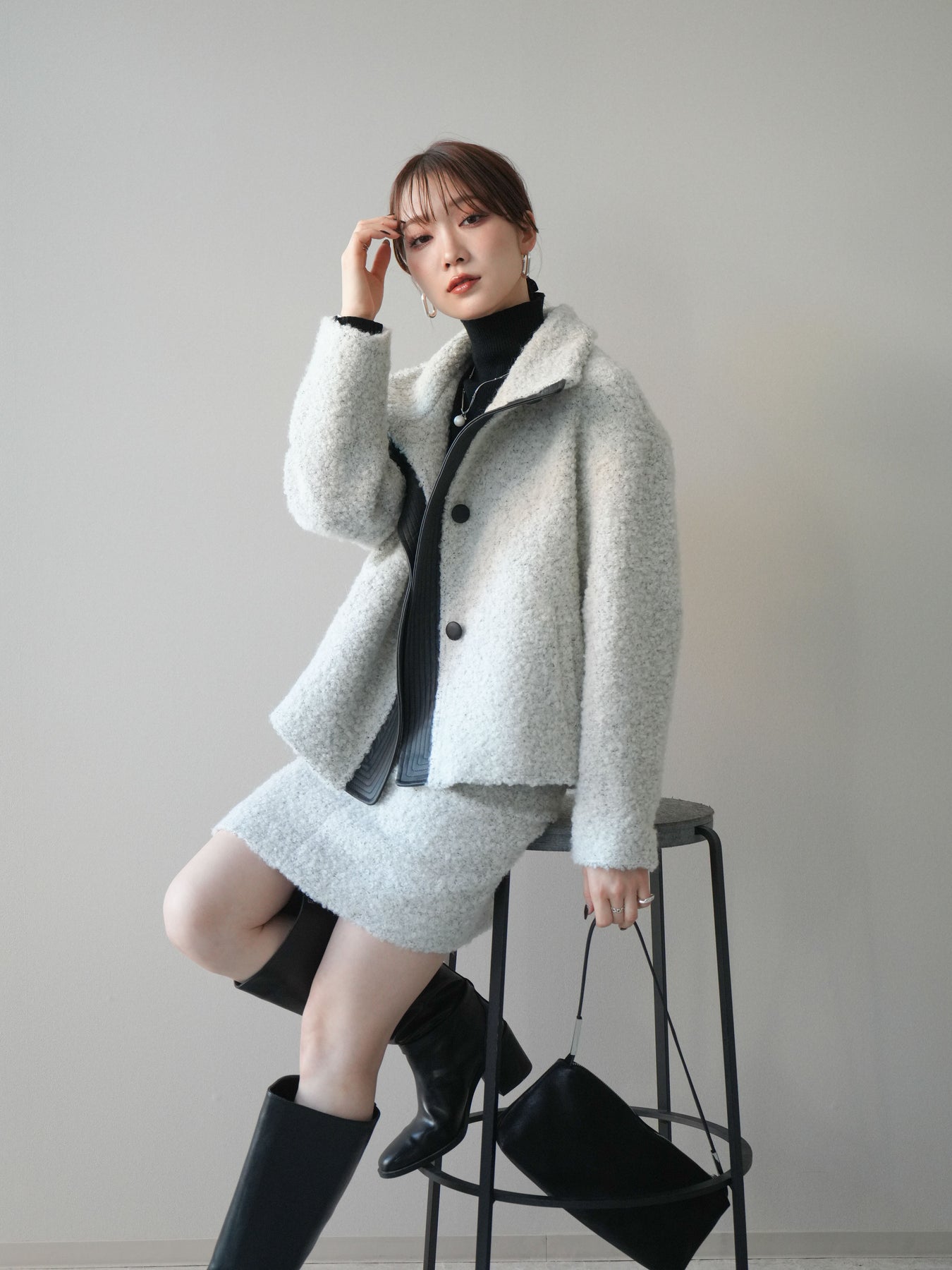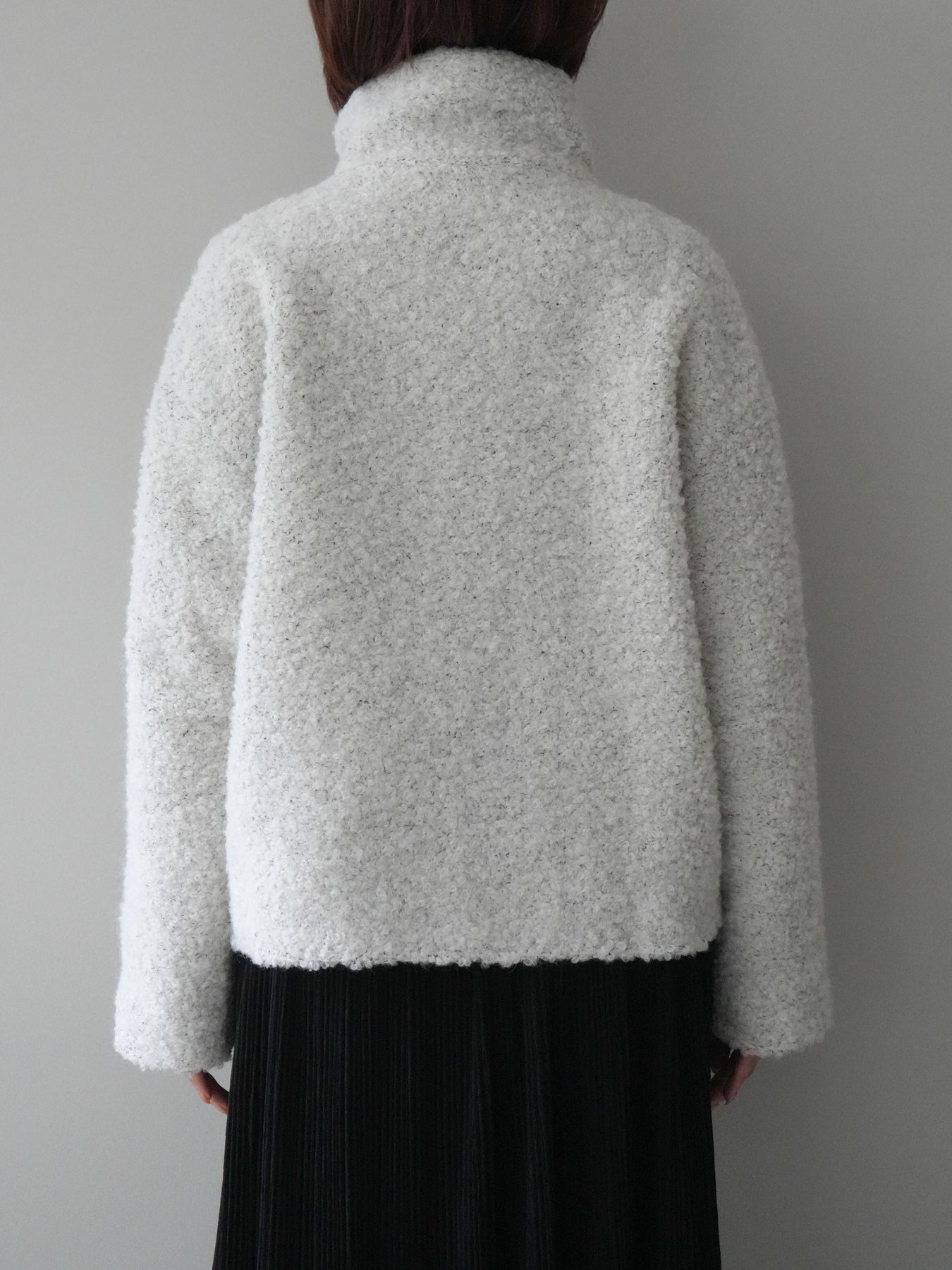 ブークレ素材の柔らかな表情にレザー調パーツを組み合わせた、存在感抜群のブルゾン。ふんわりとした起毛感が季節らしさを引き立てつつ、レザー切替が全体を引き締め、モードなアクセントをプラスします。スタンドカラーは防寒性とデザイン性を兼ね備え、ボタンの開閉によって表情の変化を楽しめる仕様に。ゆとりのあるシルエットでニットの上からも羽織りやすく、デイリーコーデを一枚で格上げしてくれる優秀アウターです。 ※ボトムス、キャミソール(インナー)以外の商品は一律でインナーは付属していません。
