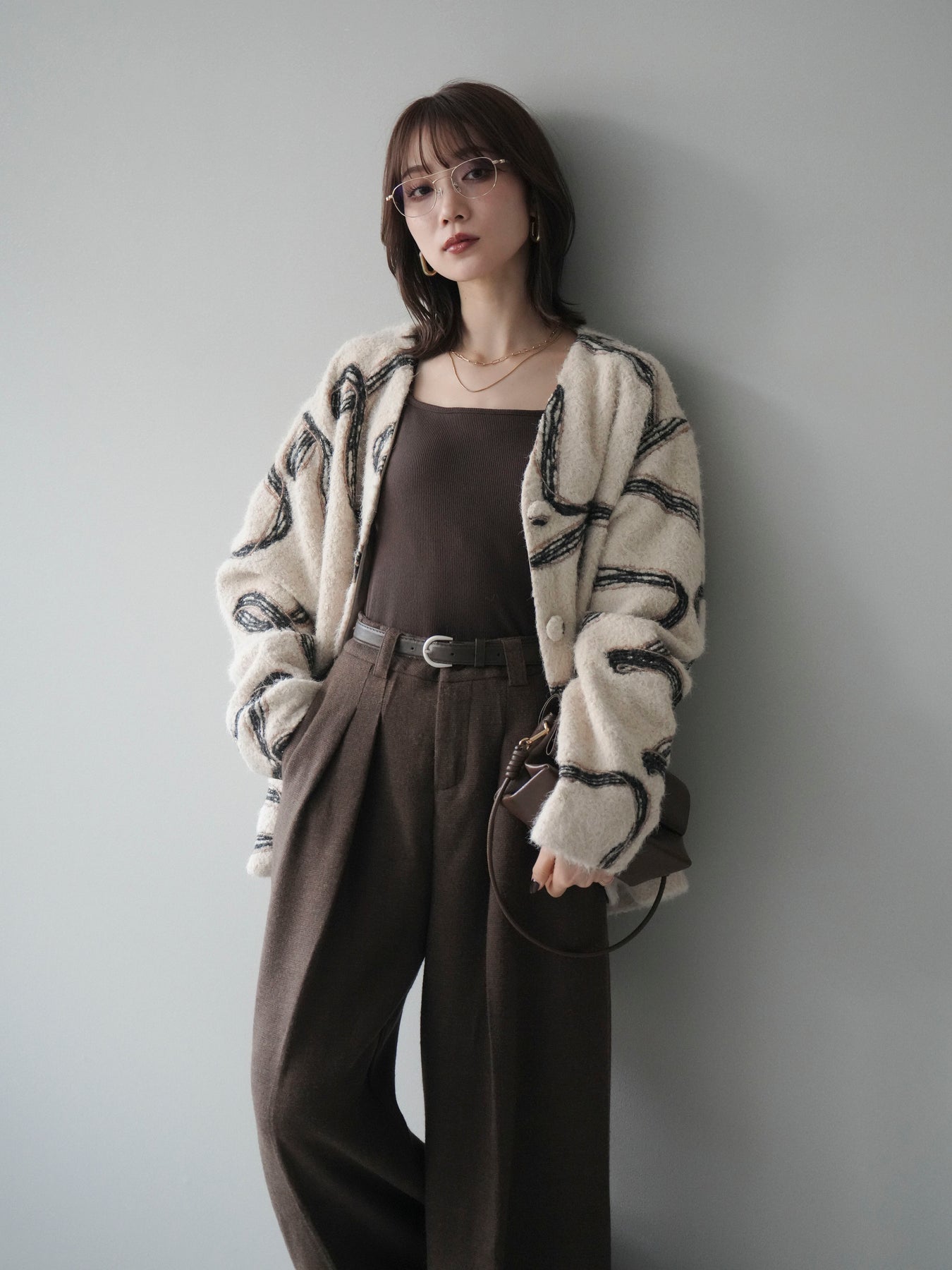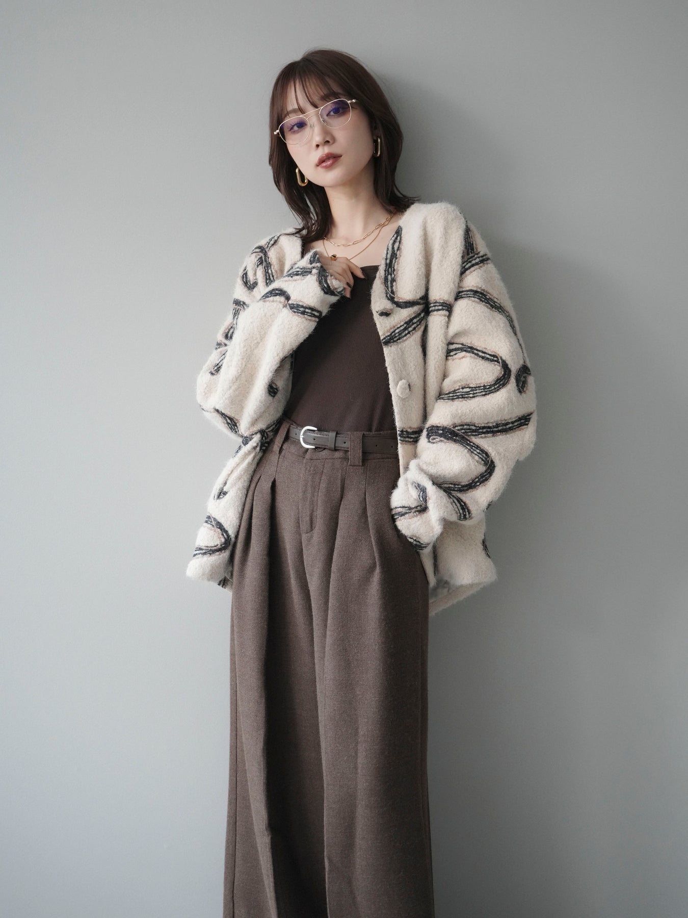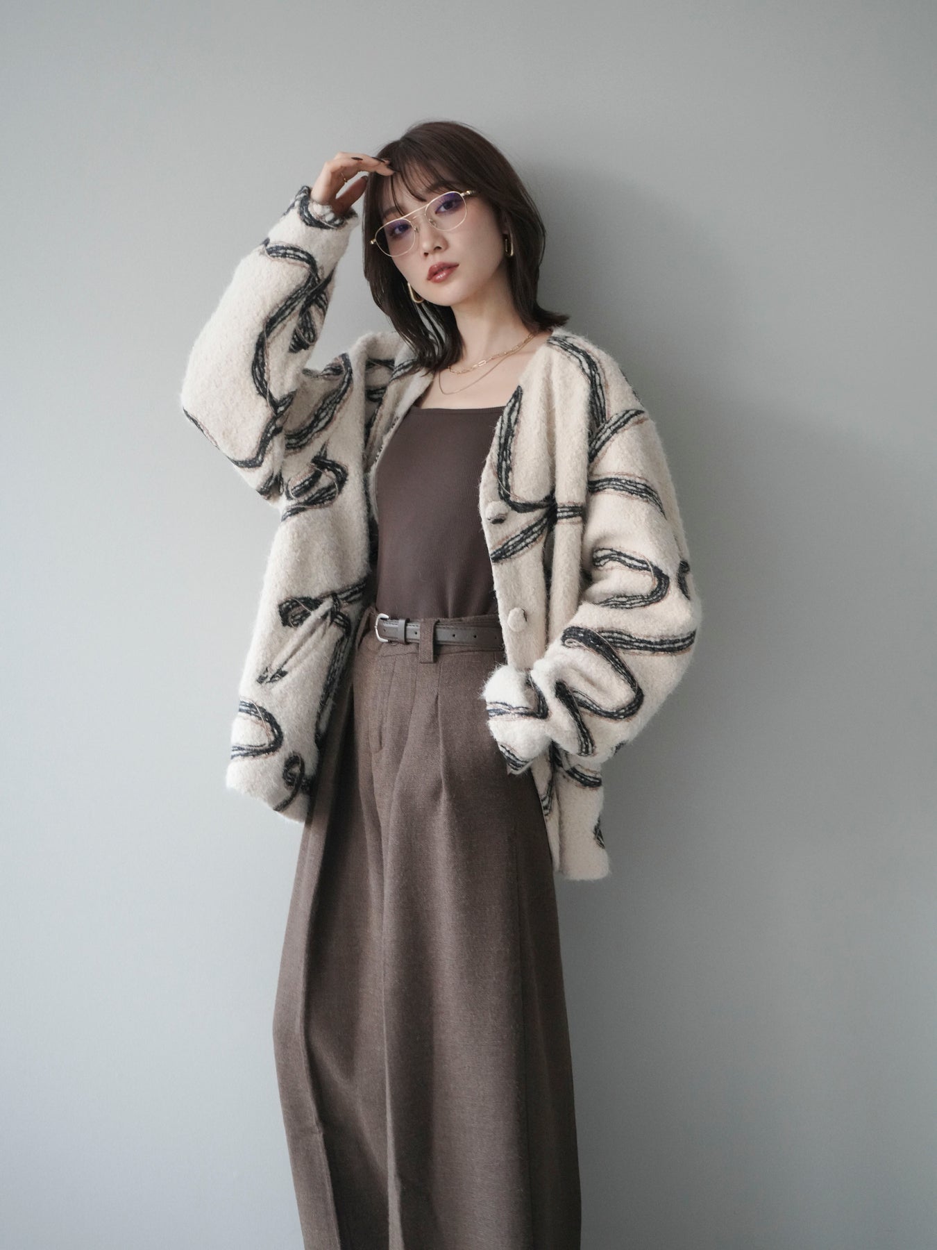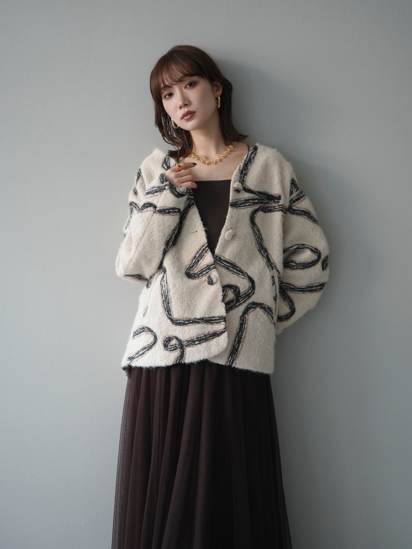 ふんわりとしたブークレ素材に、ニュアンス感のある刺繍を贅沢に施したニットジャケット。柔らかな起毛感が優しい雰囲気を引き立てつつ、立体的な刺繍ラインが存在感をプラスし、羽織るだけでコーディネートに深みを与えてくれます。ほどよいゆとりのあるシルエットで、ニットの上からも重ねやすく、季節の変わり目にも活躍。前立てのシンプルなデザインが全体をすっきりまとめ、スタイリングに品よく寄り添う一着です。 ※ボトムス、キャミソール(インナー)以外の商品は一律でインナーは付属していません。
