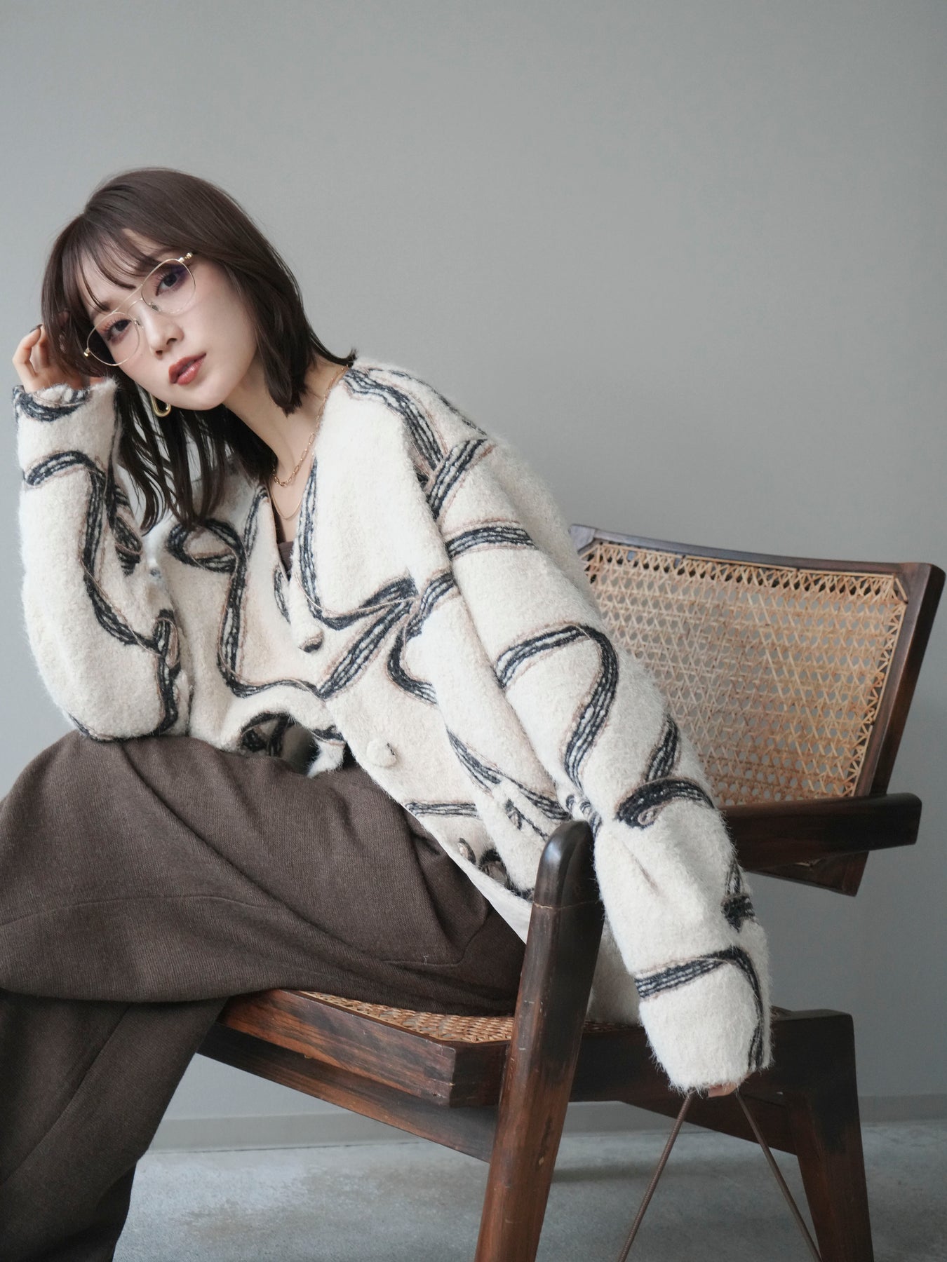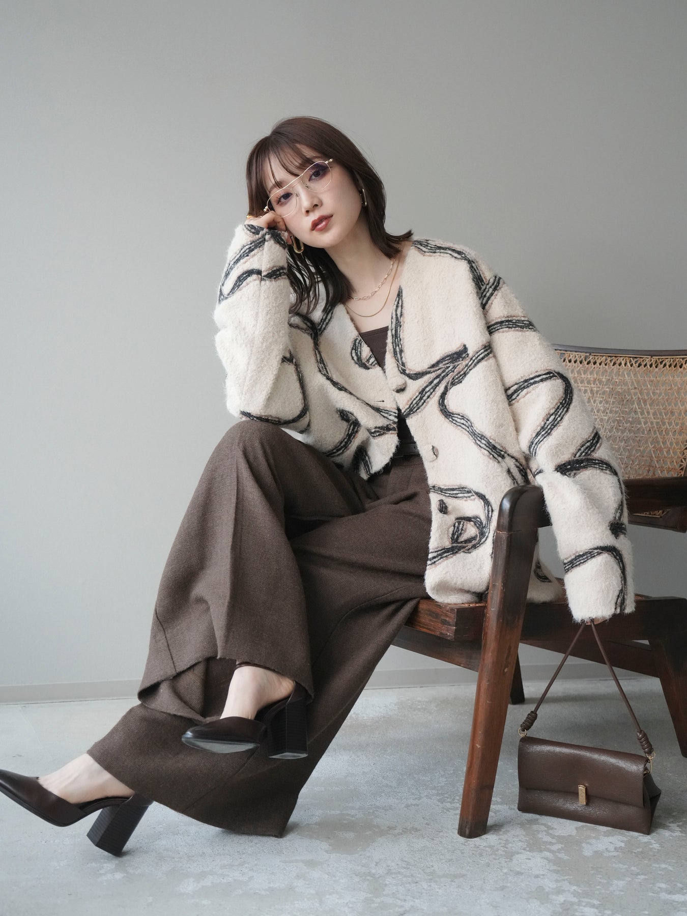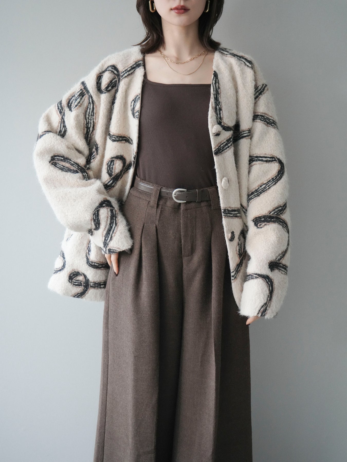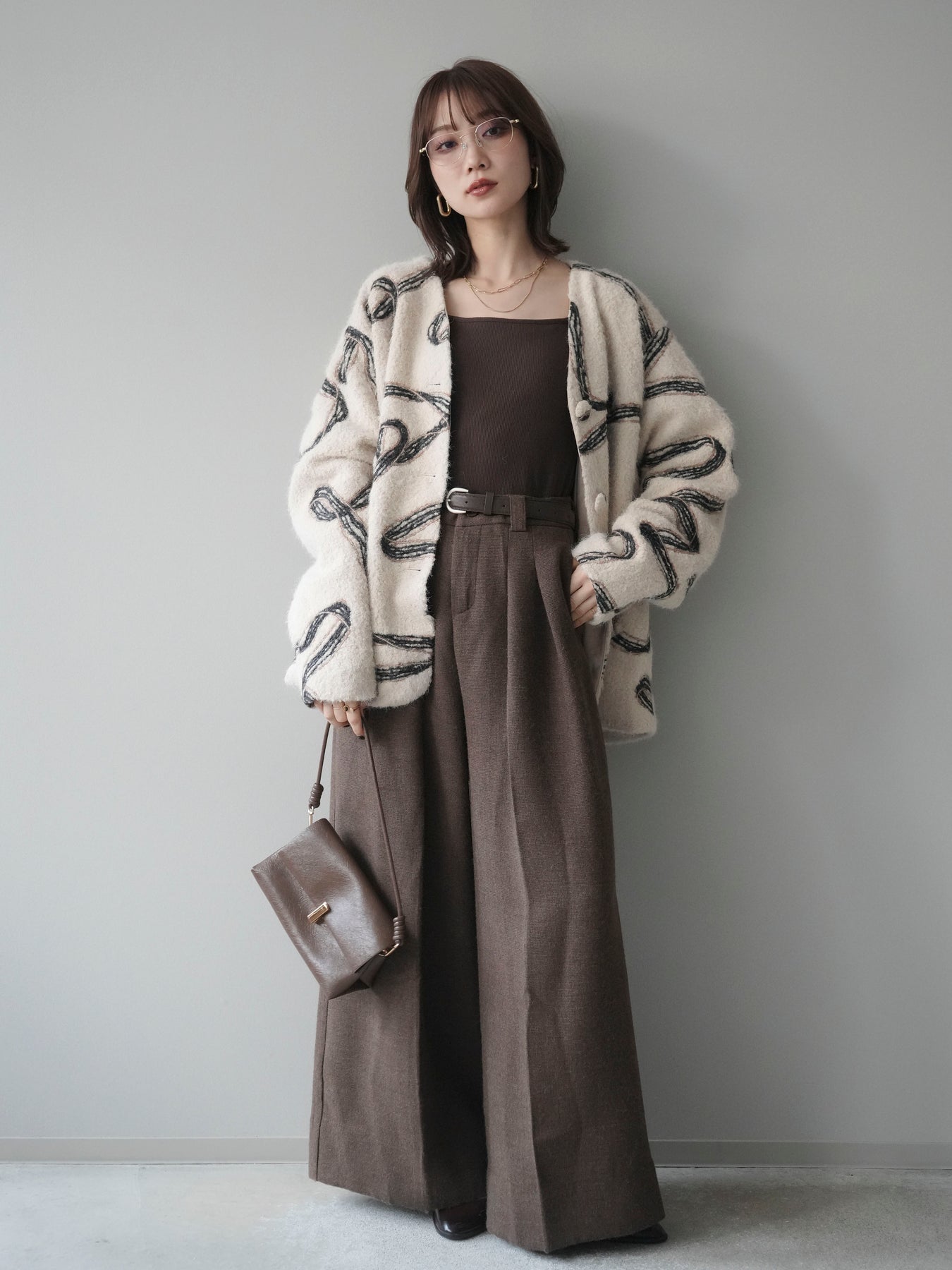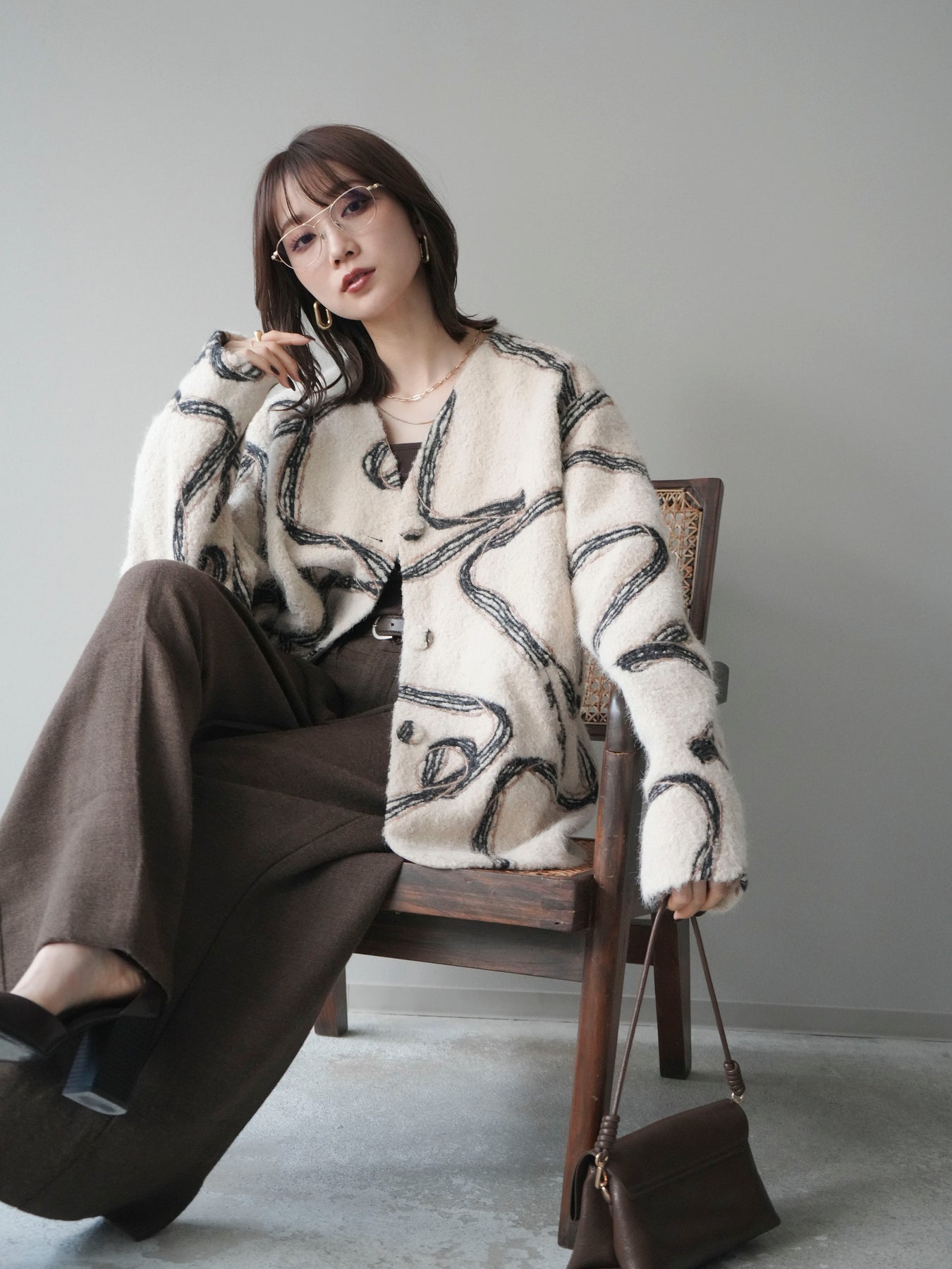 ふんわりとしたブークレ素材に、ニュアンス感のある刺繍を贅沢に施したニットジャケット。柔らかな起毛感が優しい雰囲気を引き立てつつ、立体的な刺繍ラインが存在感をプラスし、羽織るだけでコーディネートに深みを与えてくれます。ほどよいゆとりのあるシルエットで、ニットの上からも重ねやすく、季節の変わり目にも活躍。前立てのシンプルなデザインが全体をすっきりまとめ、スタイリングに品よく寄り添う一着です。 ※ボトムス、キャミソール(インナー)以外の商品は一律でインナーは付属していません。