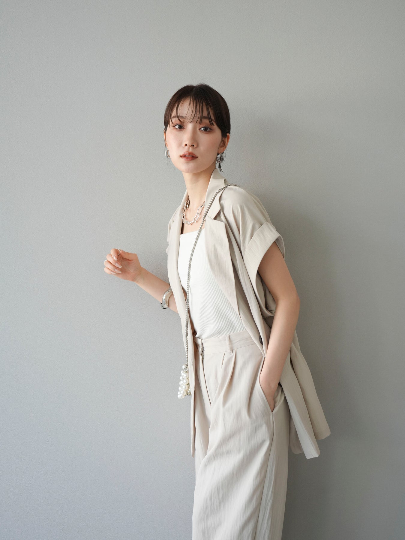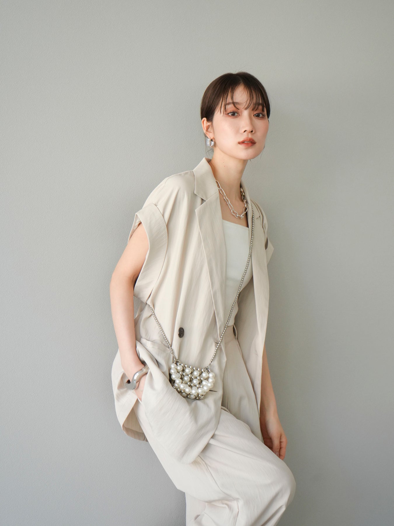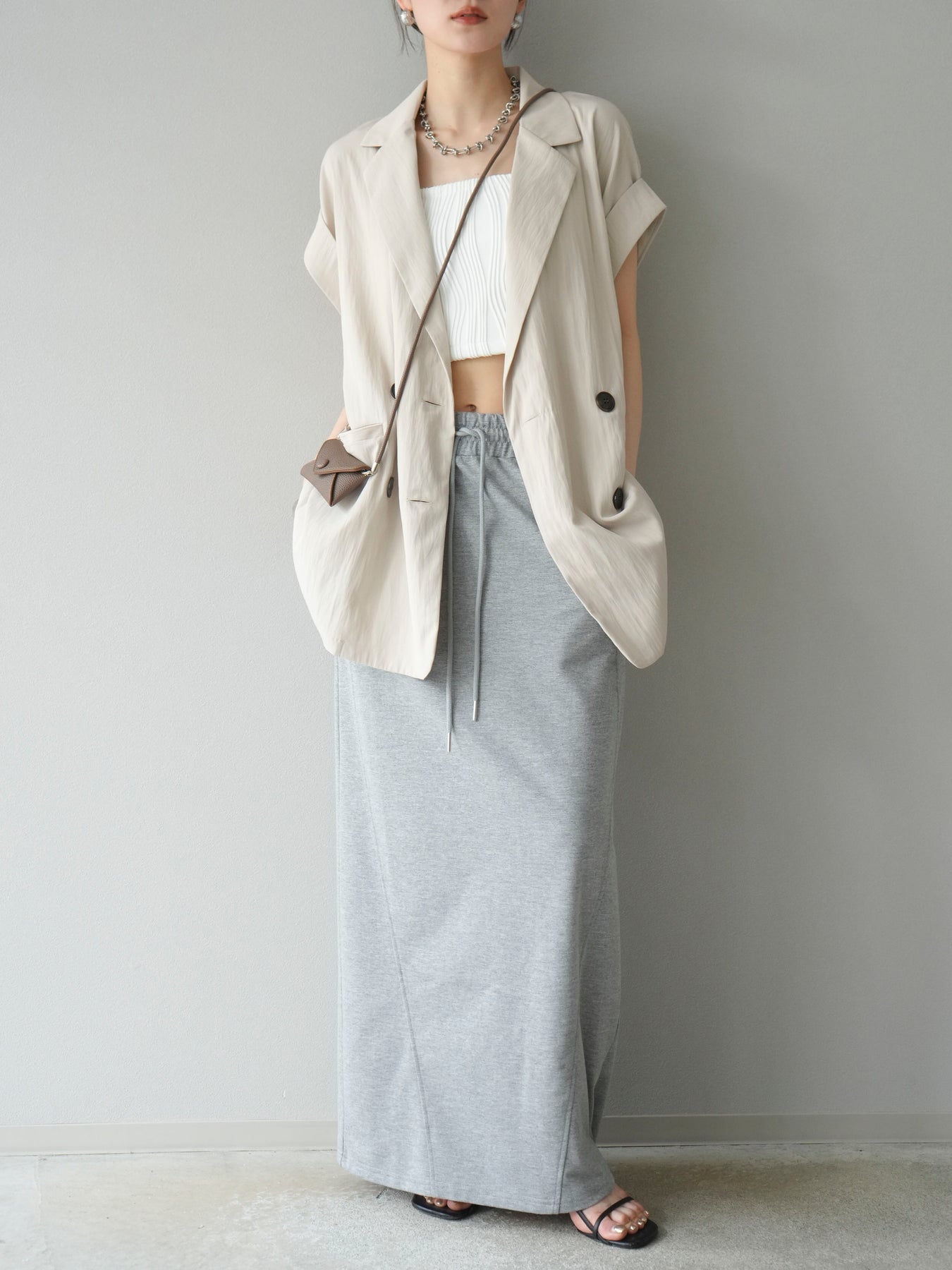 ナチュラルな風合いが魅力のリネンライク素材を使用した、ダブルボタン仕様のノースリーブジレ。肩に程よくかかるフレンチスリーブと、計算されたゆとりのあるシルエットが、抜け感とこなれた印象を演出します。 ヒップが隠れるロング丈で、体型カバーと縦ラインのスタイルアップ効果も抜群。Tシャツやノースリーブトップスの上にさっと羽織るだけで、洗練されたレイヤードスタイルが完成します。セットアップ風の着こなしもおすすめです。 ※ボトムス、キャミソール(インナー)以外の商品は一律でインナーは付属していません。
