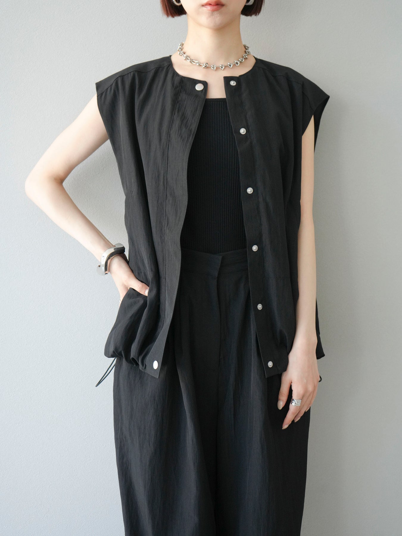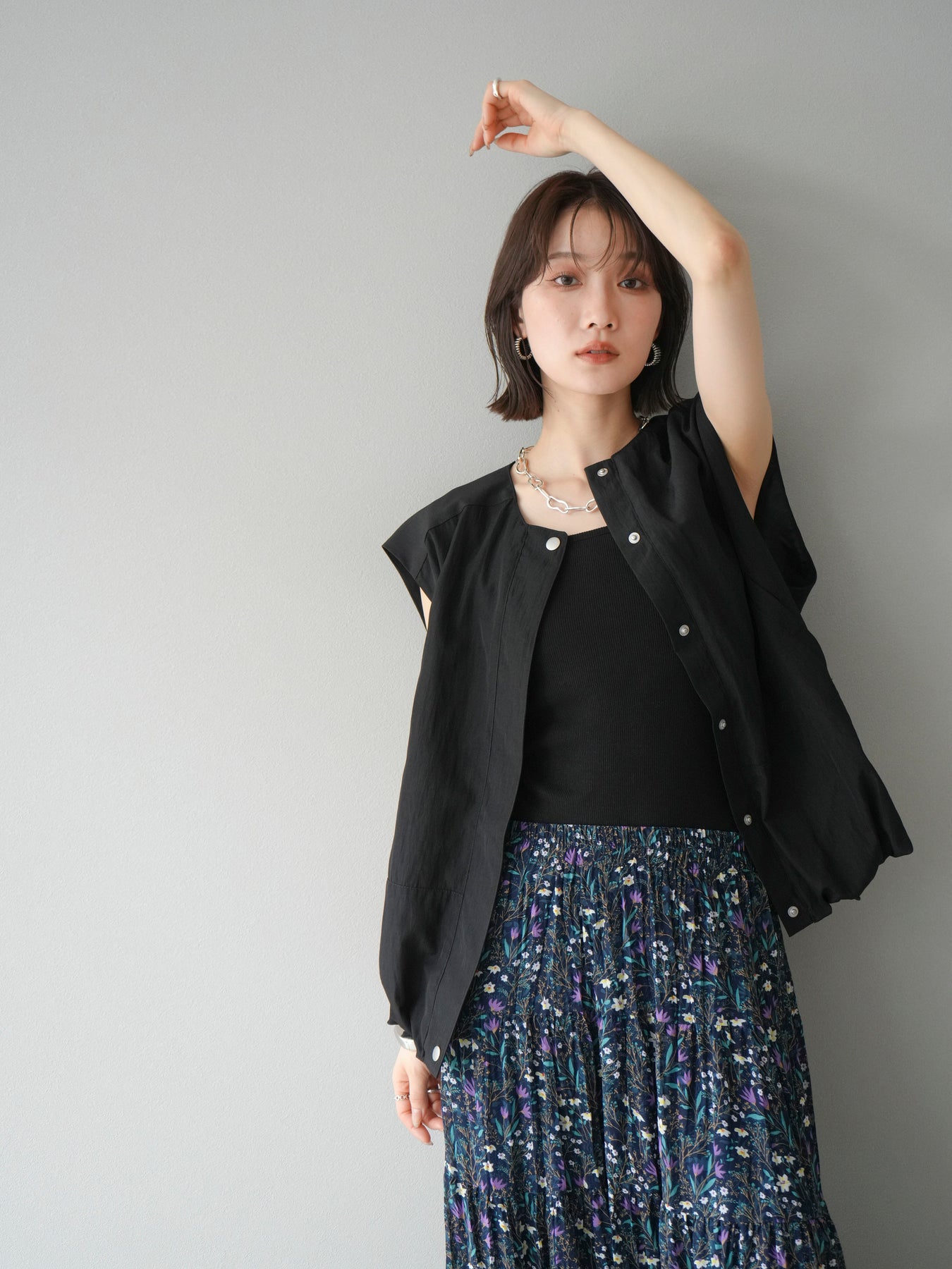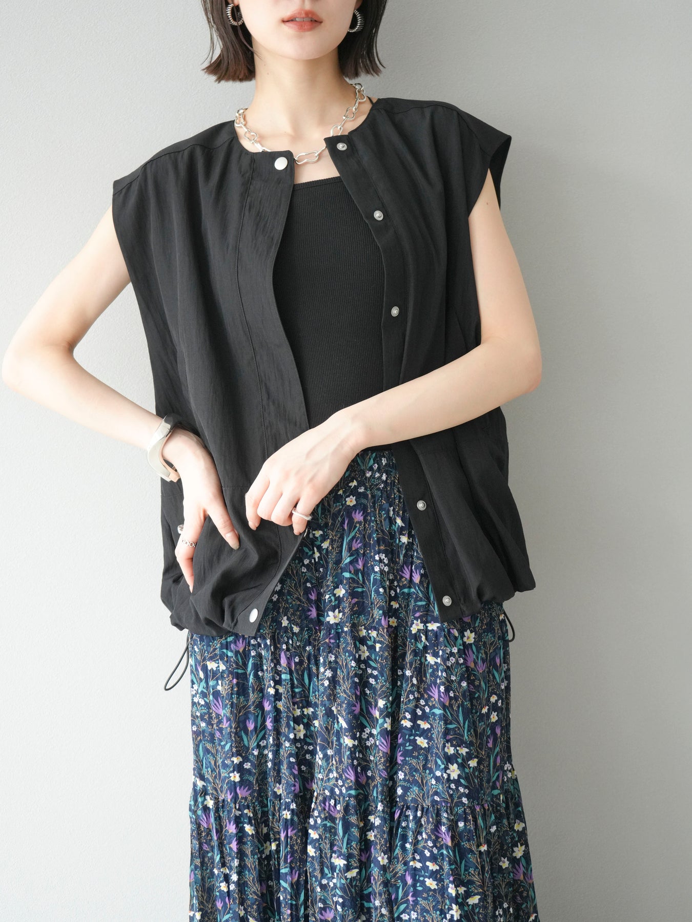 シャカっとしたリネンライク素材が軽やかで涼しげな印象を与える、リネンライクドロストバルーンブルゾン。ノースリーブ仕様で羽織りとしても使いやすく、シーズンレスで活躍する1枚です。裾にはドロストコードが施されており、シルエットの調整が可能。ふんわりとしたバルーンフォルムにアレンジすることで、フェミニンさと抜け感をプラスできます。シンプルなデザインながらも、ディテールにこだわった大人カジュアルにぴったりのアイテムです。 ※ボトムス、キャミソール(インナー)以外の商品は一律でインナーは付属していません。