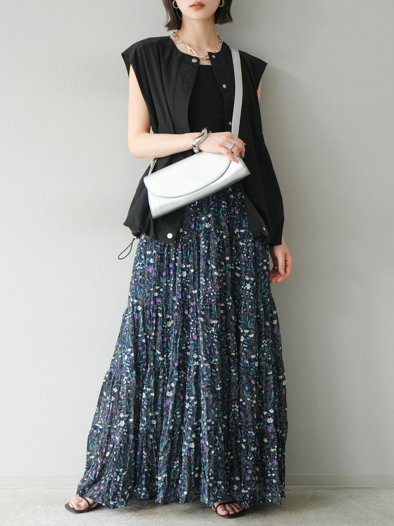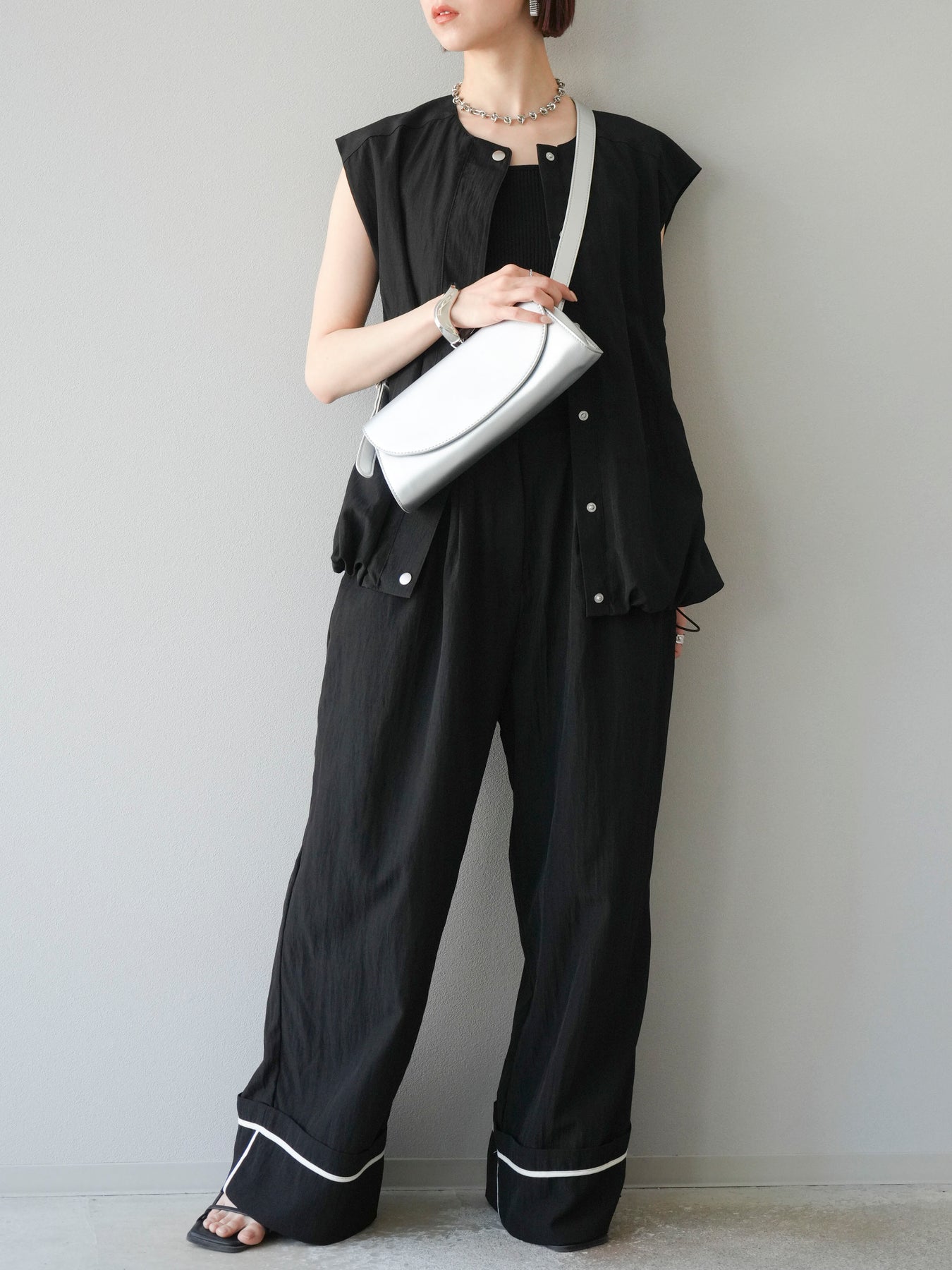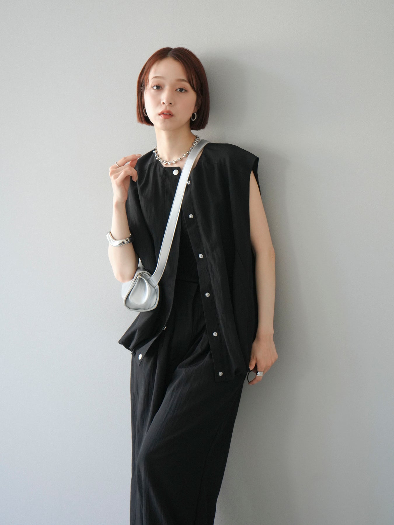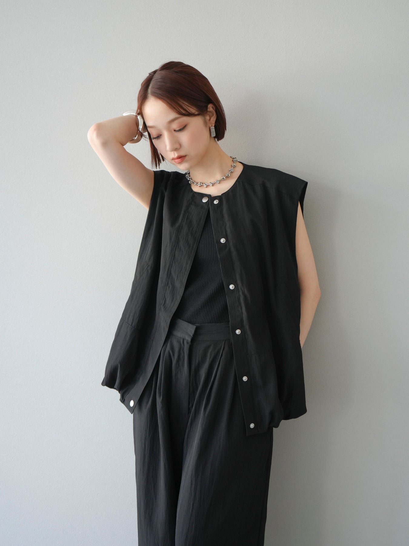 シャカっとしたリネンライク素材が軽やかで涼しげな印象を与える、リネンライクドロストバルーンブルゾン。ノースリーブ仕様で羽織りとしても使いやすく、シーズンレスで活躍する1枚です。裾にはドロストコードが施されており、シルエットの調整が可能。ふんわりとしたバルーンフォルムにアレンジすることで、フェミニンさと抜け感をプラスできます。シンプルなデザインながらも、ディテールにこだわった大人カジュアルにぴったりのアイテムです。 ※ボトムス、キャミソール(インナー)以外の商品は一律でインナーは付属していません。
