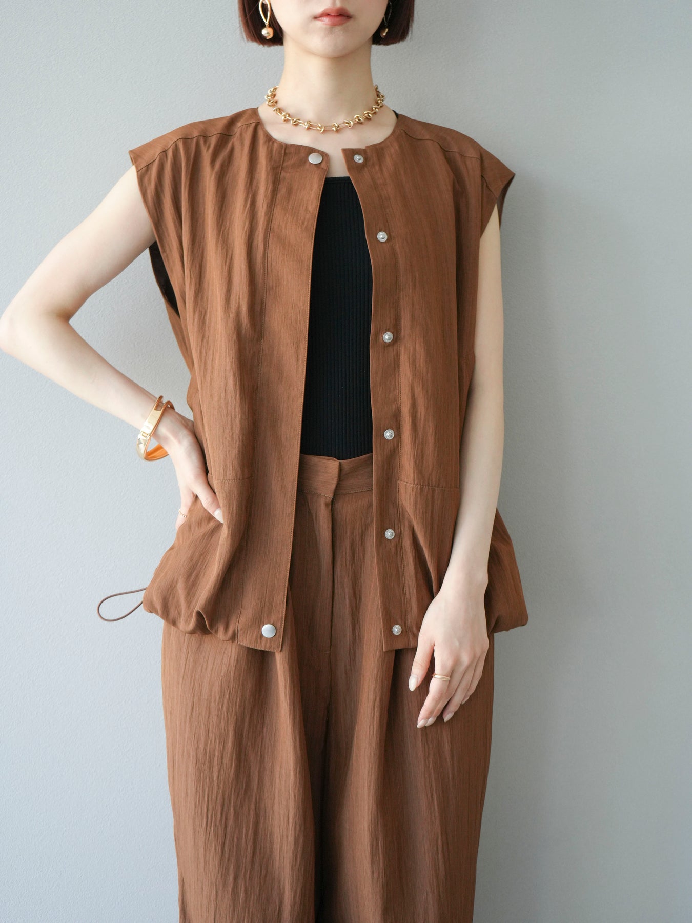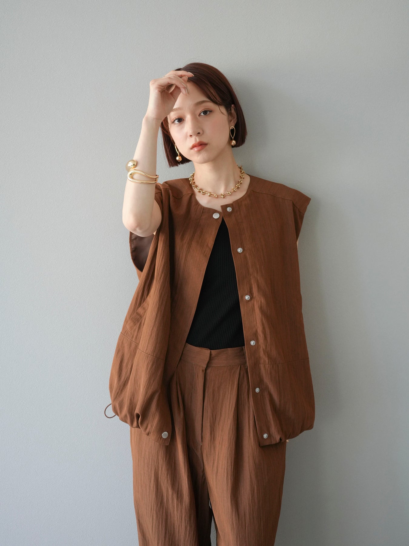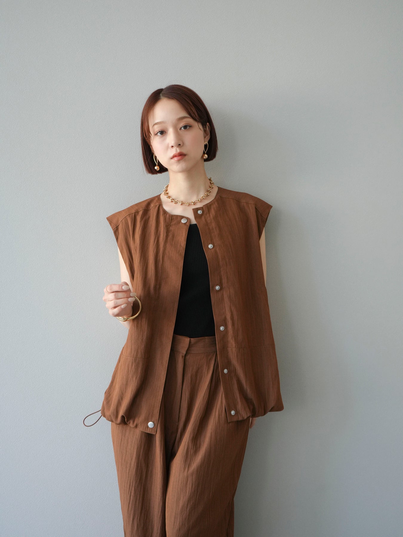 シャカっとしたリネンライク素材が軽やかで涼しげな印象を与える、リネンライクドロストバルーンブルゾン。ノースリーブ仕様で羽織りとしても使いやすく、シーズンレスで活躍する1枚です。裾にはドロストコードが施されており、シルエットの調整が可能。ふんわりとしたバルーンフォルムにアレンジすることで、フェミニンさと抜け感をプラスできます。シンプルなデザインながらも、ディテールにこだわった大人カジュアルにぴったりのアイテムです。 ※ボトムス、キャミソール(インナー)以外の商品は一律でインナーは付属していません。