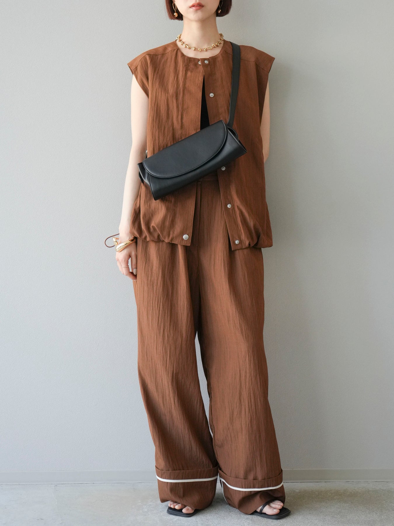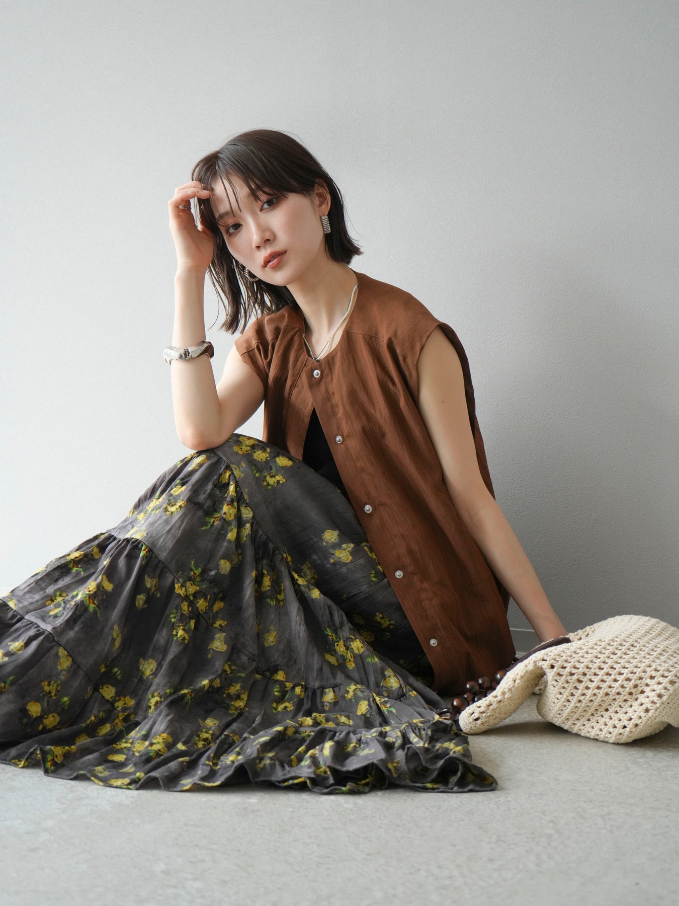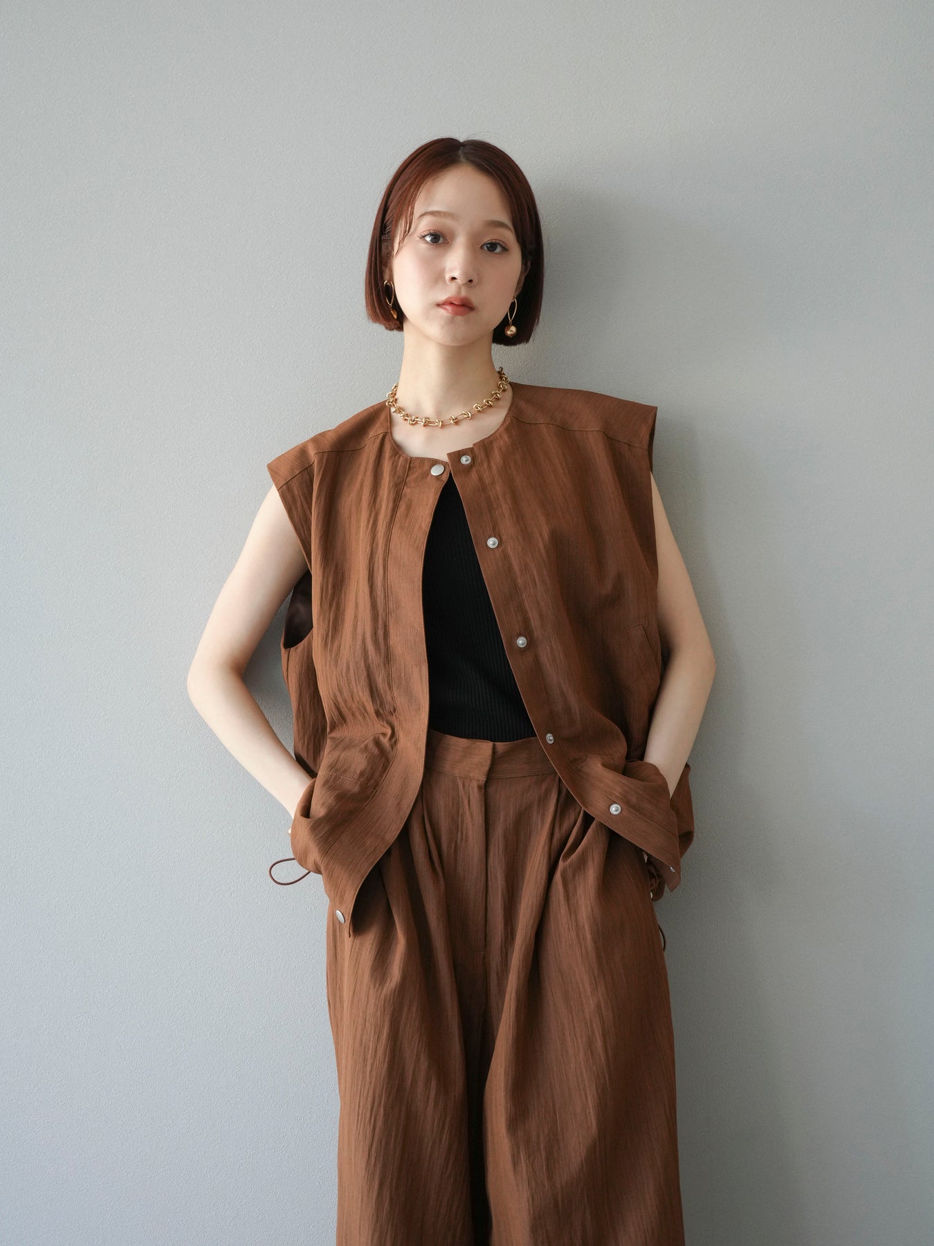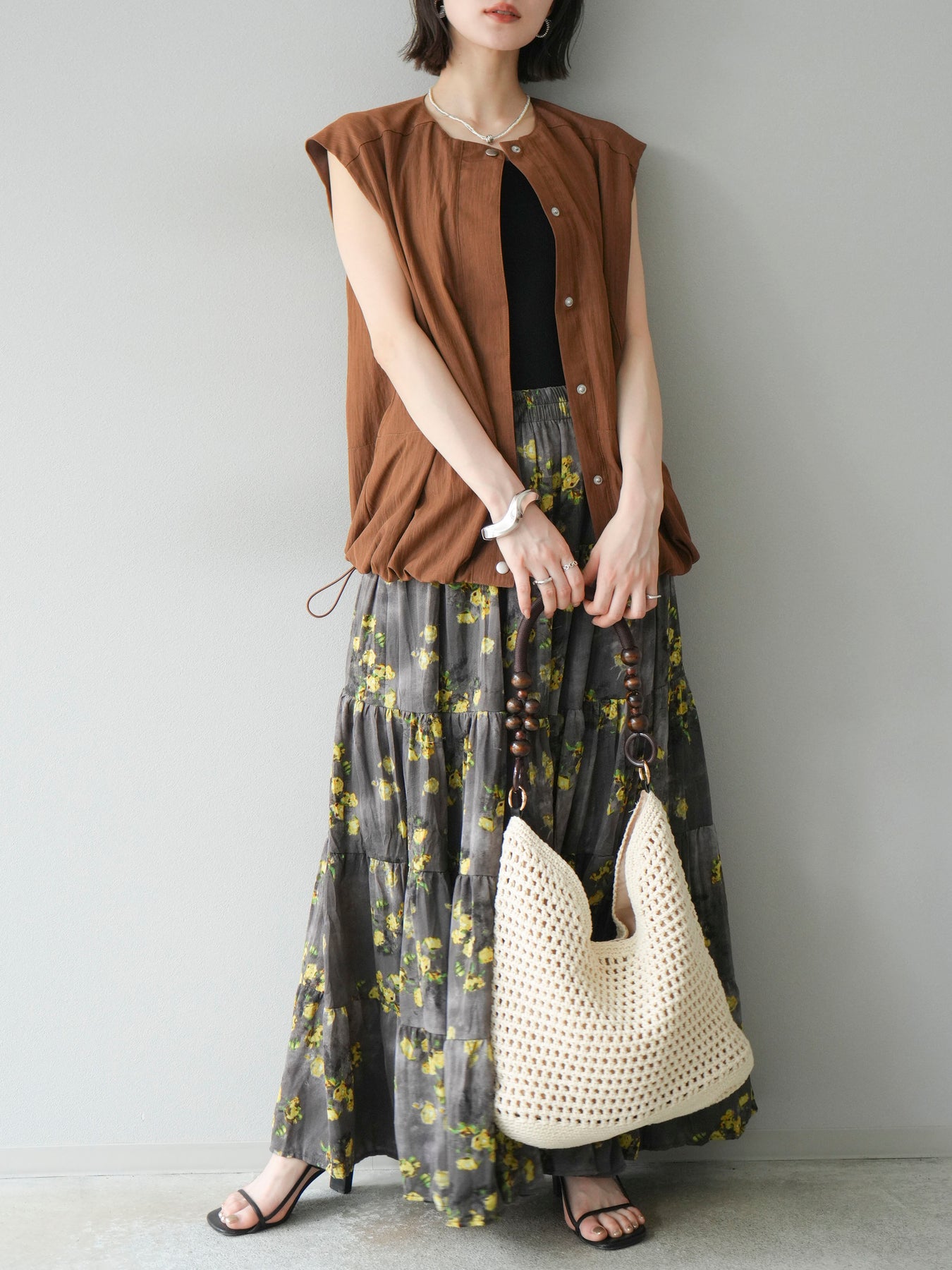 シャカっとしたリネンライク素材が軽やかで涼しげな印象を与える、リネンライクドロストバルーンブルゾン。ノースリーブ仕様で羽織りとしても使いやすく、シーズンレスで活躍する1枚です。裾にはドロストコードが施されており、シルエットの調整が可能。ふんわりとしたバルーンフォルムにアレンジすることで、フェミニンさと抜け感をプラスできます。シンプルなデザインながらも、ディテールにこだわった大人カジュアルにぴったりのアイテムです。 ※ボトムス、キャミソール(インナー)以外の商品は一律でインナーは付属していません。
